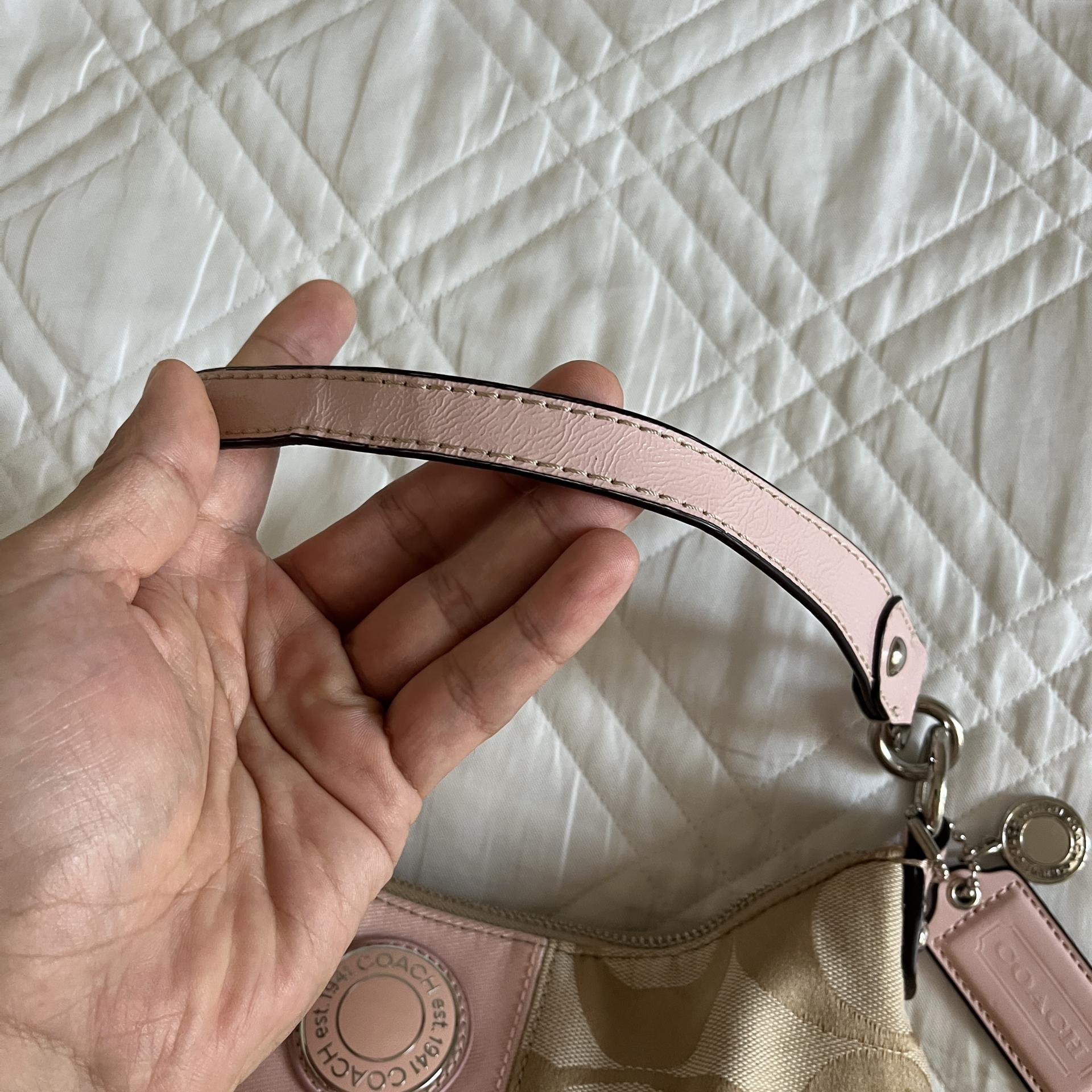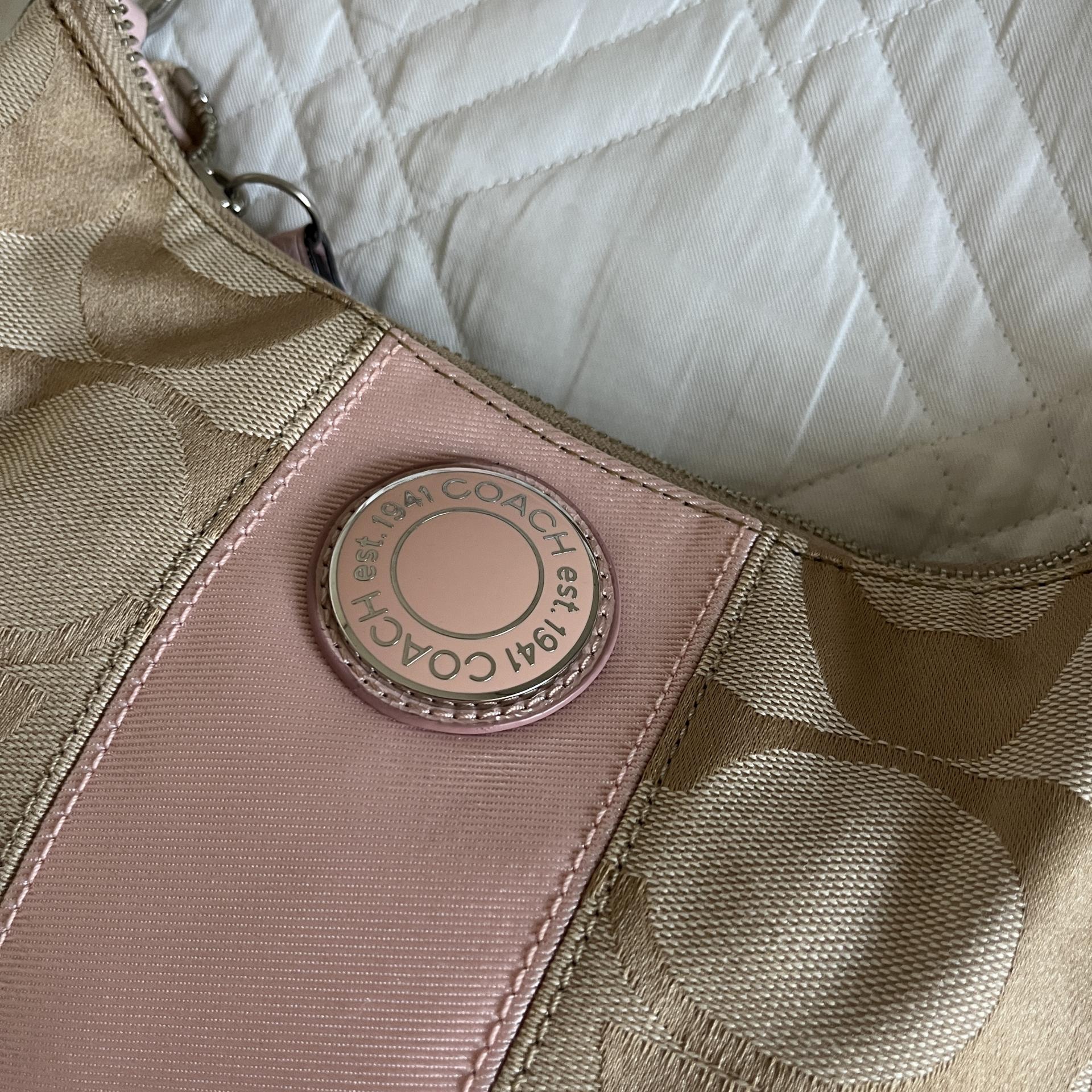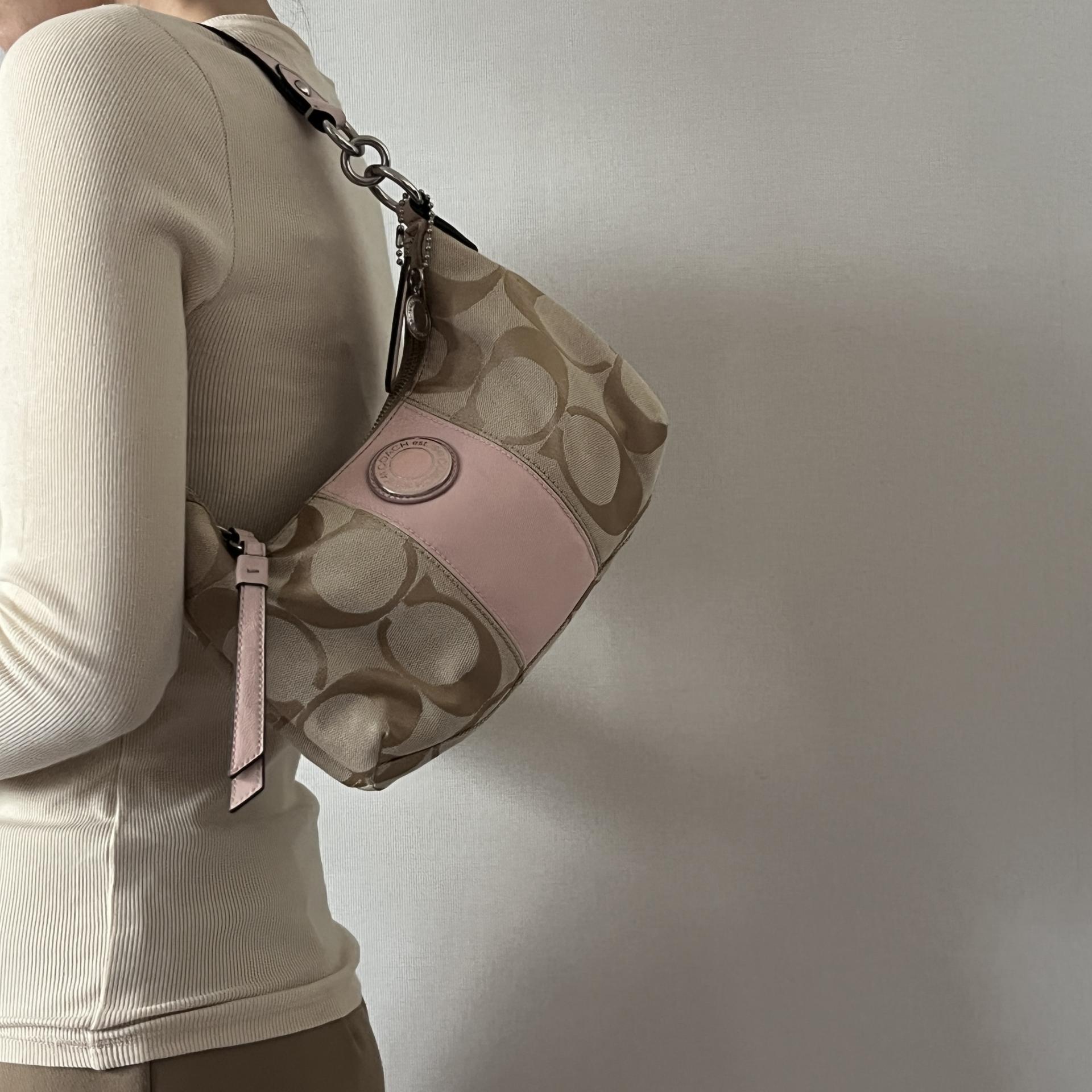 내구성 좋은 자카드 소재로 제작되었으며, 차분하 베이지 바디 컬러와 코치 시그니처 로고 패턴, 포인트 컬러로 돋보이는 핑크 색감이 인상적입니다.