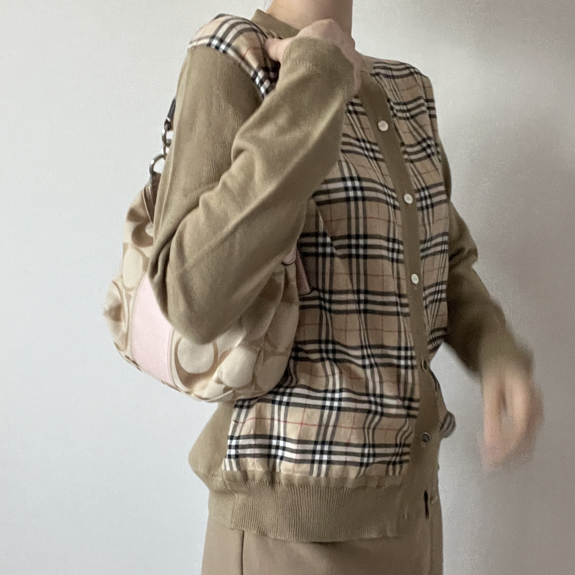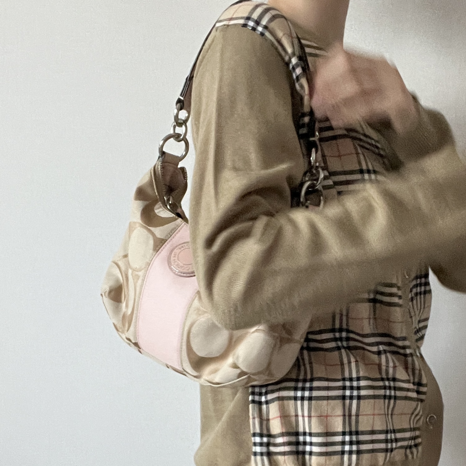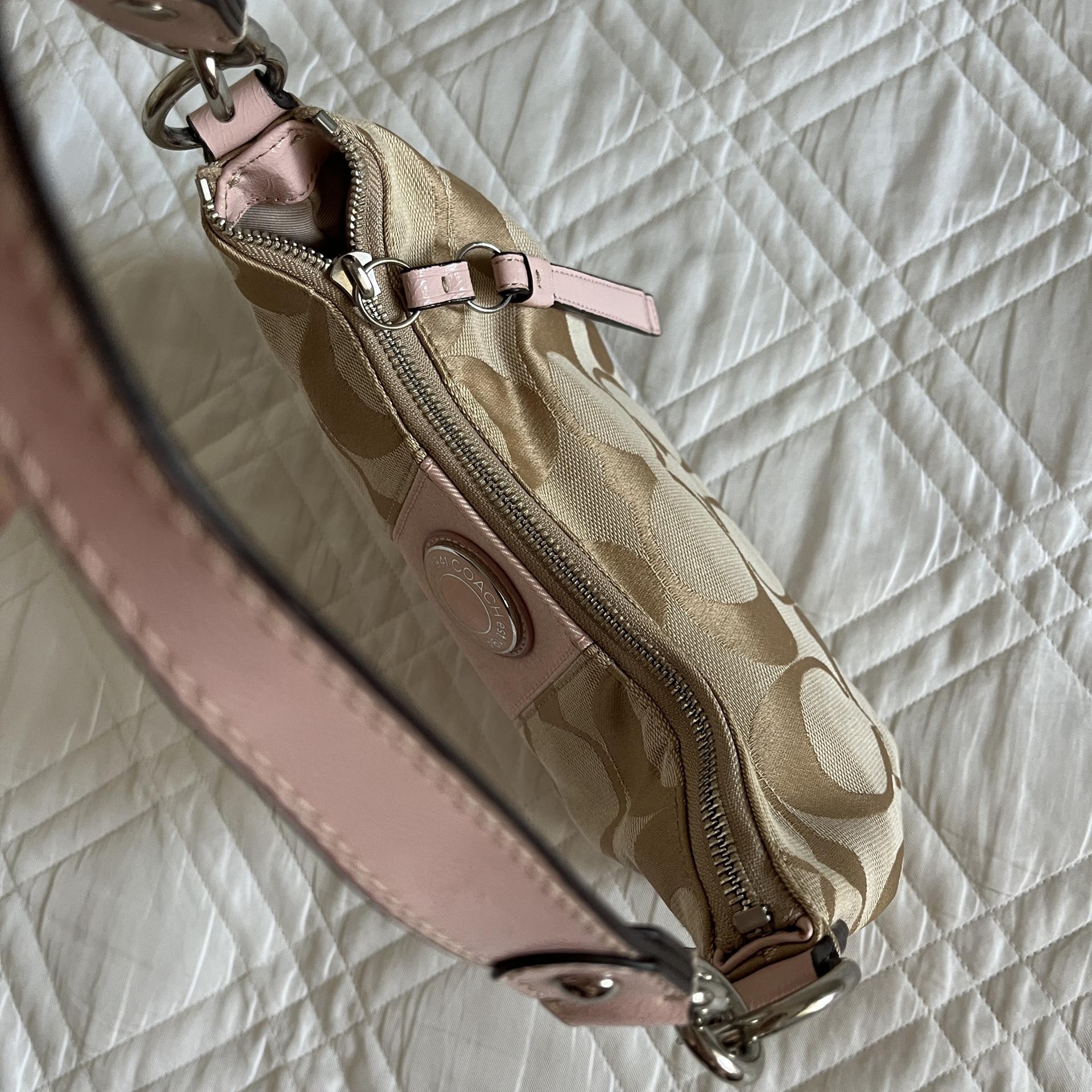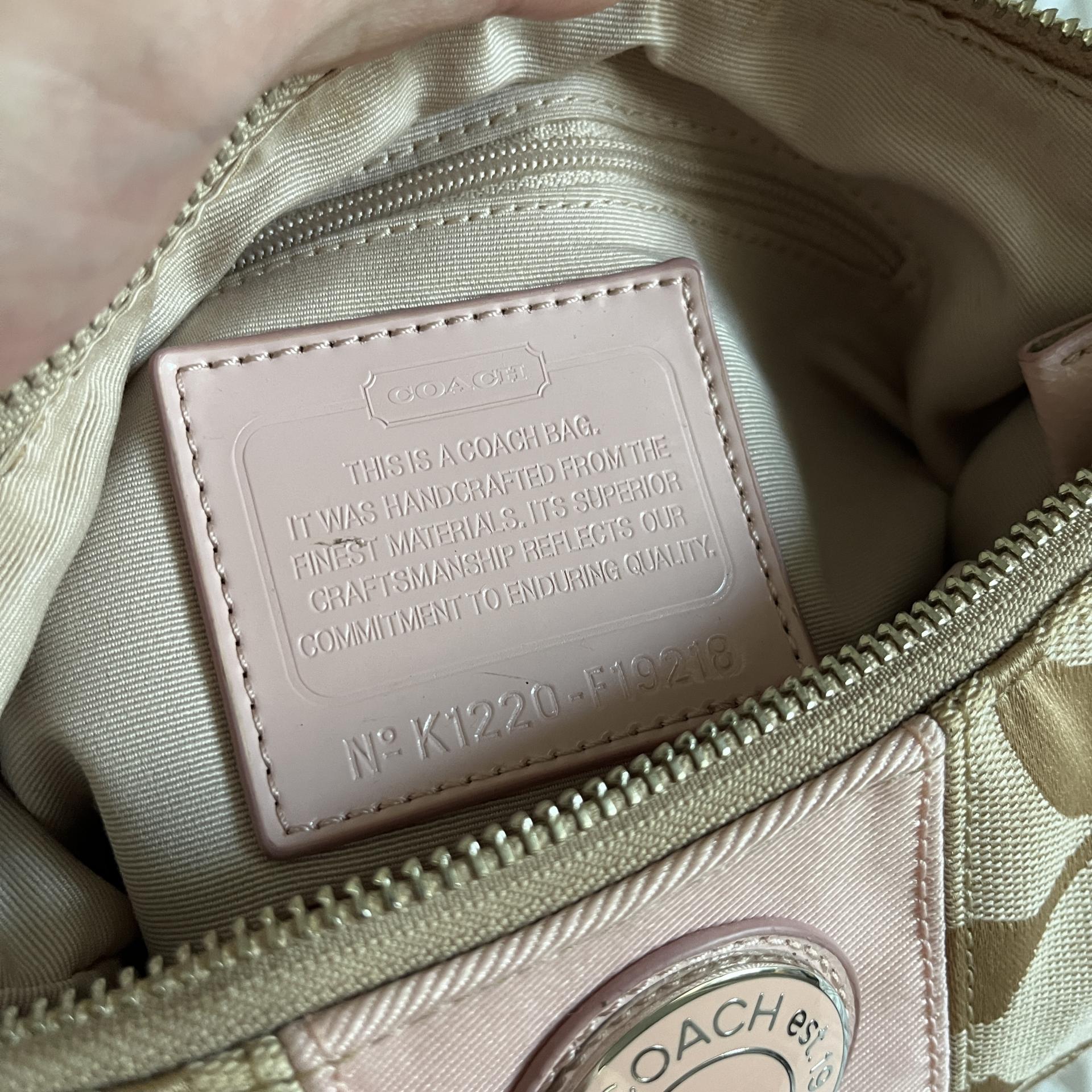 내구성 좋은 자카드 소재로 제작되었으며, 차분하 베이지 바디 컬러와 코치 시그니처 로고 패턴, 포인트 컬러로 돋보이는 핑크 색감이 인상적입니다.