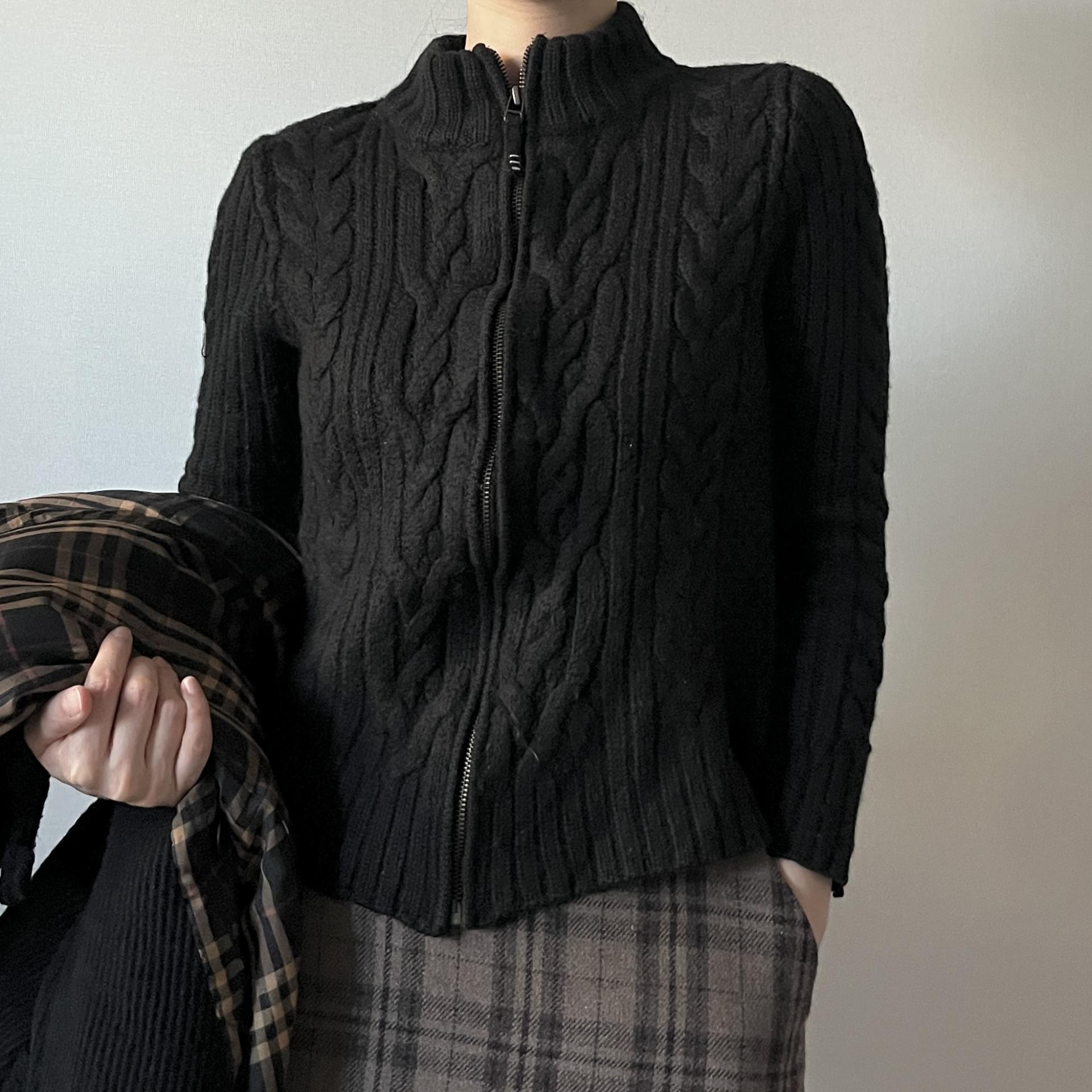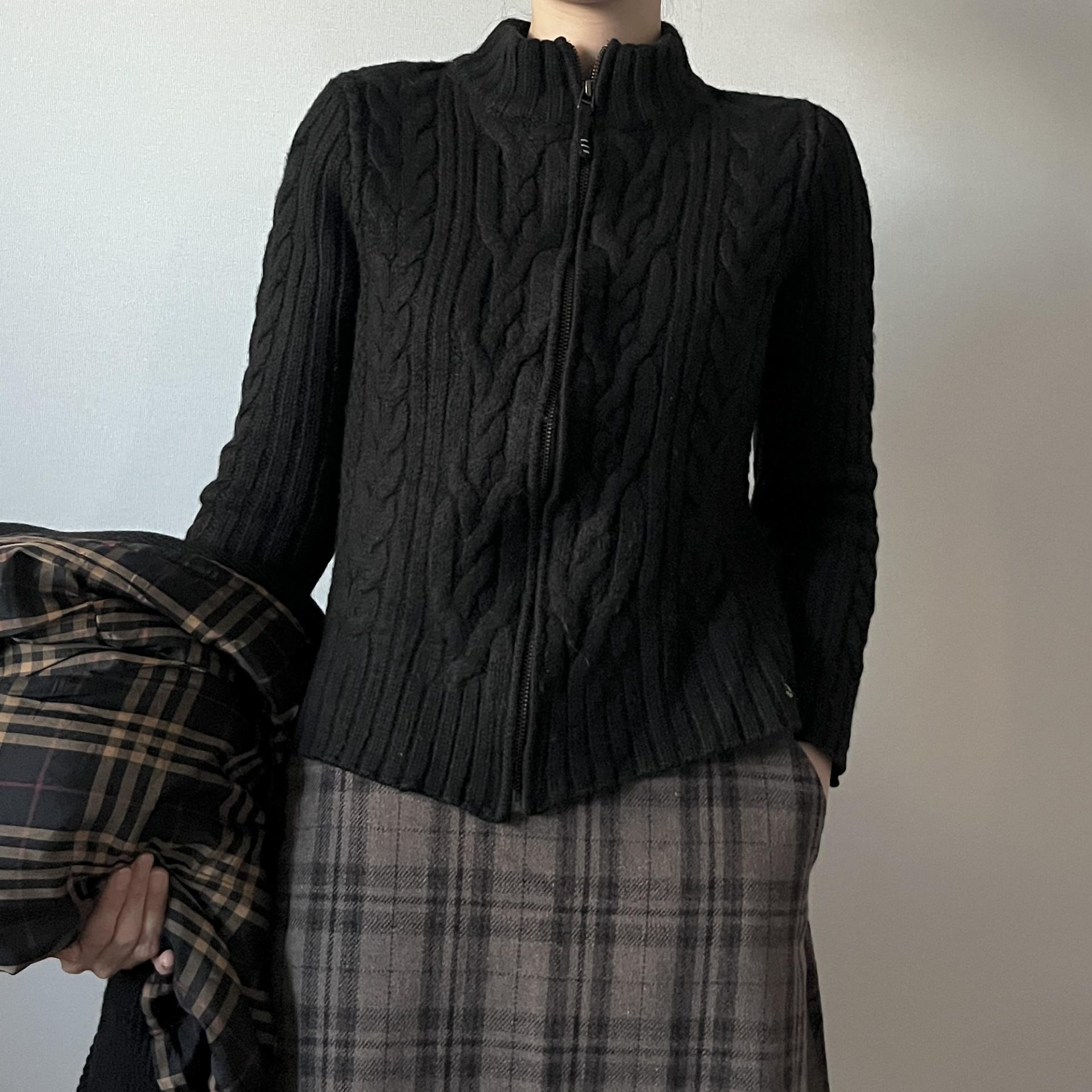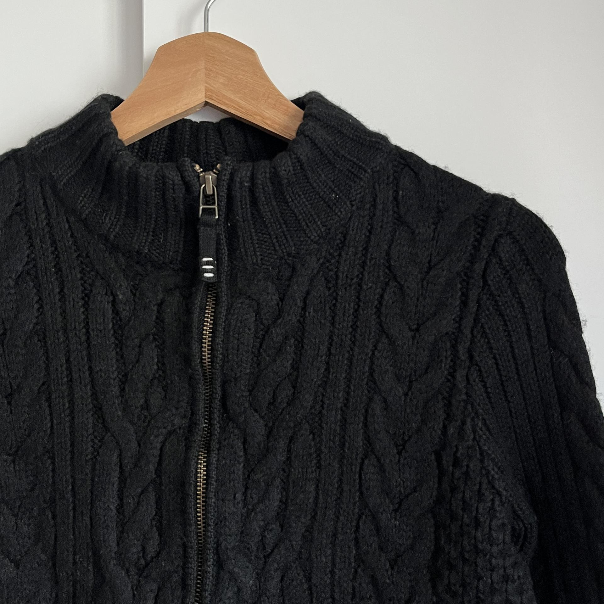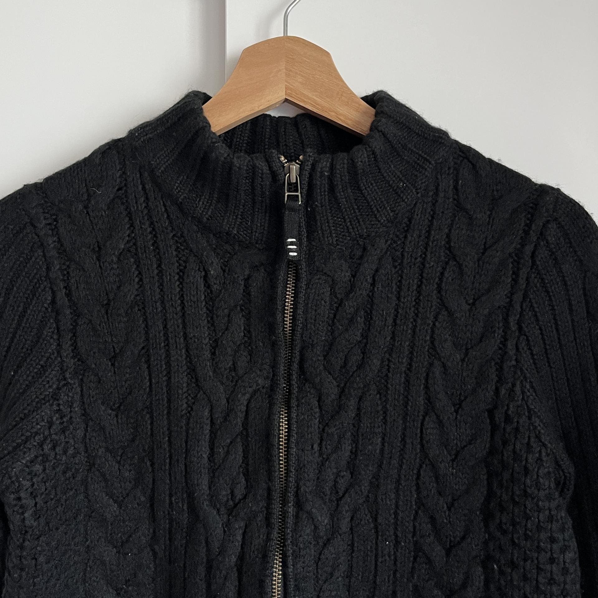 케이블 패턴이 돋보이는 울 집업상품으로 블랙컬러를 가져 보다 편하고 활용성이 높은 상품입니다.