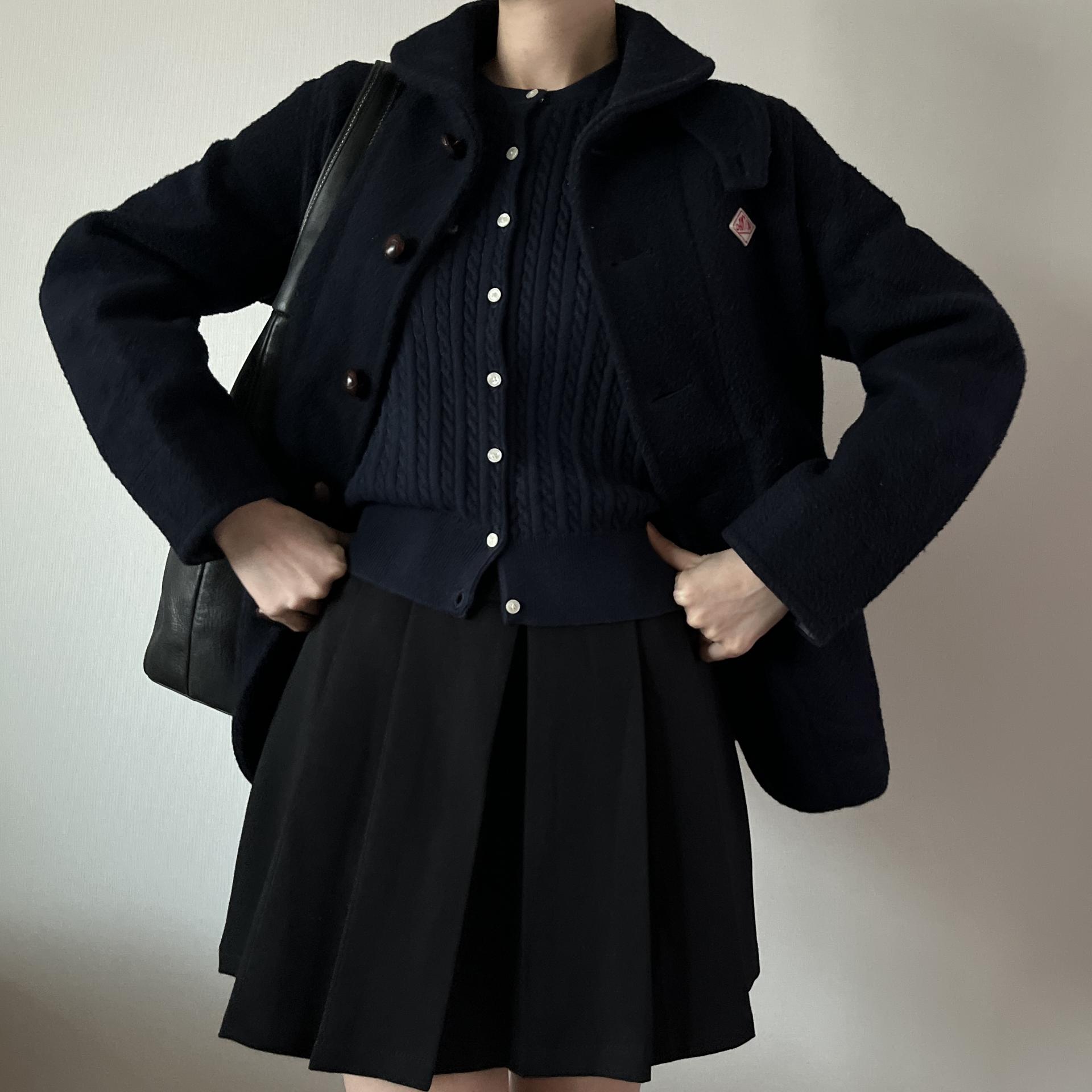 네이비 바디컬러감에 브라운색 귀여운 단추가 돋보이는 단톤 코트 상품입니다.