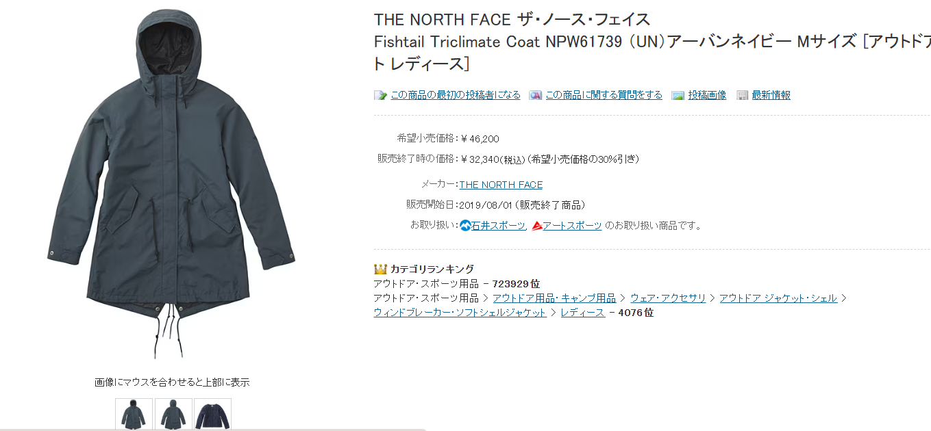 일본판 노스 페이스의 Fishtail Triclimate Coat 상품입니다.