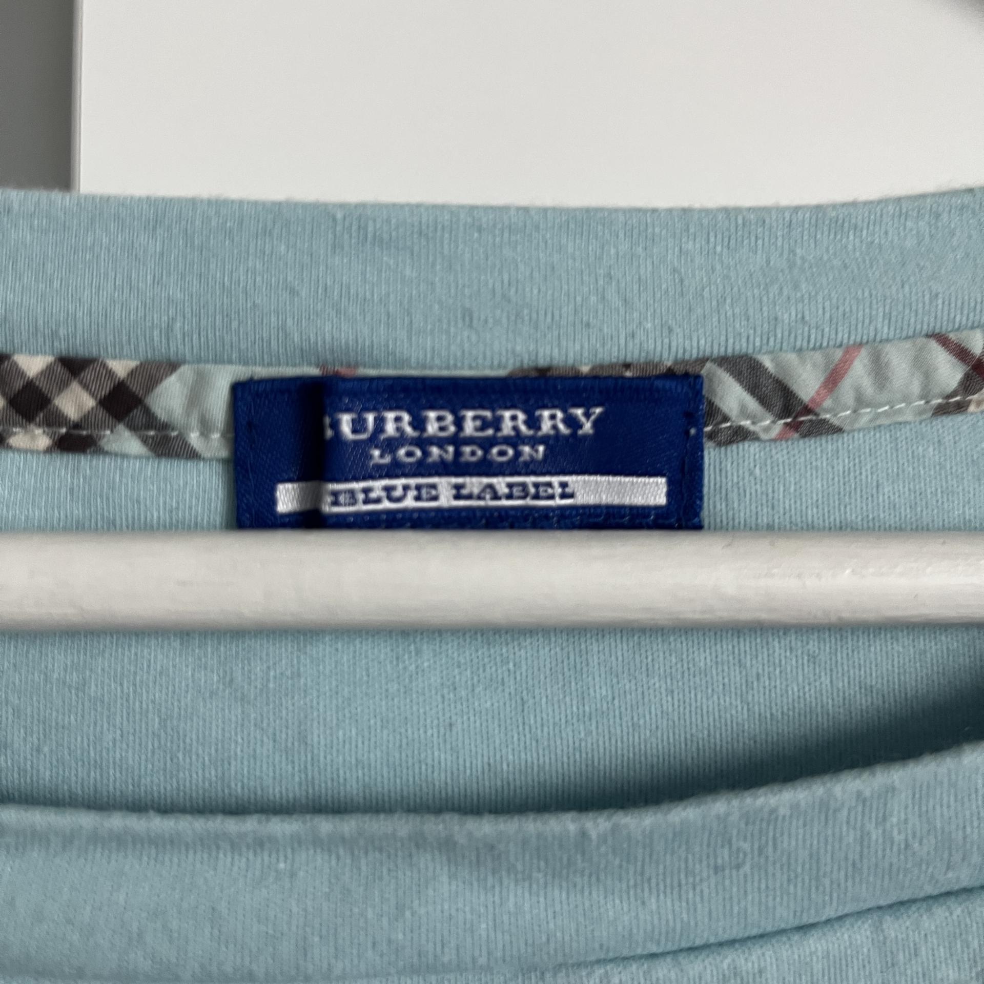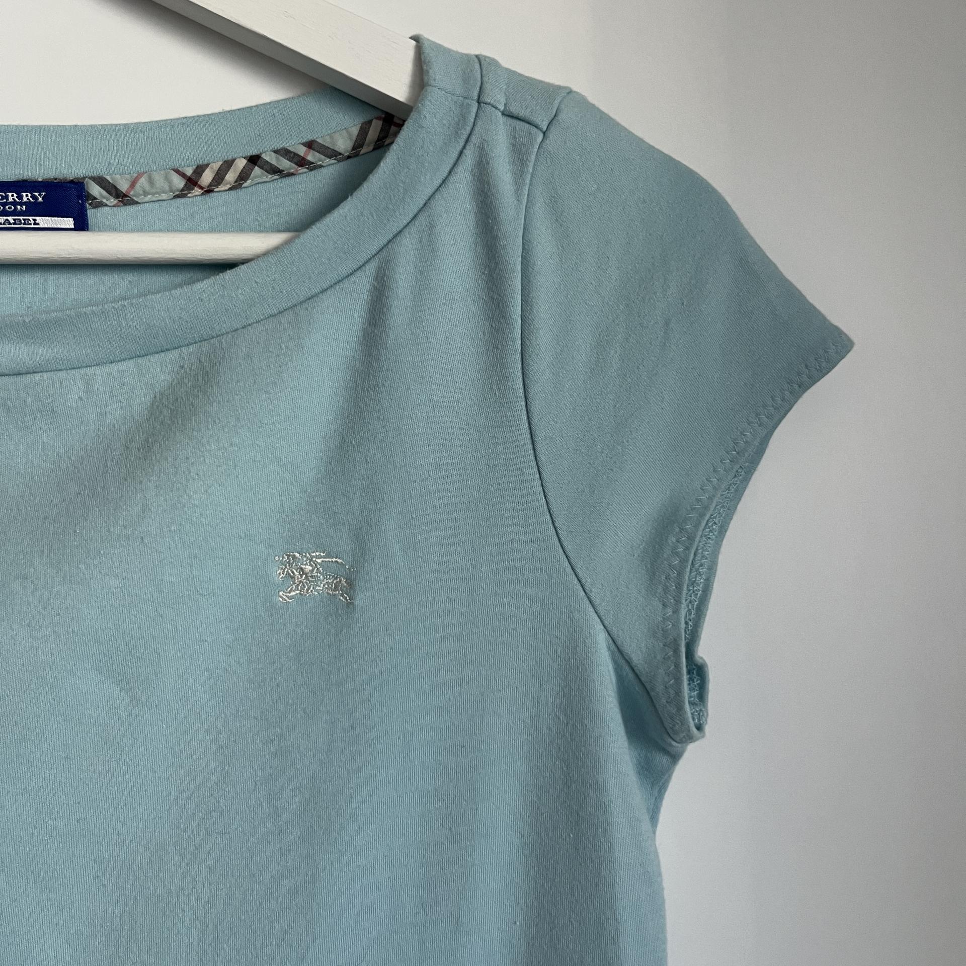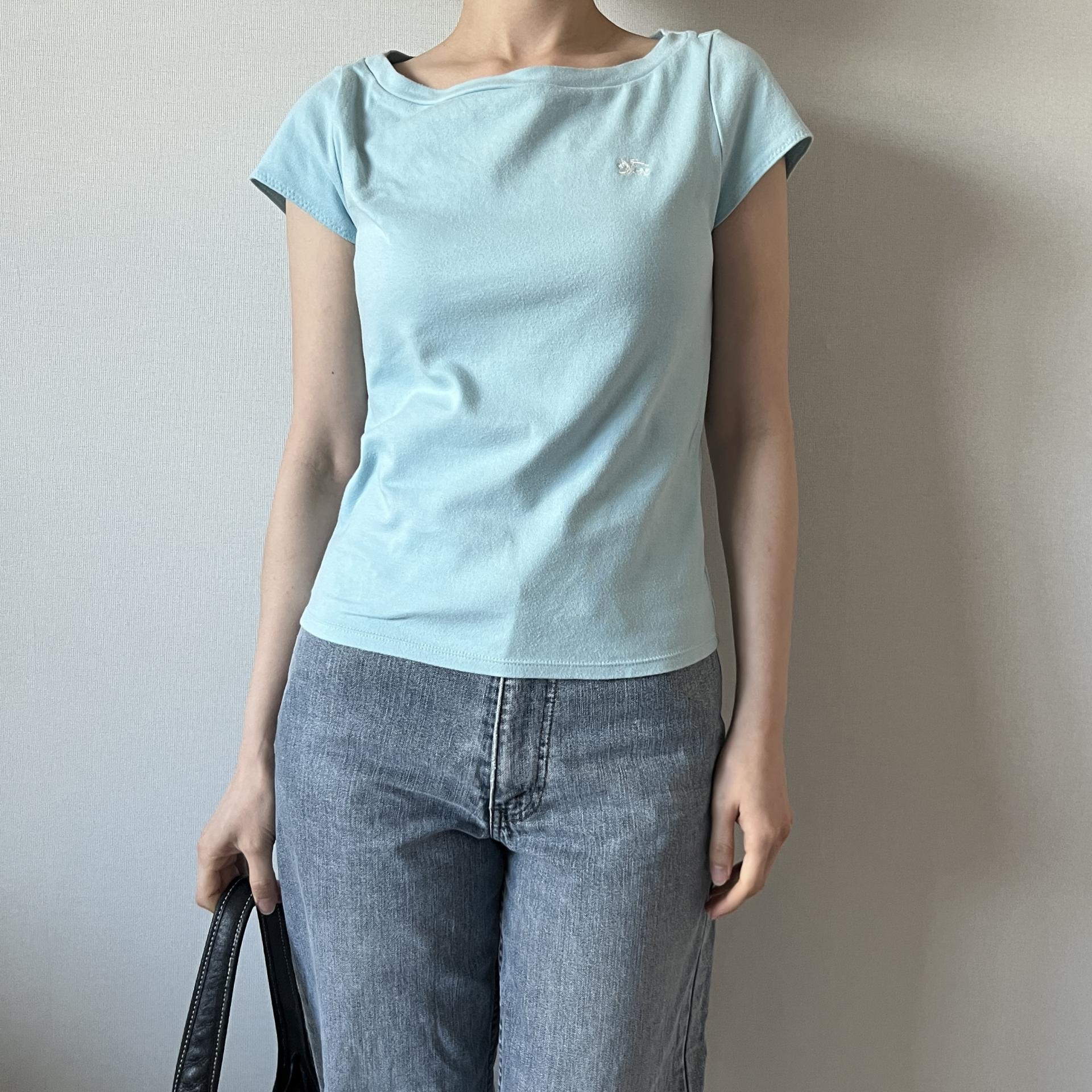 시원한 스카이 블루 바디 컬러와 버버리 자수 로고 포인트가 돋보이는 버버리 블루라벨의 코튼 탑 제품입니다.