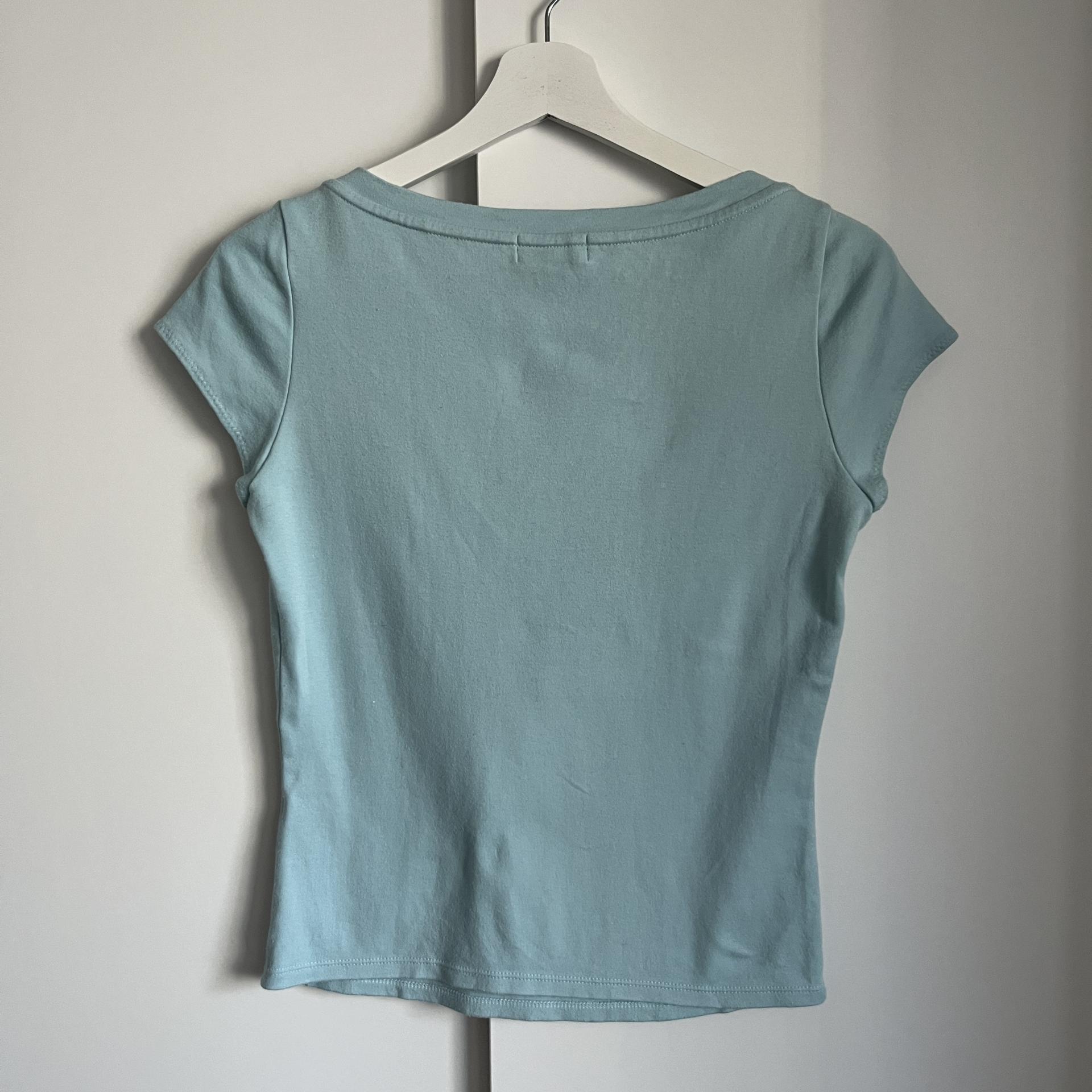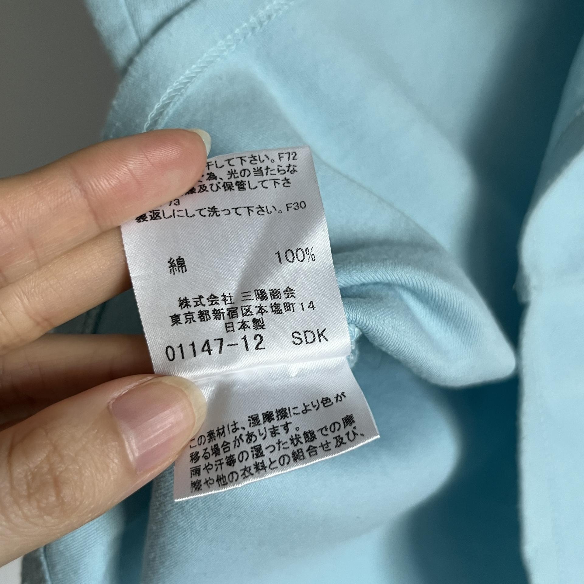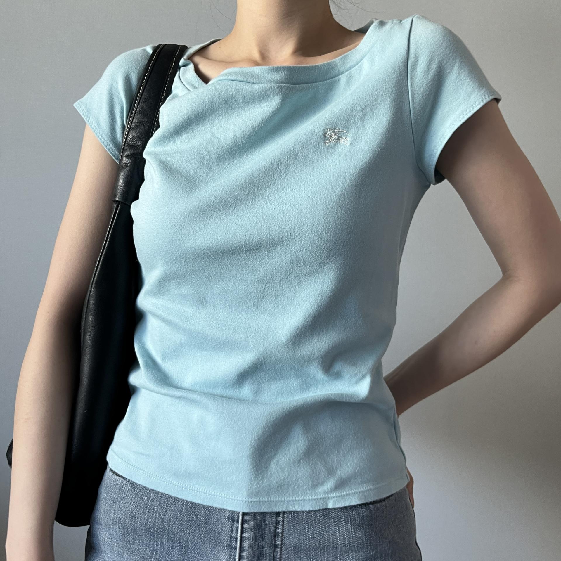 시원한 스카이 블루 바디 컬러와 버버리 자수 로고 포인트가 돋보이는 버버리 블루라벨의 코튼 탑 제품입니다.