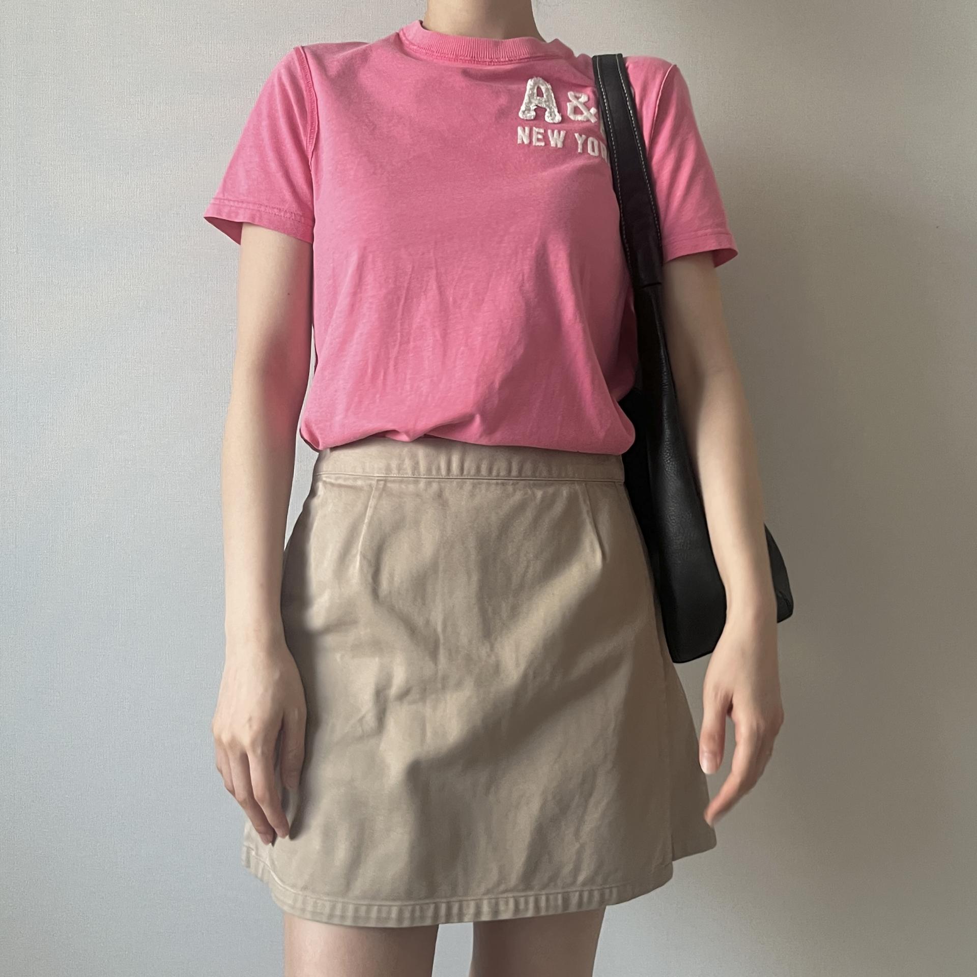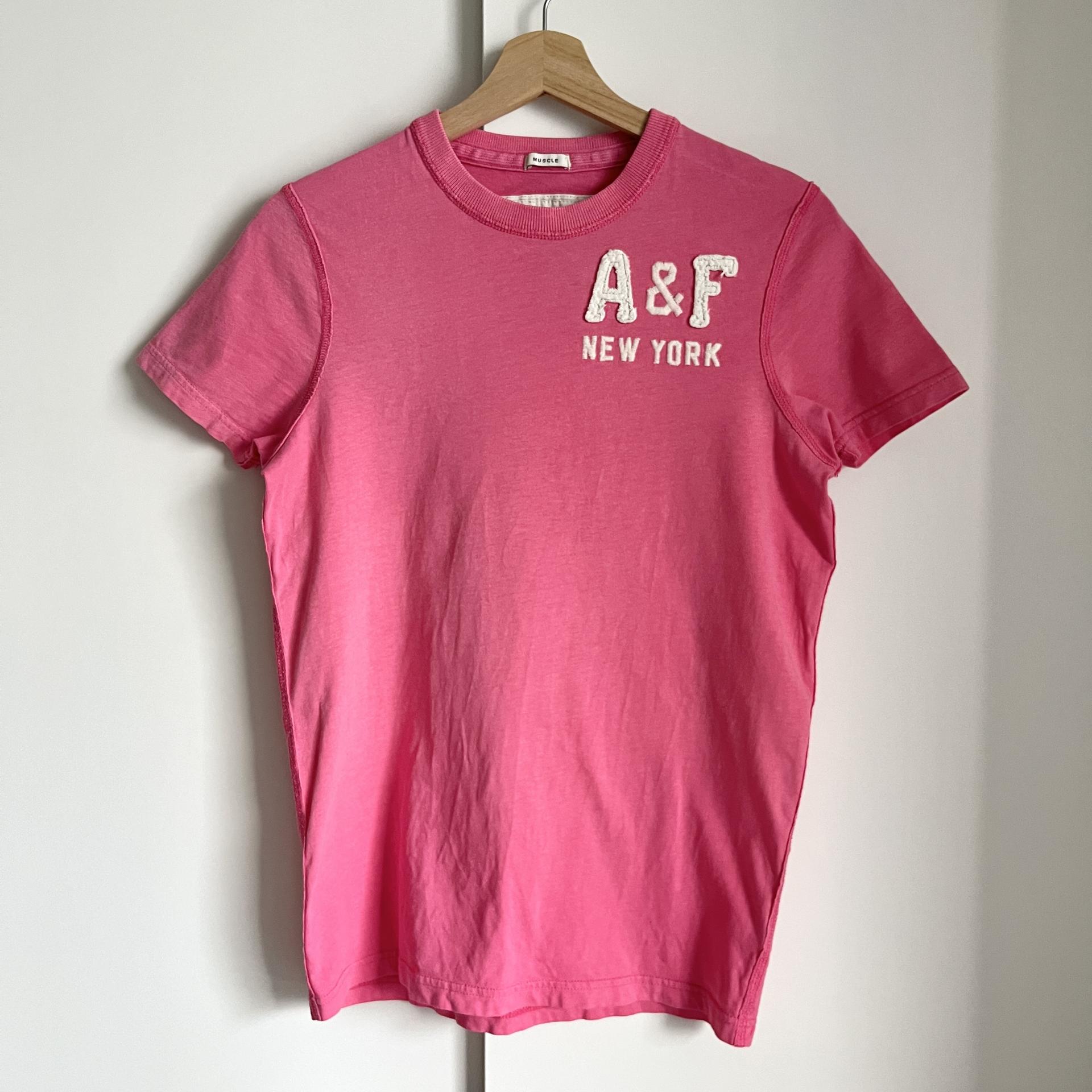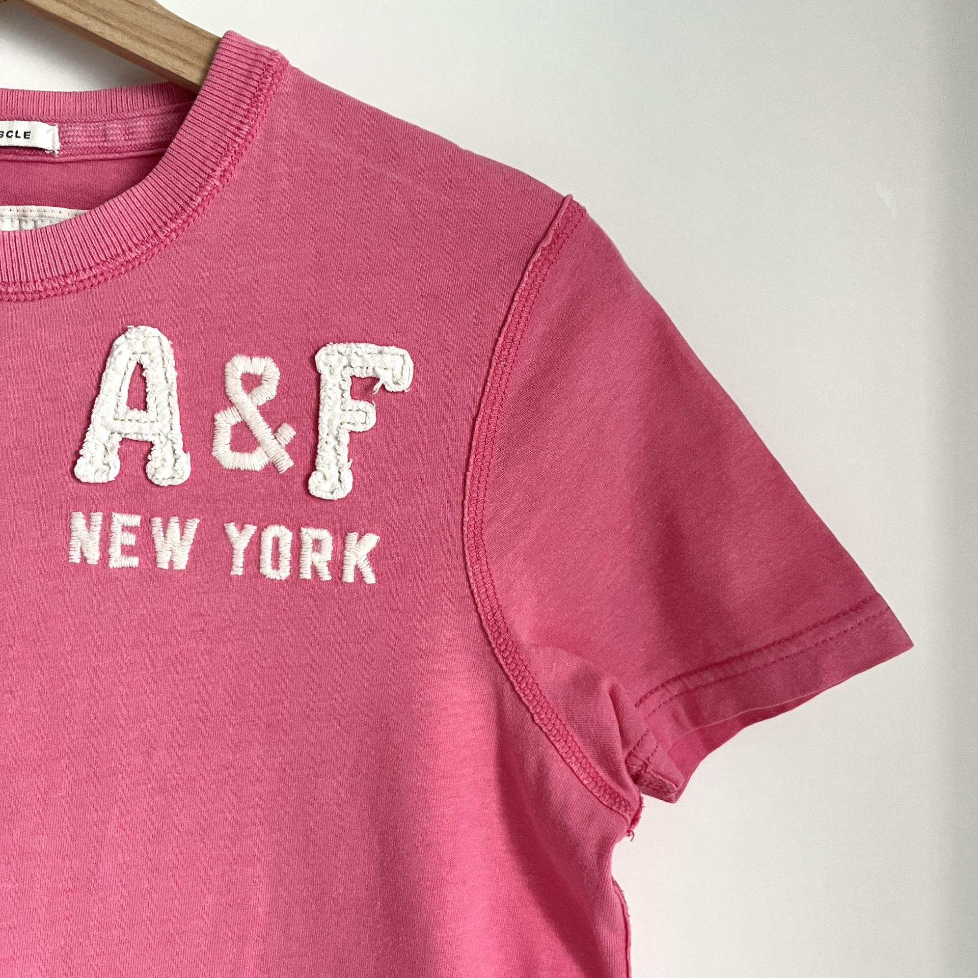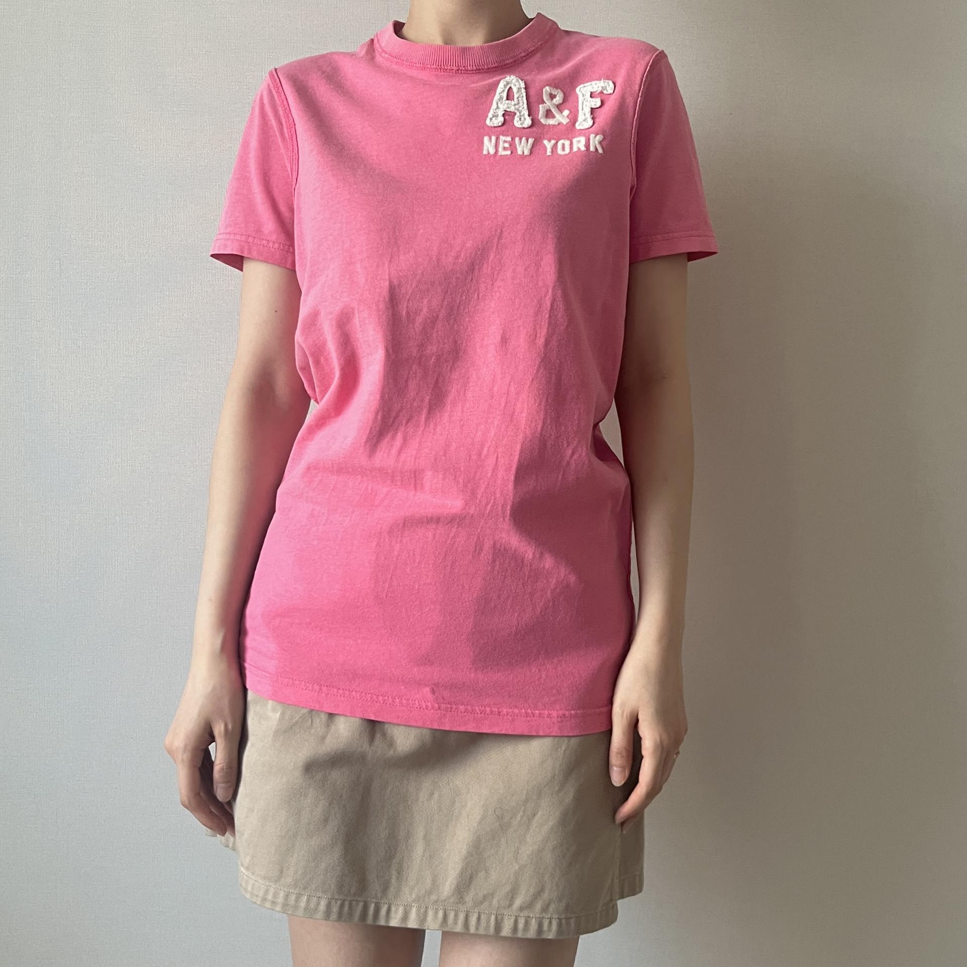 귀여운 핑크 바디 컬러와 아베크롬비 패치 포인트가 돋보이는 티셔츠 제품입니다.