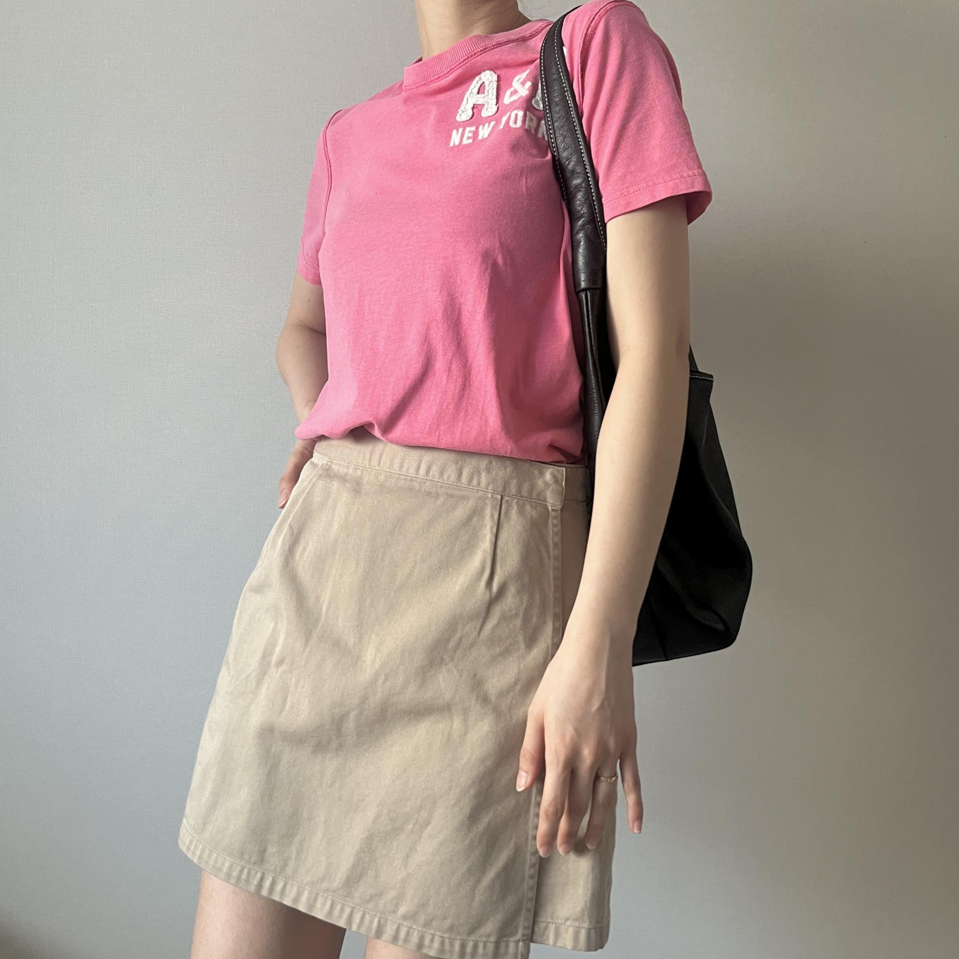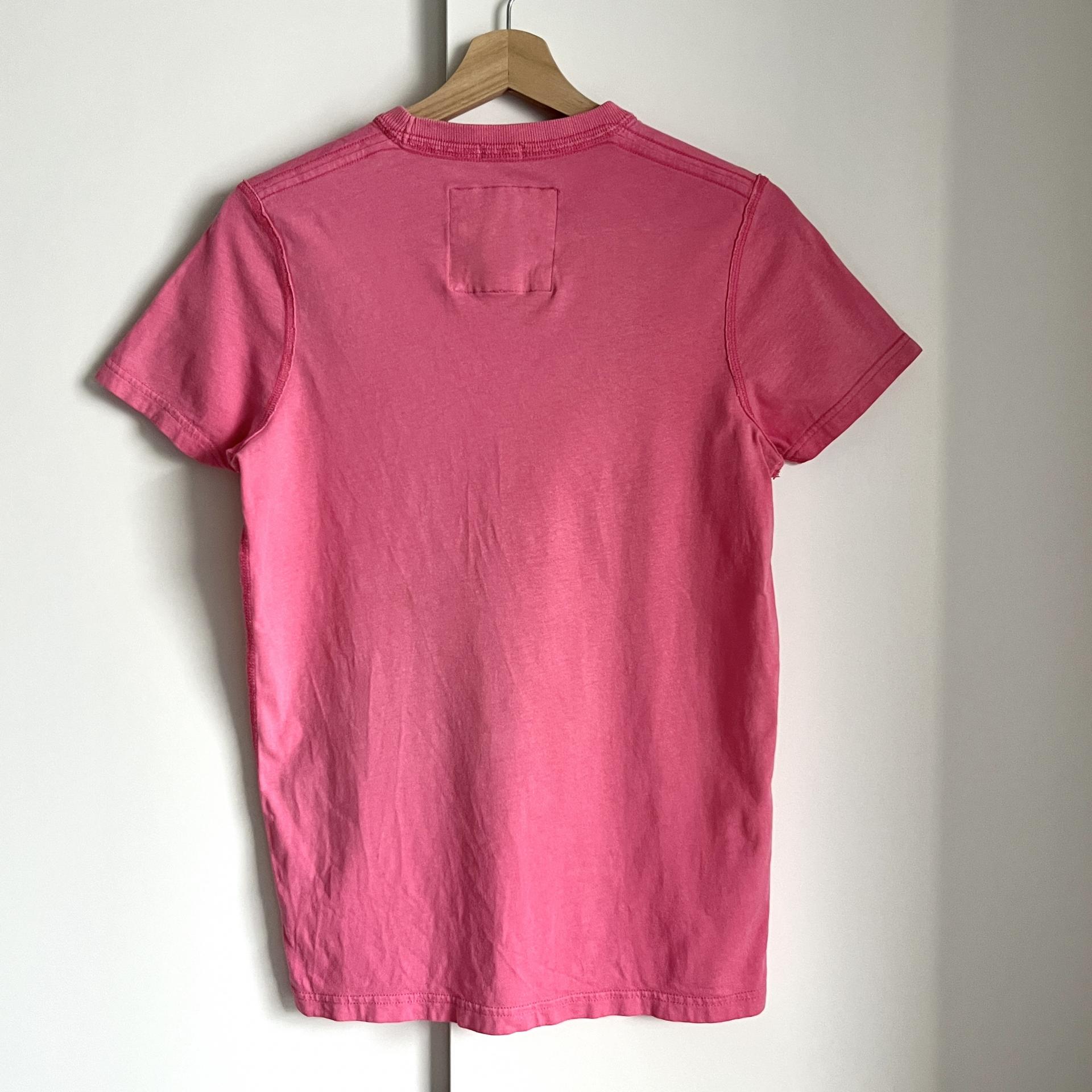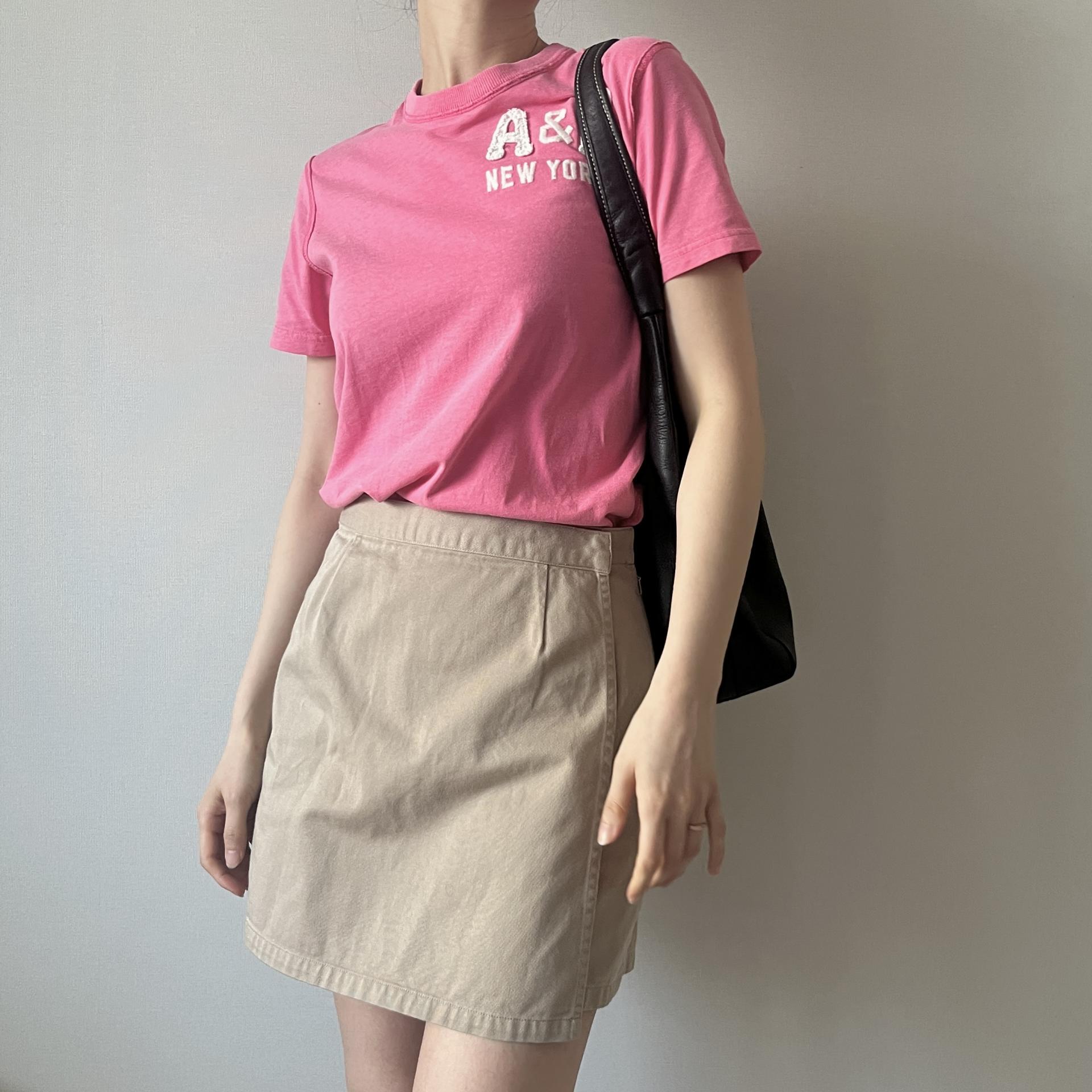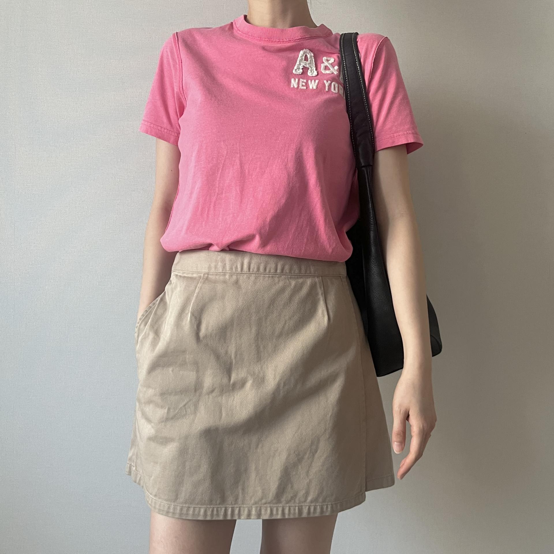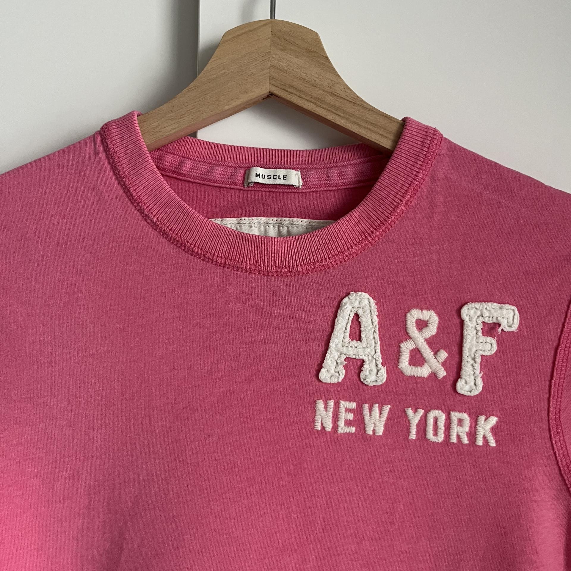 귀여운 핑크 바디 컬러와 아베크롬비 패치 포인트가 돋보이는 티셔츠 제품입니다.