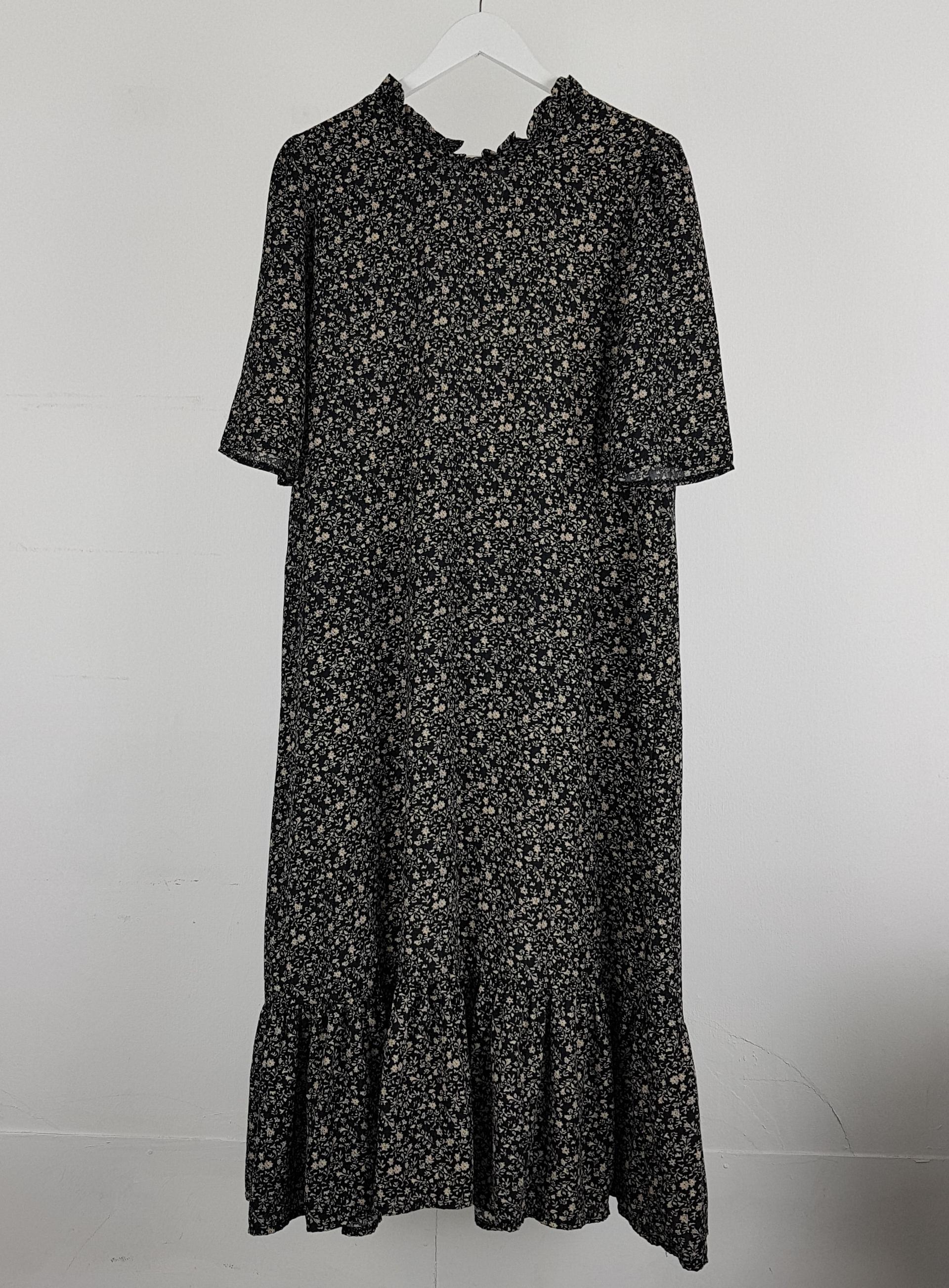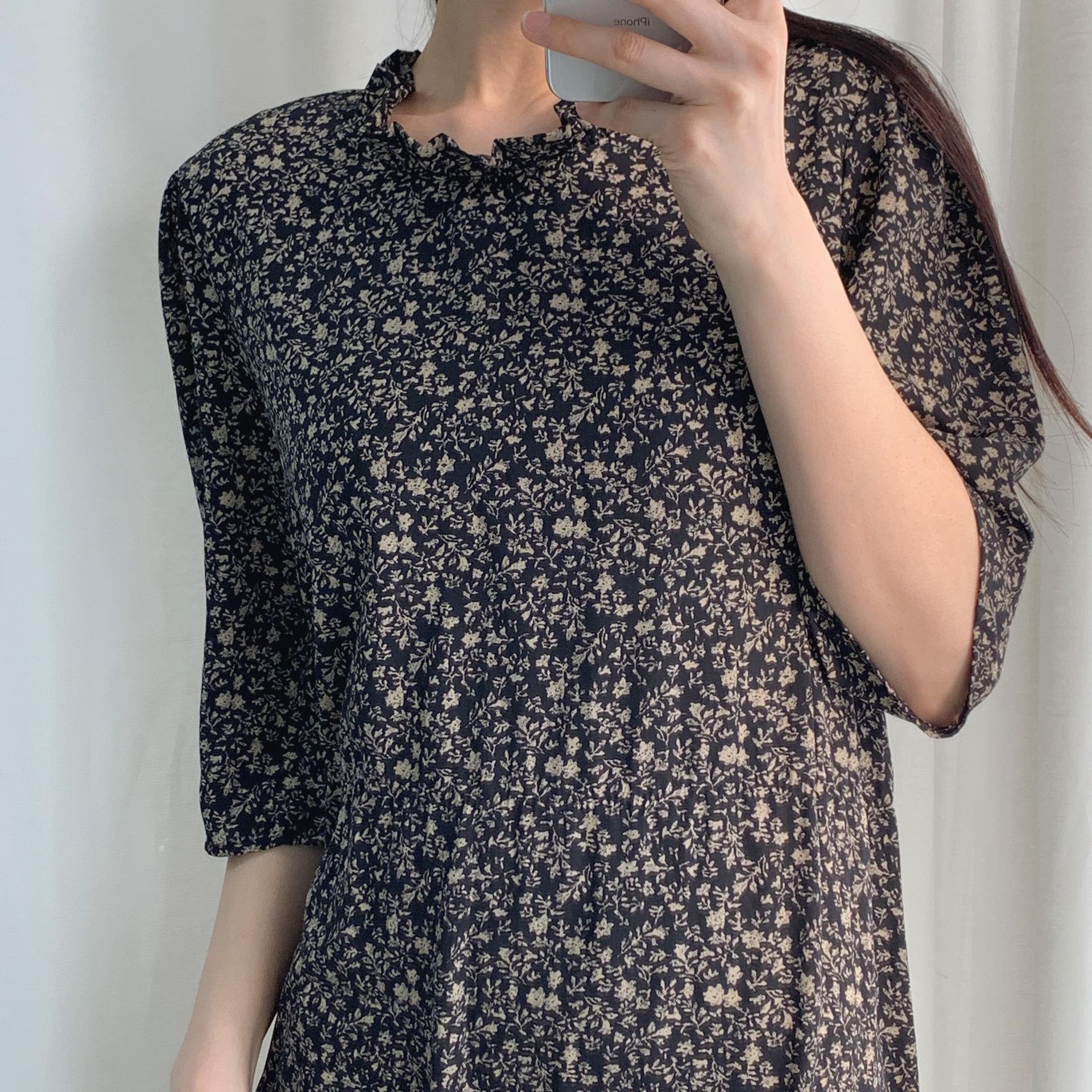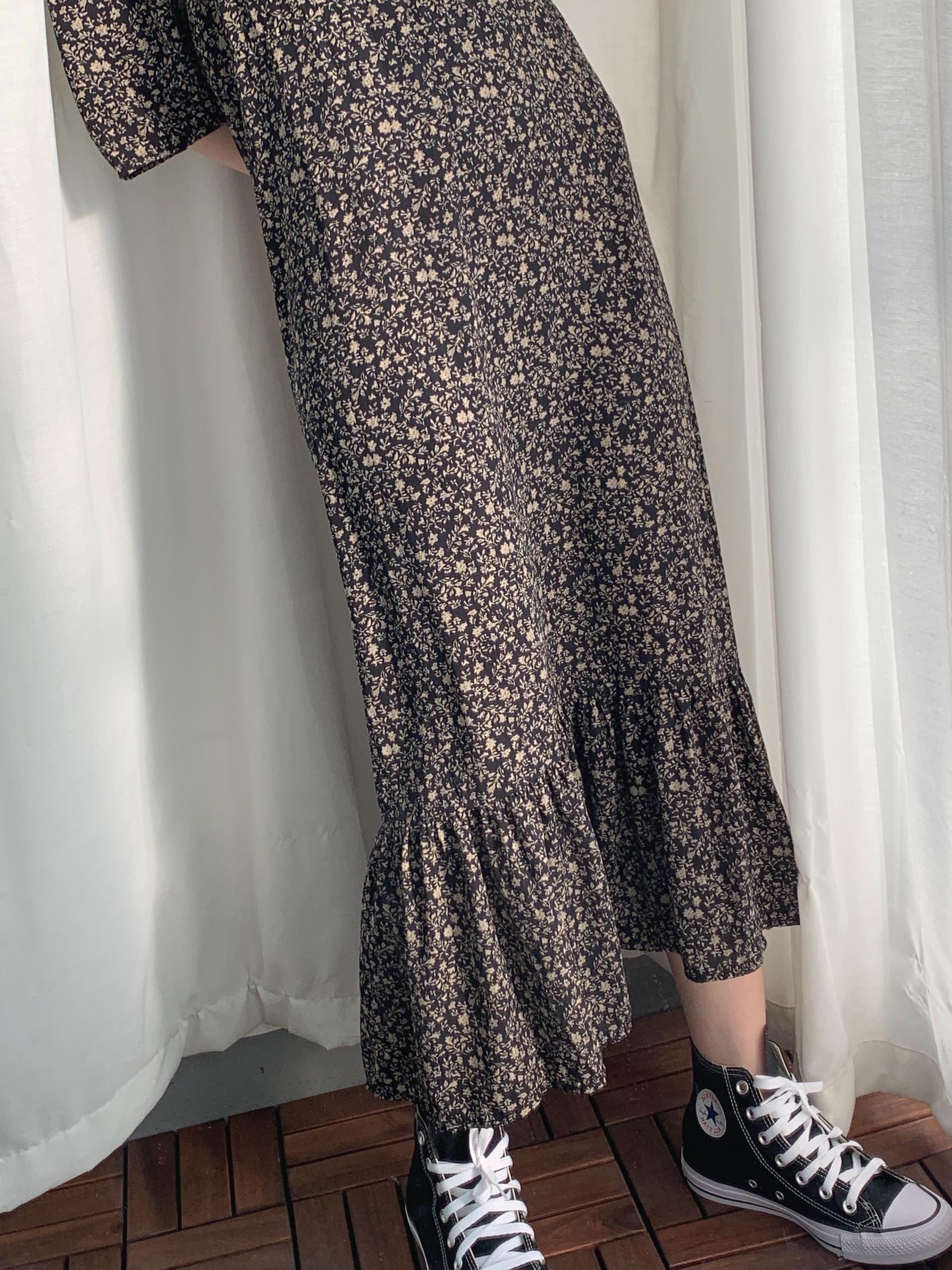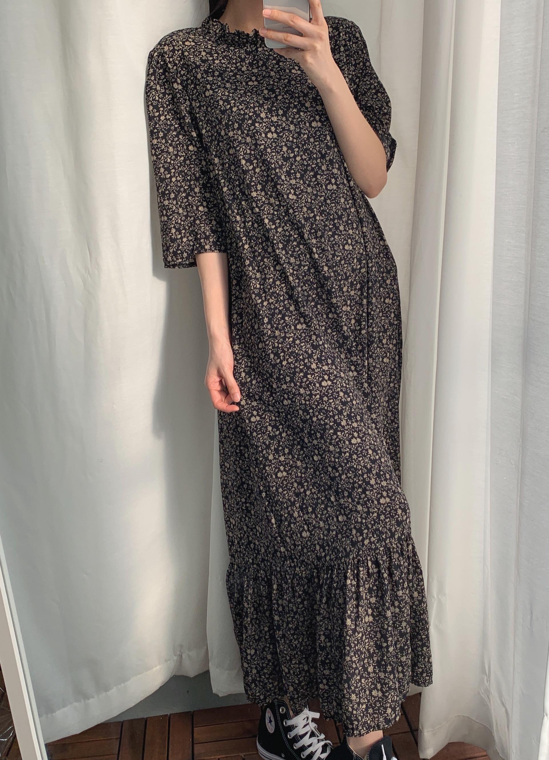 블랙 바디 컬러 위 베이지 플라워 패턴이 인상적인 원피스 아이템입니다.