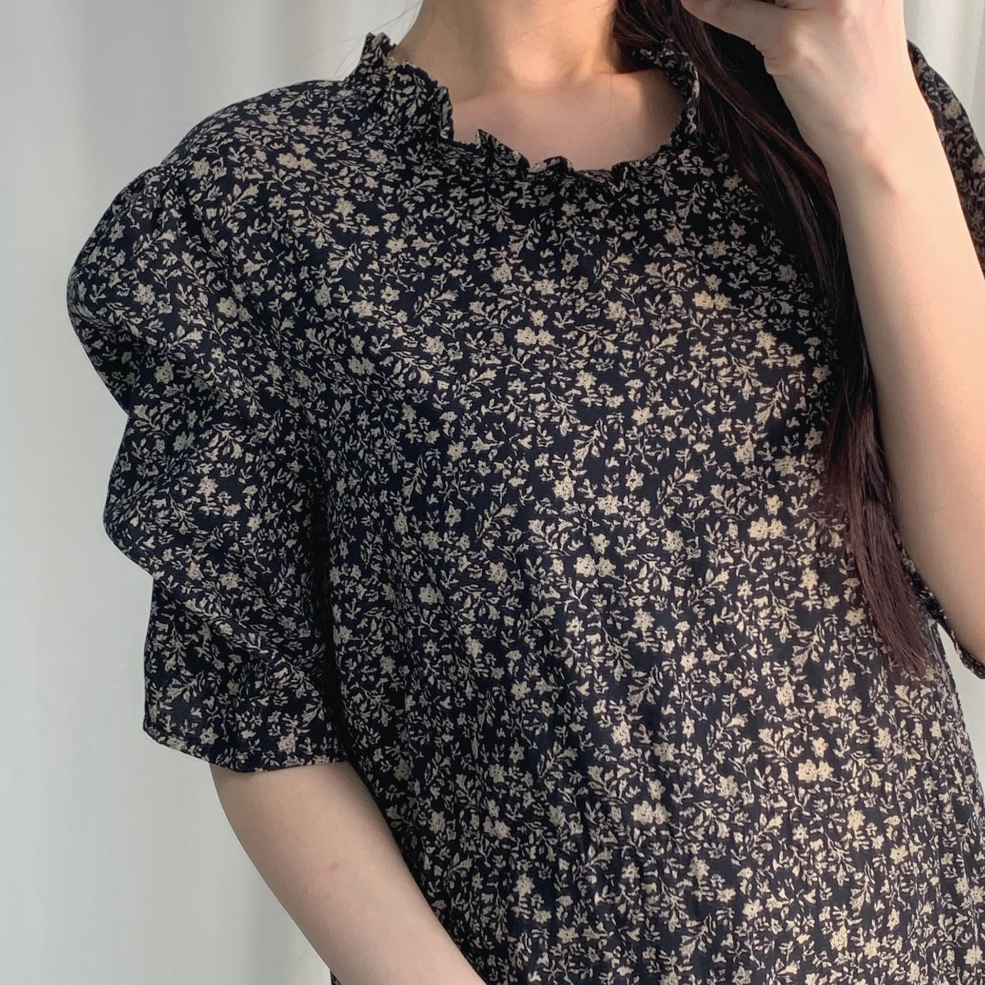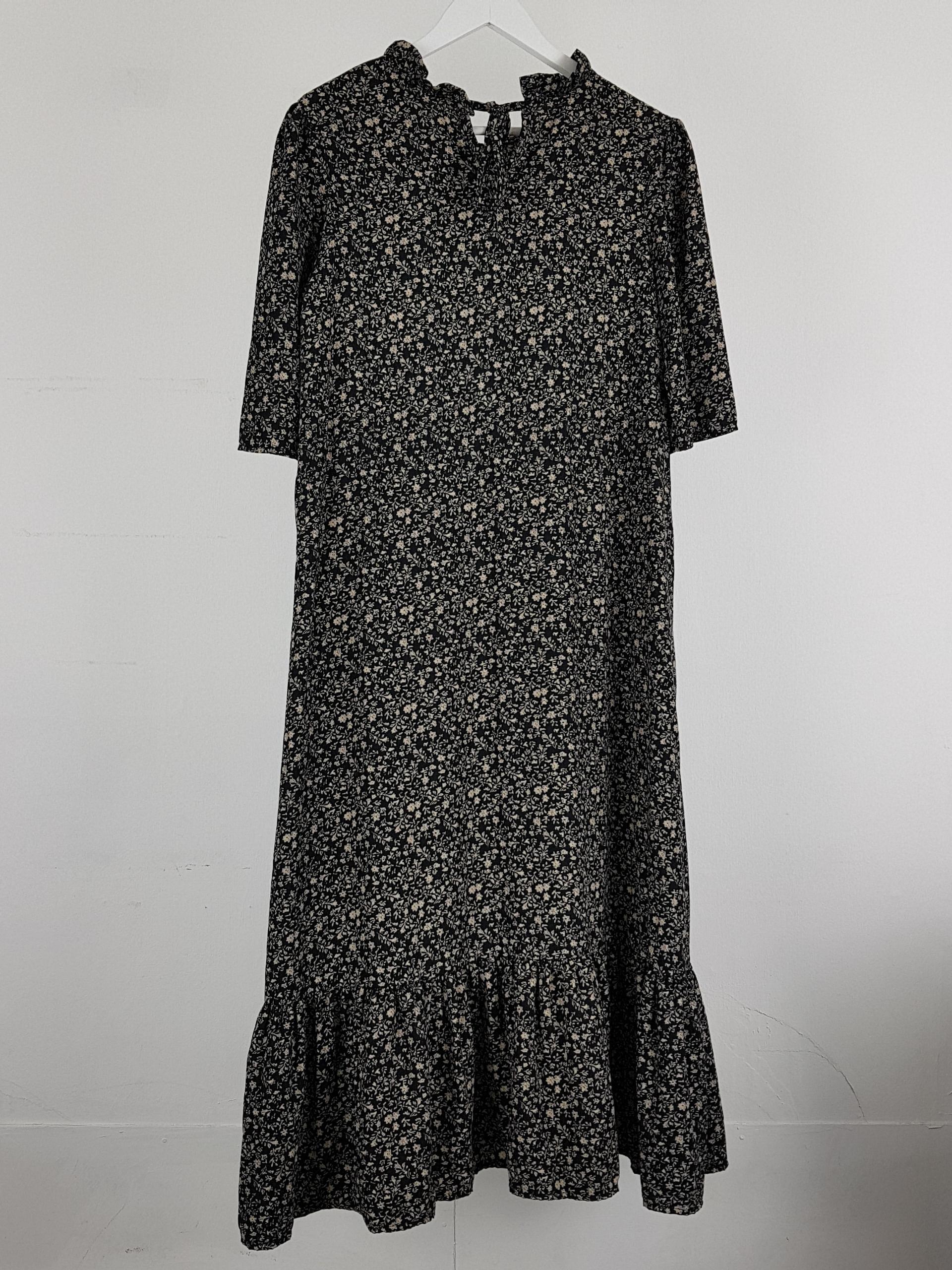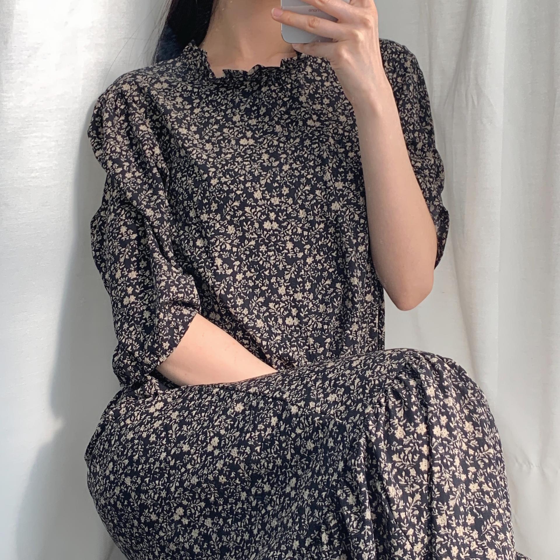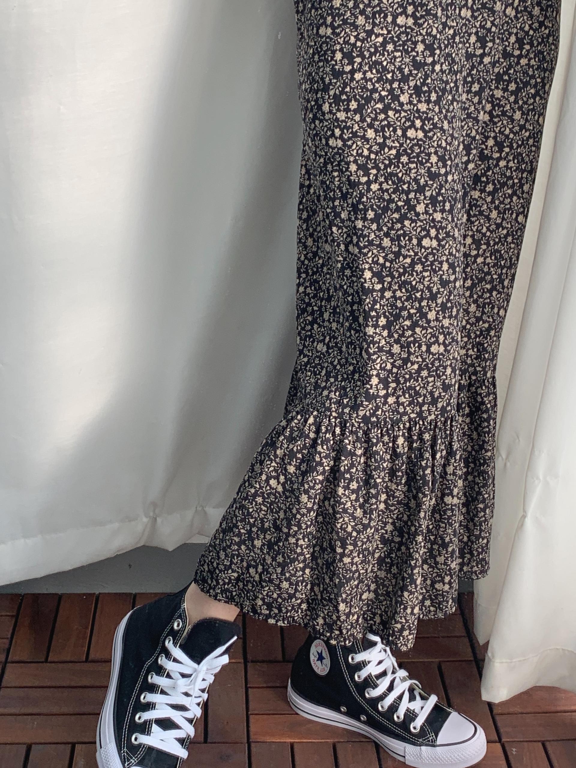 블랙 바디 컬러 위 베이지 플라워 패턴이 인상적인 원피스 아이템입니다.