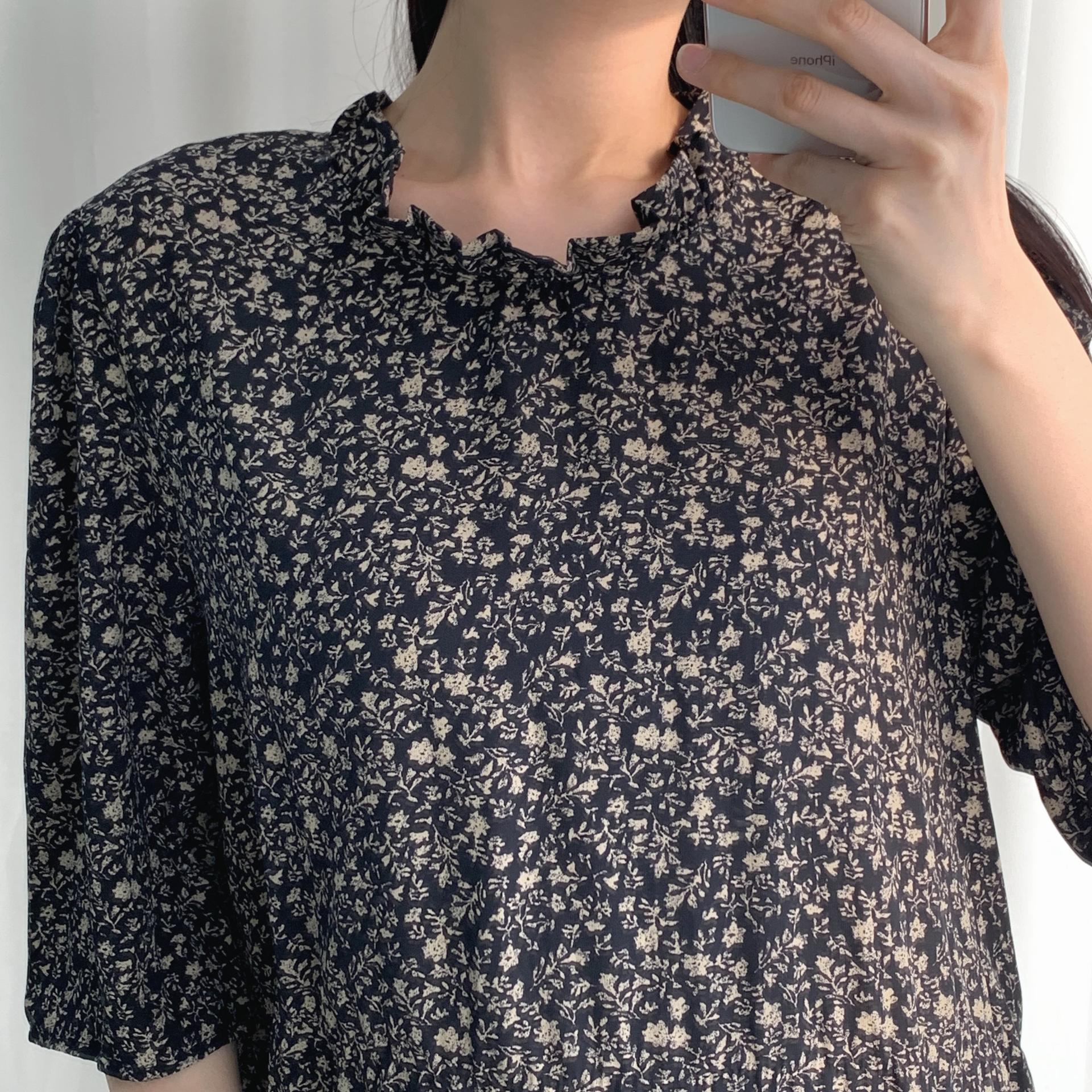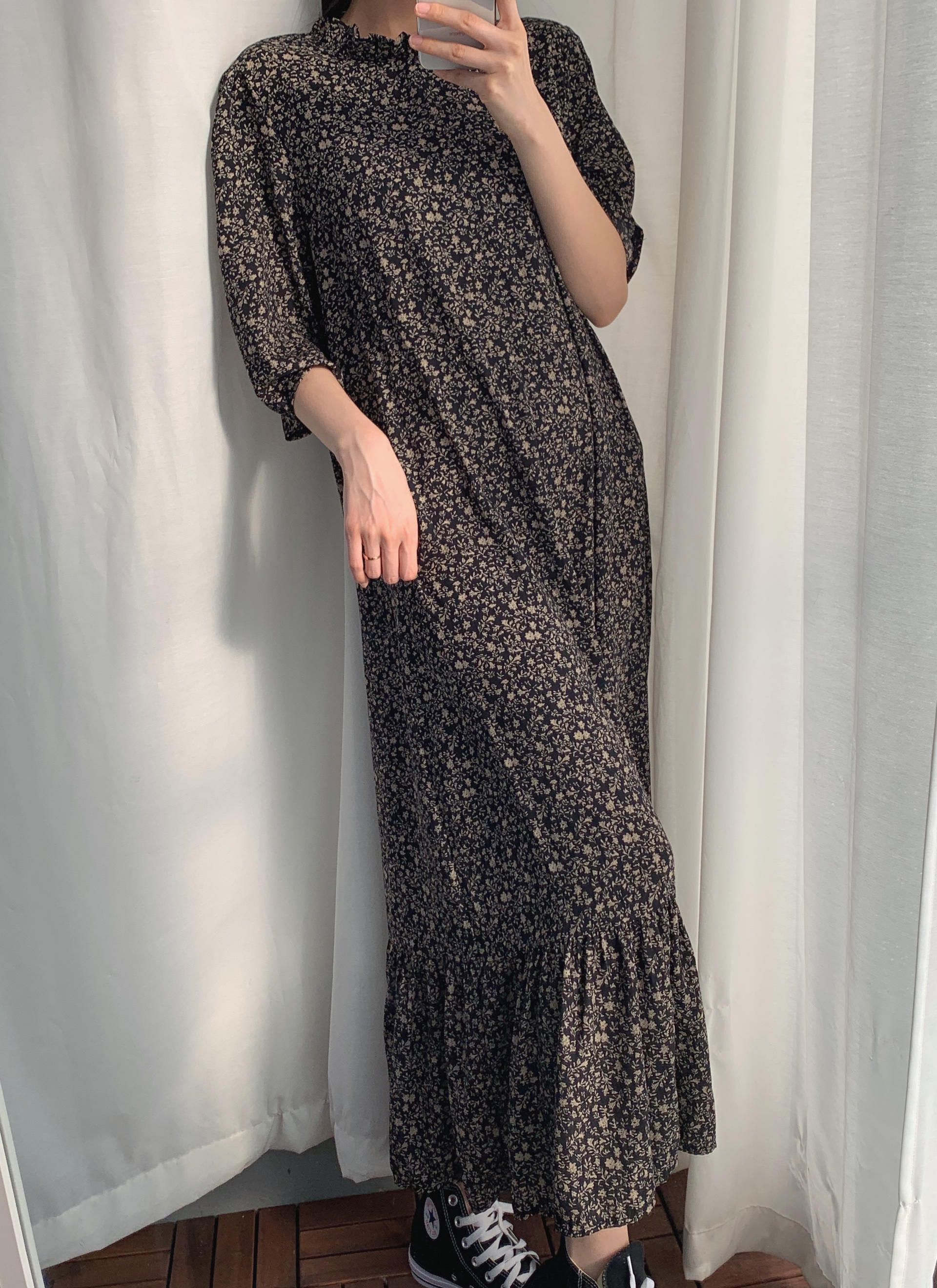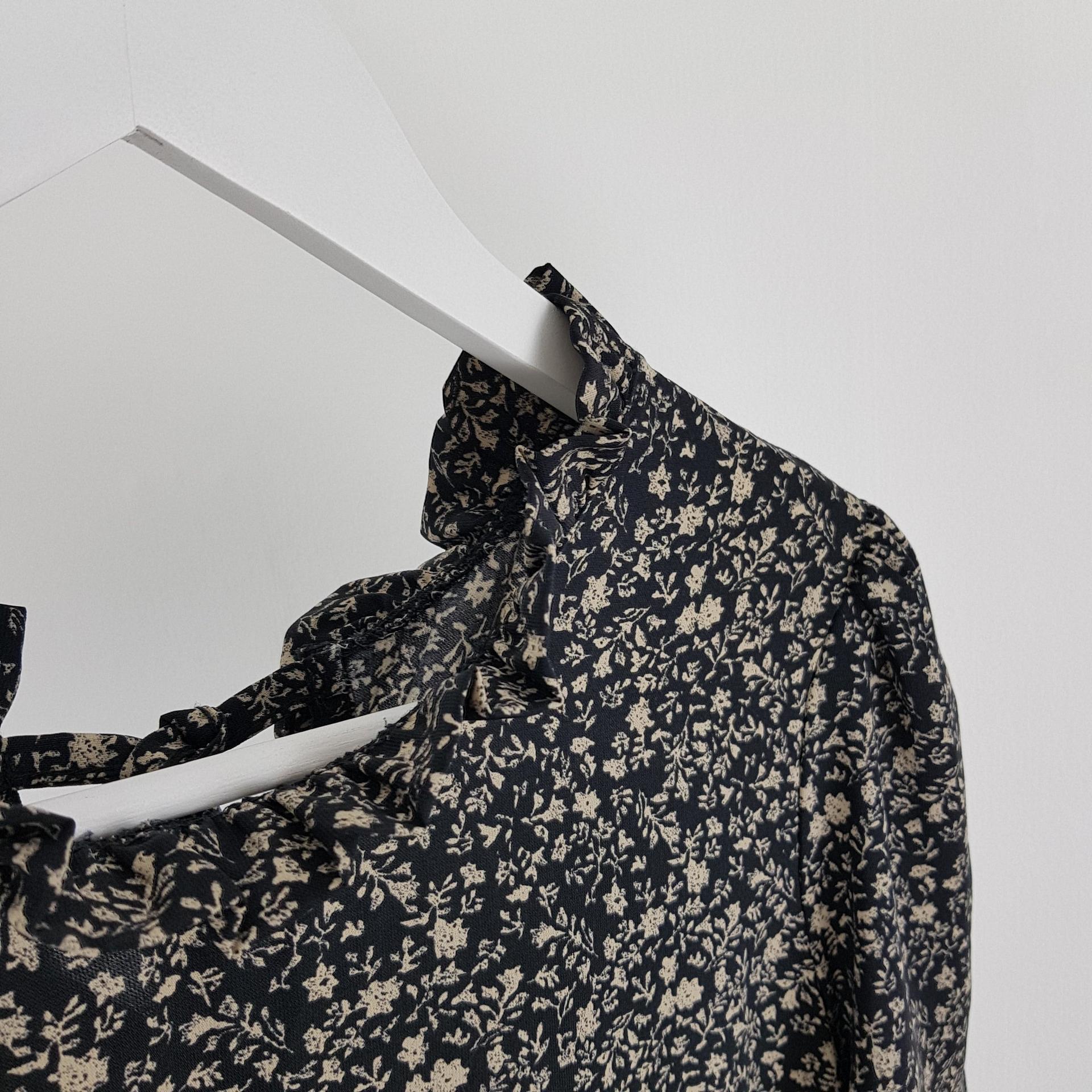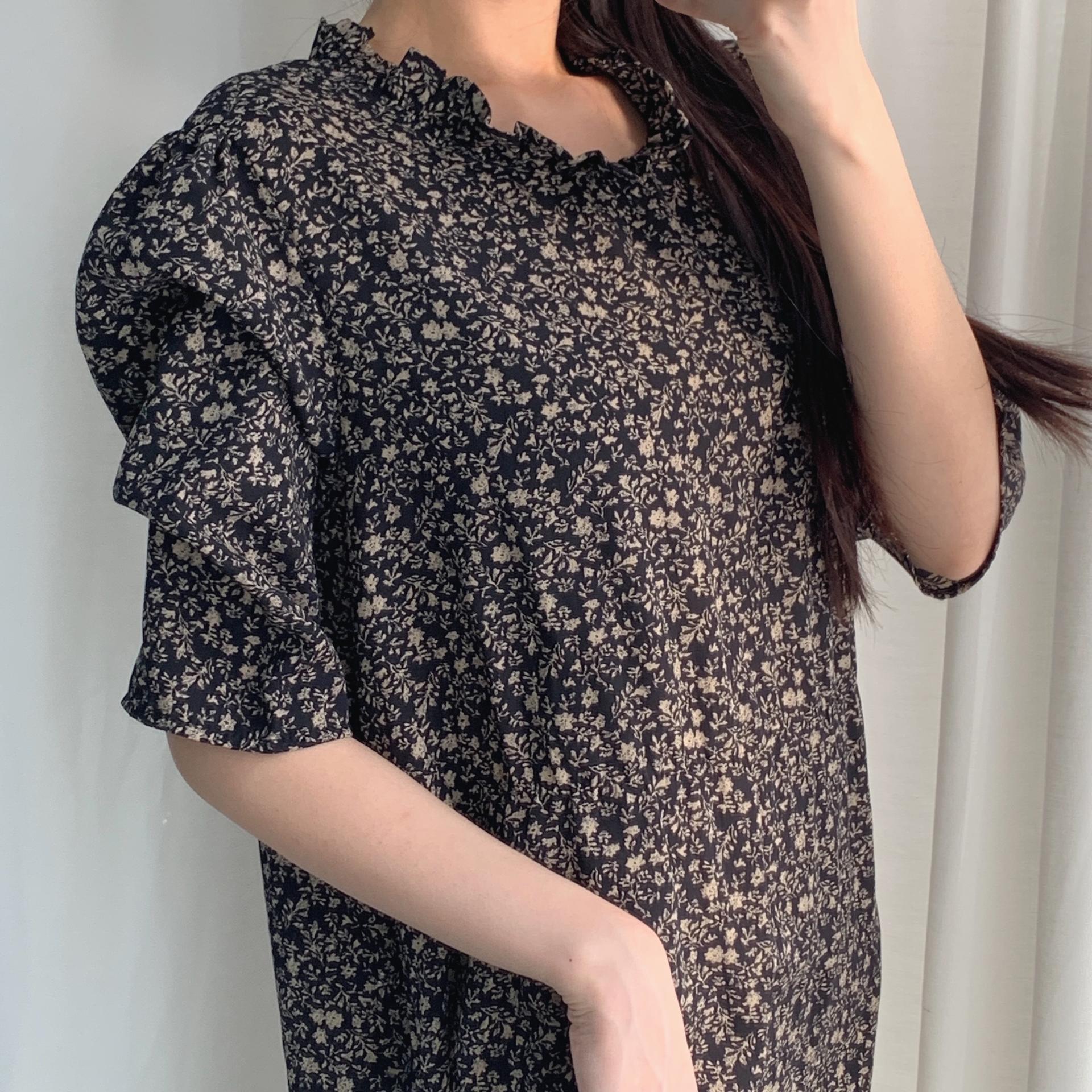 블랙 바디 컬러 위 베이지 플라워 패턴이 인상적인 원피스 아이템입니다.