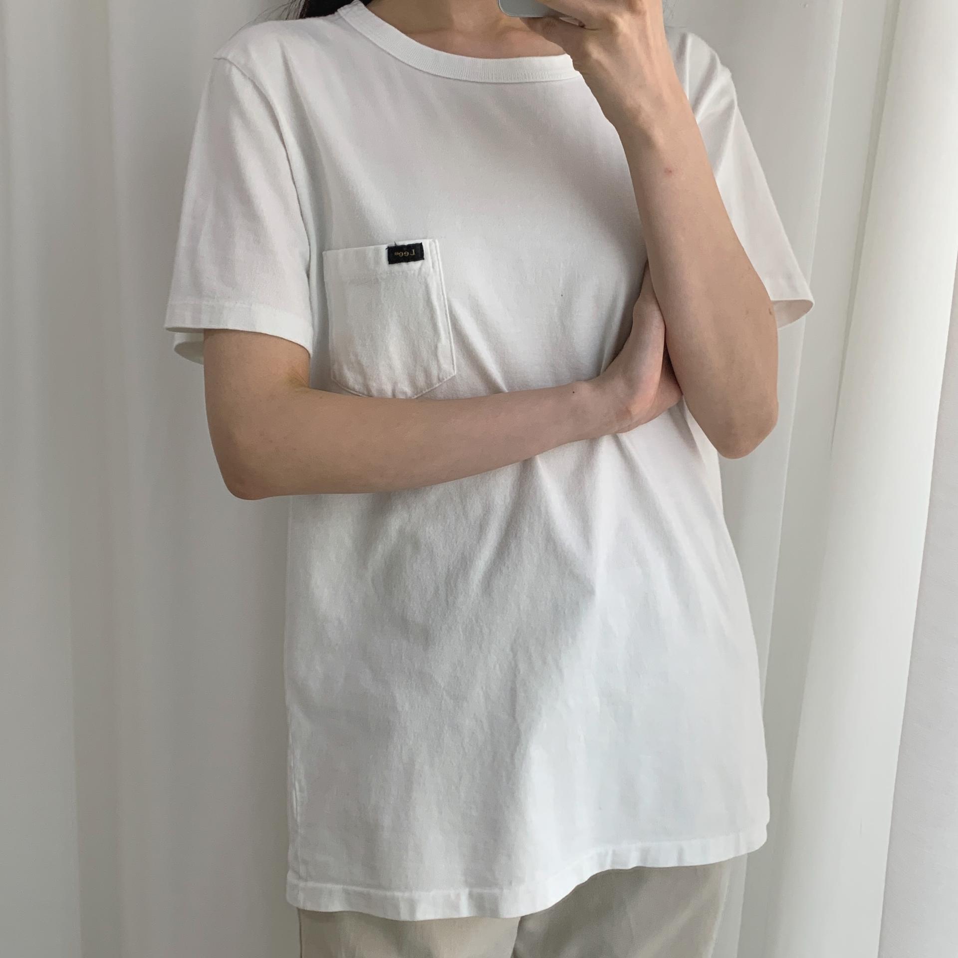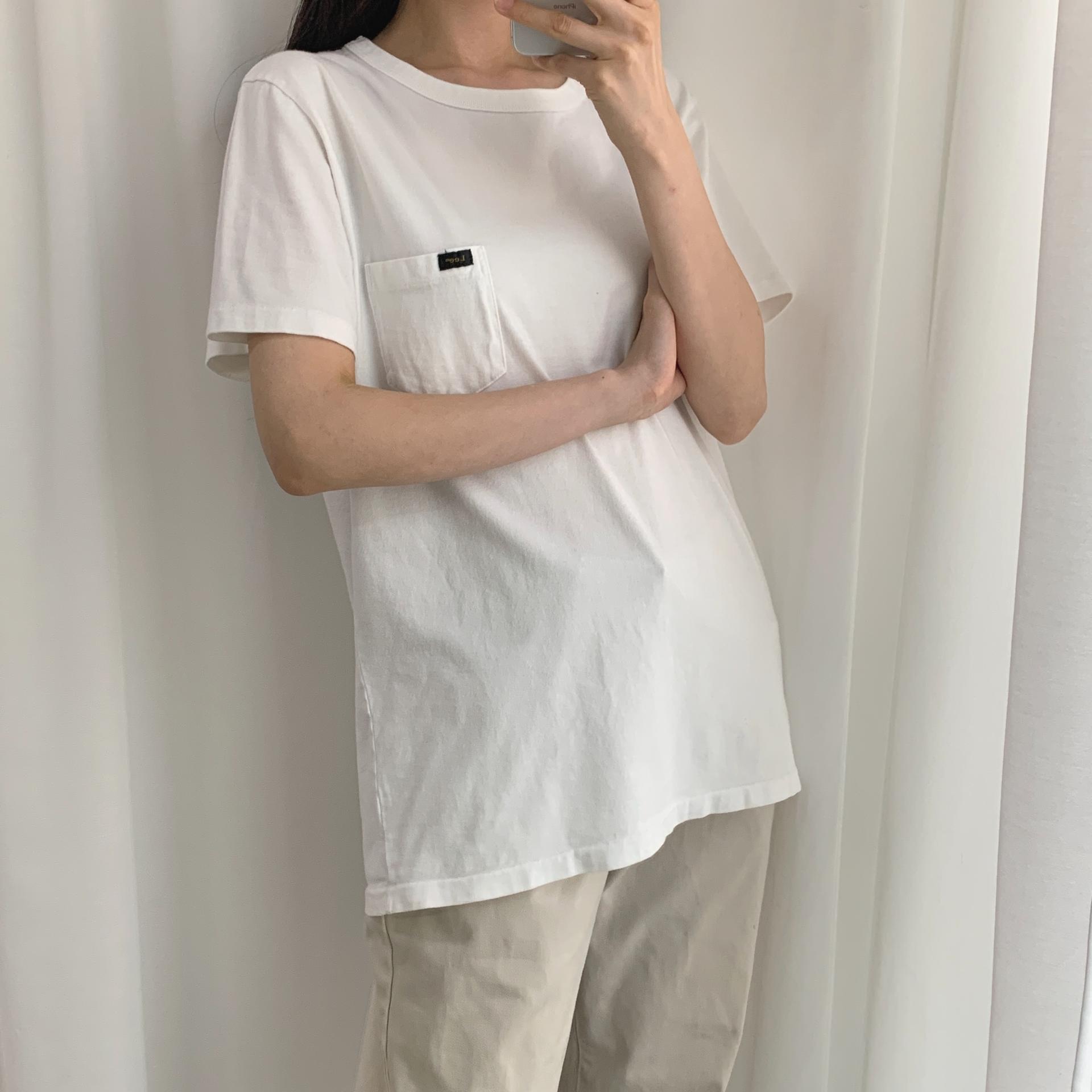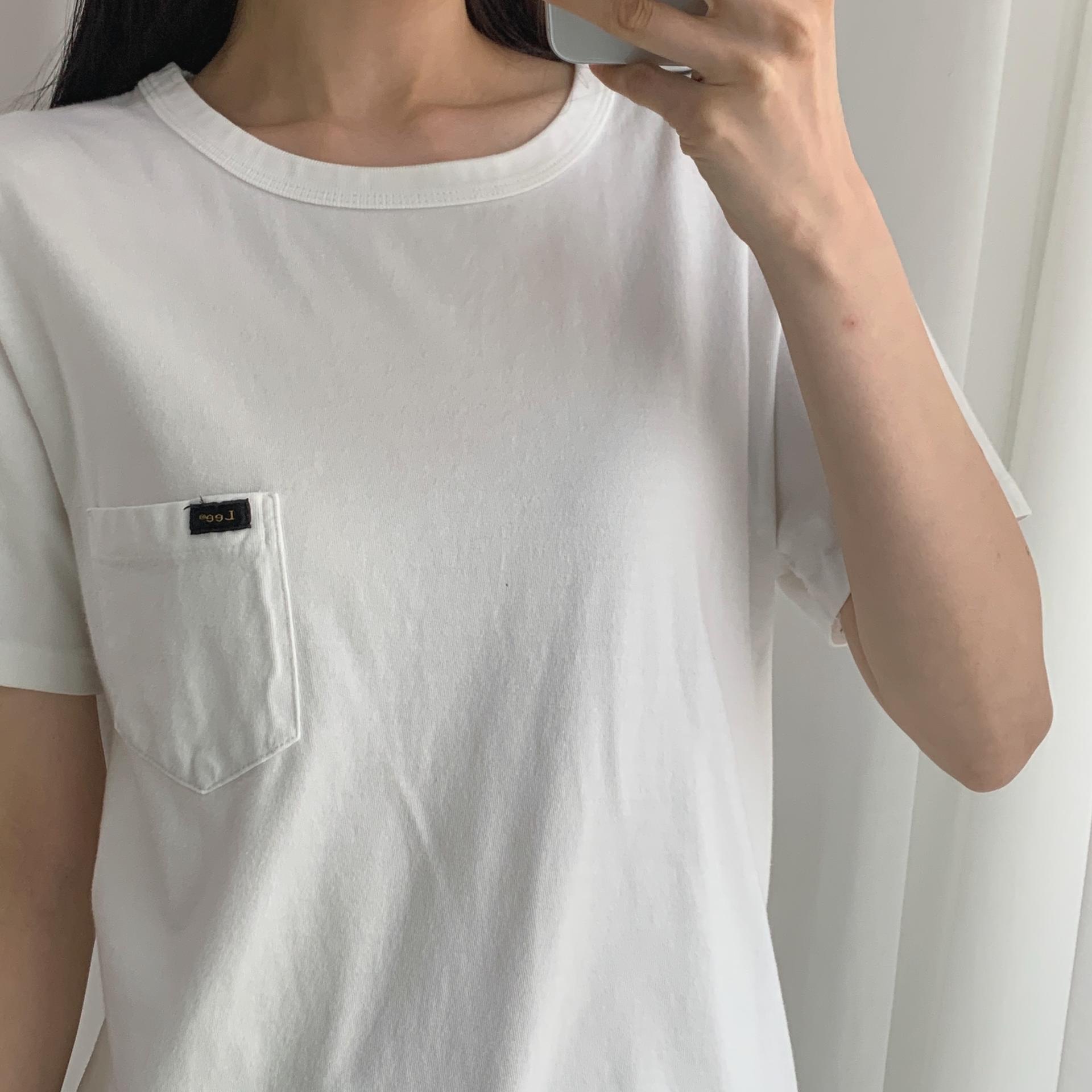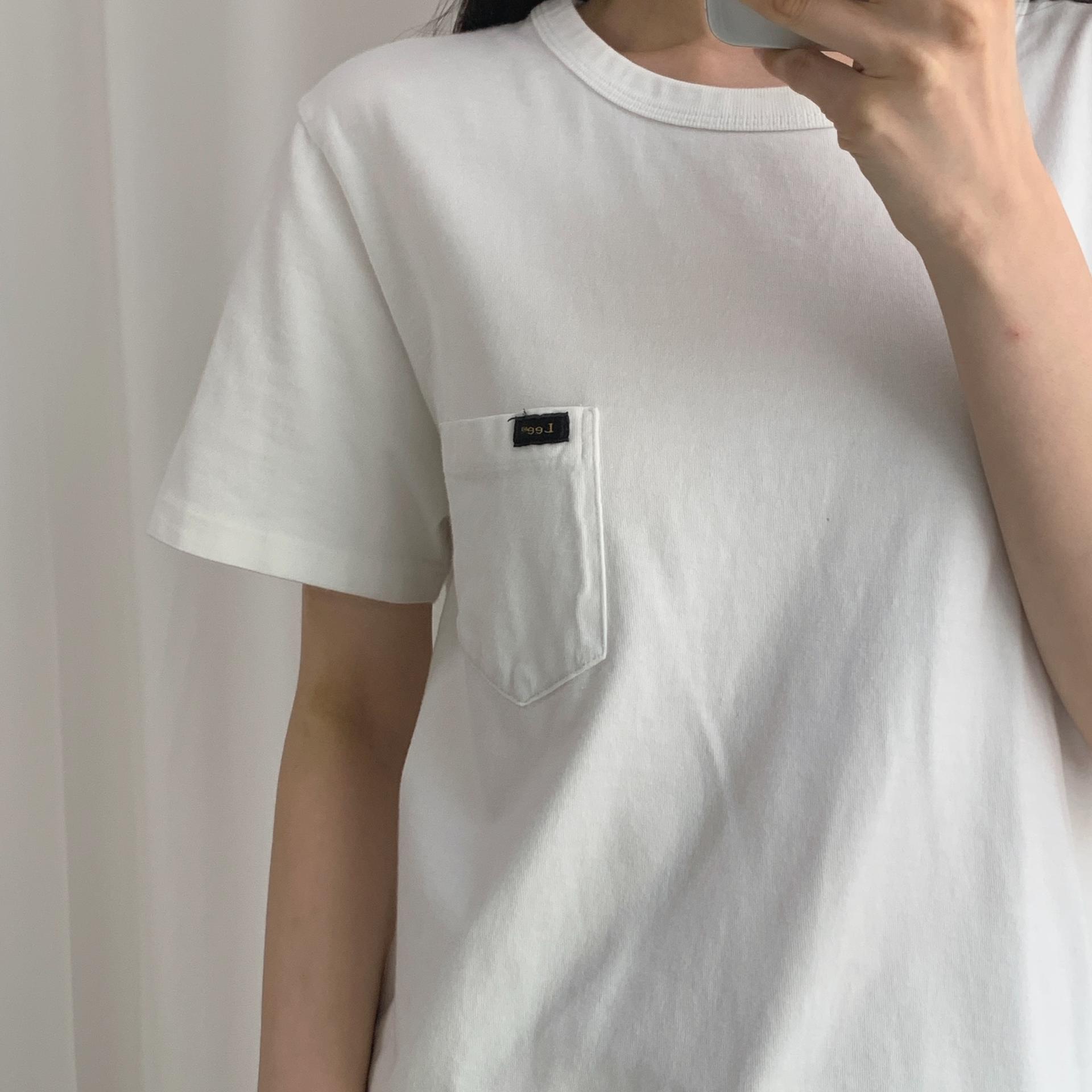 화이트 바디 컬러 위 무심하게 포켓 포인트와 작은 탭이 돋보이는 티셔츠 아이템 :)
