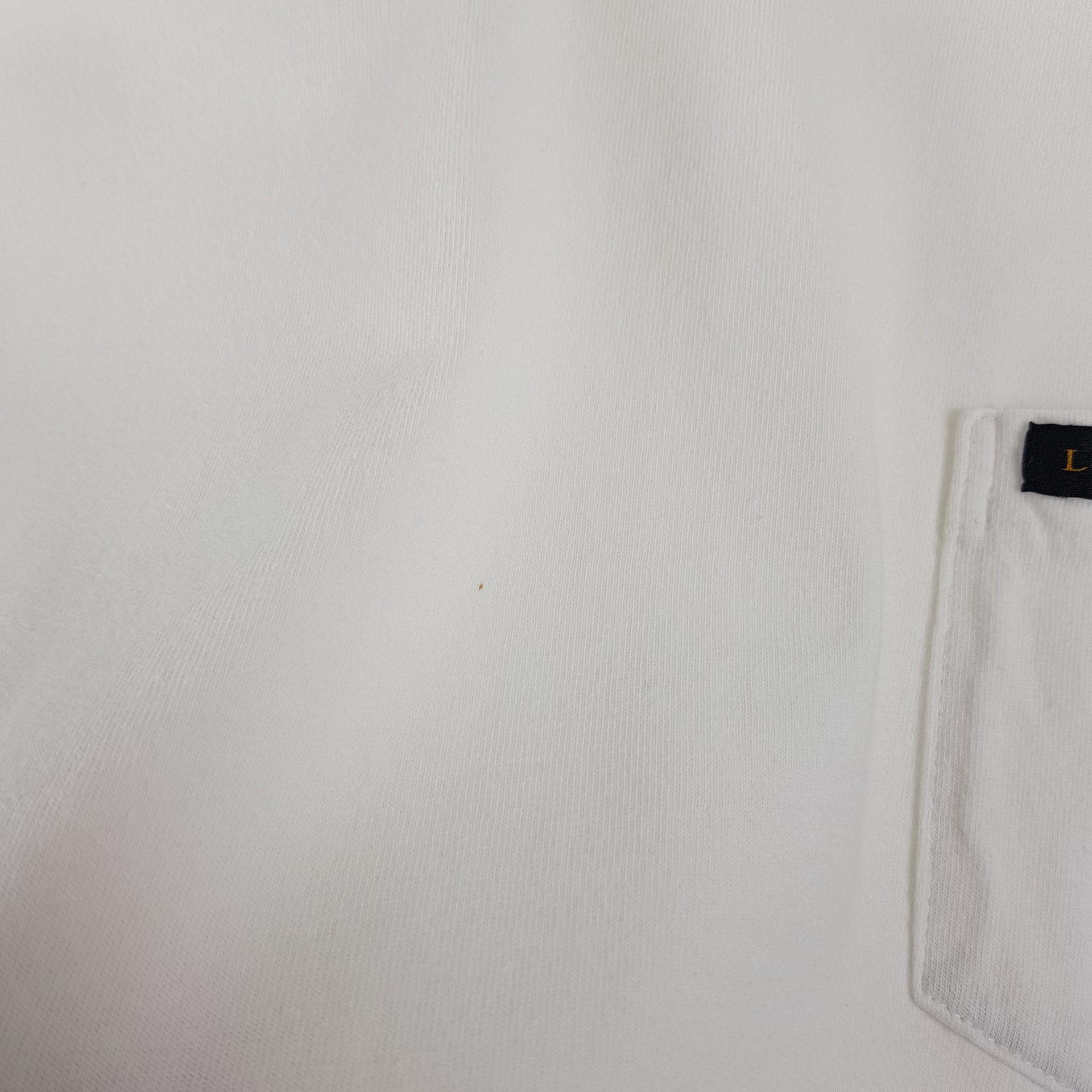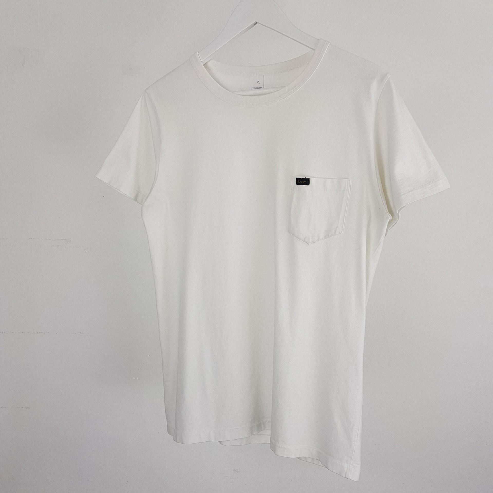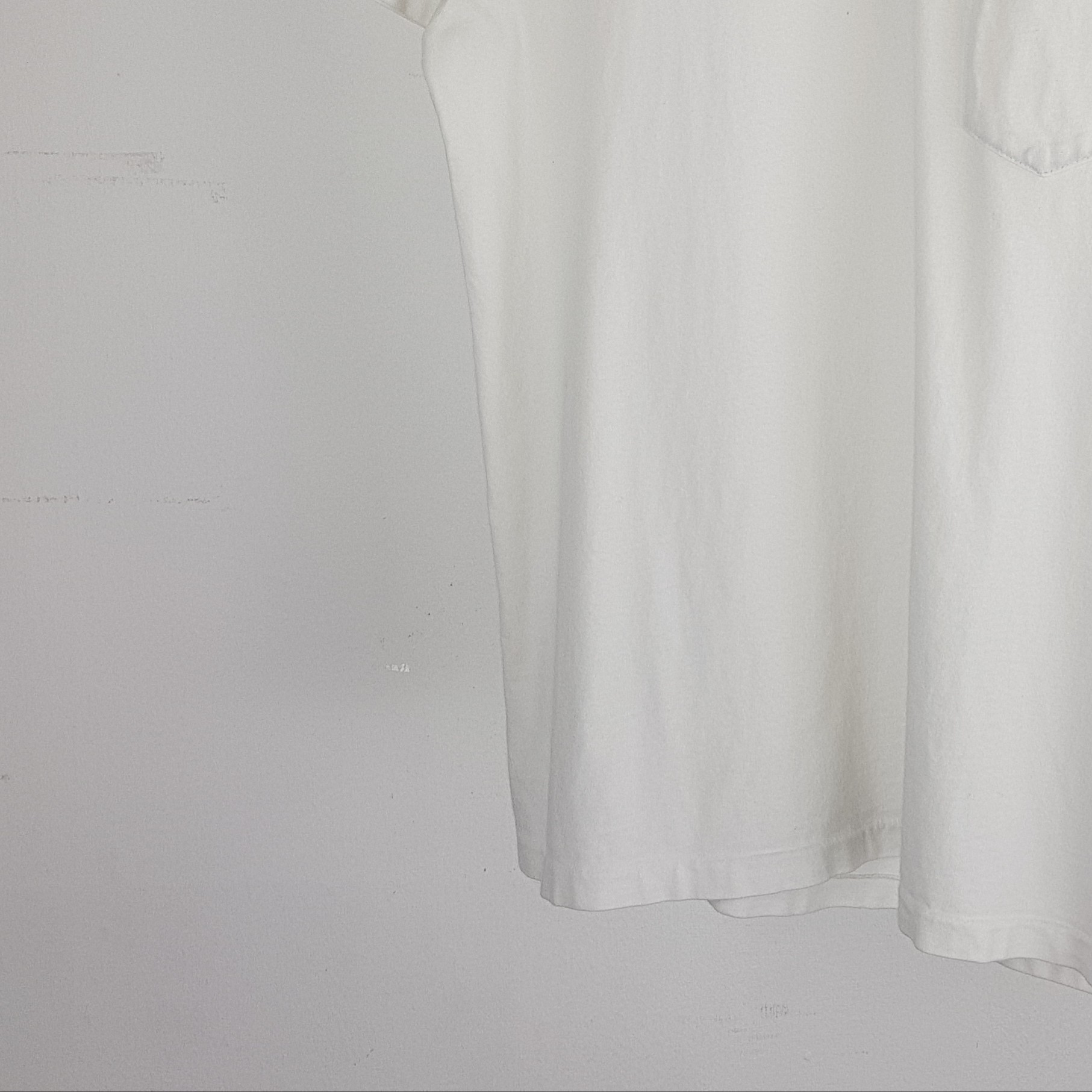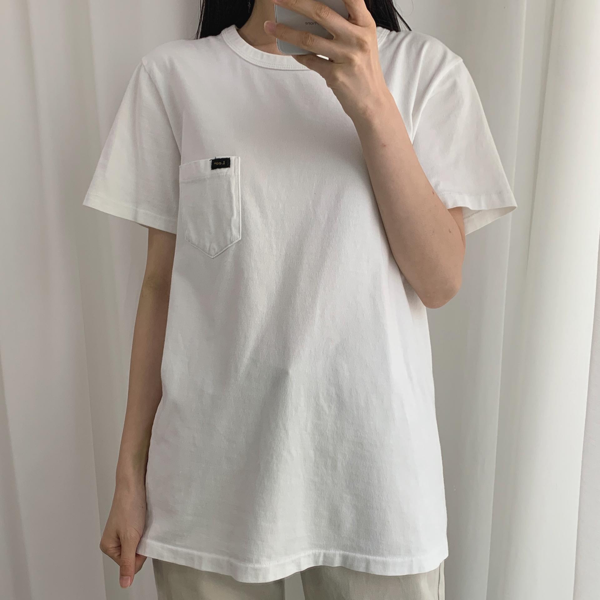 화이트 바디 컬러 위 무심하게 포켓 포인트와 작은 탭이 돋보이는 티셔츠 아이템 :)