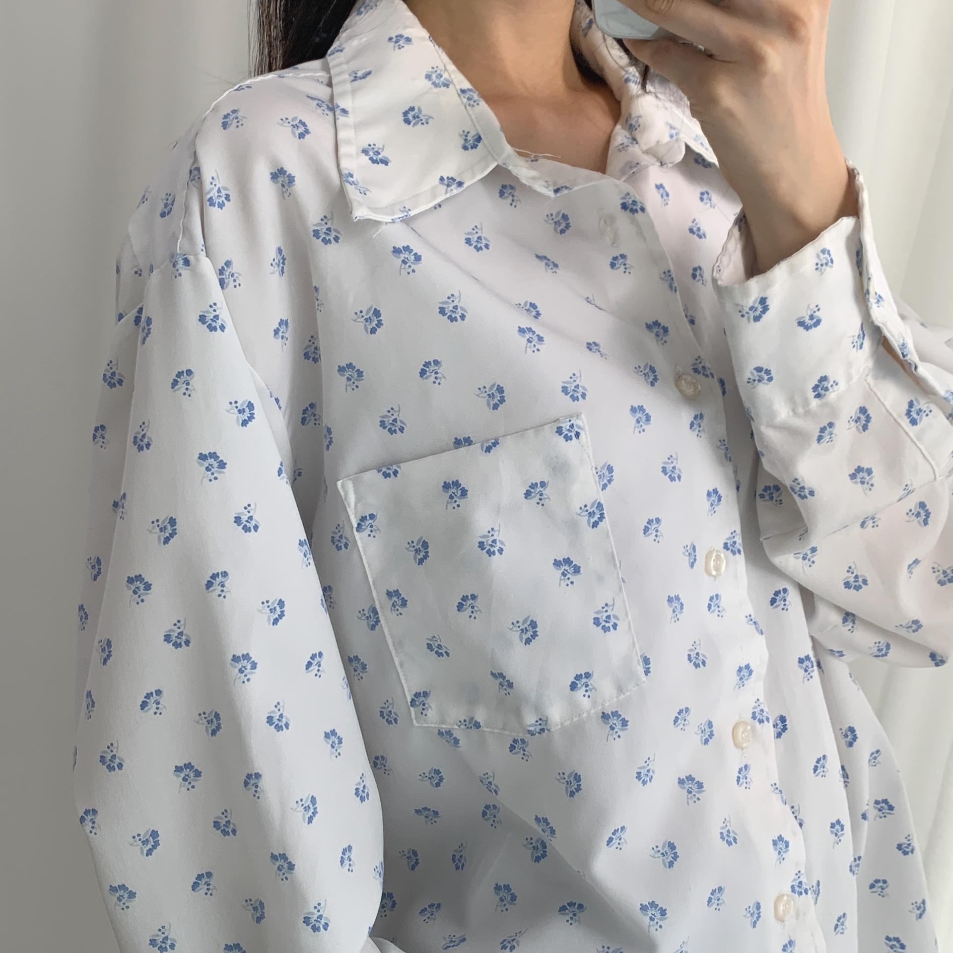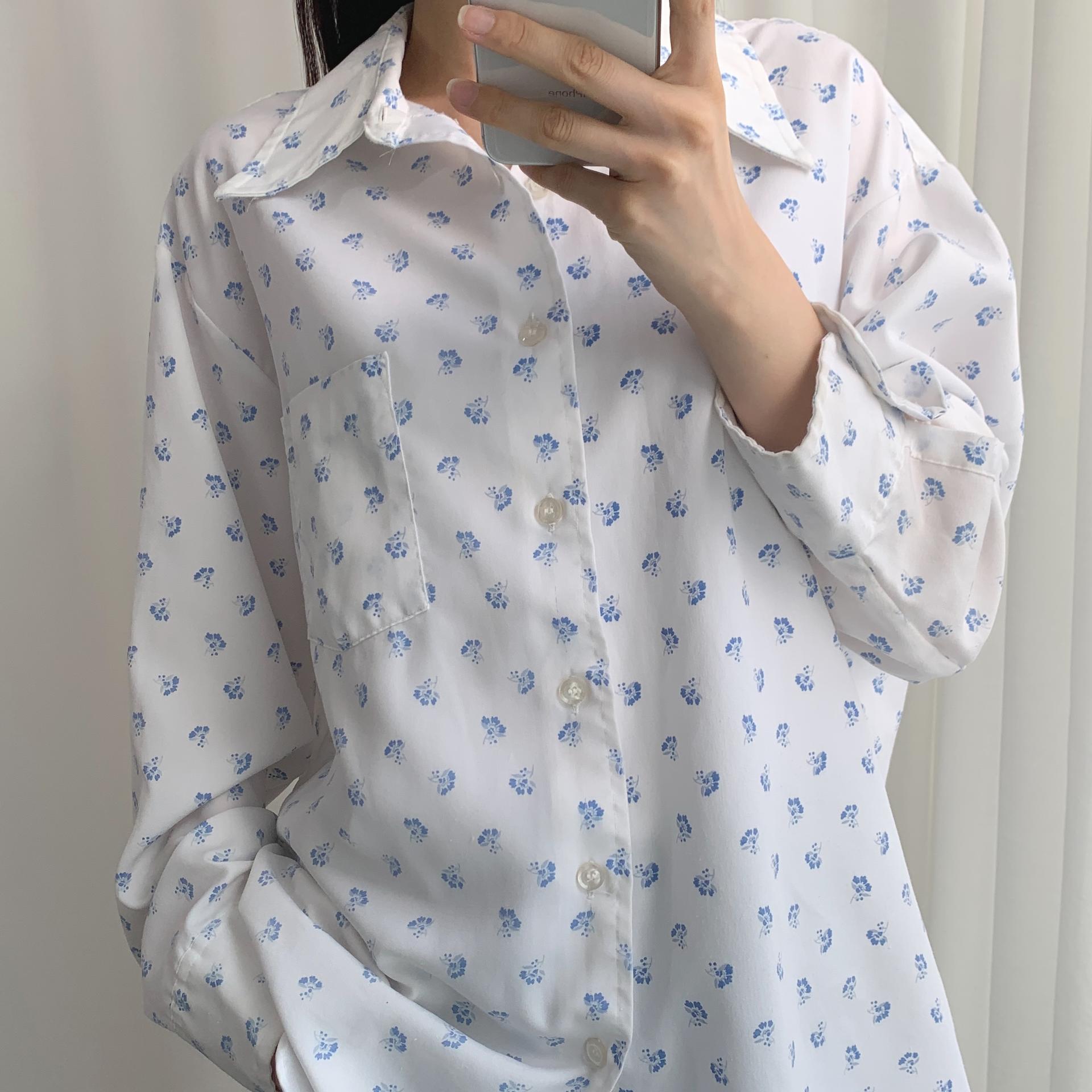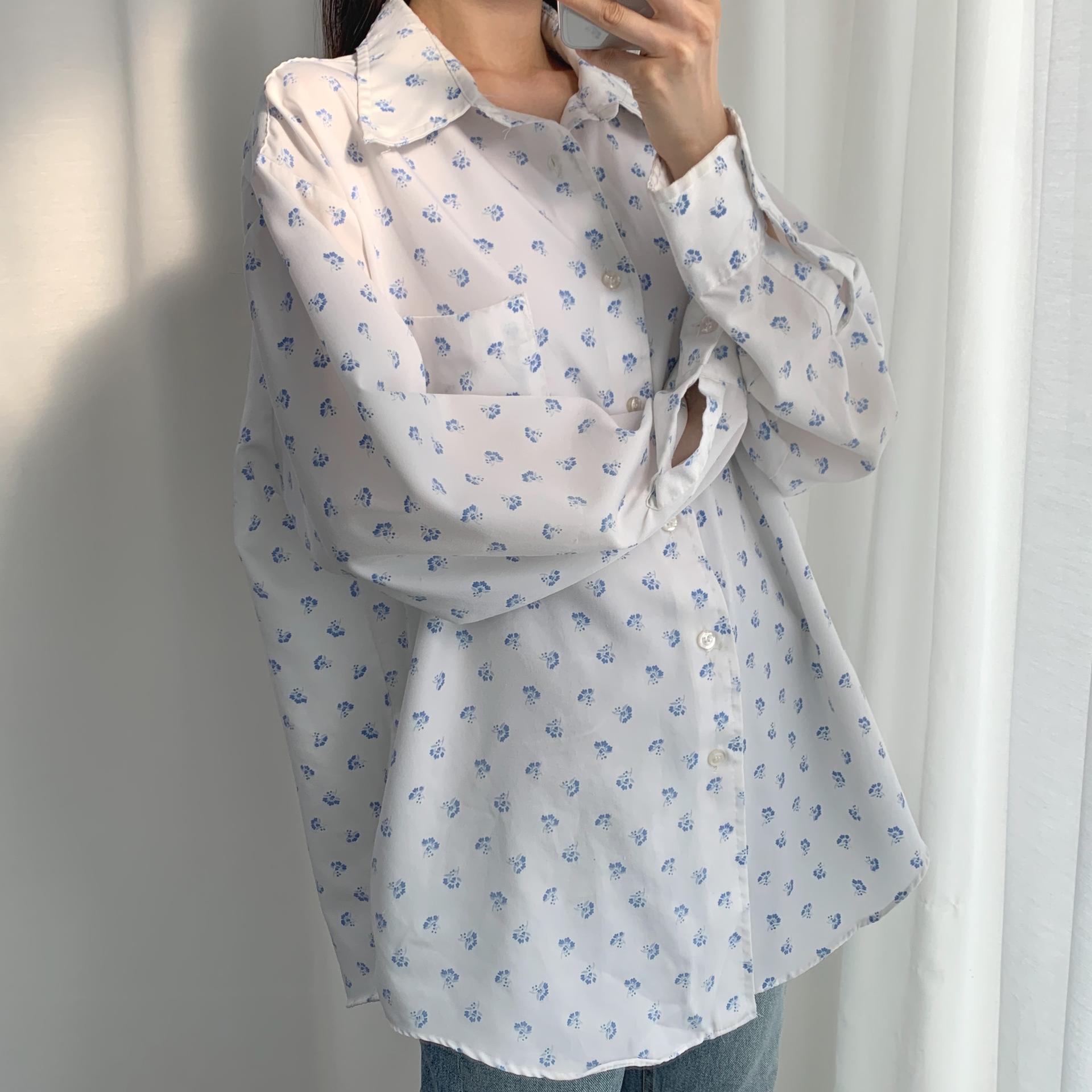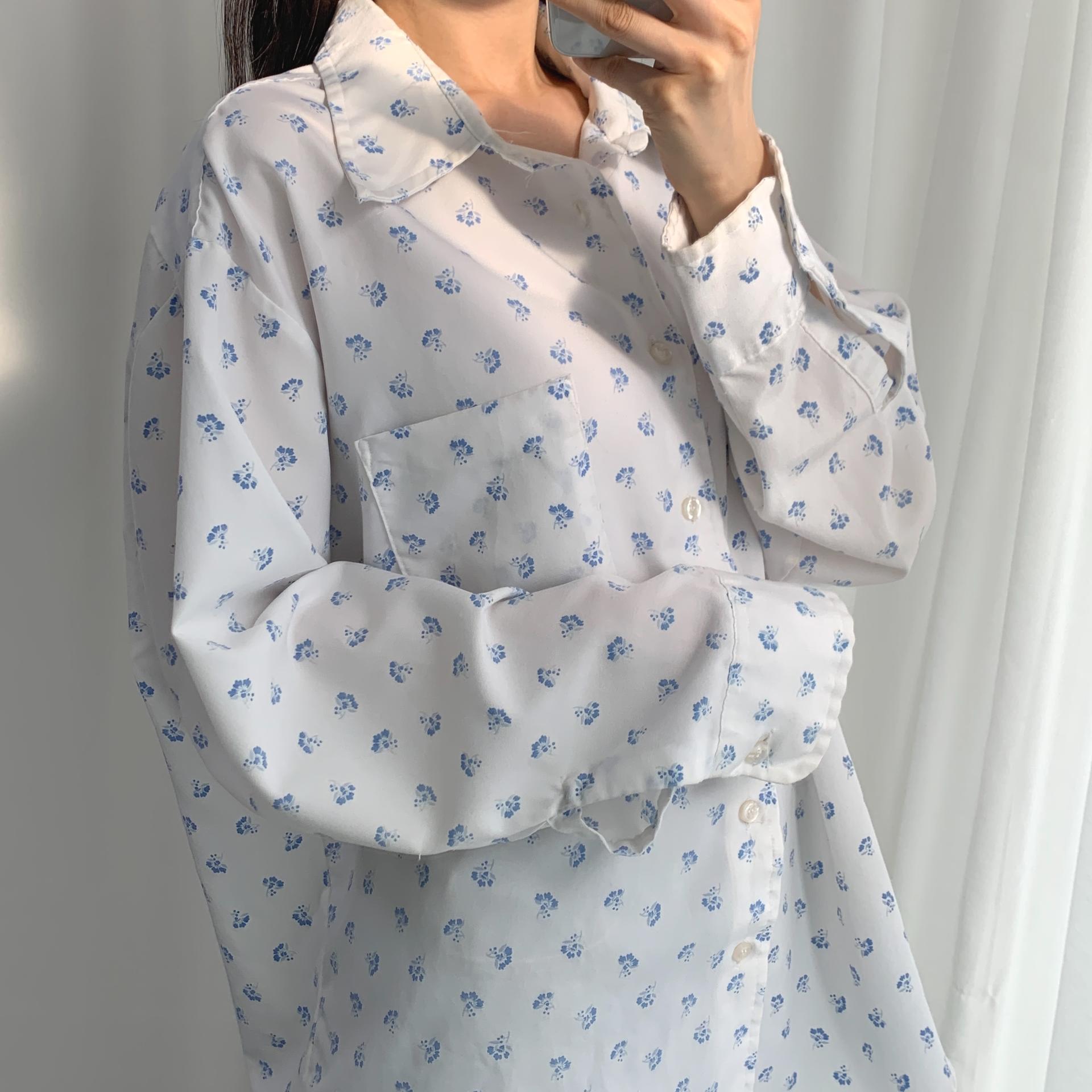 푸른 플라워 패턴과 박시한 사이즈로 시원하고 편안하게 즐길 수 있는 셔츠 아이템입니다.