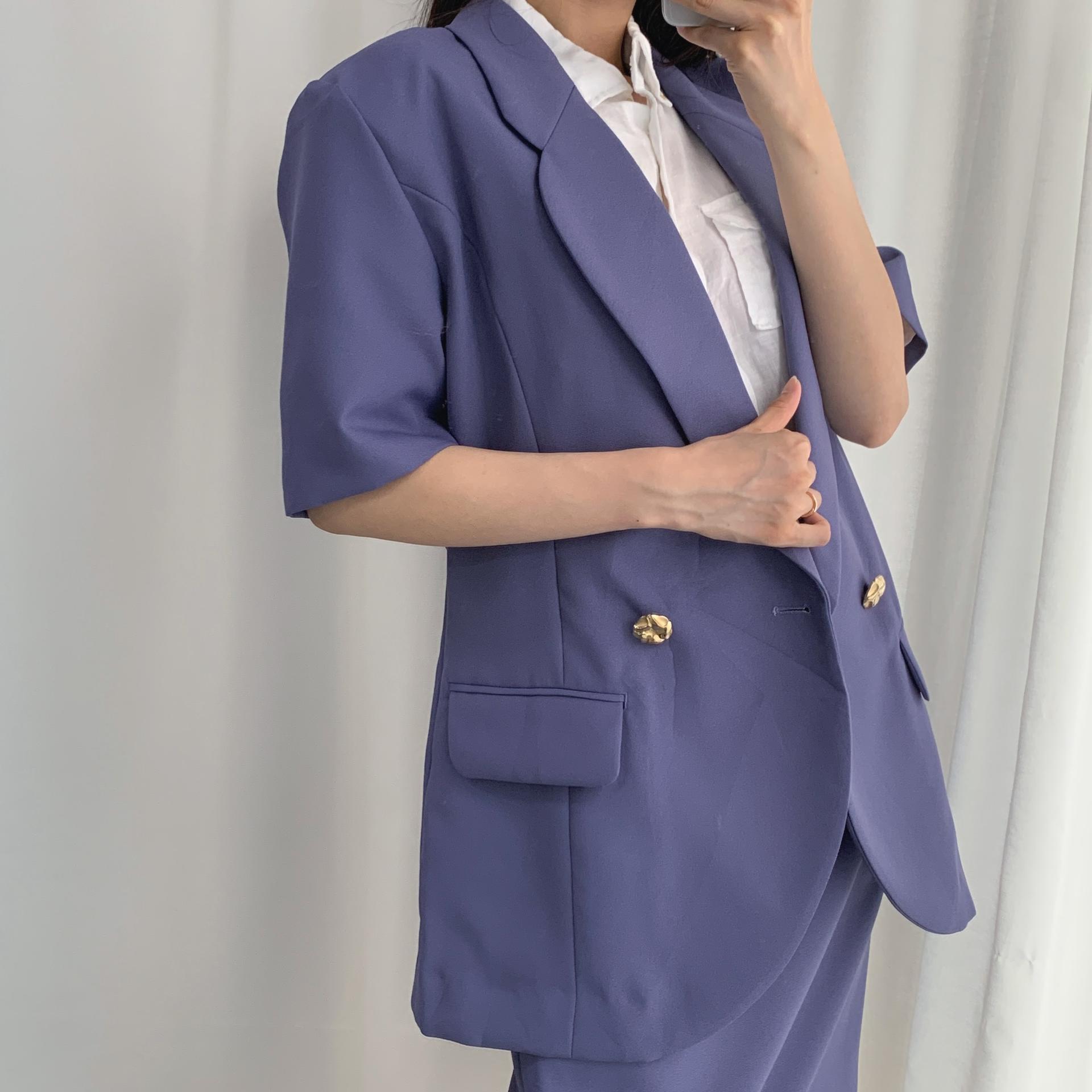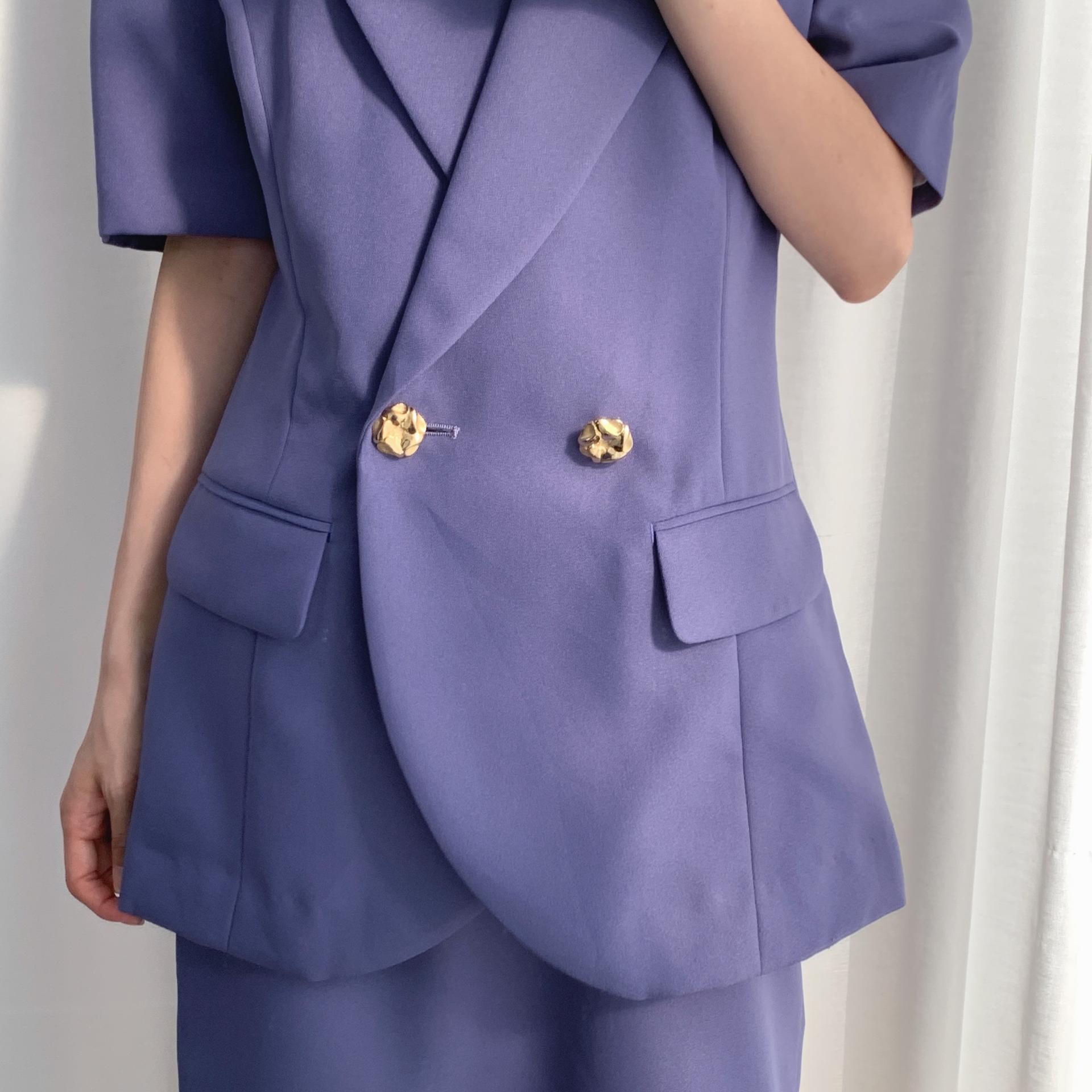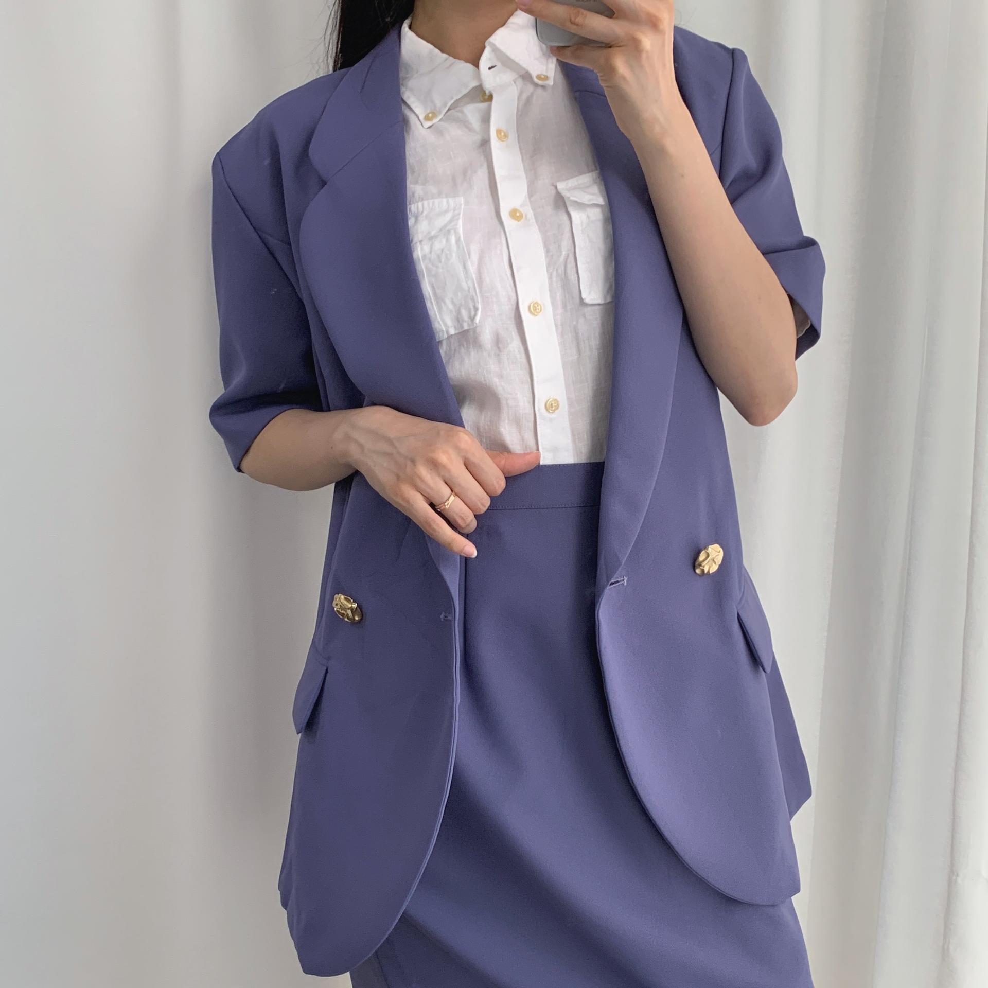 빈티지한 무드의 퍼플 컬러가 돋보이는 셋업 제품입니다.