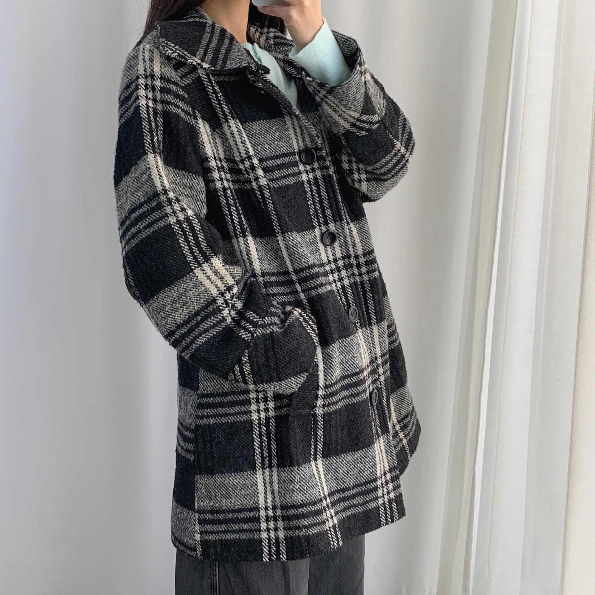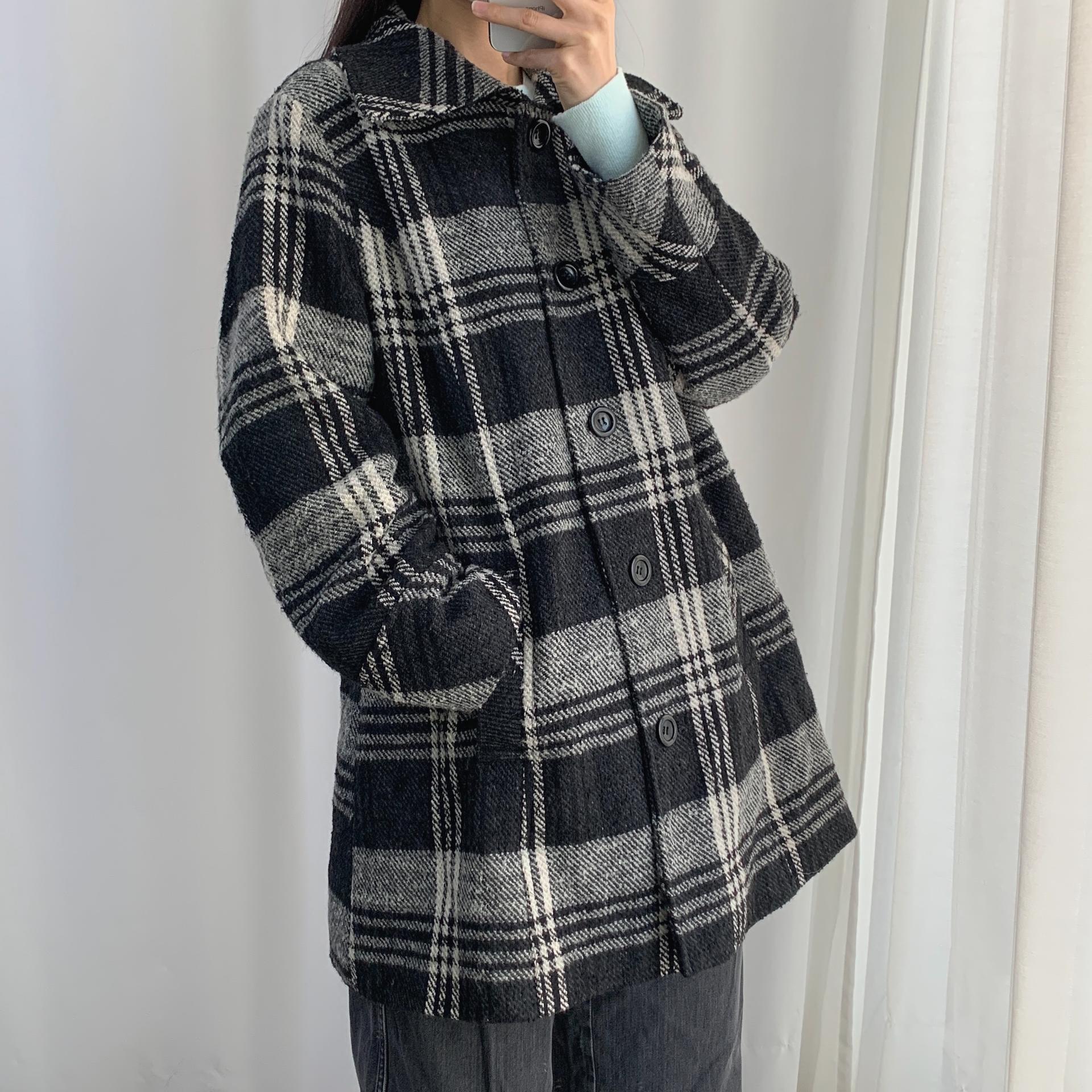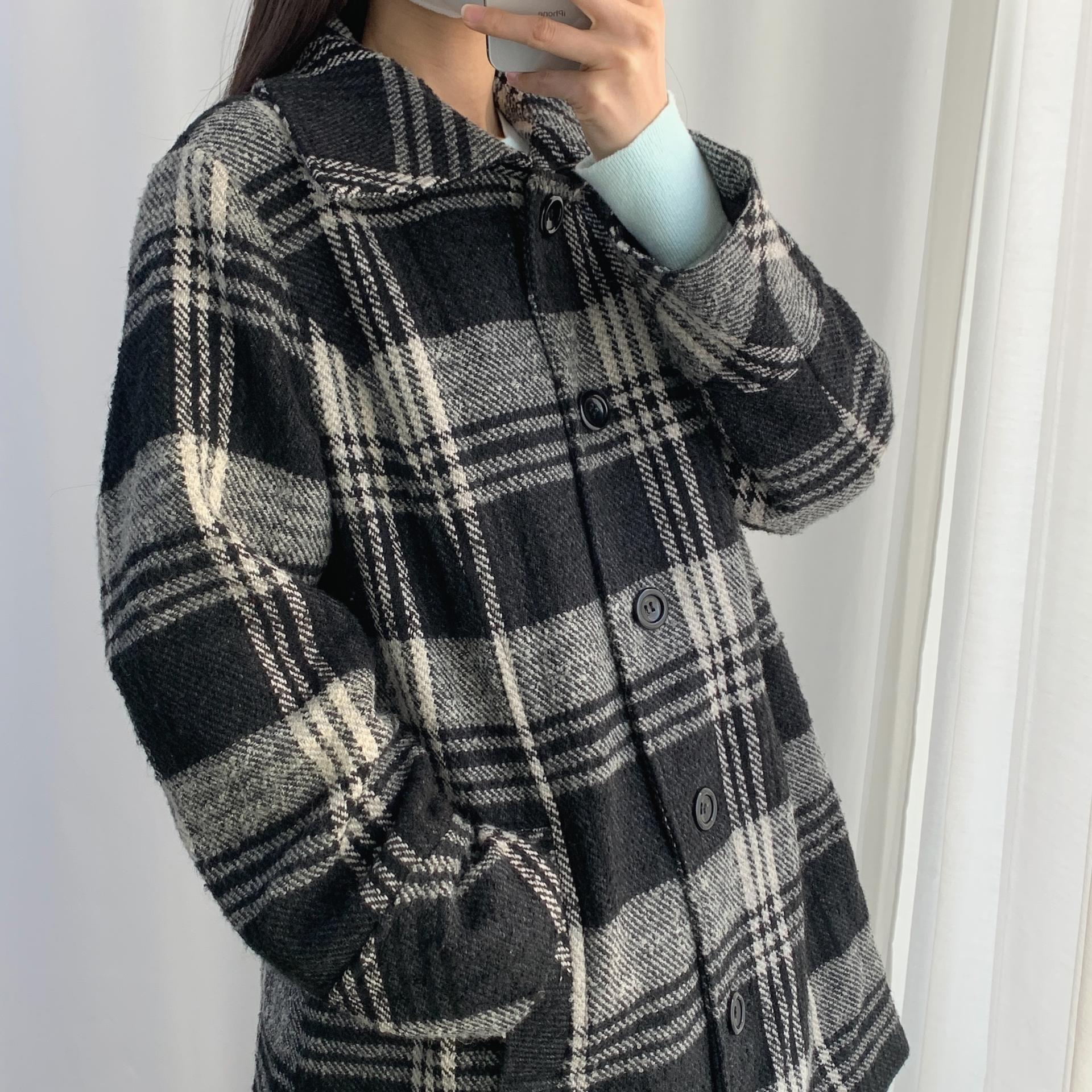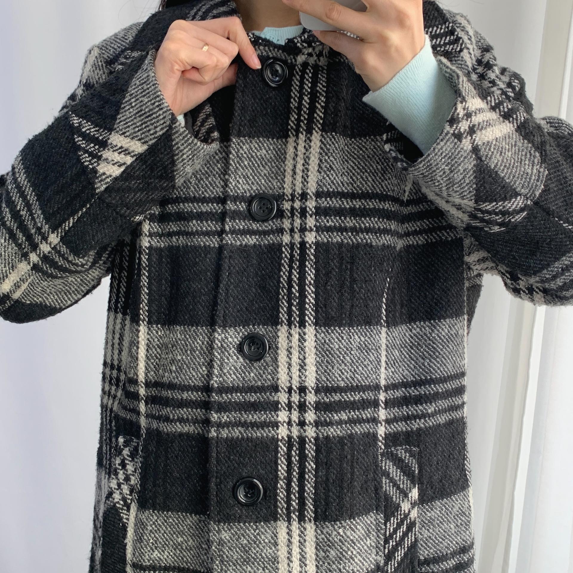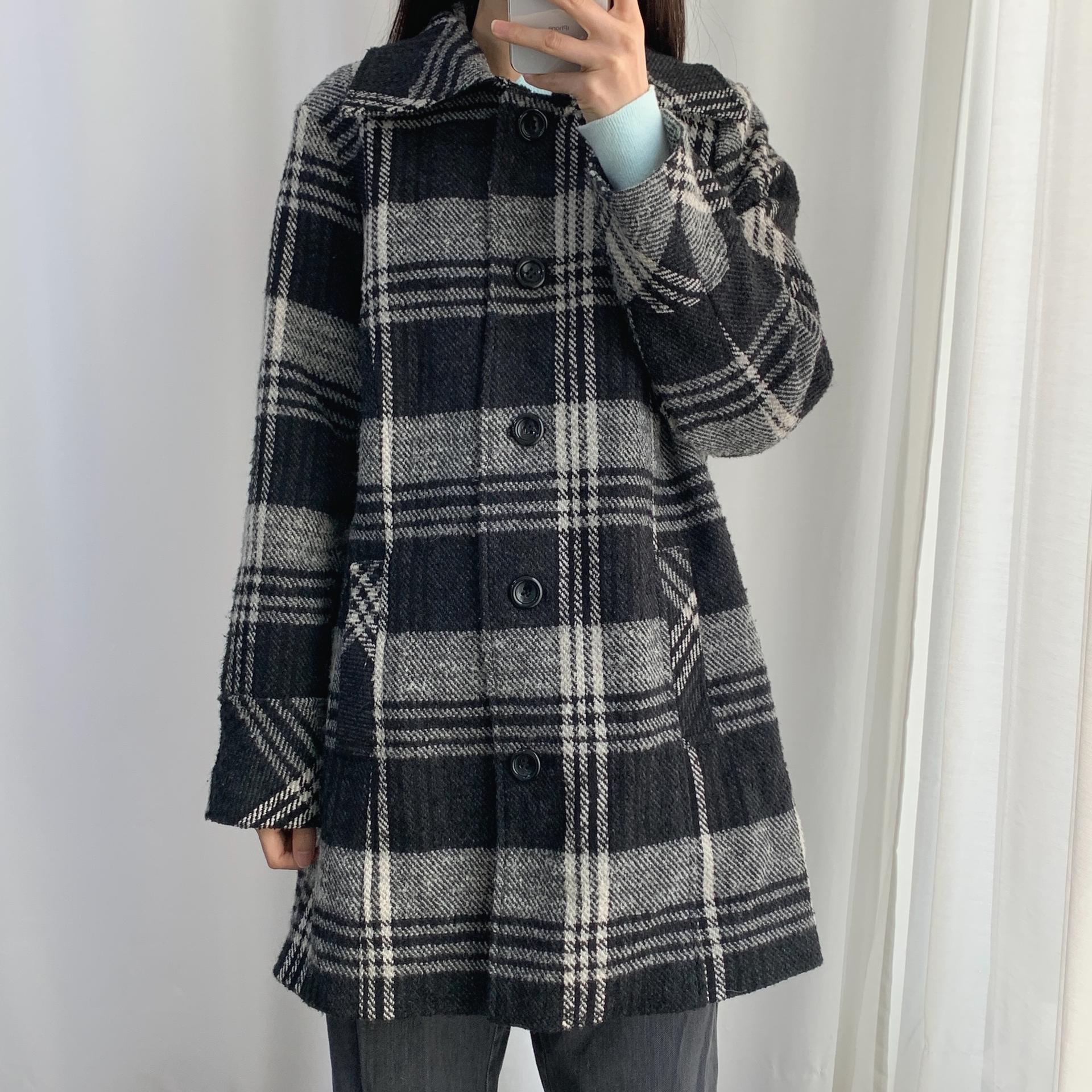 빈티지한 무드의 체크 패턴과 블랙 바디 컬러가 인상적인 CLOTHING의 체크 코트 아이템입니다.