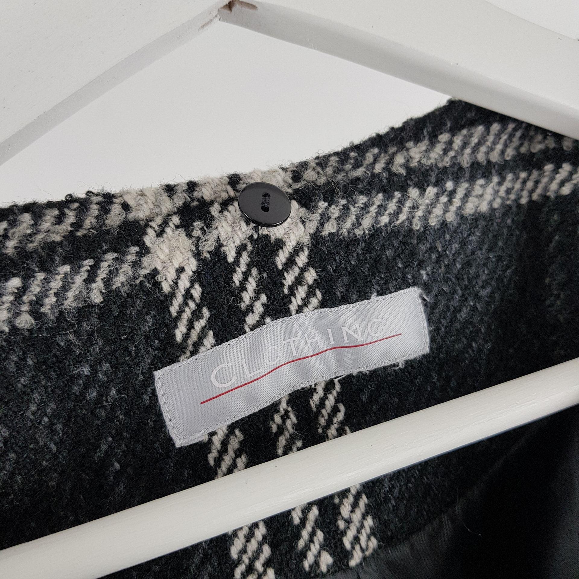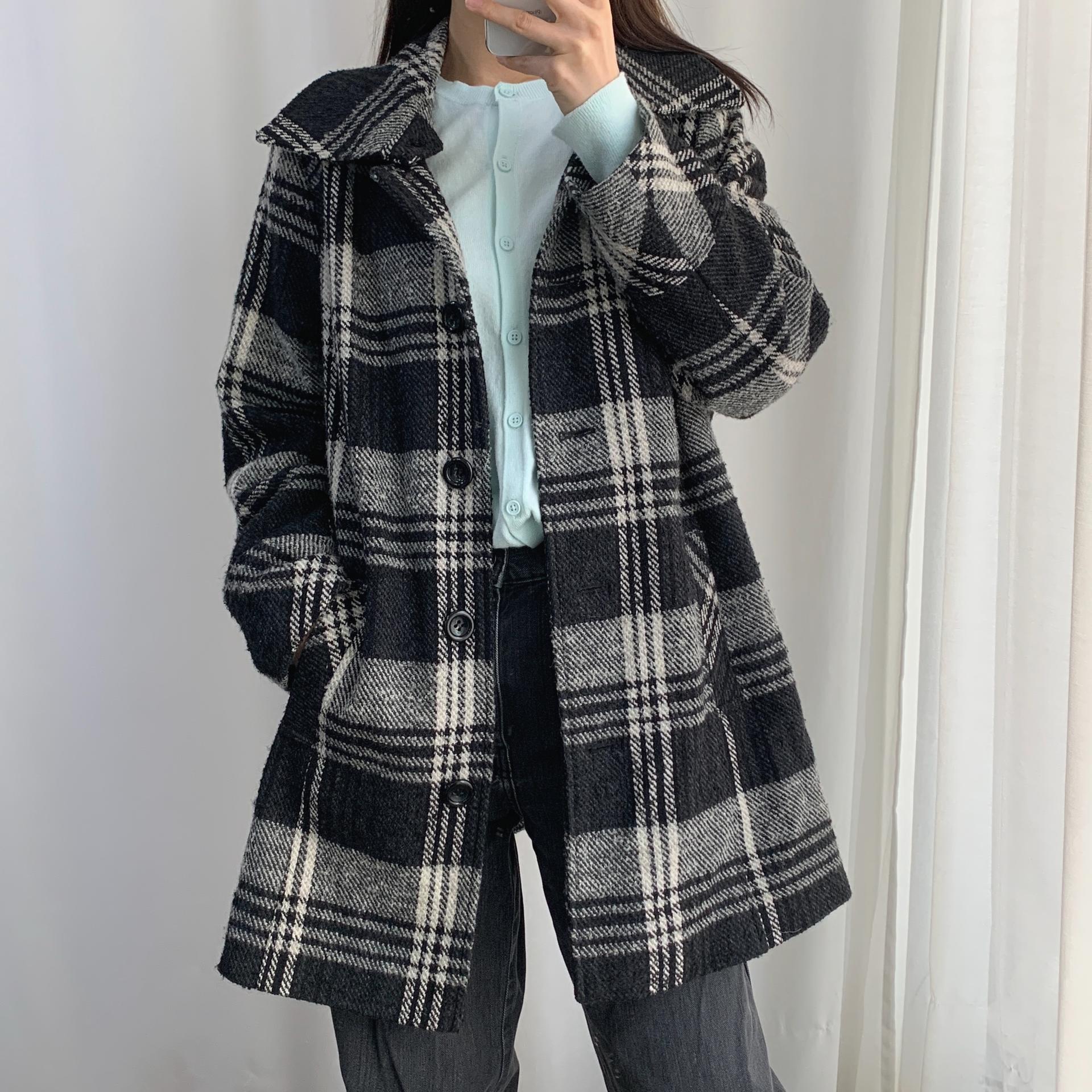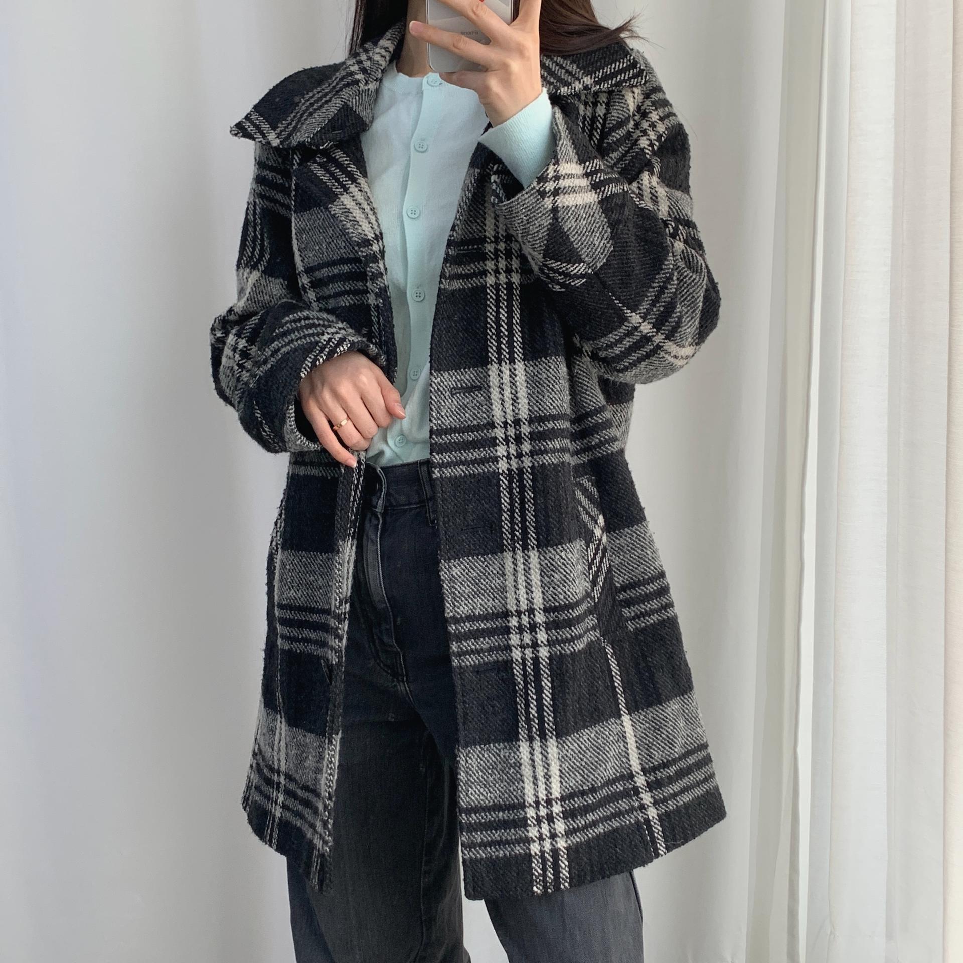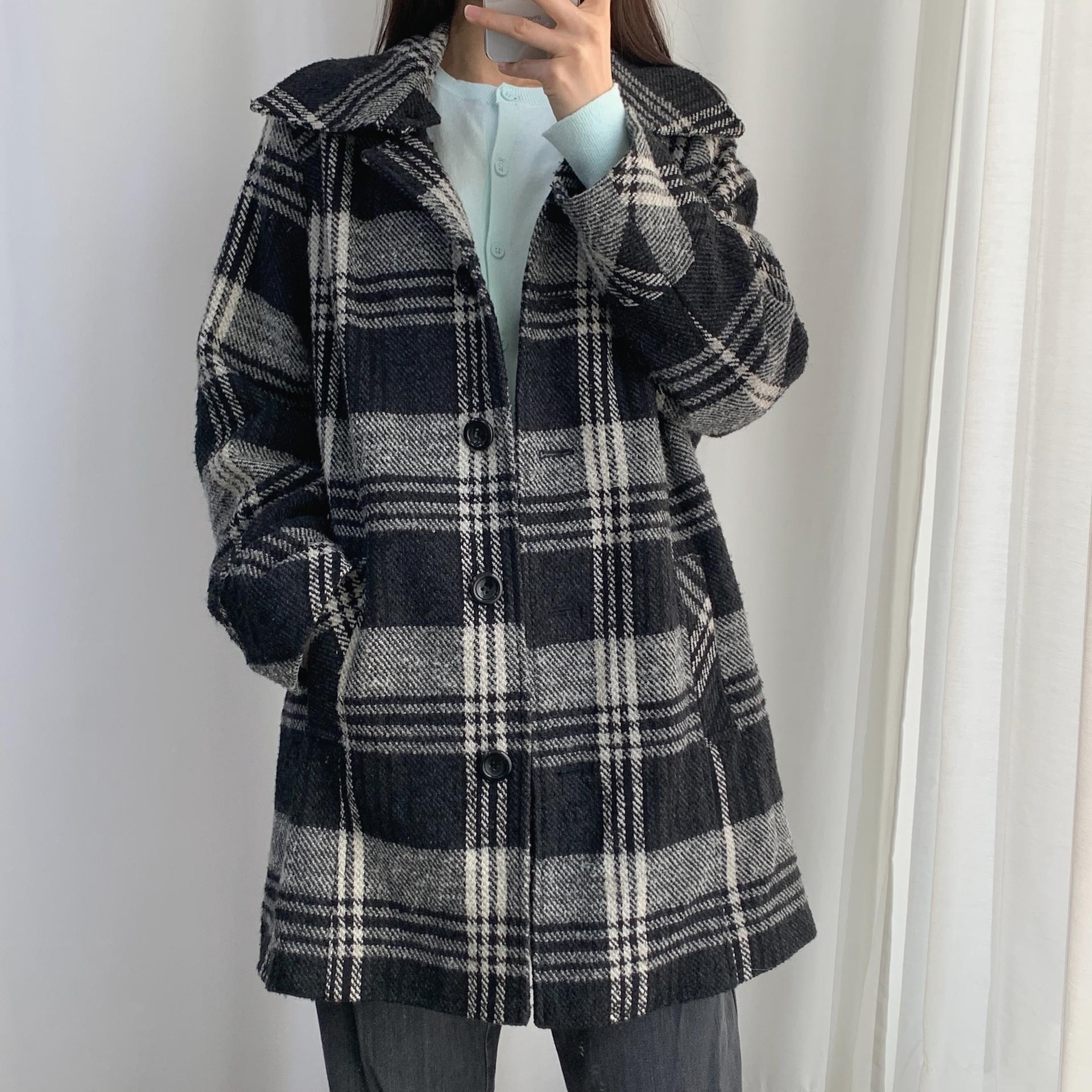 빈티지한 무드의 체크 패턴과 블랙 바디 컬러가 인상적인 CLOTHING의 체크 코트 아이템입니다.