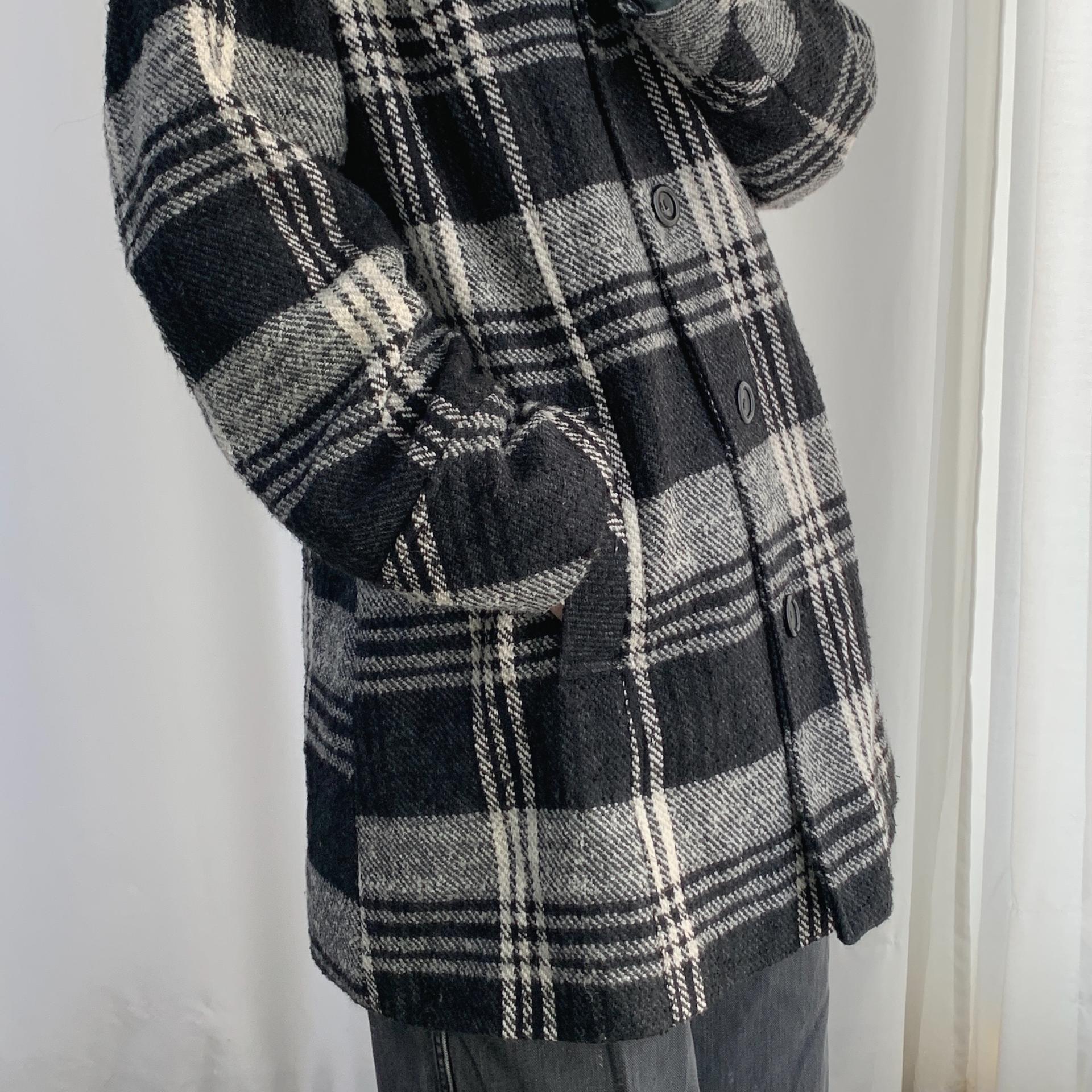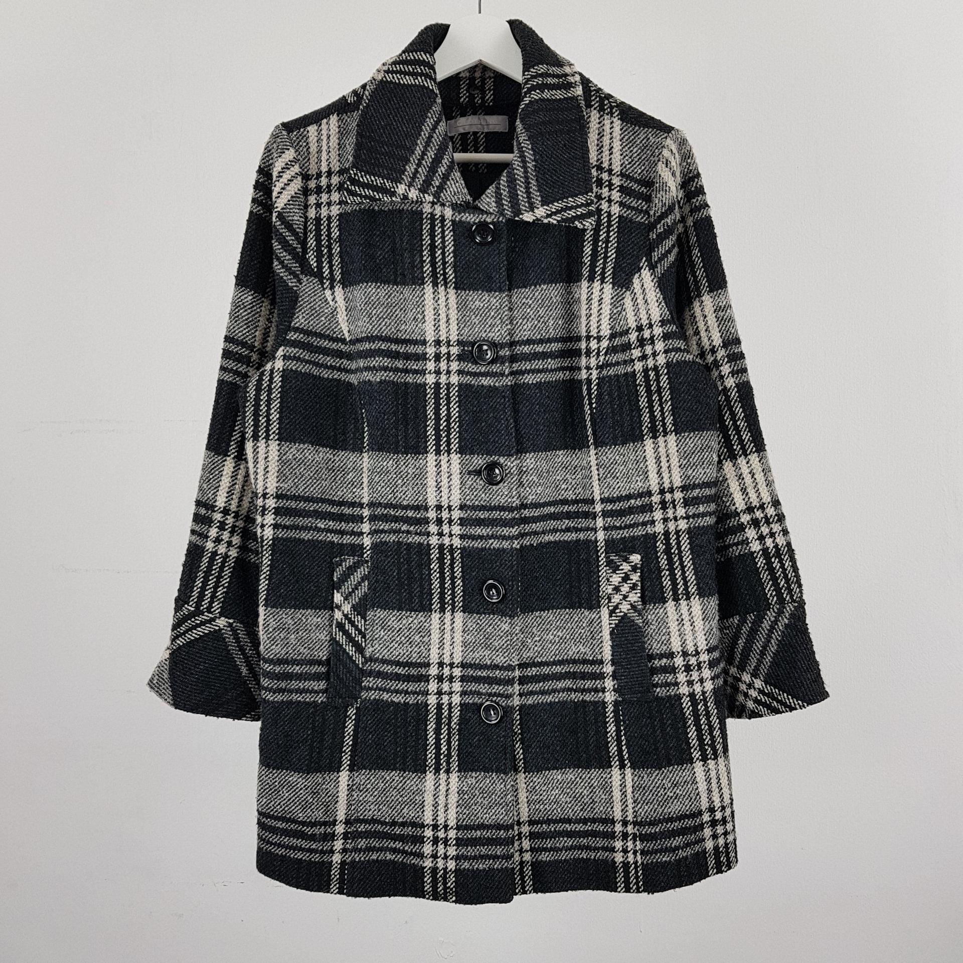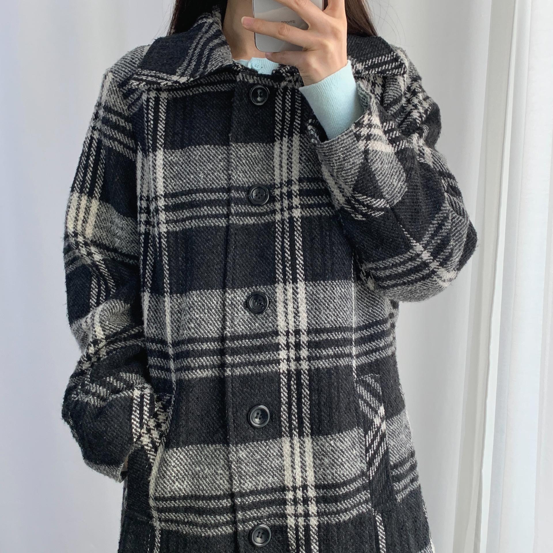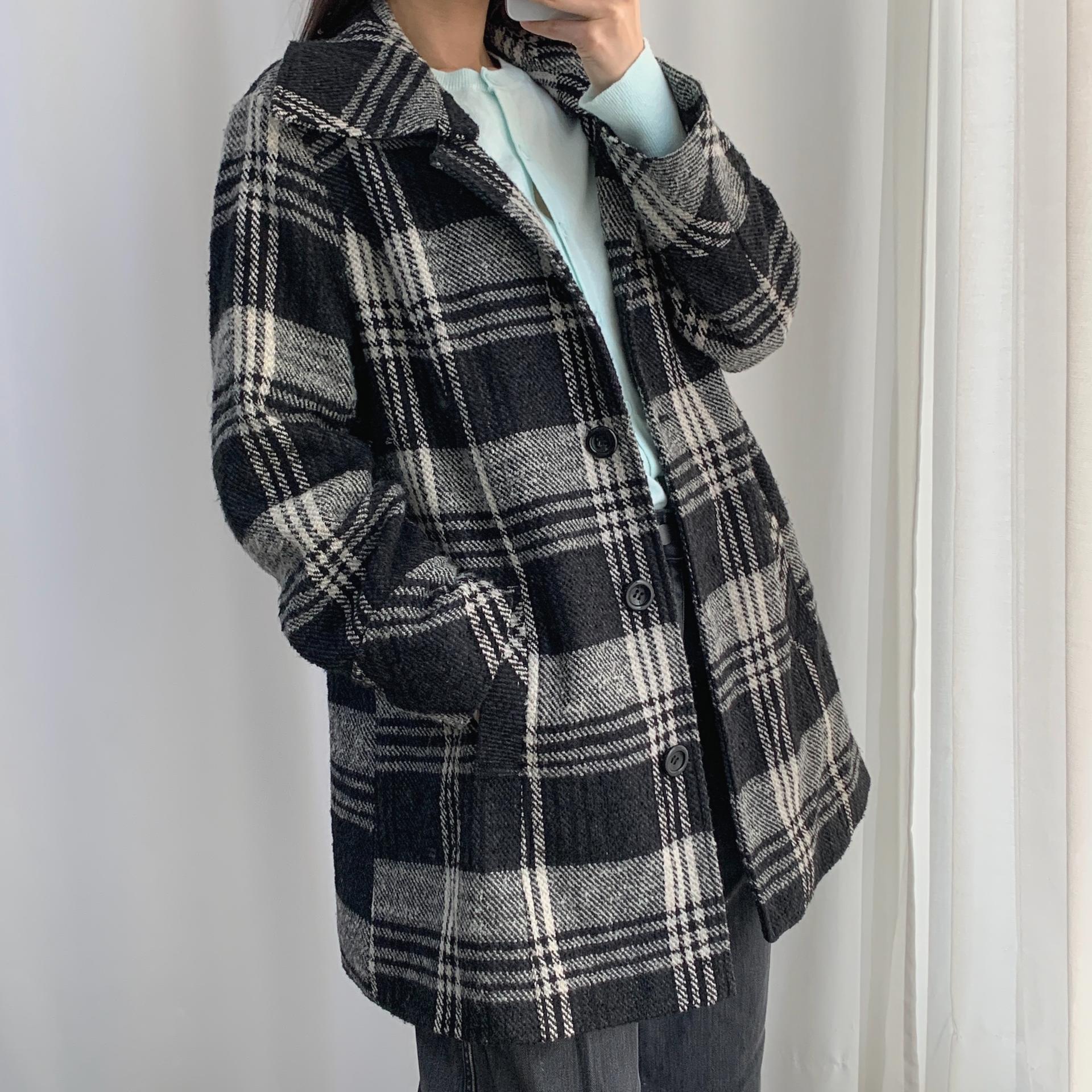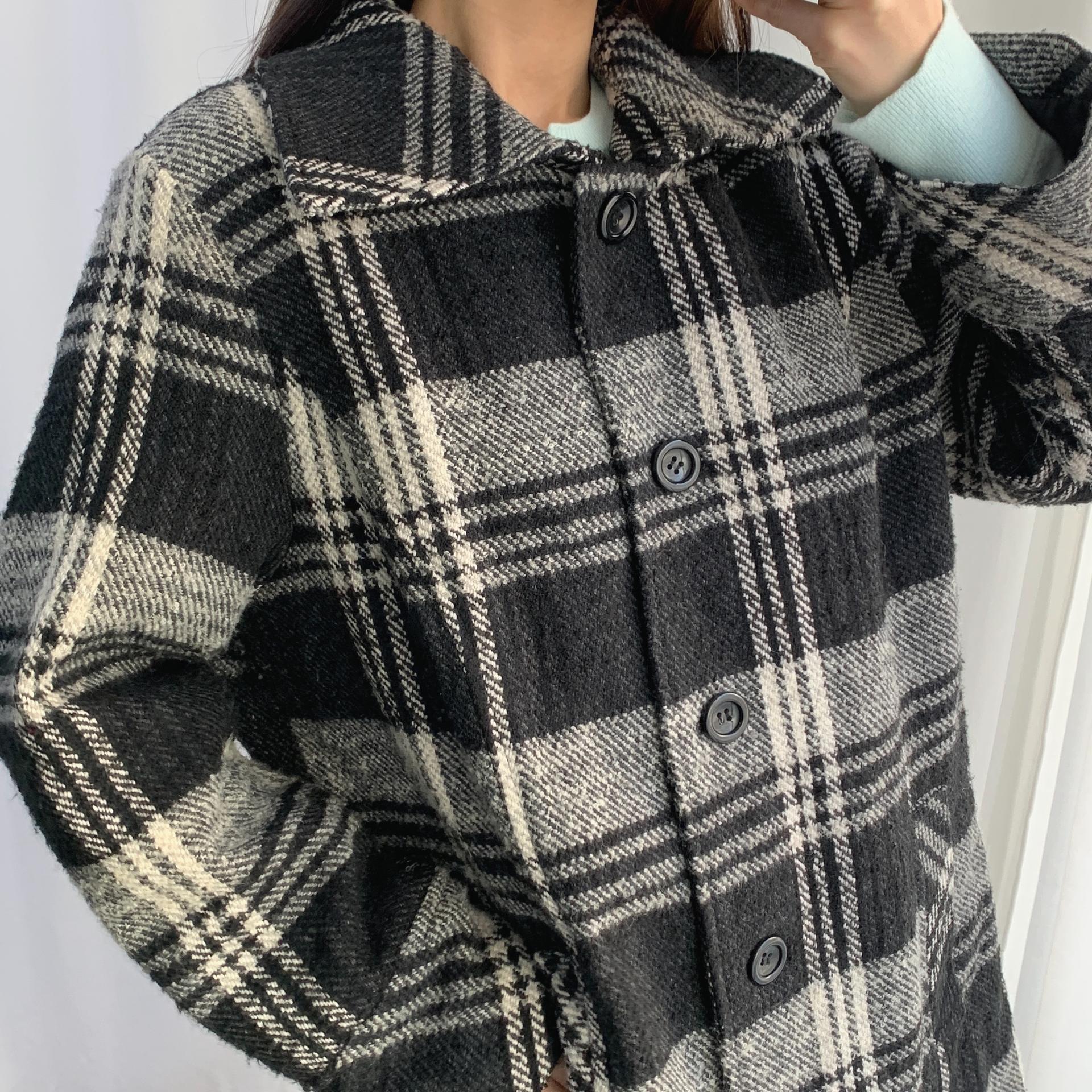 빈티지한 무드의 체크 패턴과 블랙 바디 컬러가 인상적인 CLOTHING의 체크 코트 아이템입니다.