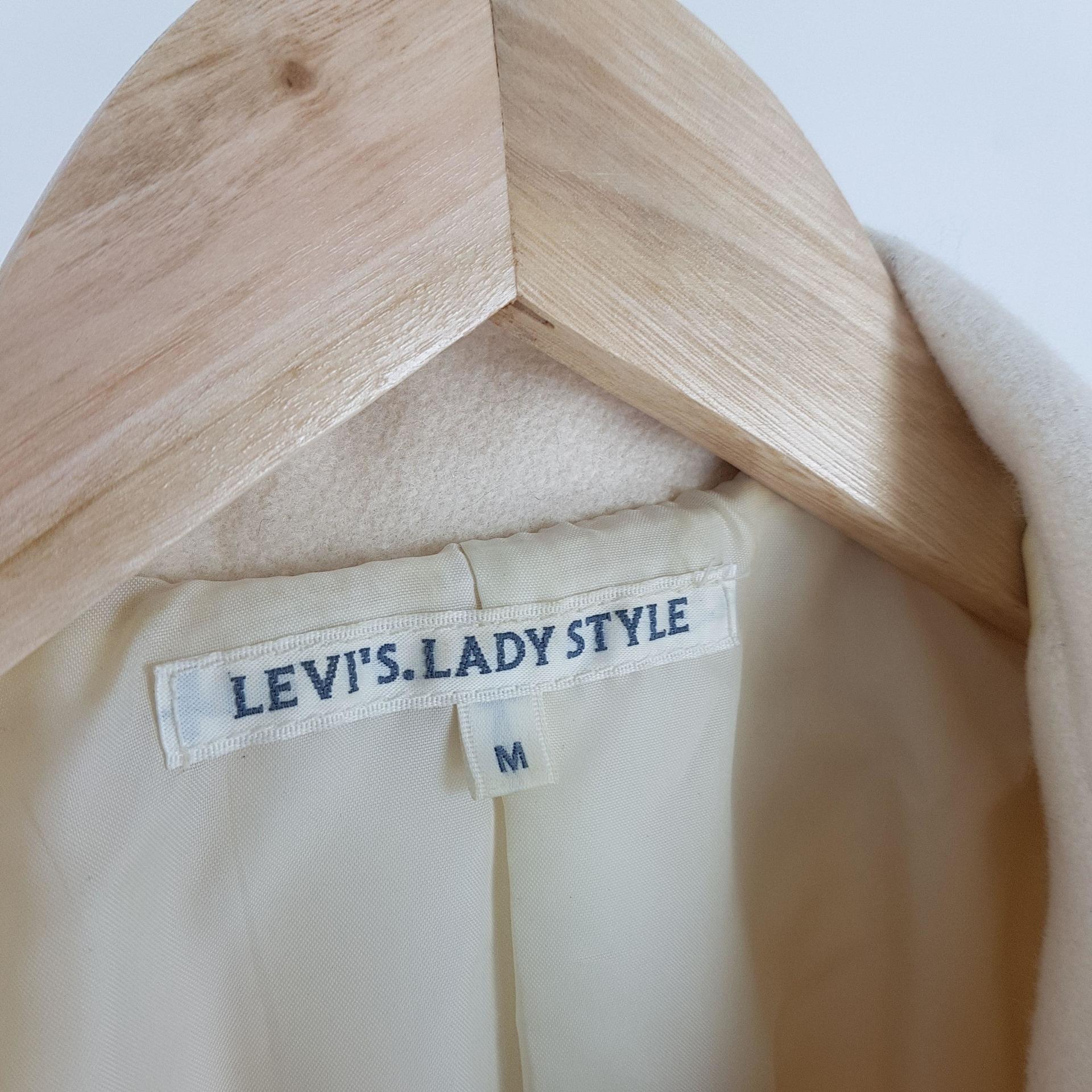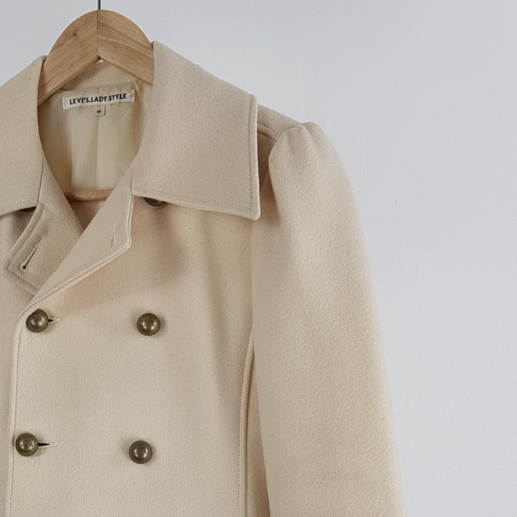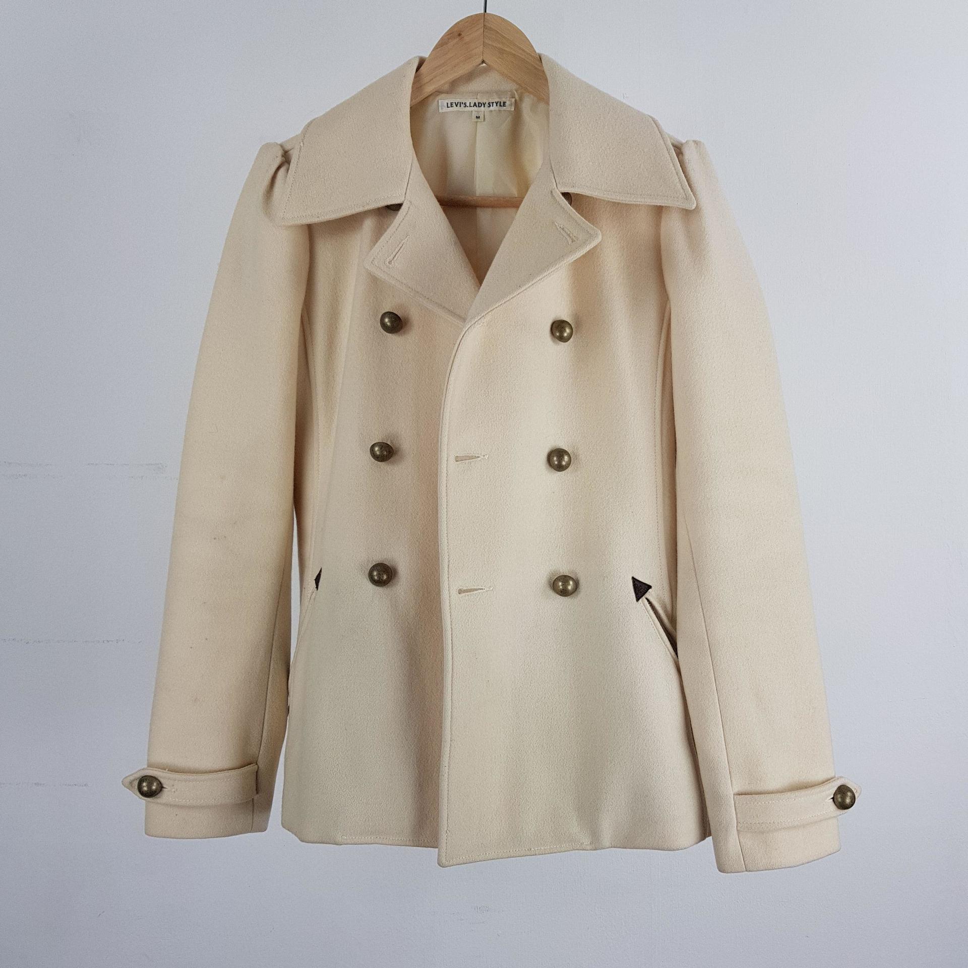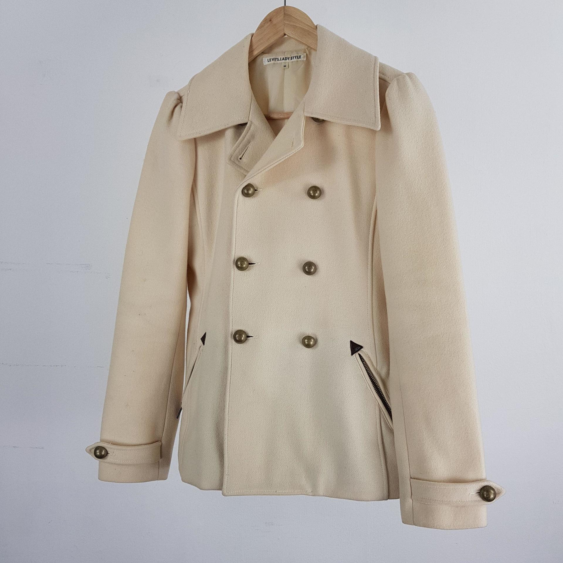 플랫 한 크림 컬러와 독특한 버튼 포인트가 인상적인 리바이스의 울 코트 제품입니다.