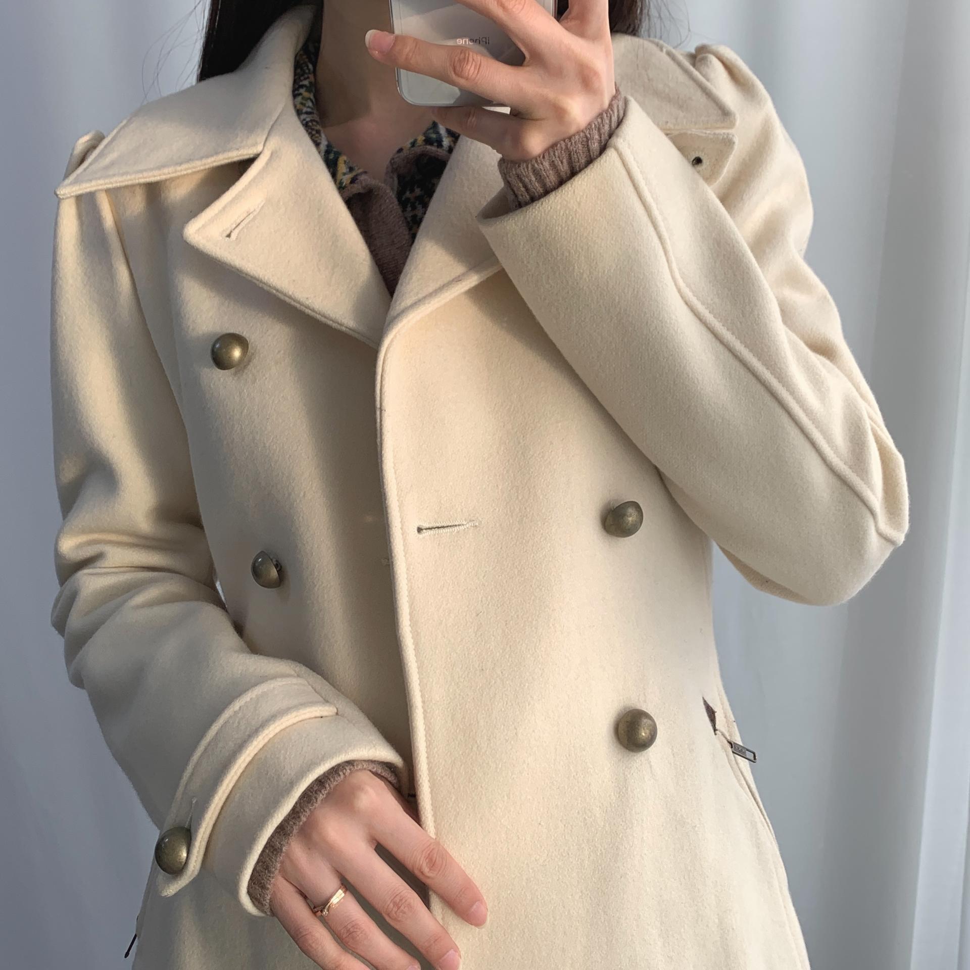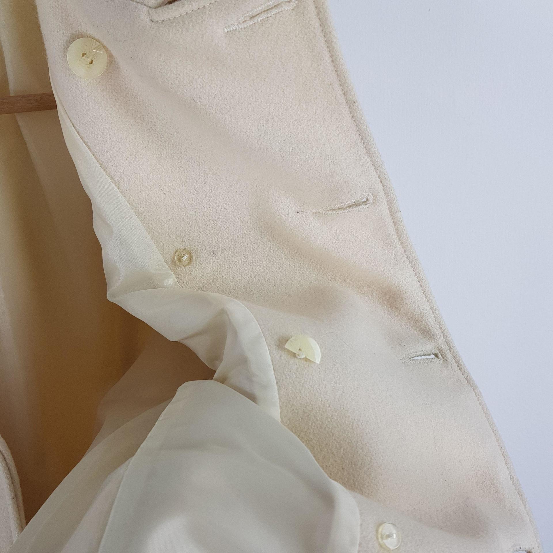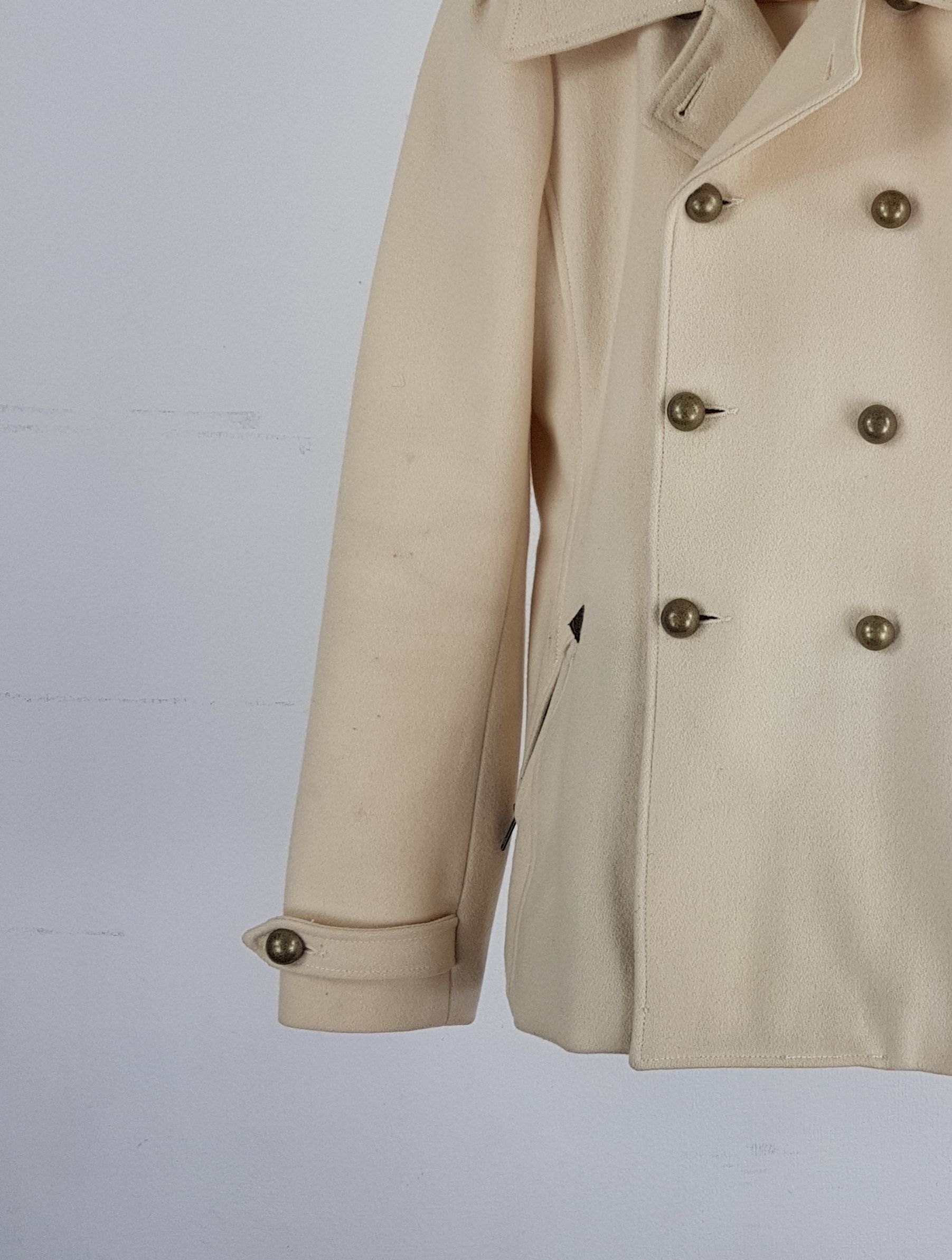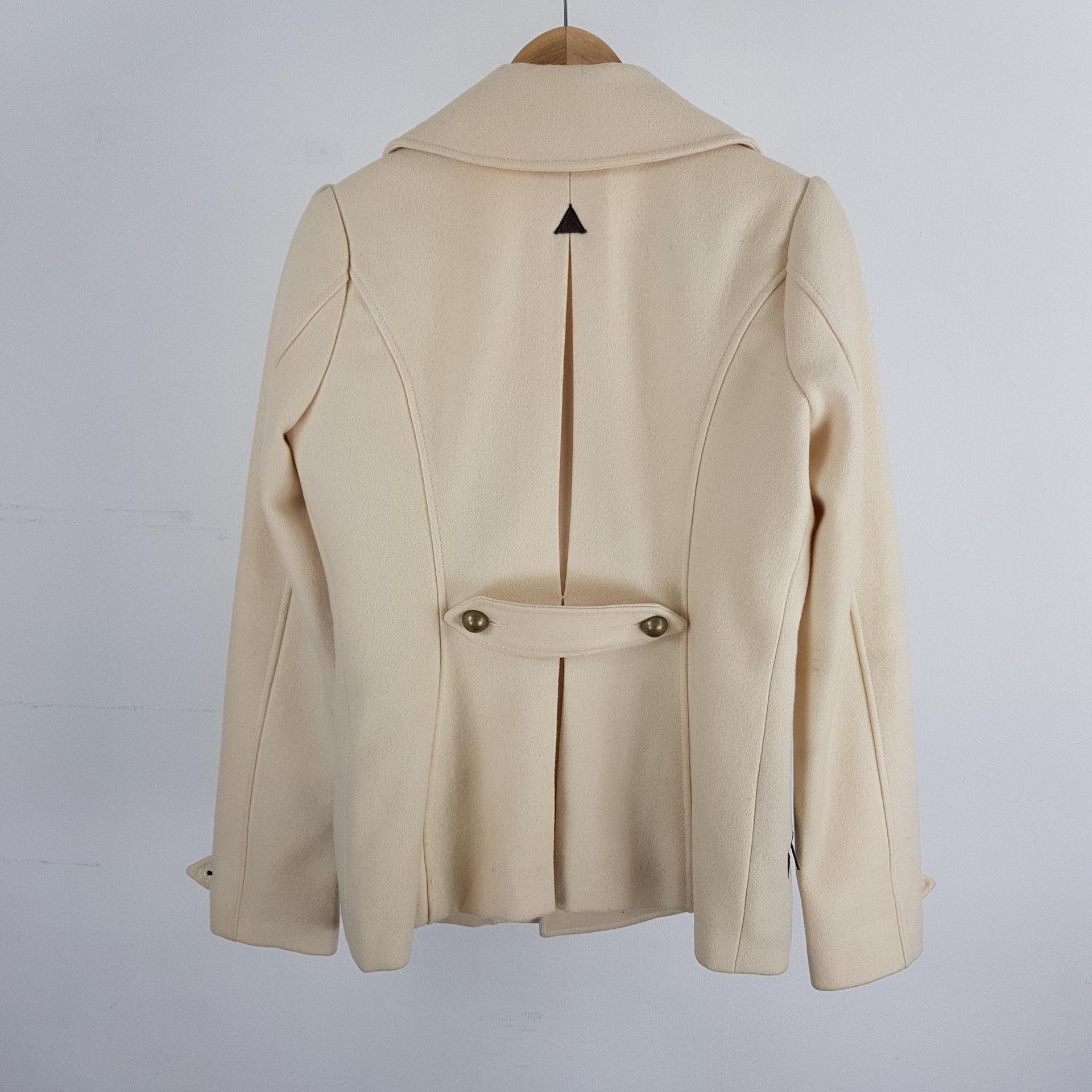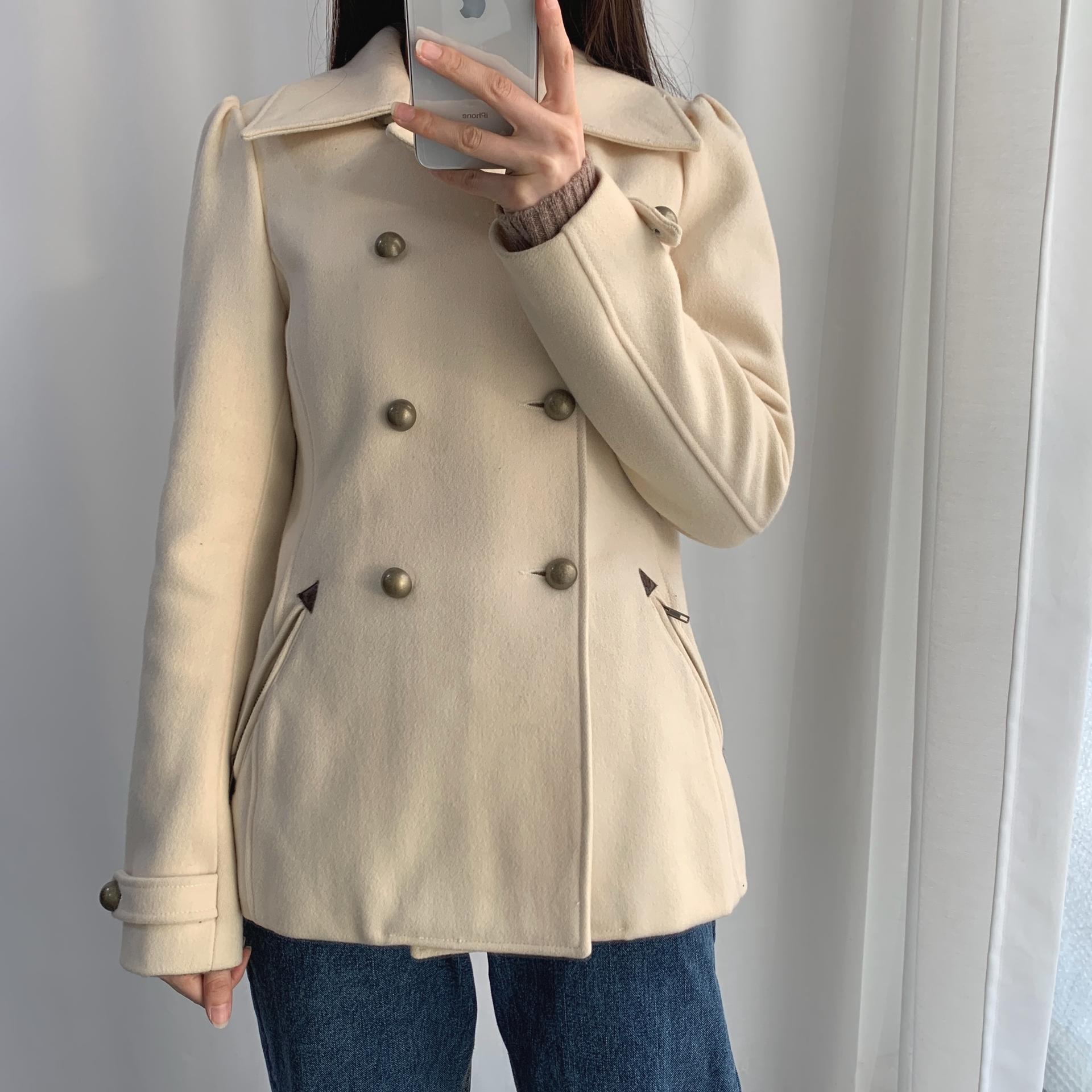 플랫 한 크림 컬러와 독특한 버튼 포인트가 인상적인 리바이스의 울 코트 제품입니다.
