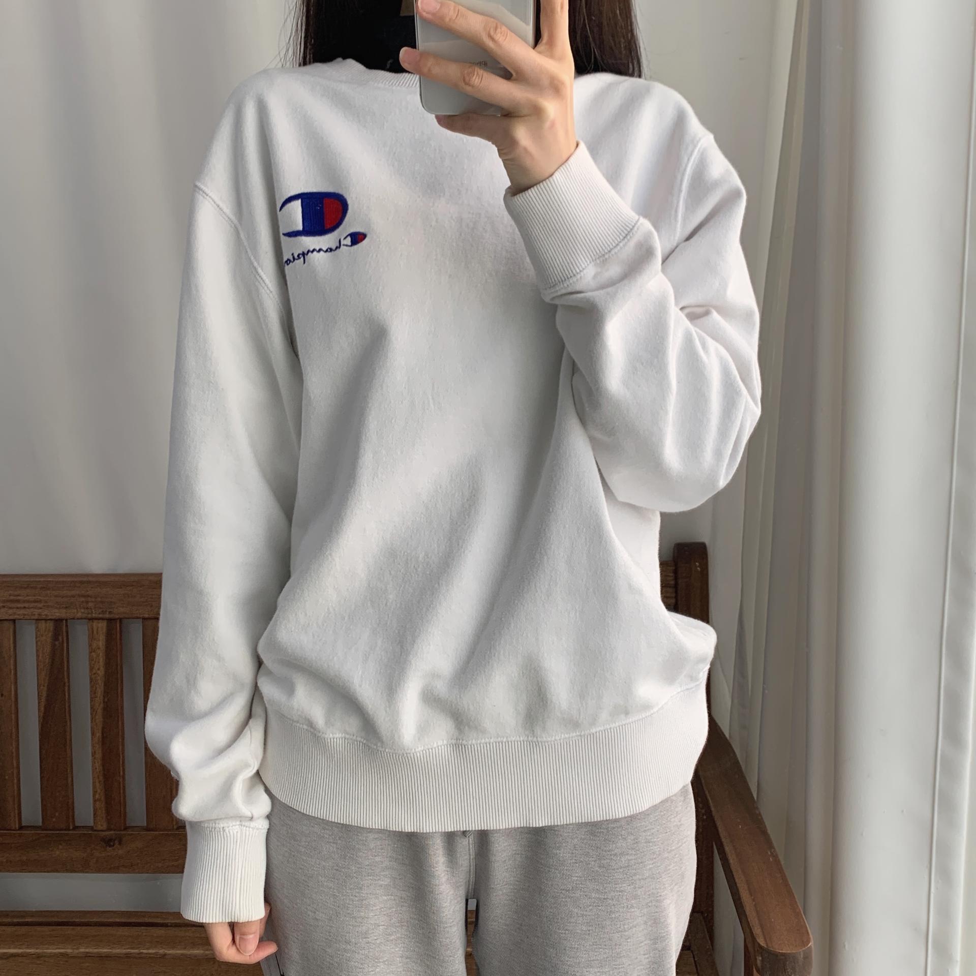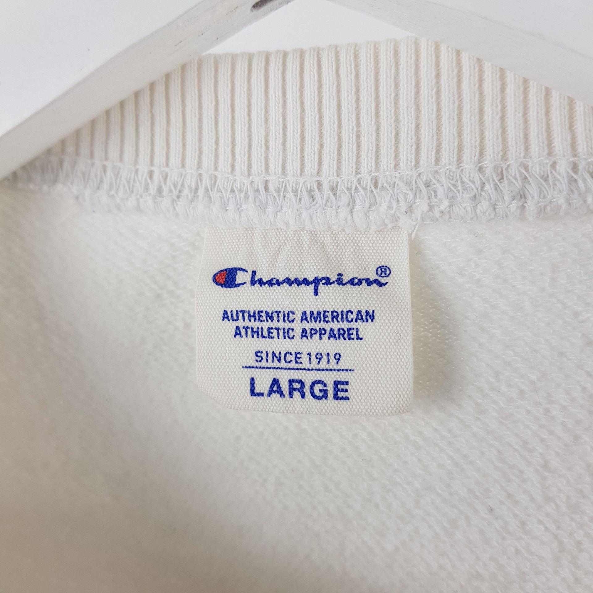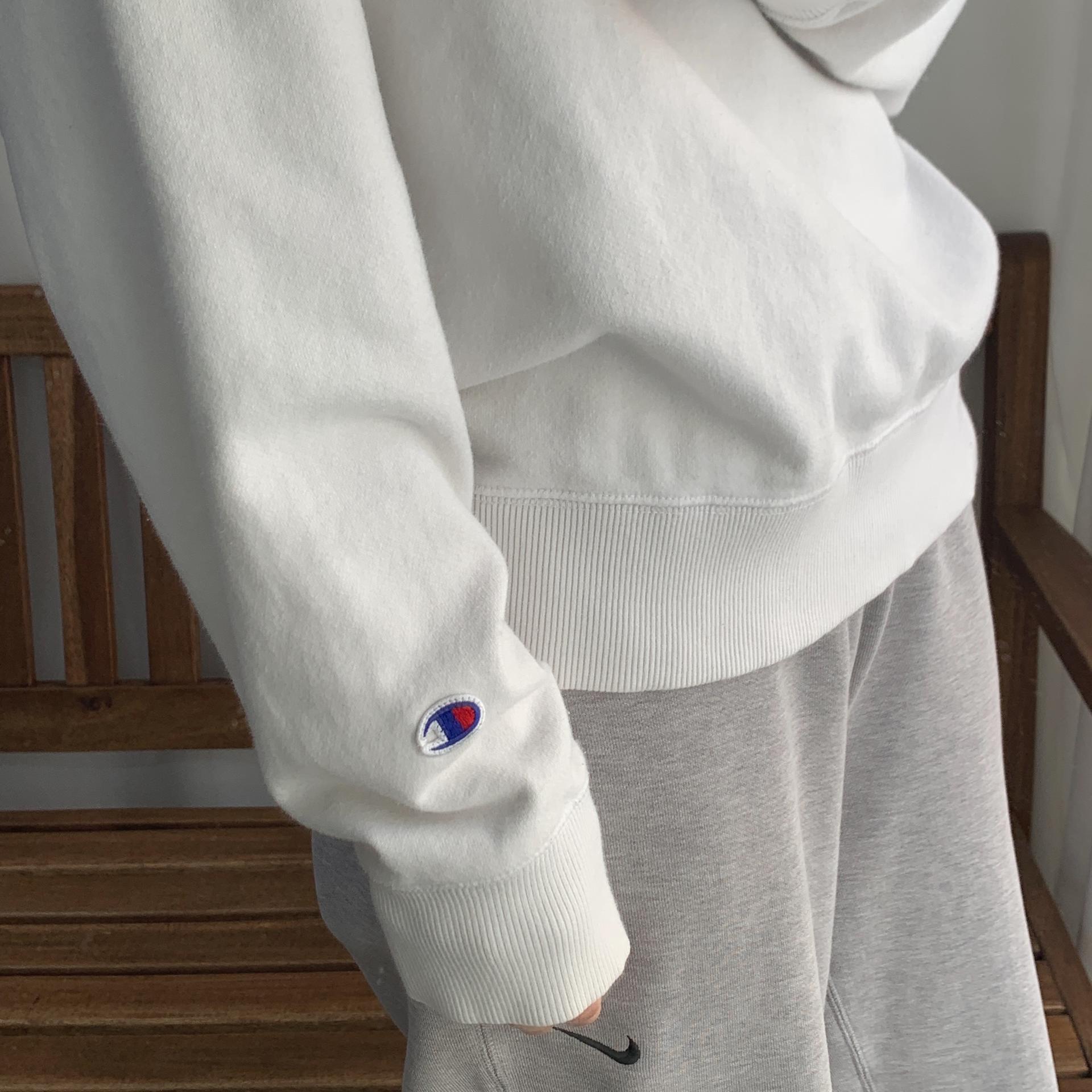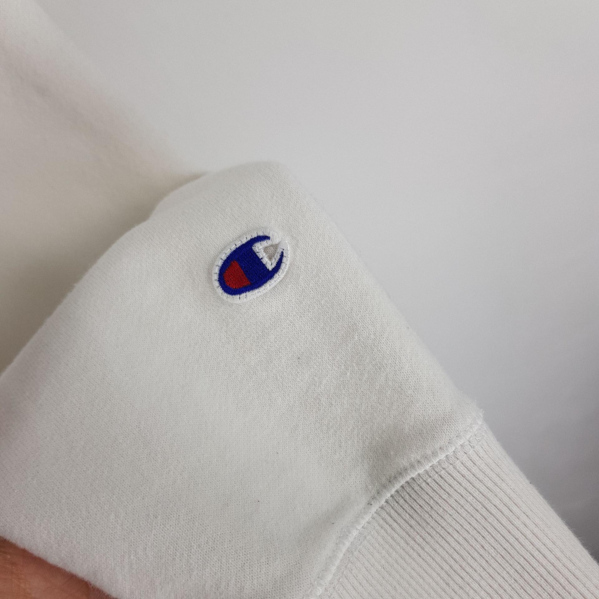 화이트 바디 컬러임에도 최상의 바디 컨디션을 유지하고 있는 챔피온의 스웨트 셔츠 제품입니다.