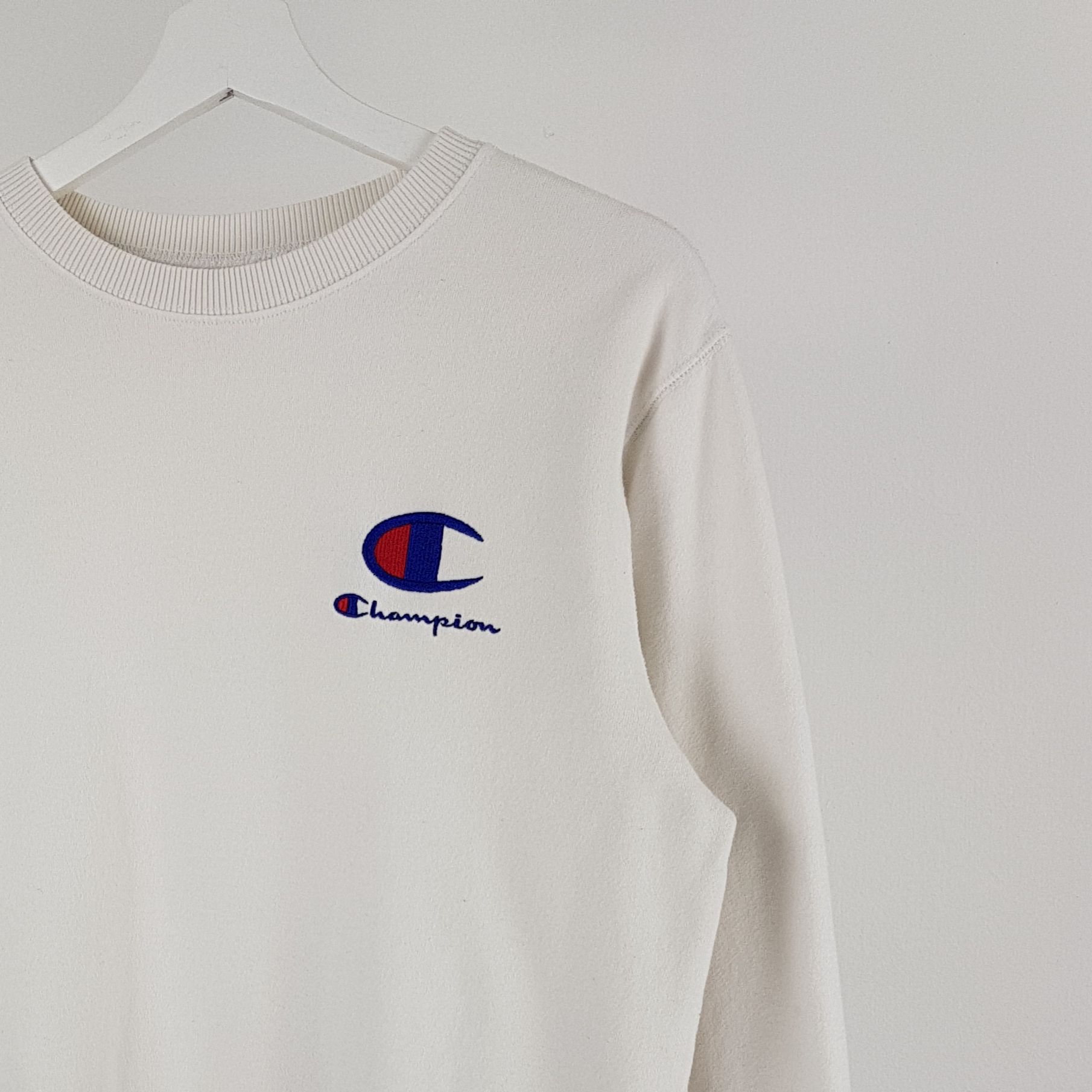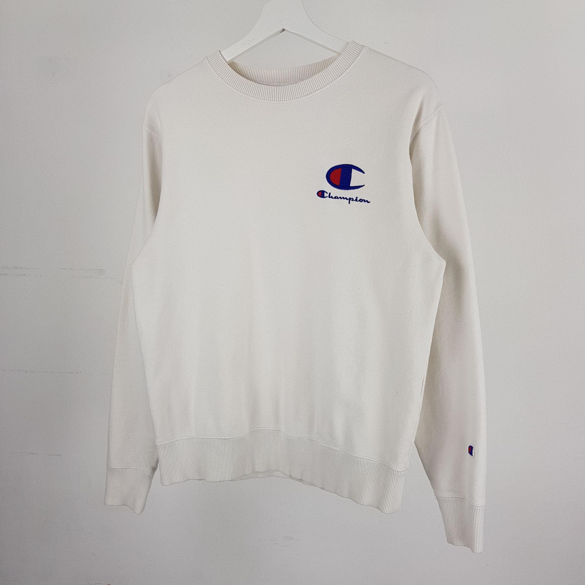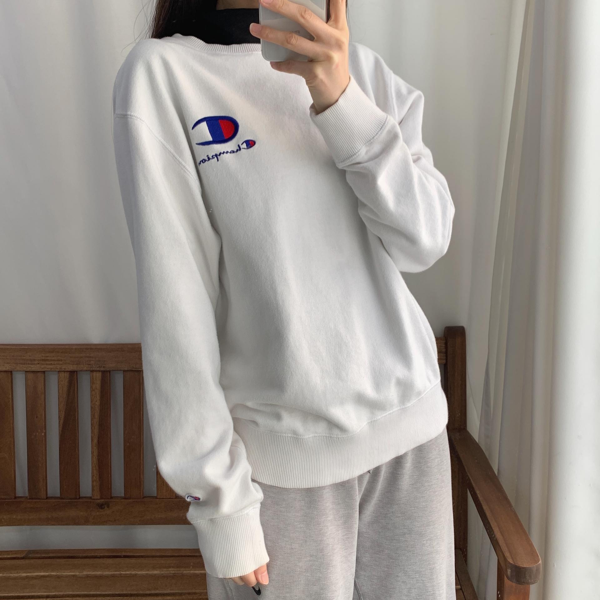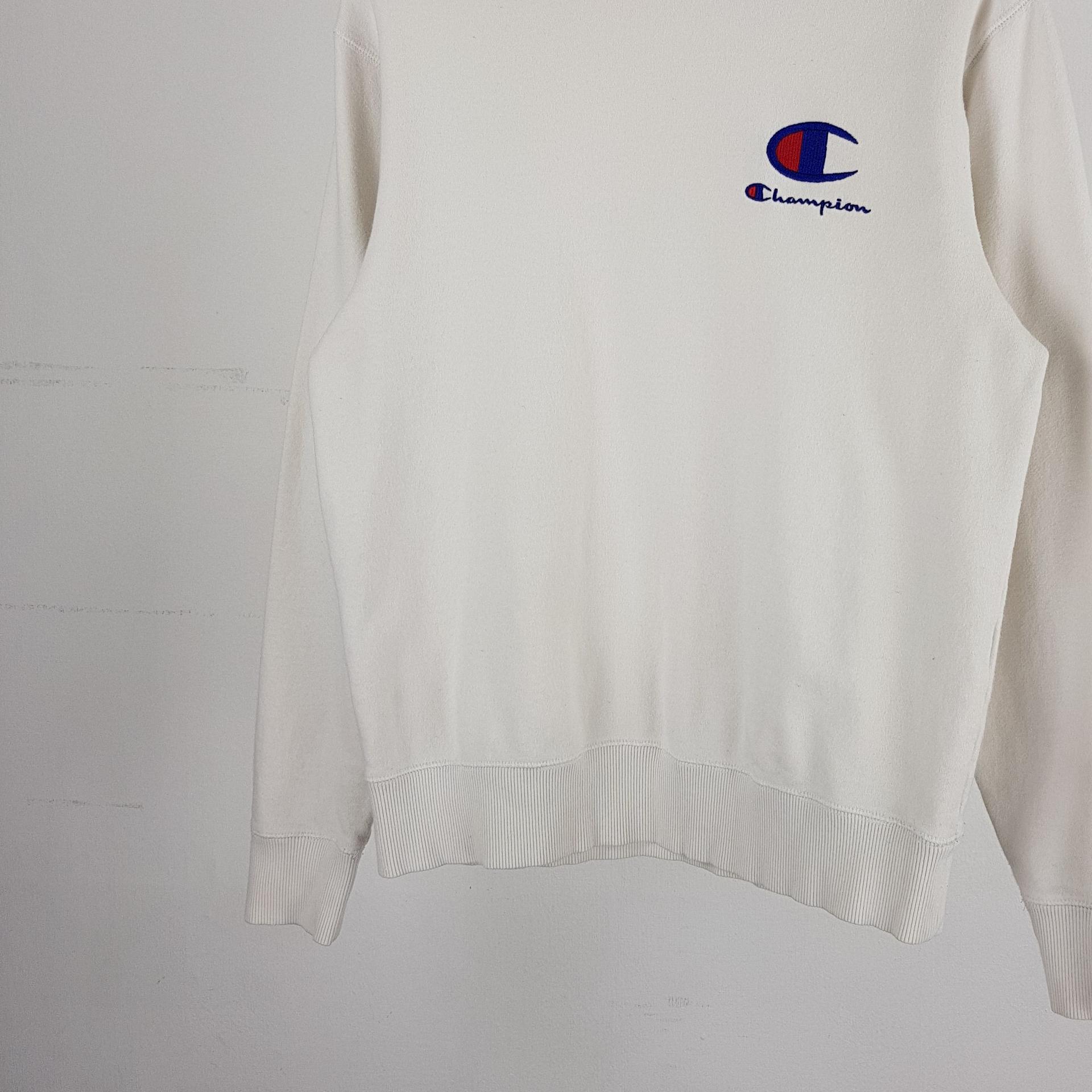 화이트 바디 컬러임에도 최상의 바디 컨디션을 유지하고 있는 챔피온의 스웨트 셔츠 제품입니다.