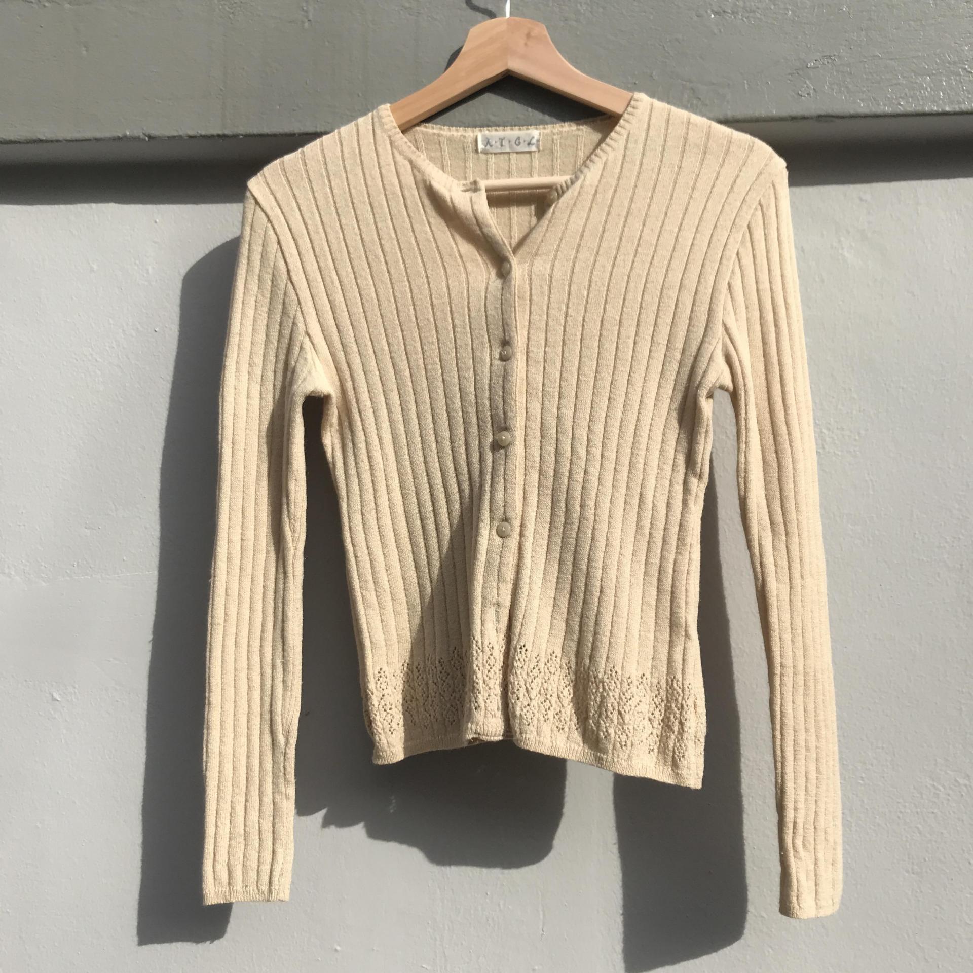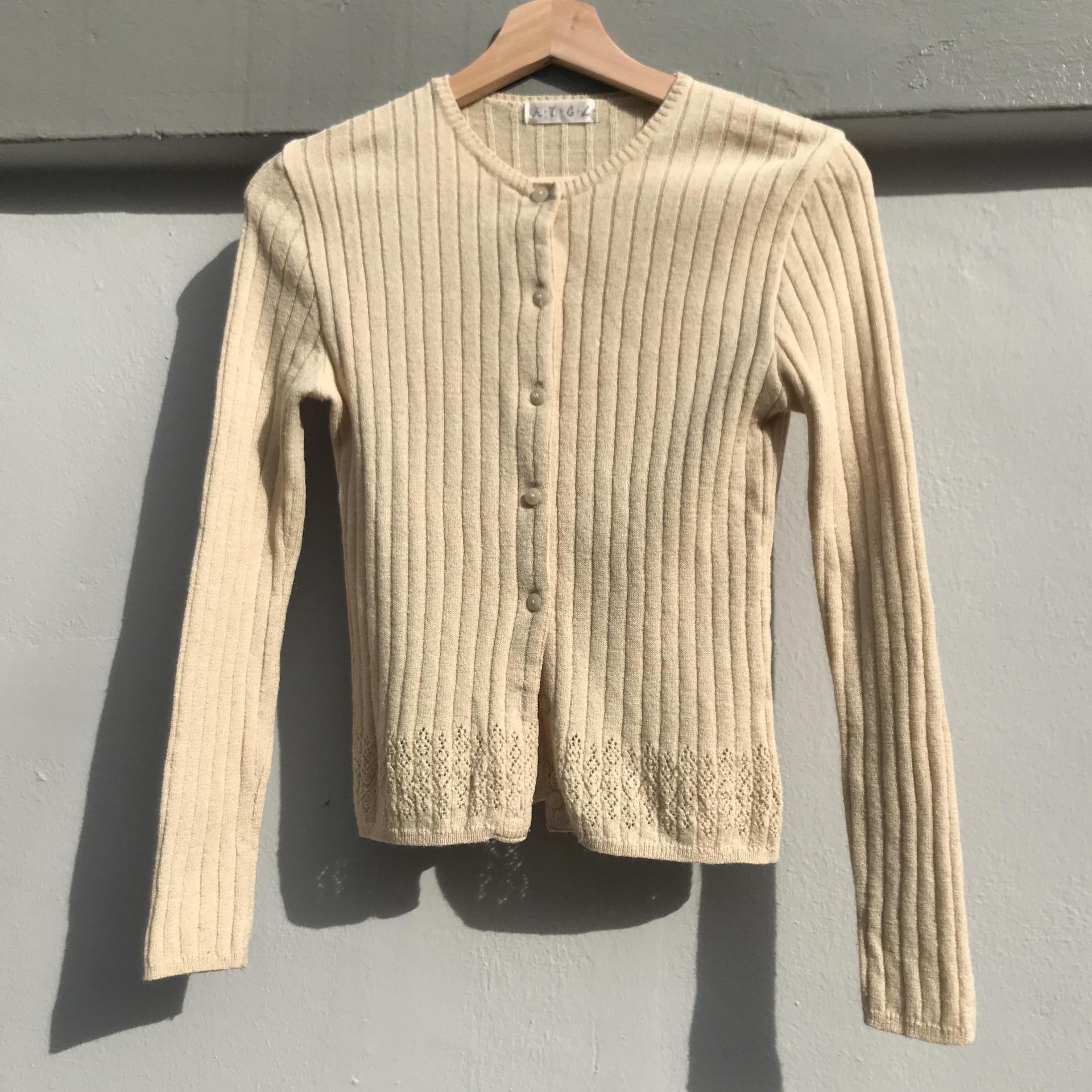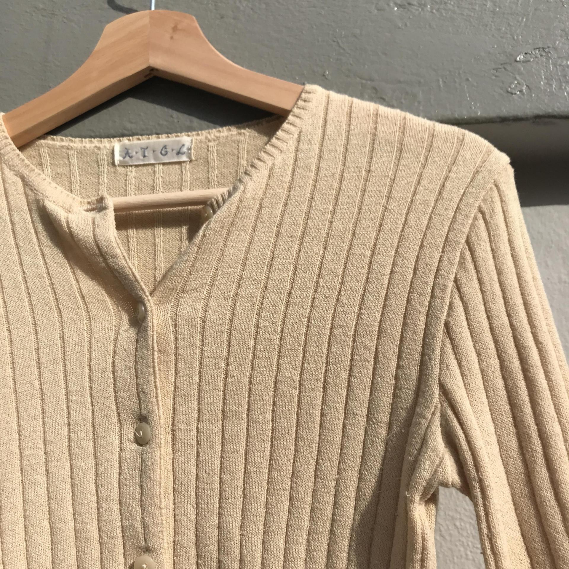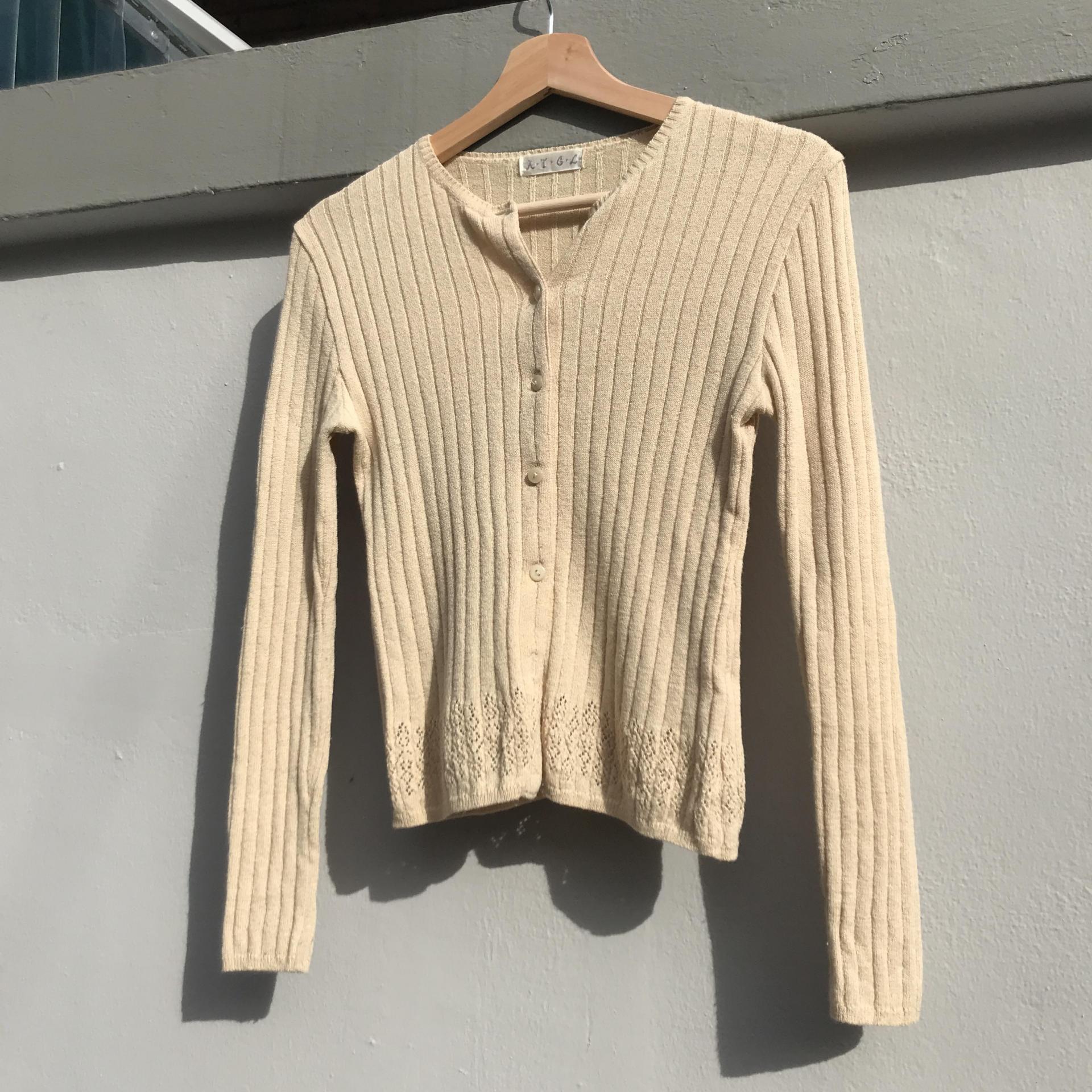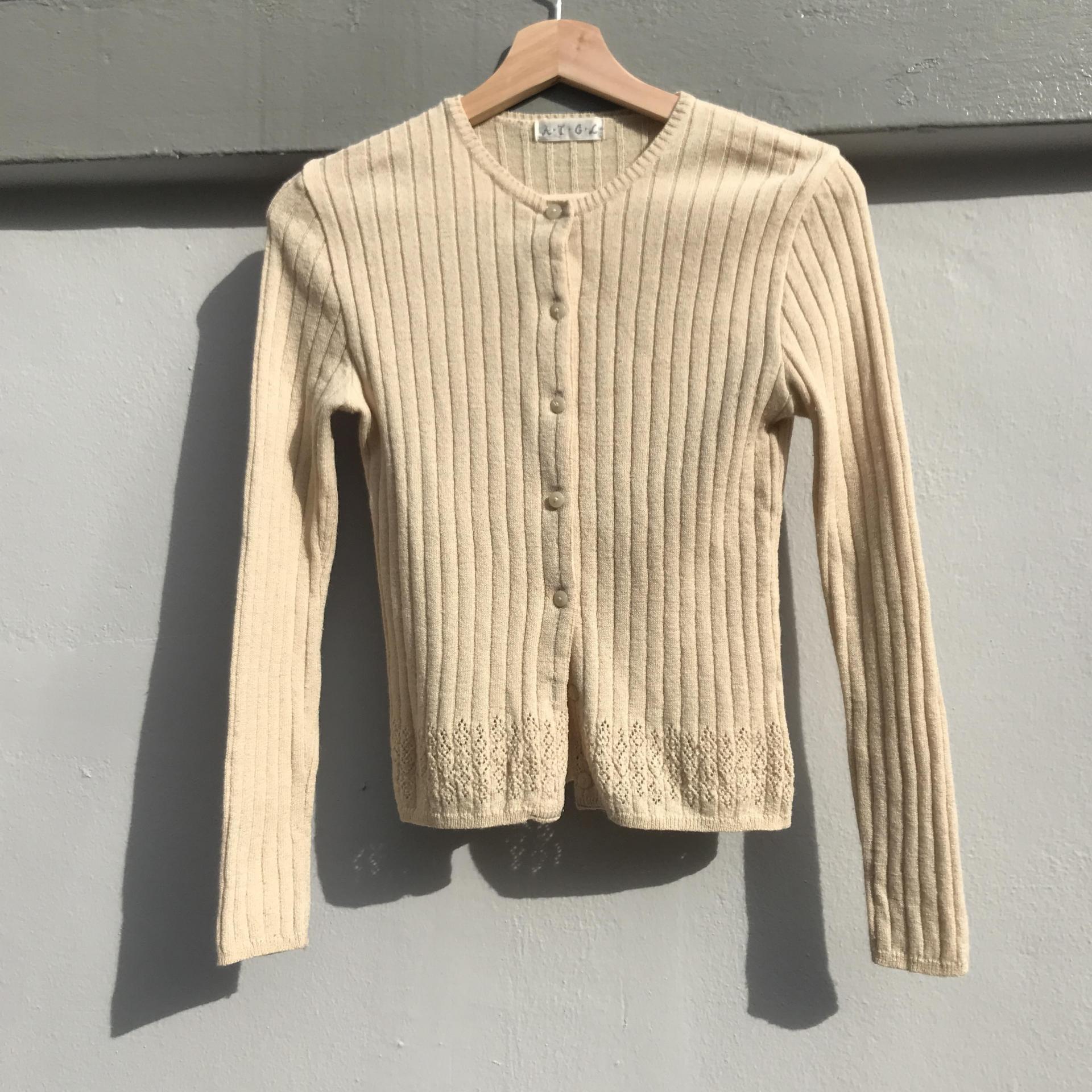 땅콩 크림 같은 색감과 골지 패턴이 돋보이는 울 가디건 아이템 :)