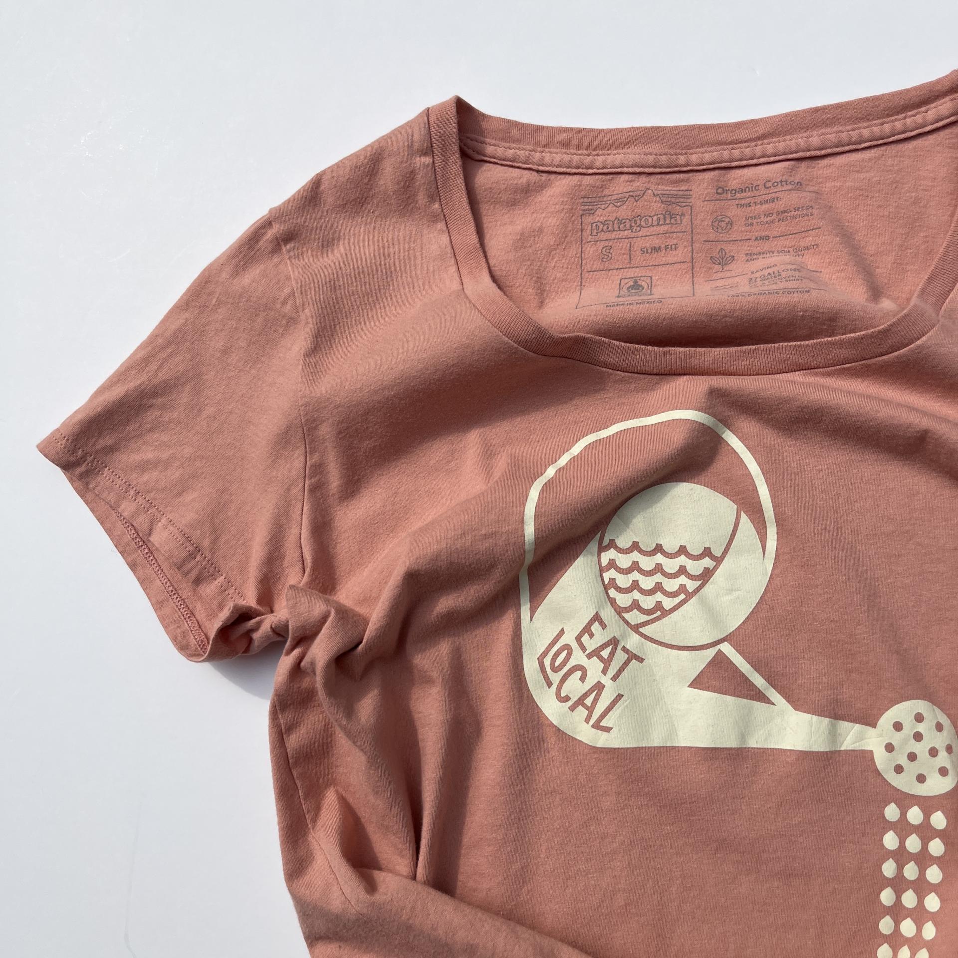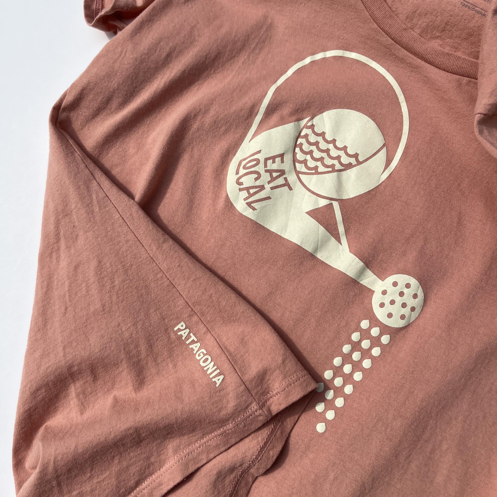 귀여운 자몽핑크 바디 컬러와 물뿌리개 프린팅 포인트가 돋보이는 파타고니아의 오가닉 코튼 100% 티셔츠 제품 :)