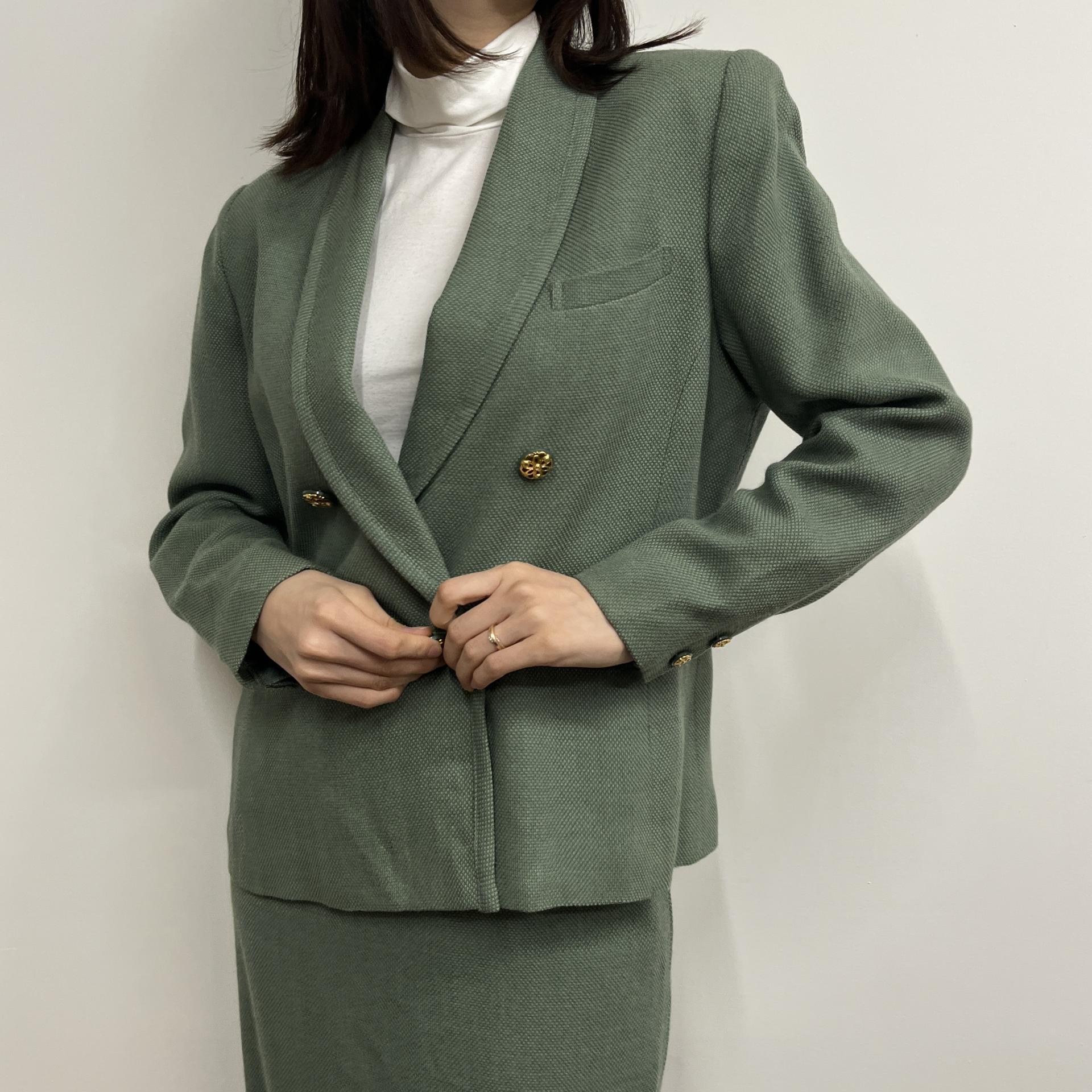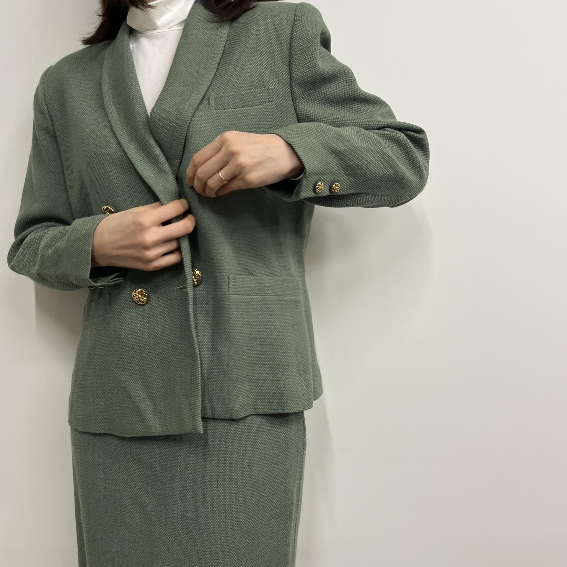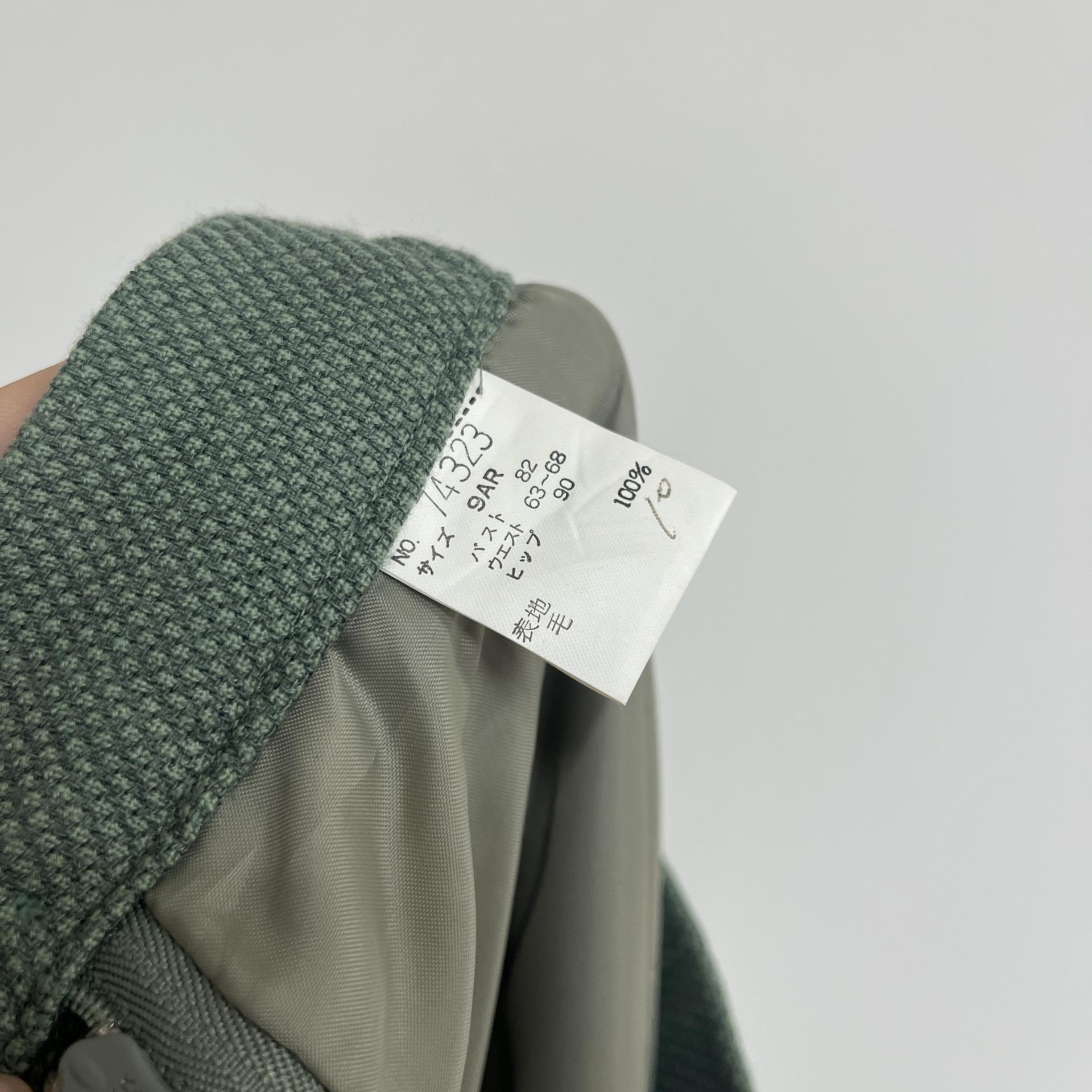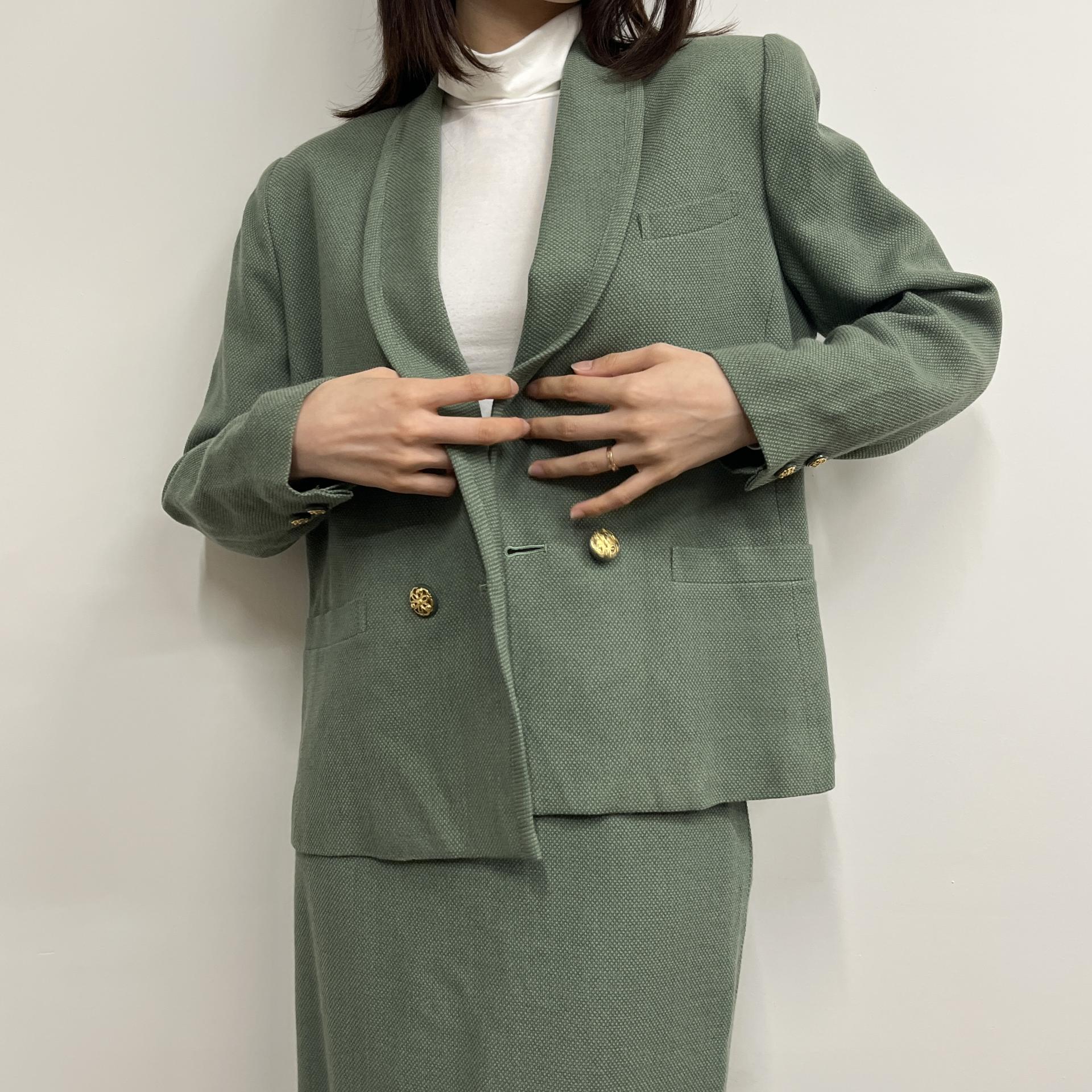 그리너리 바디 컬러와 예쁜 실루엣이 돋보이는 울 100% 셋업 제품입니다.