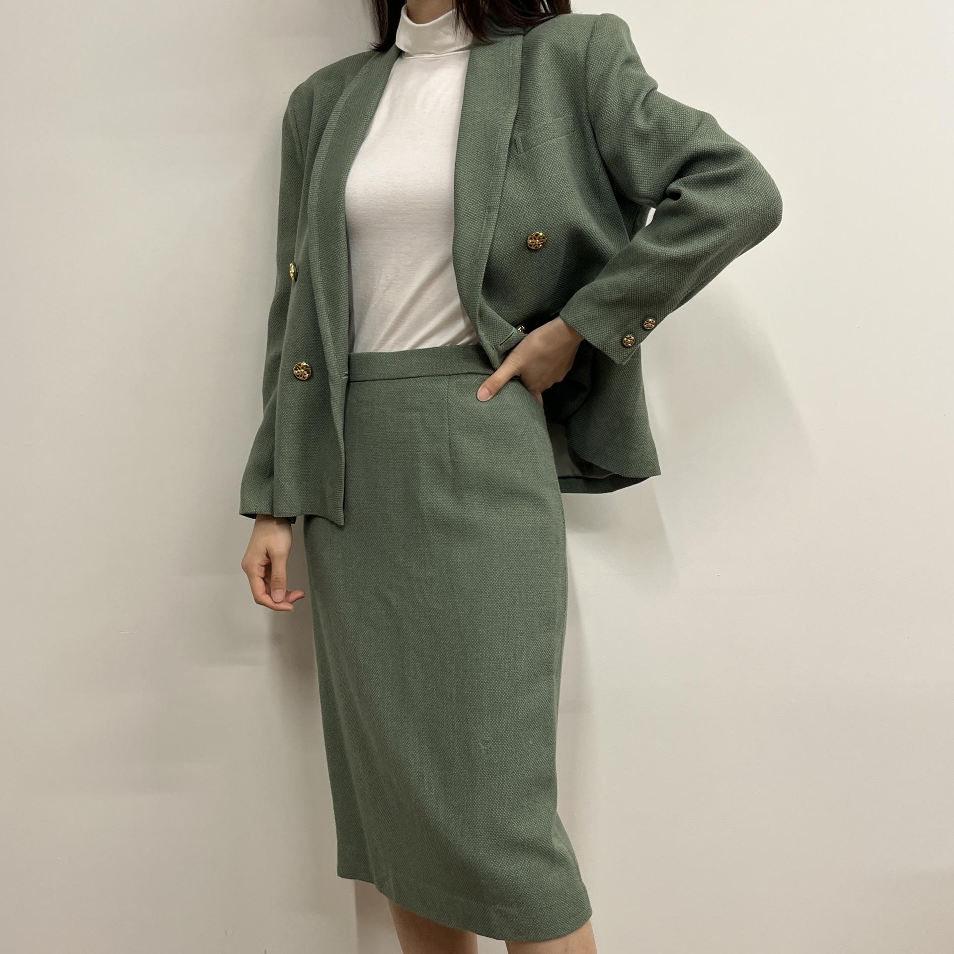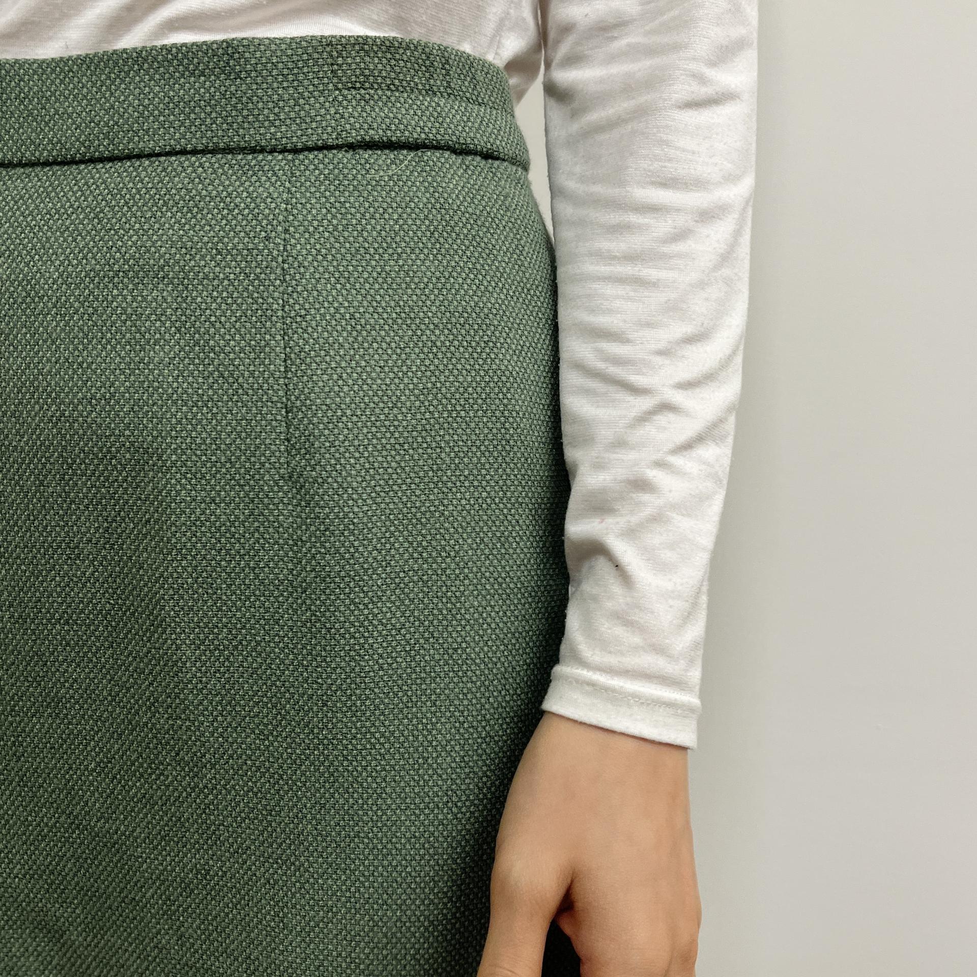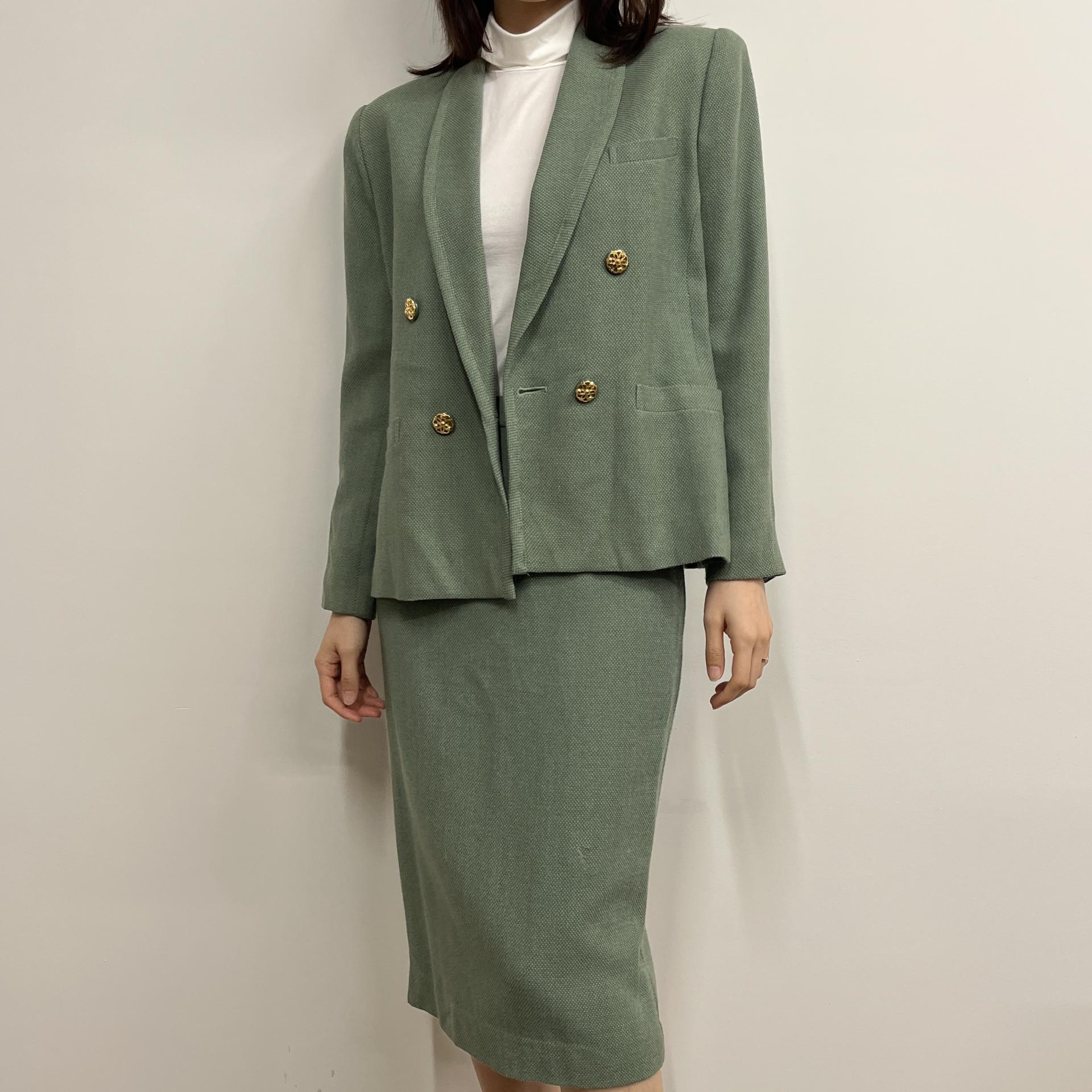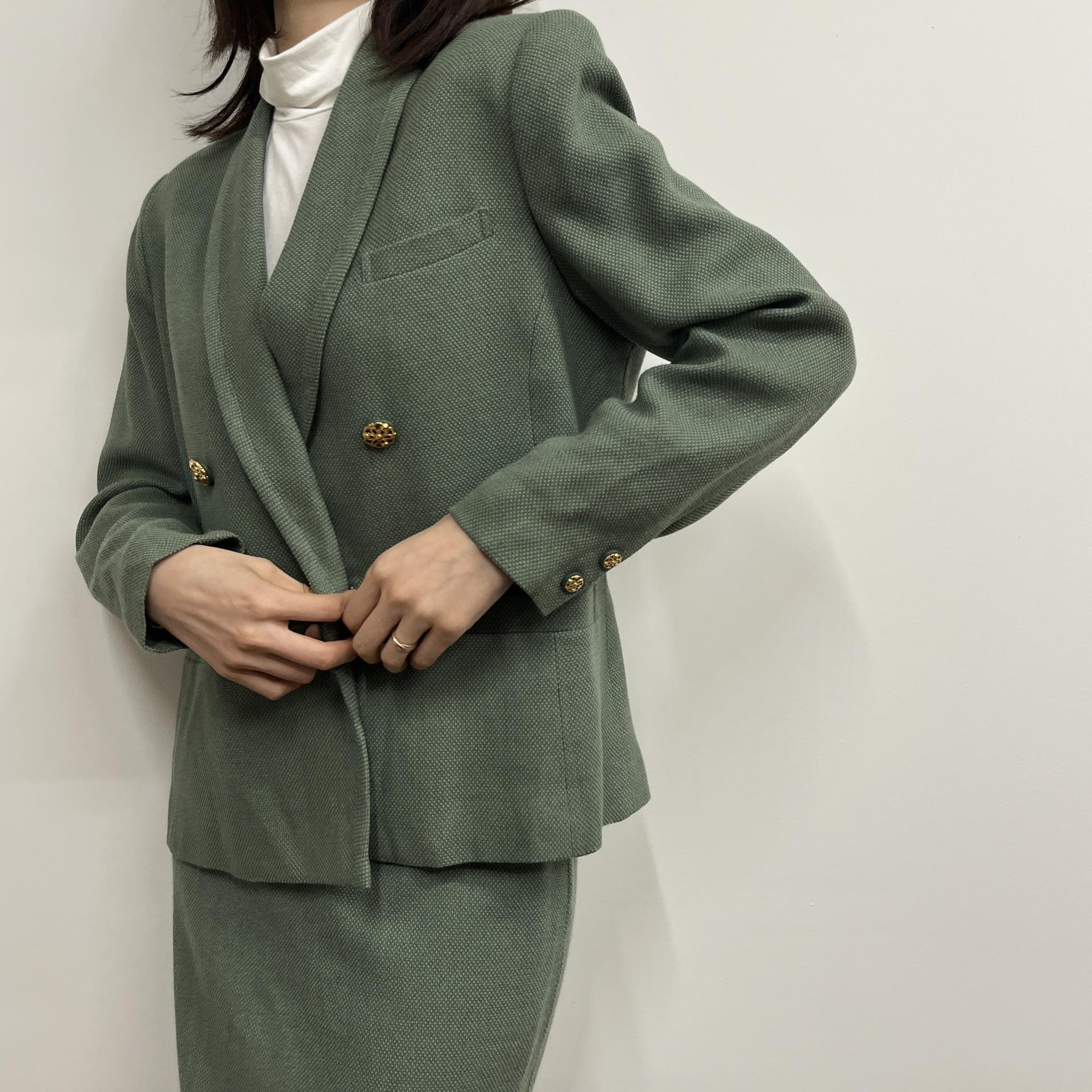 그리너리 바디 컬러와 예쁜 실루엣이 돋보이는 울 100% 셋업 제품입니다.