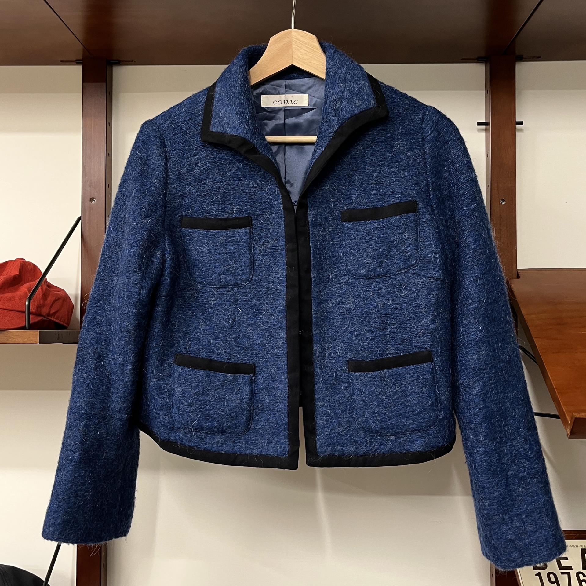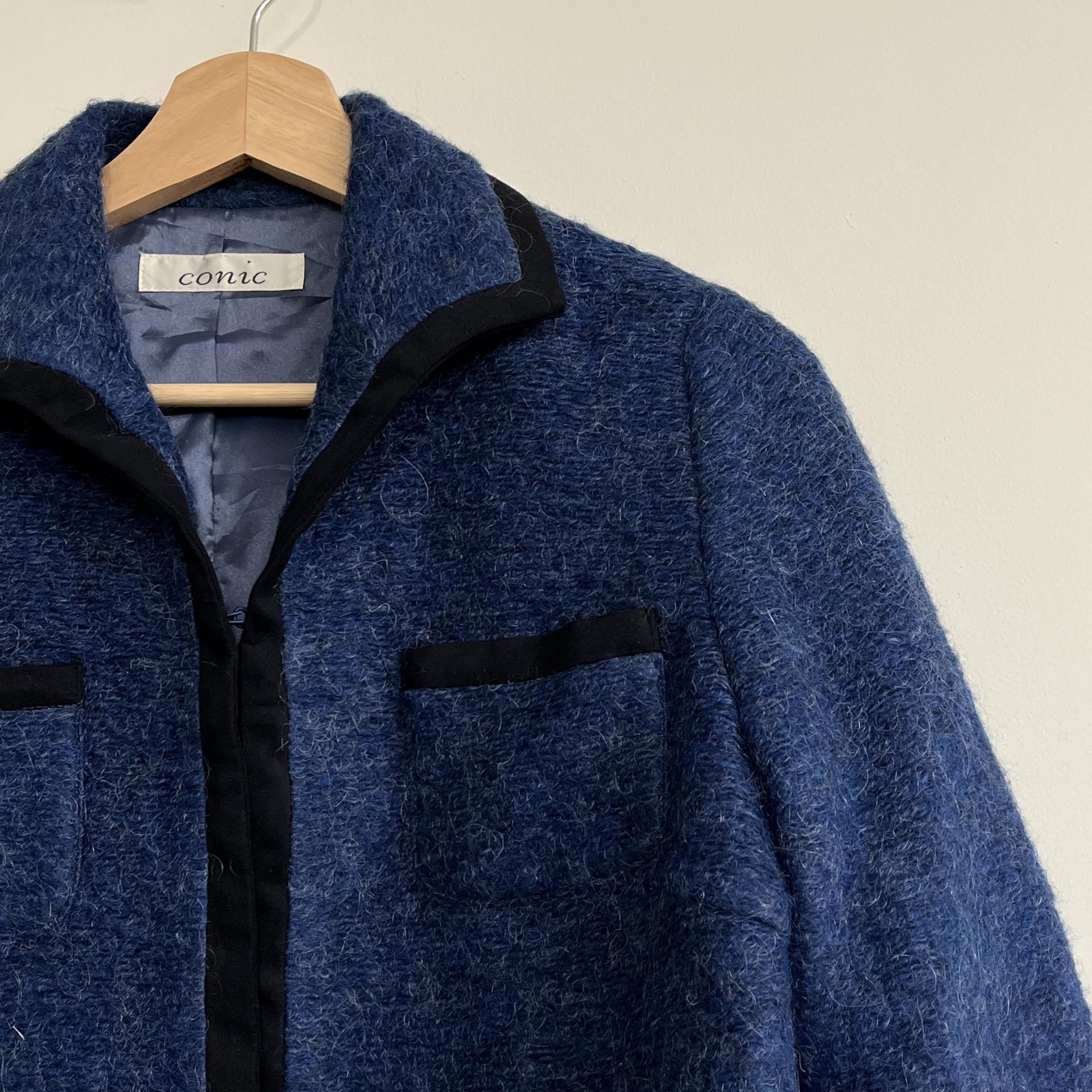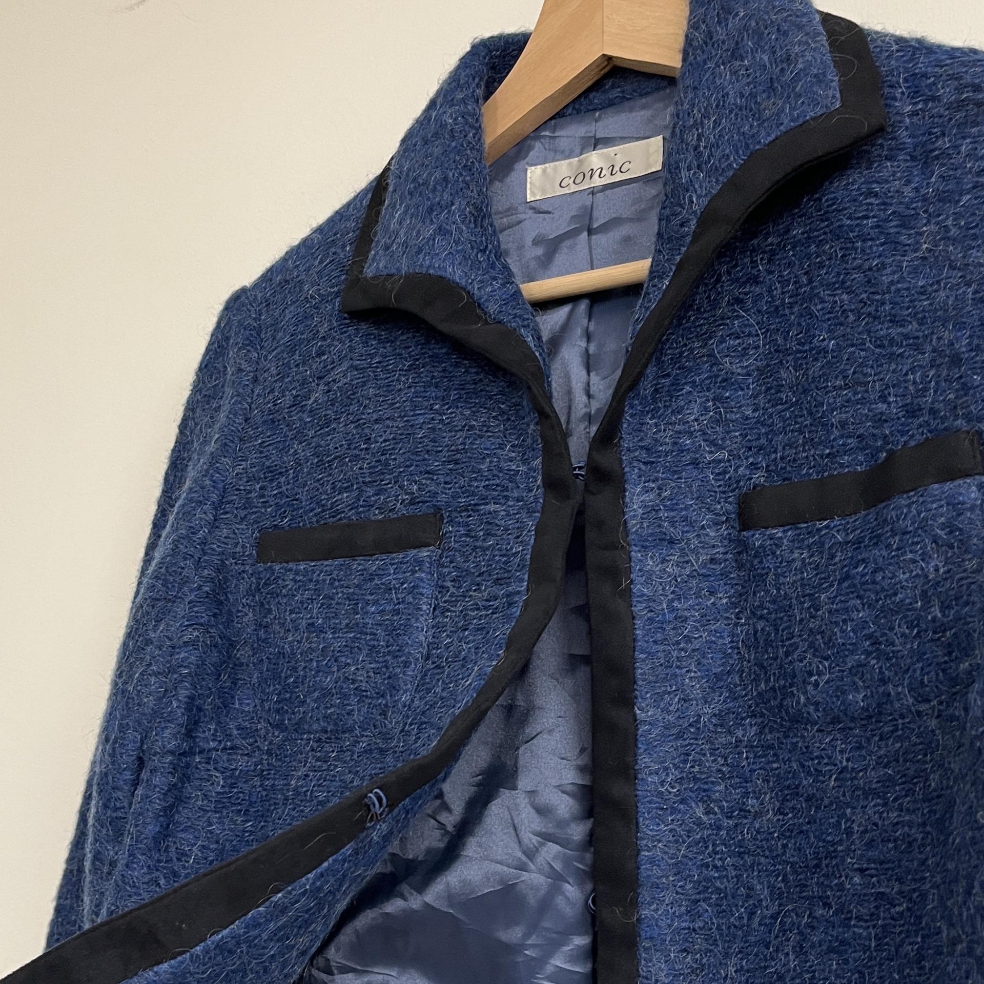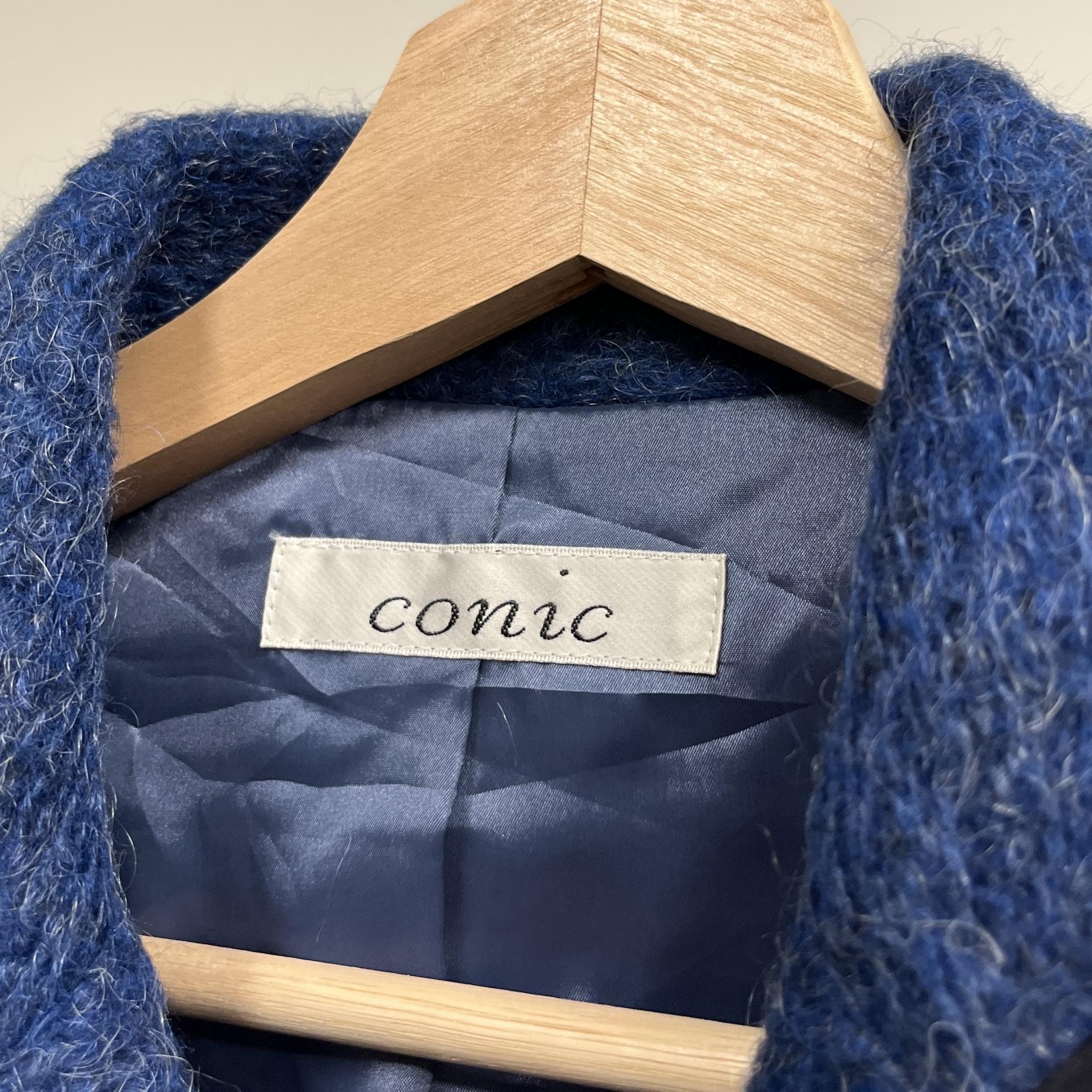 복실복실하고 예쁜 모헤어 울 혼방 소재의 겉감과 고급스러운 푸른 색감이 돋보이는 CONIC의 아우터 제품입니다.