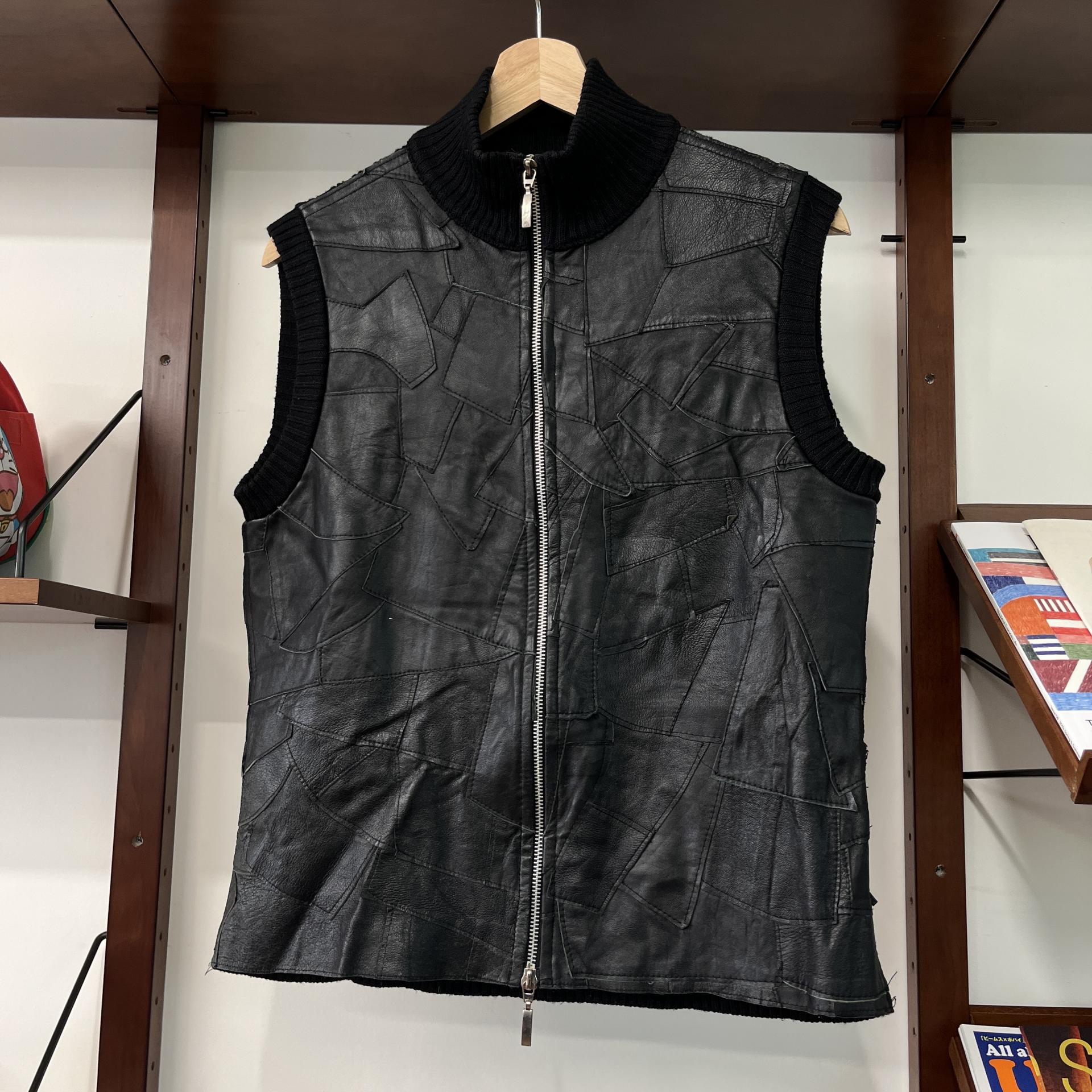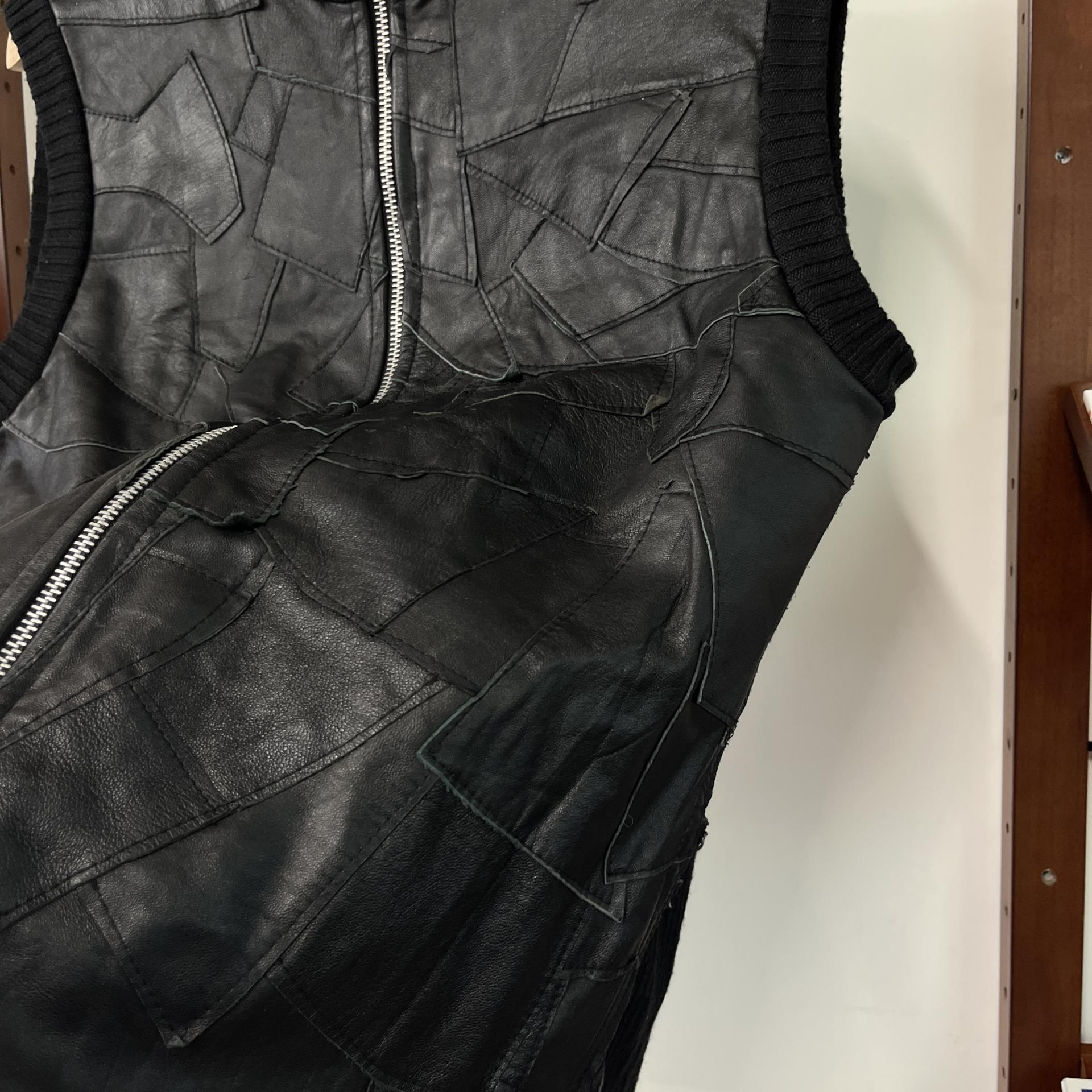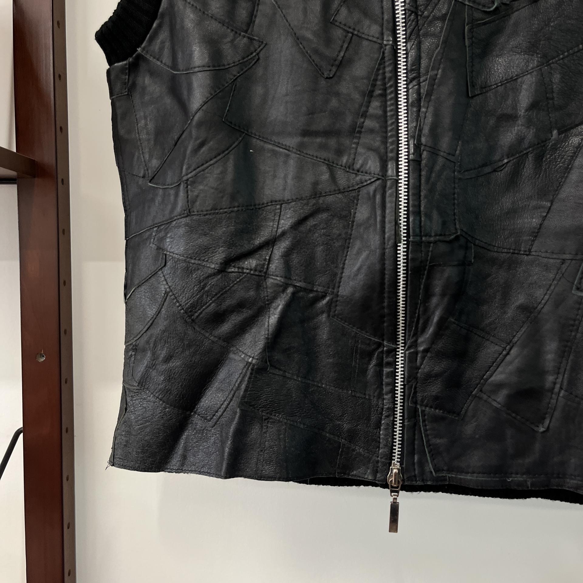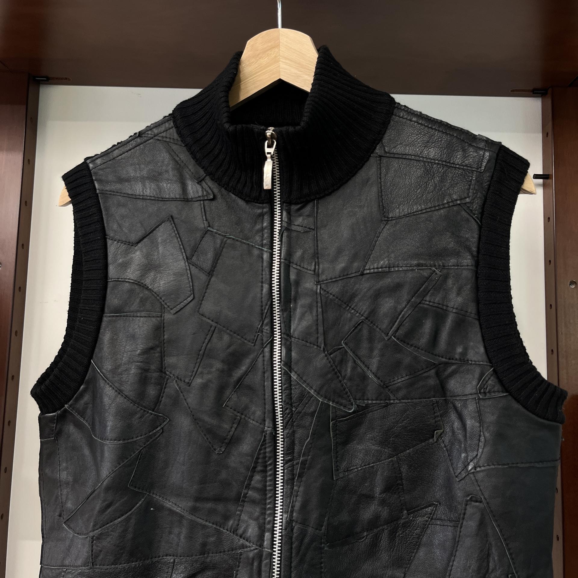 가죽 조각들을 덧붙인 패턴이 돋보이는 베스트 아이템입니다.