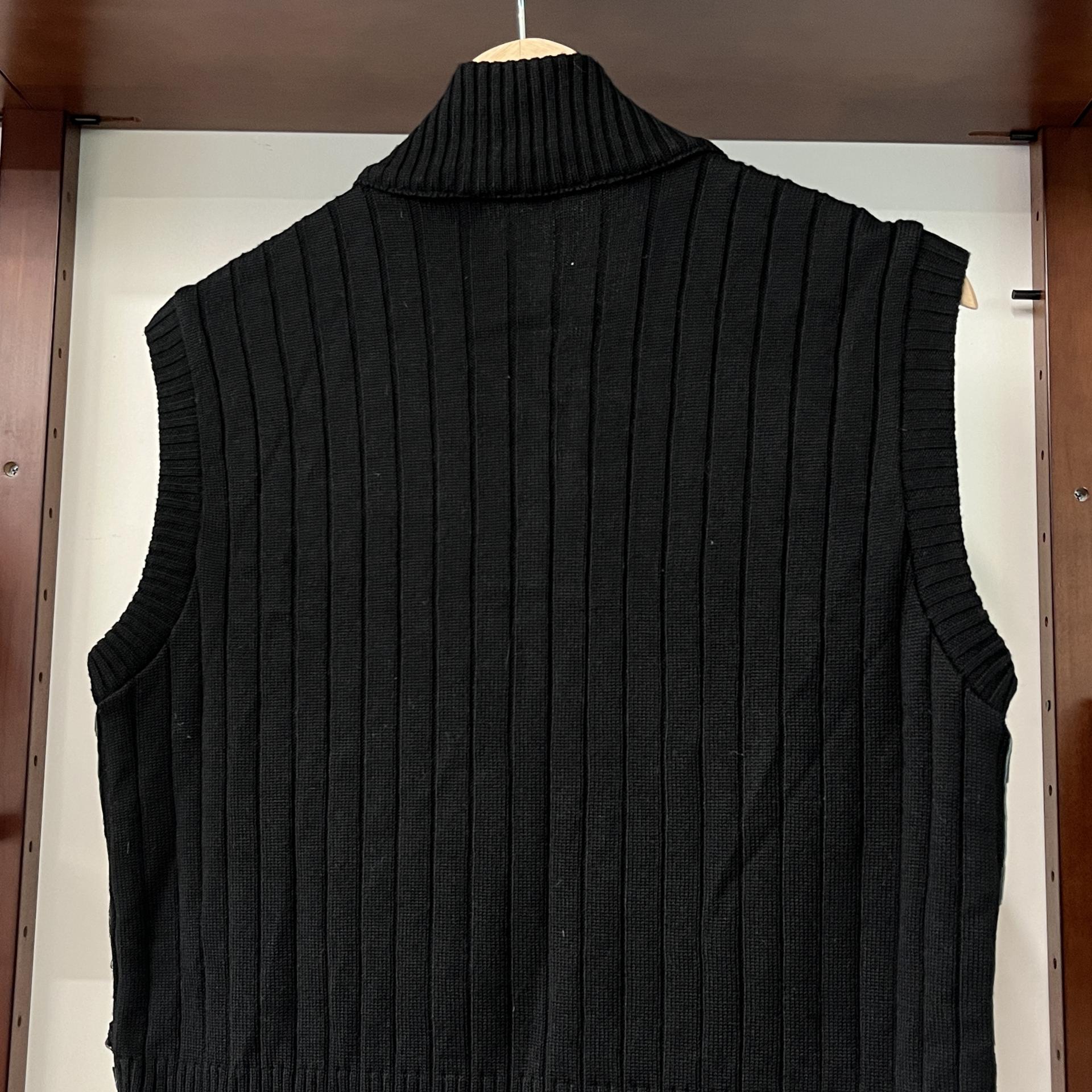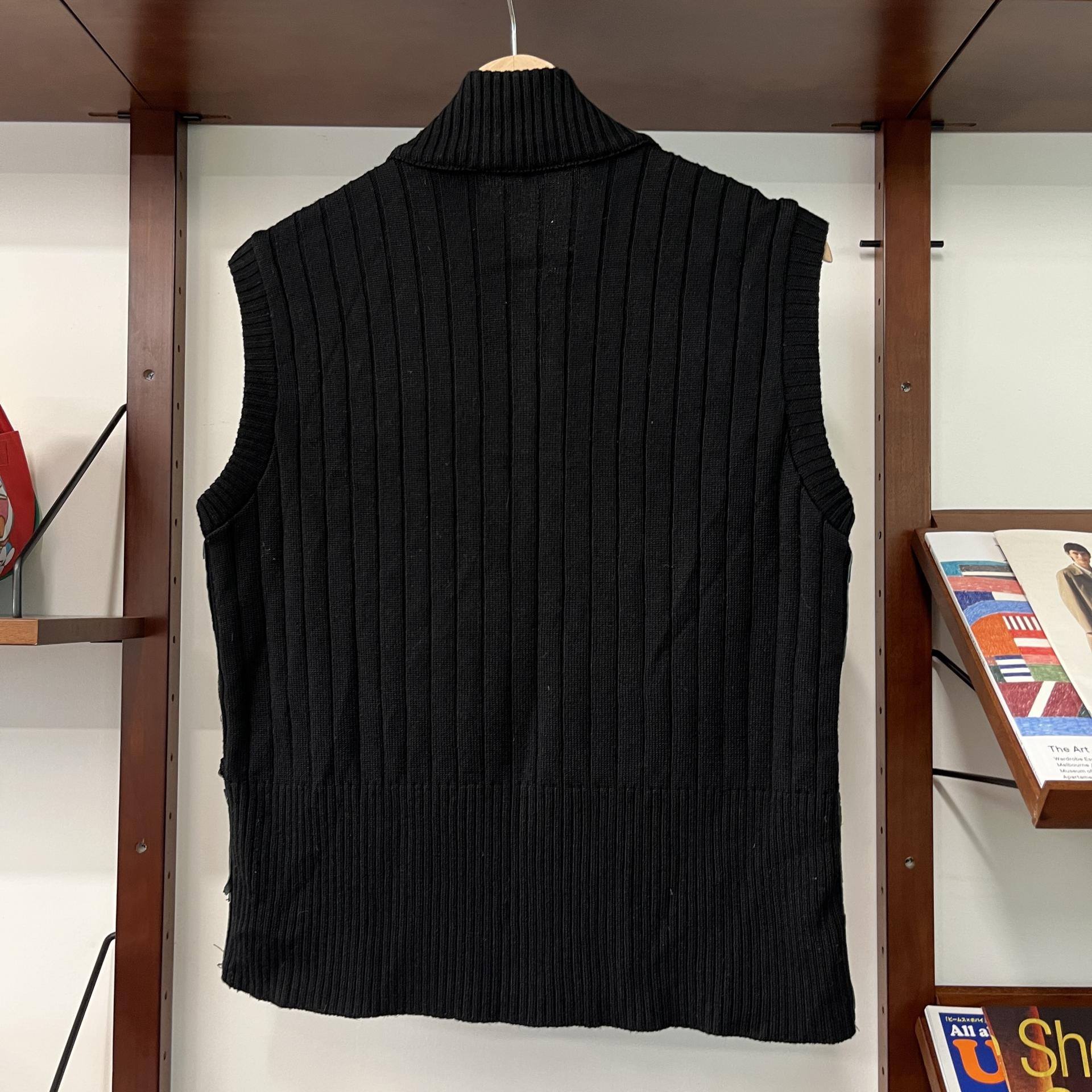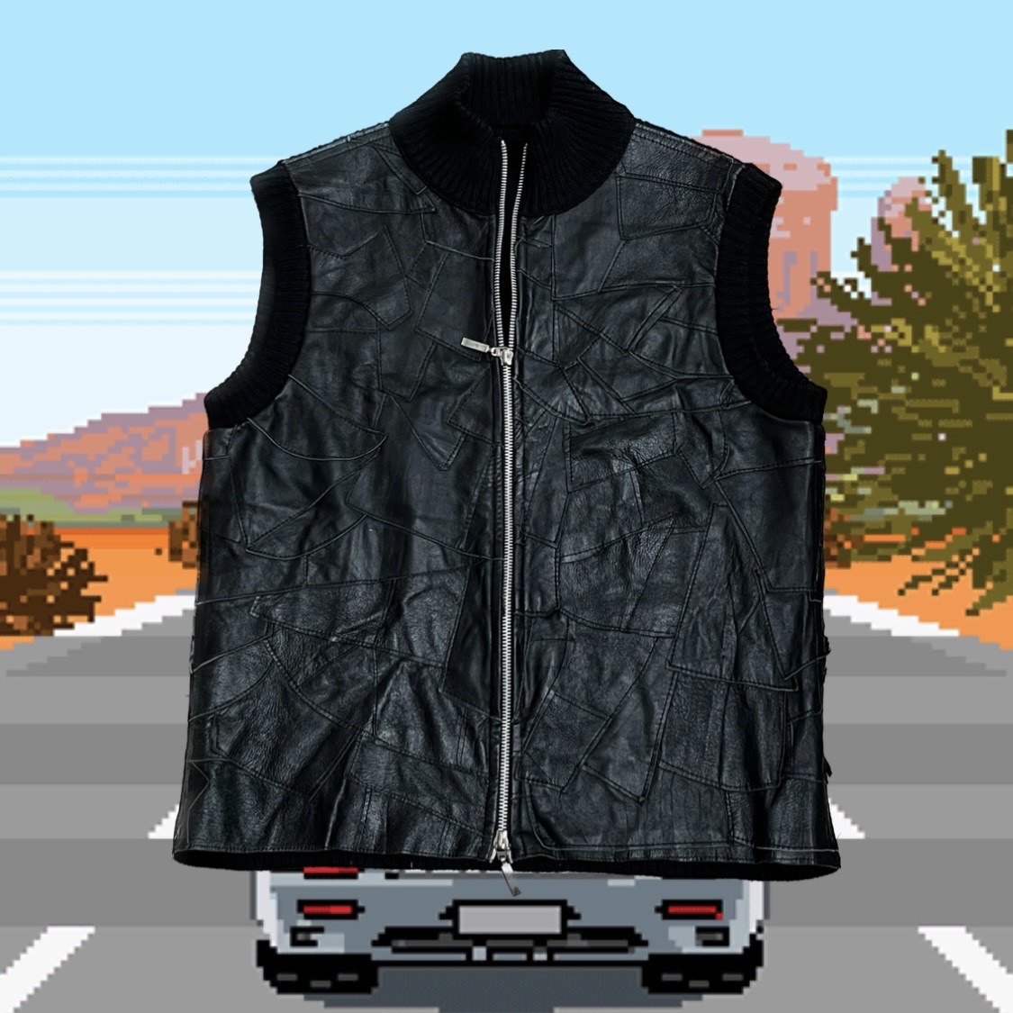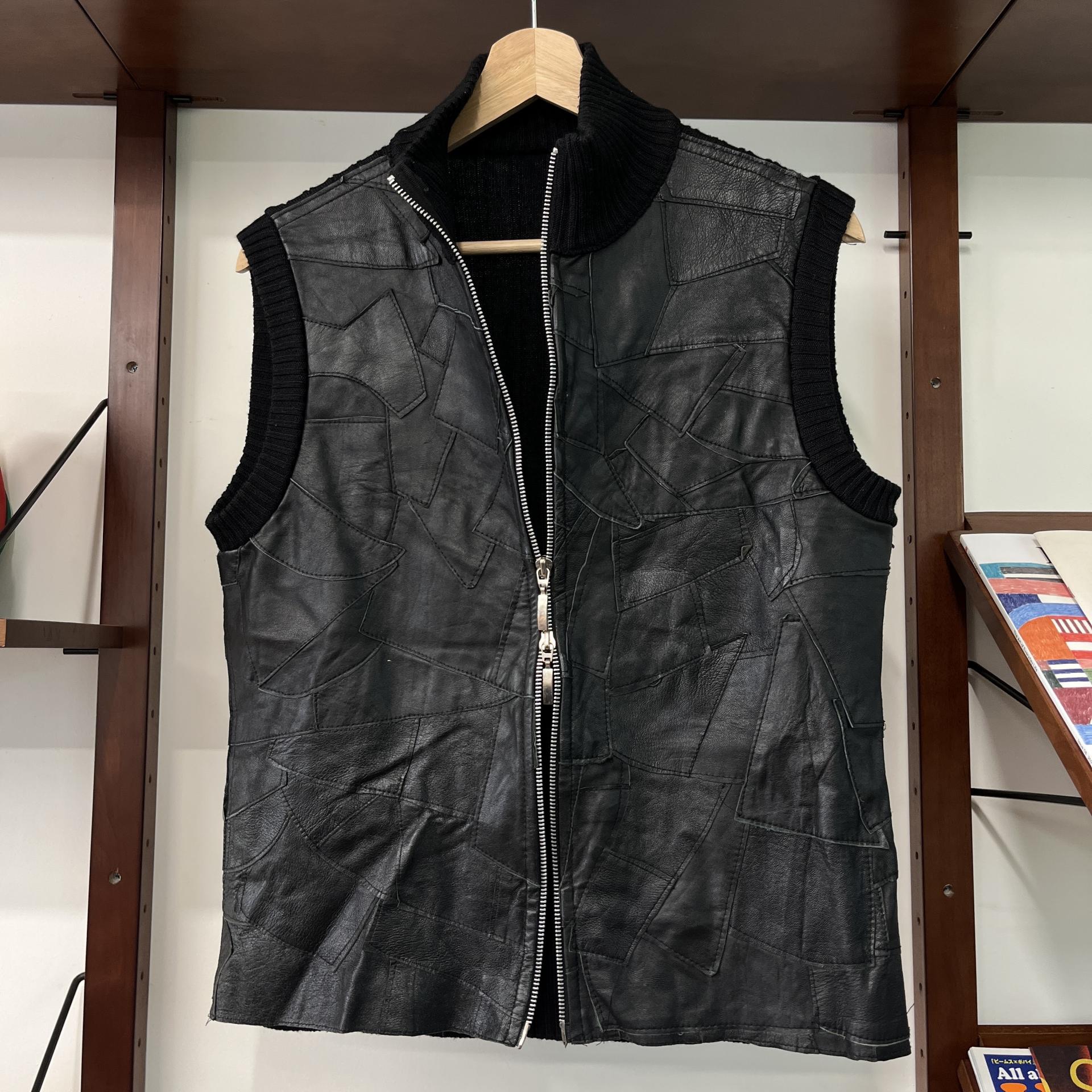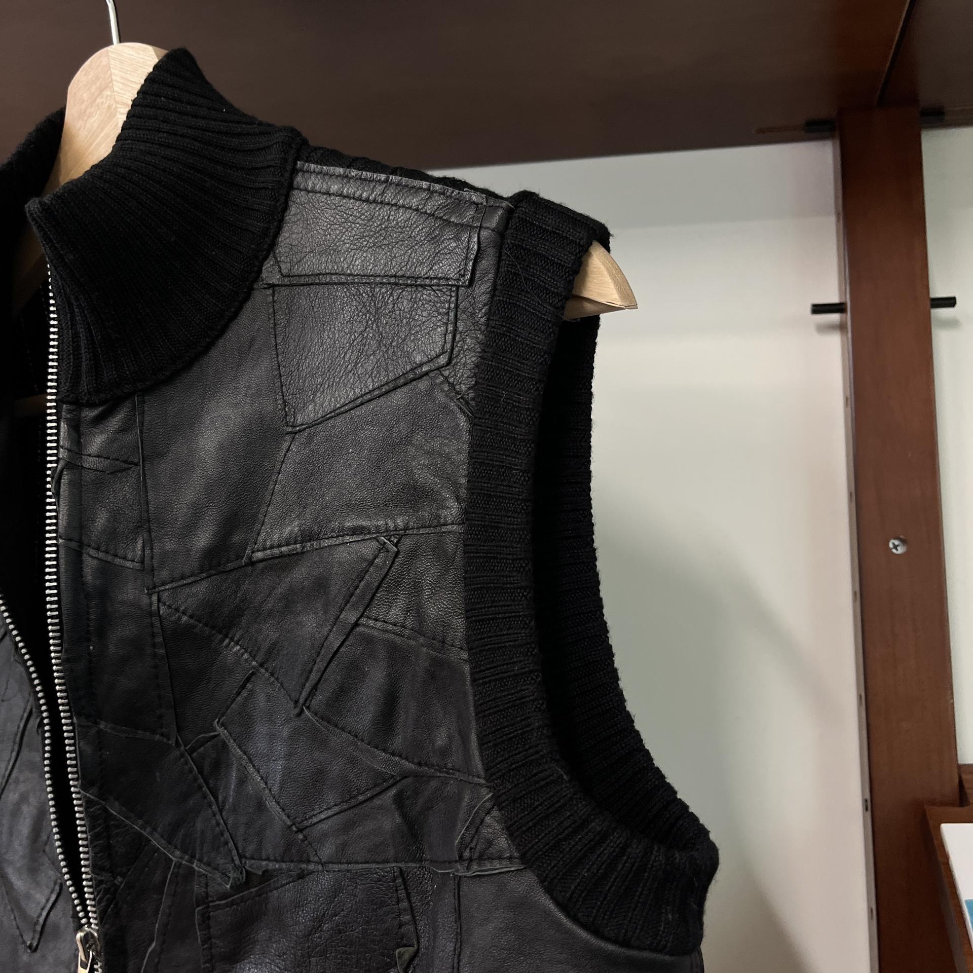 가죽 조각들을 덧붙인 패턴이 돋보이는 베스트 아이템입니다.
