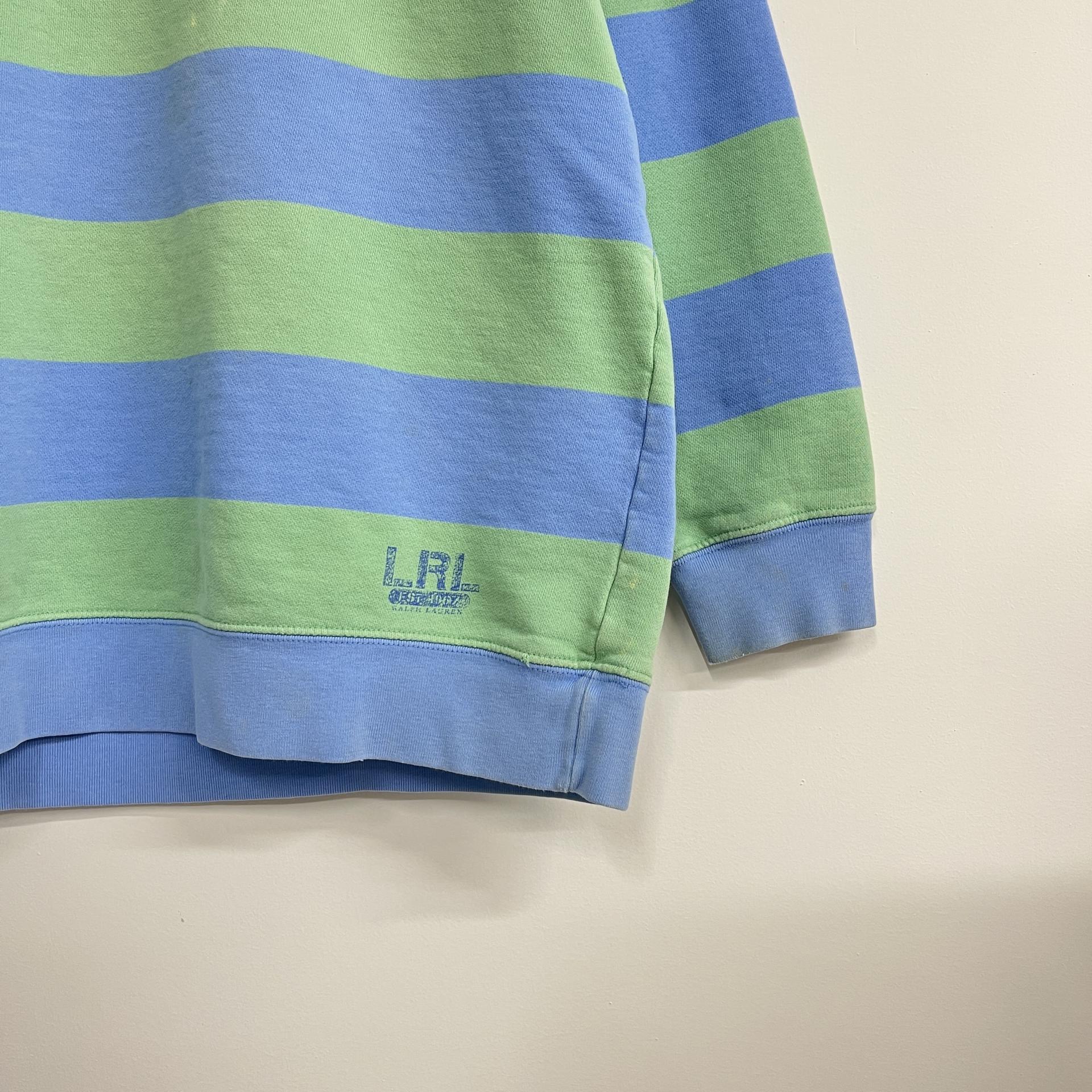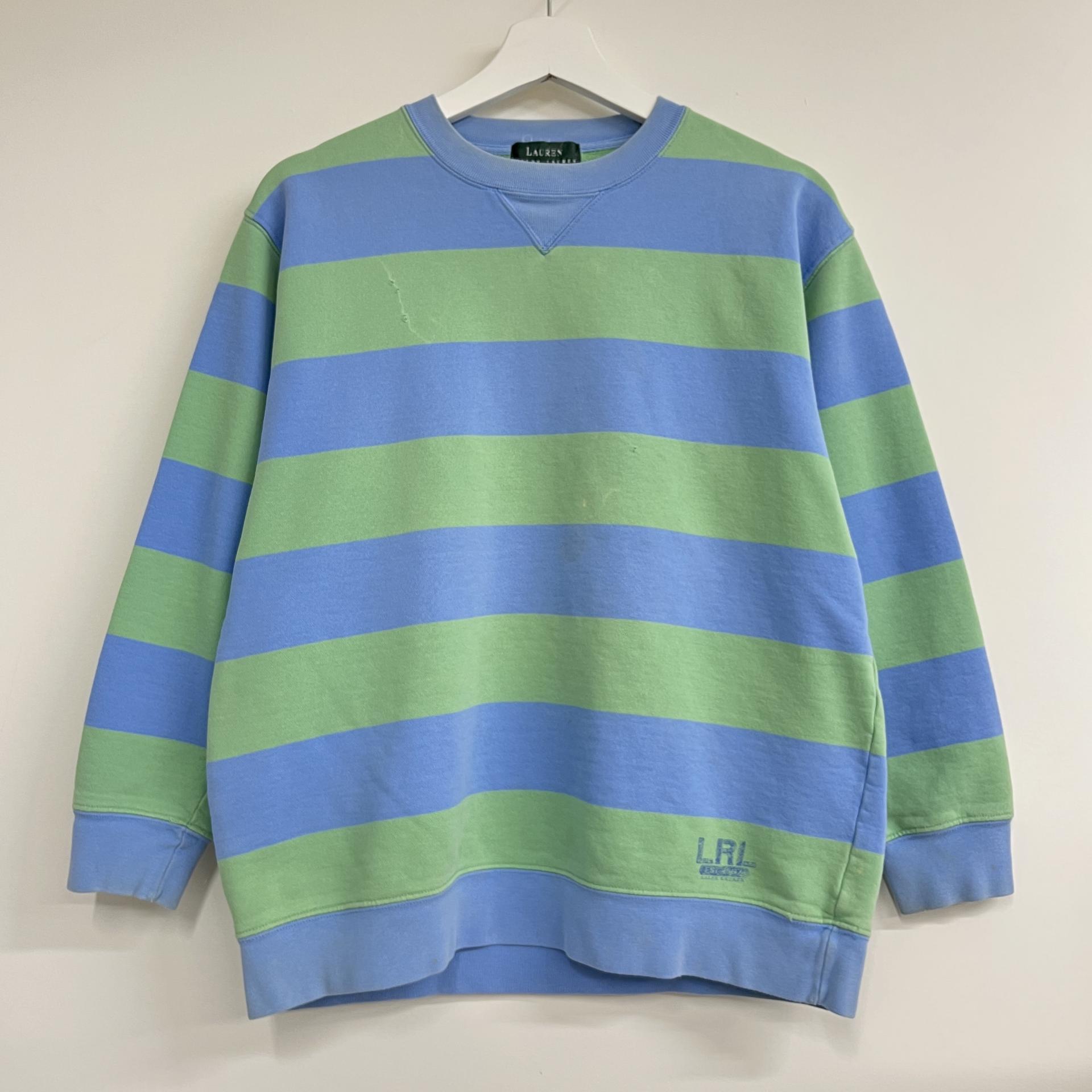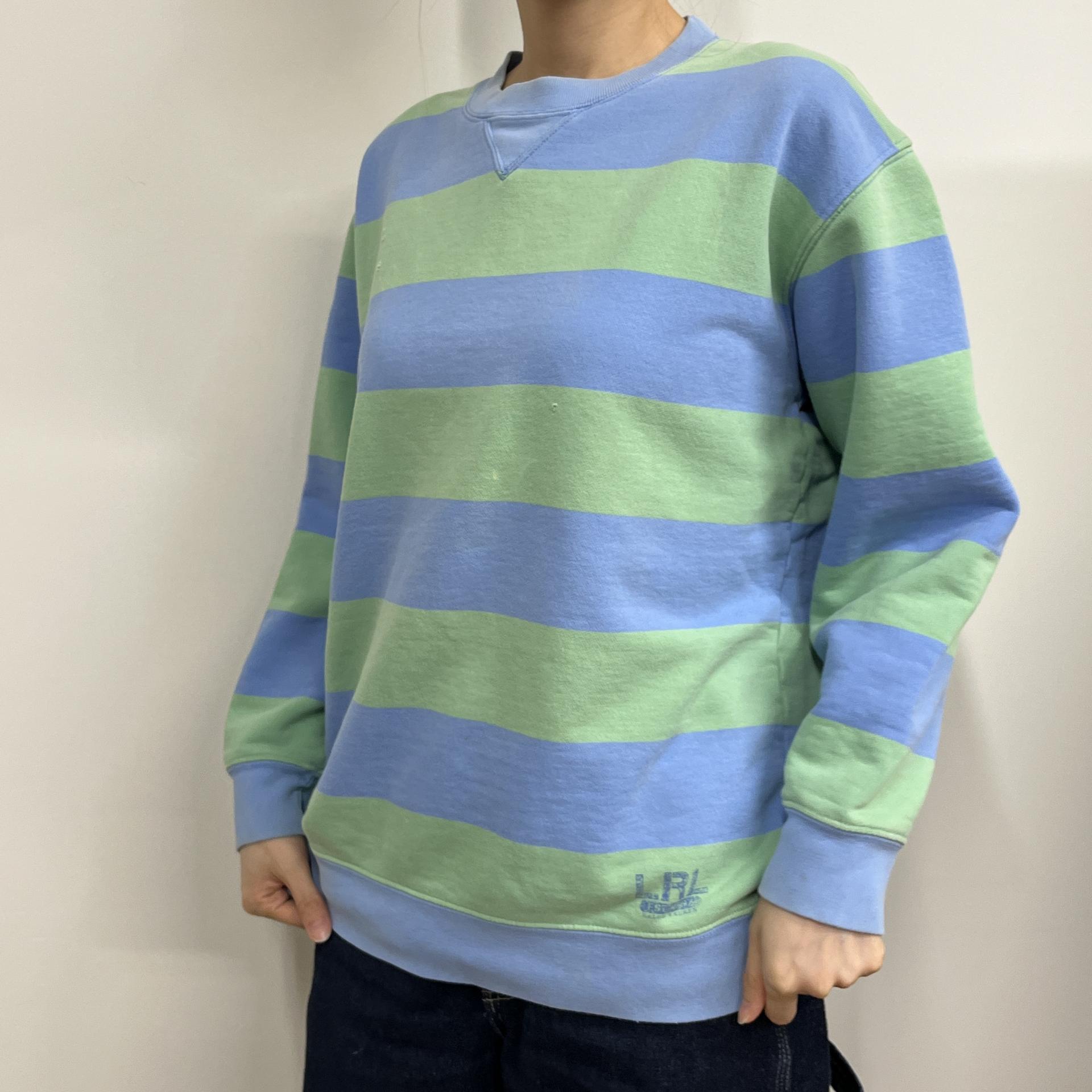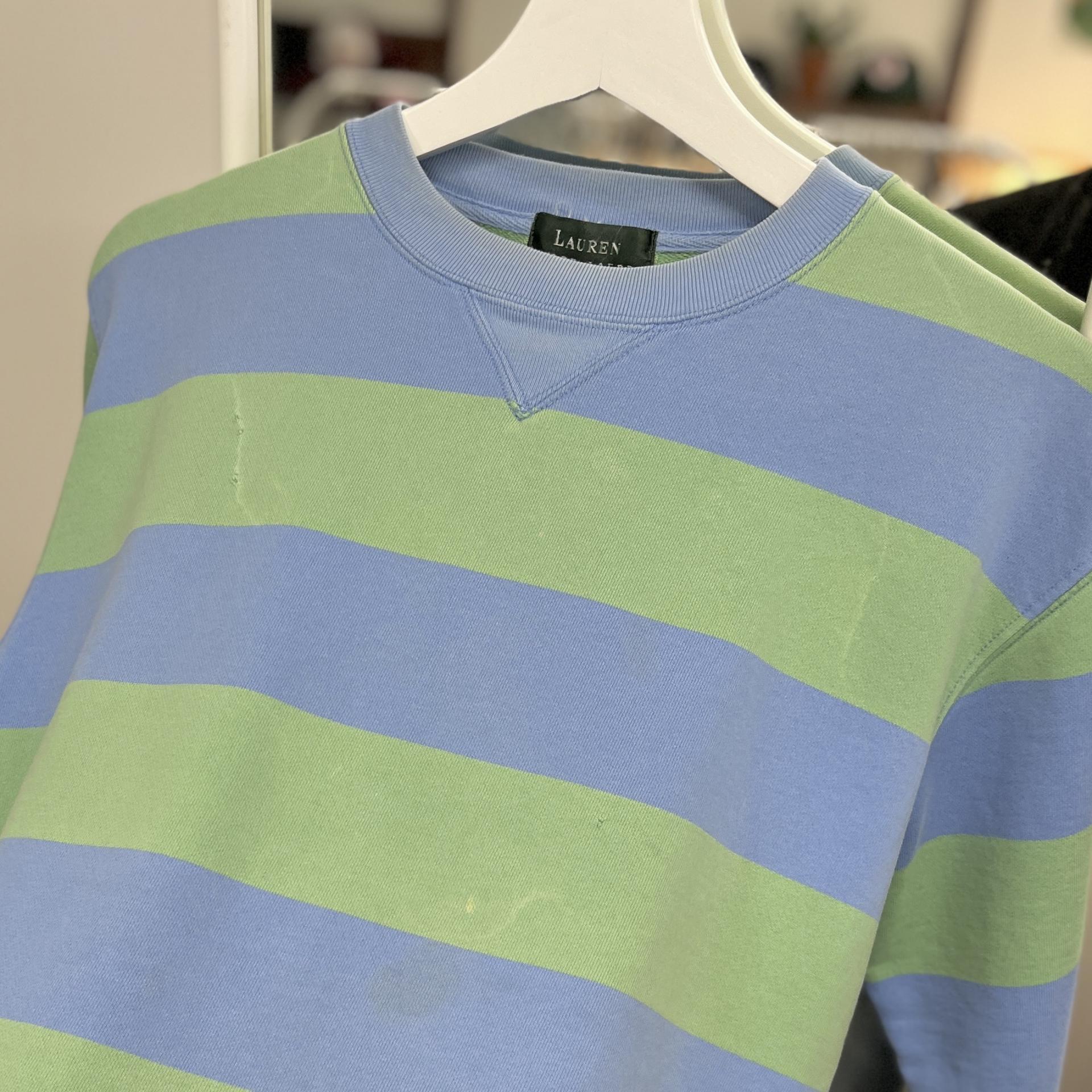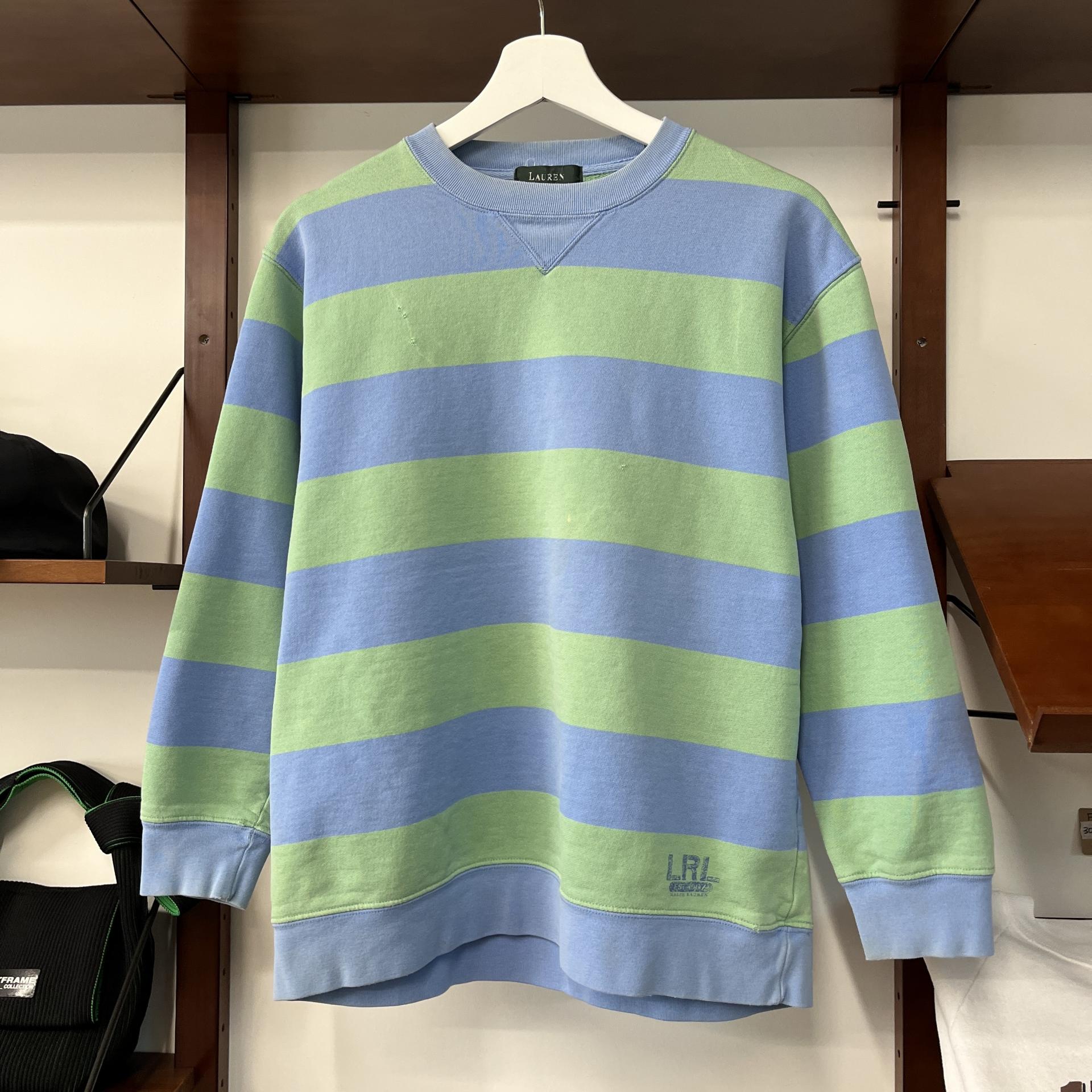 러프한 컨디션 속 귀여운 바디 컬러와 스트라이프 패턴을 갖춘 폴로 랄프로렌의 스웨트셔츠 제품입니다.