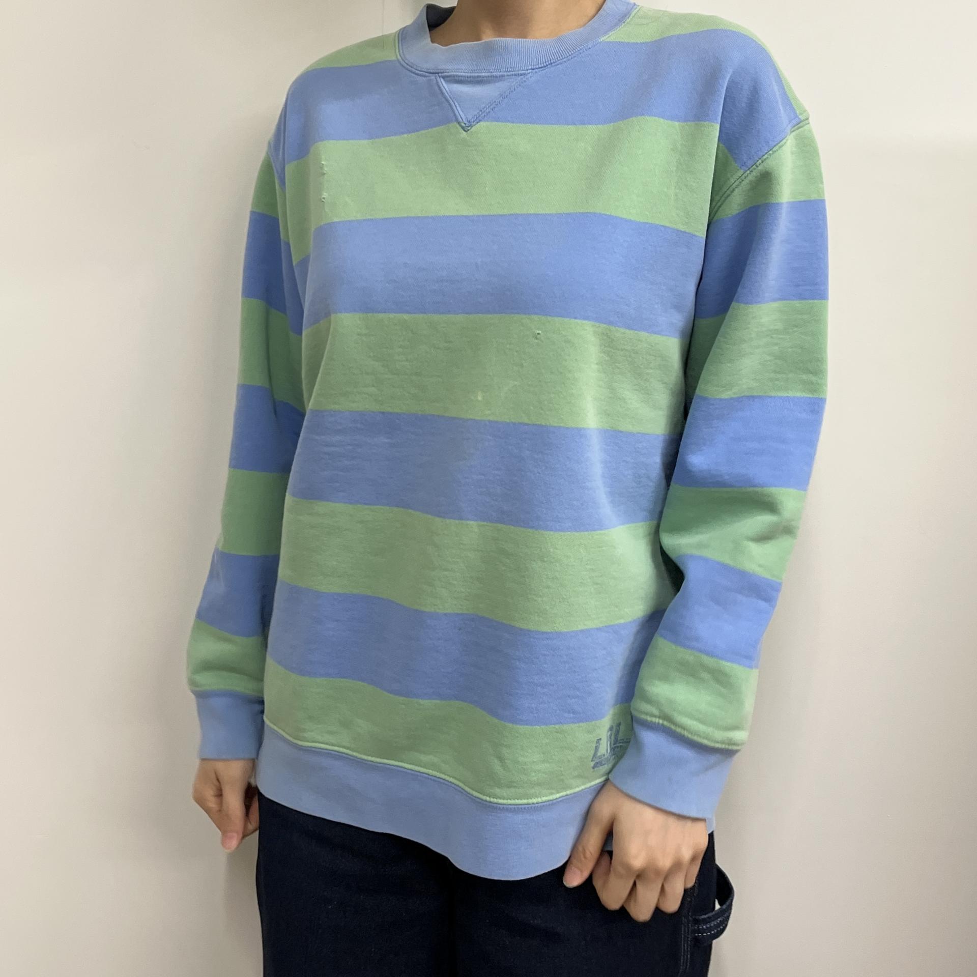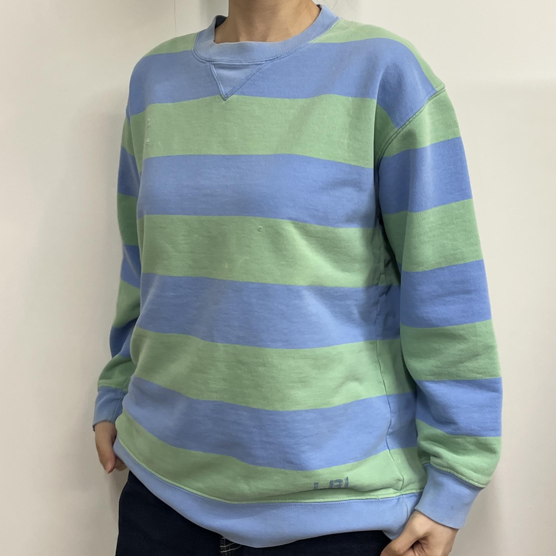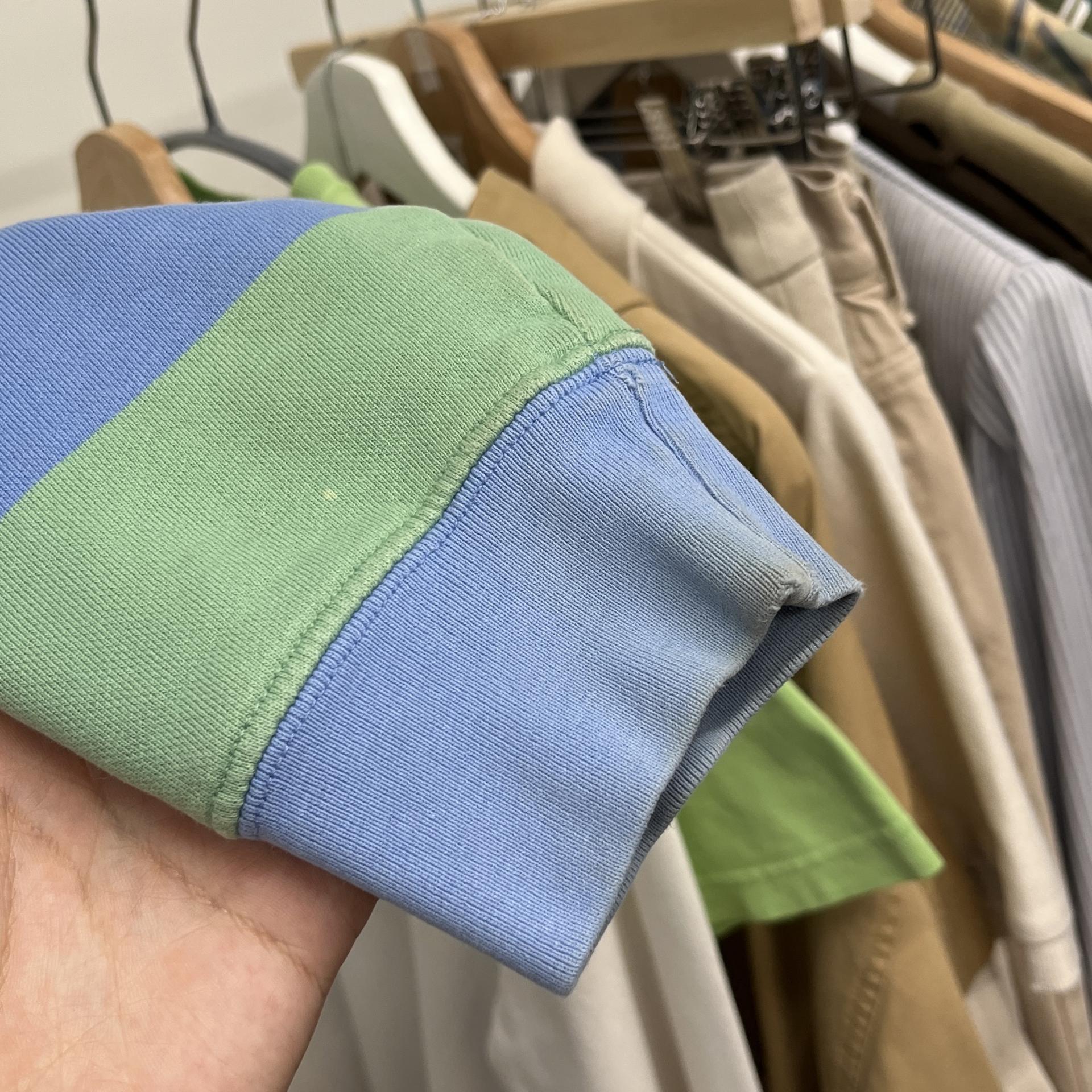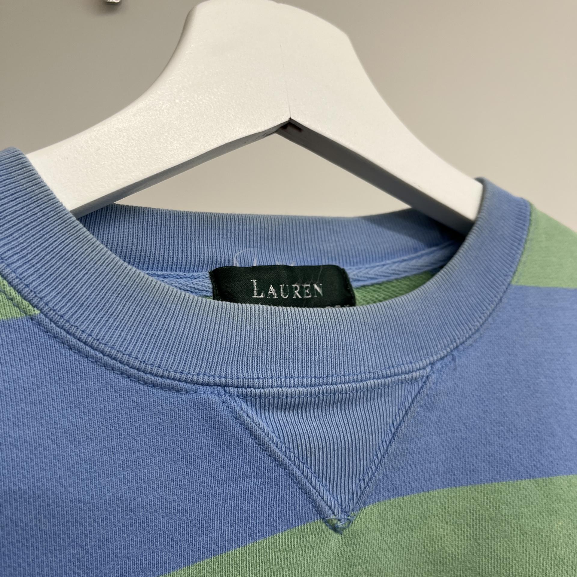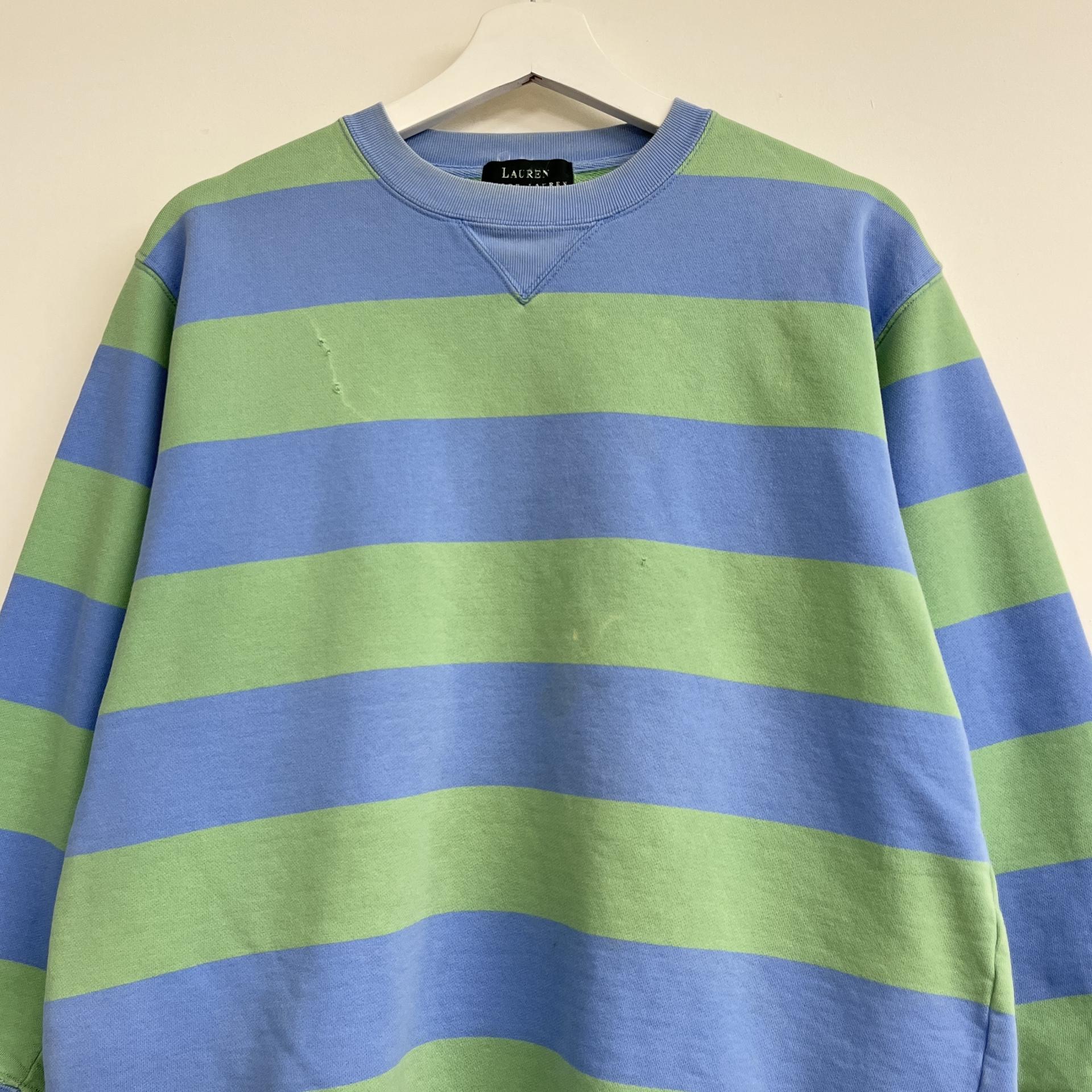 러프한 컨디션 속 귀여운 바디 컬러와 스트라이프 패턴을 갖춘 폴로 랄프로렌의 스웨트셔츠 제품입니다.