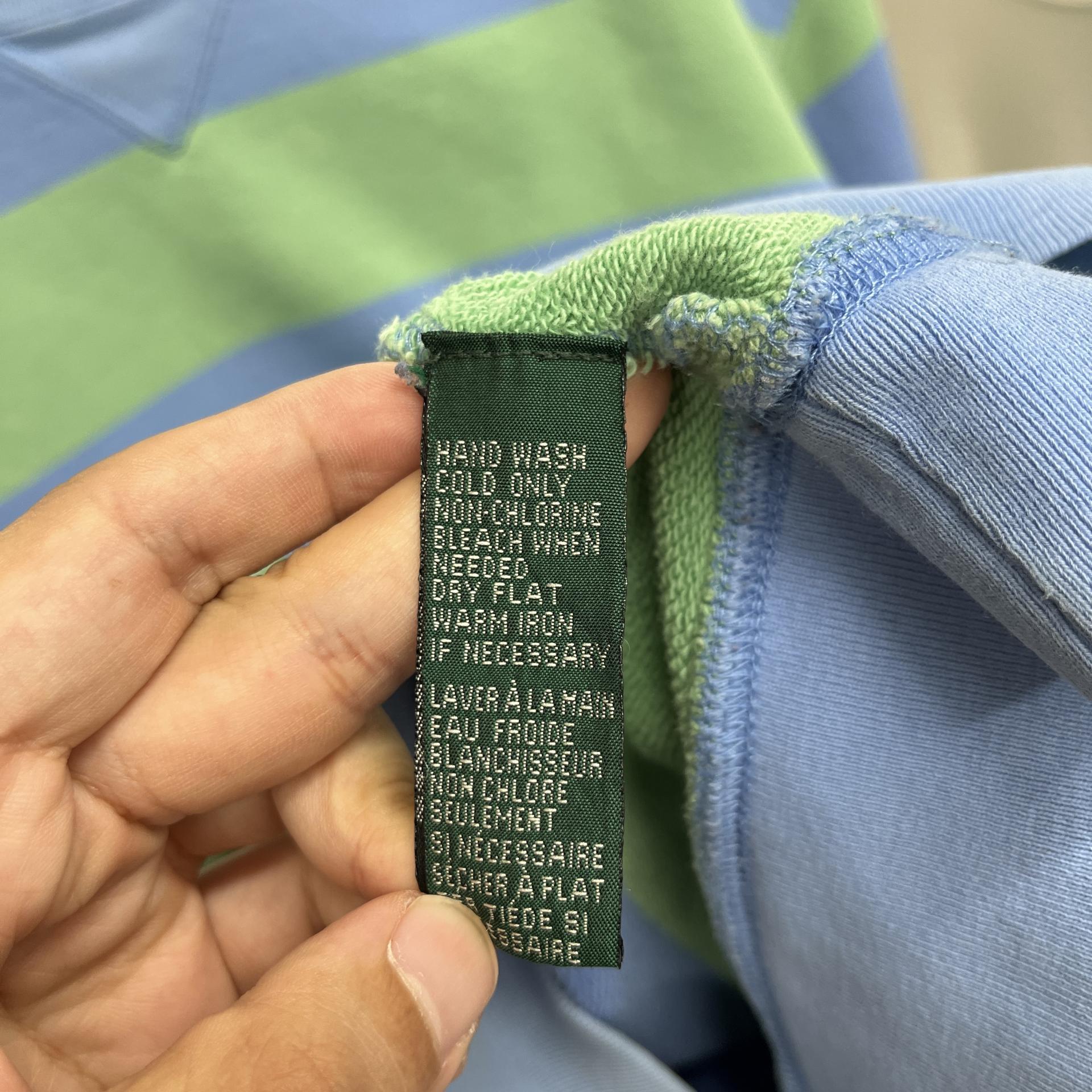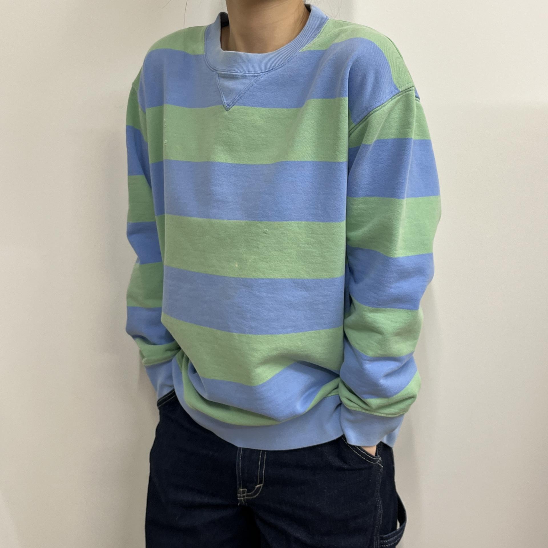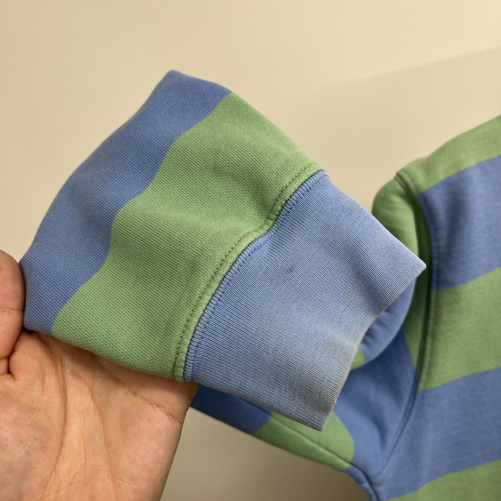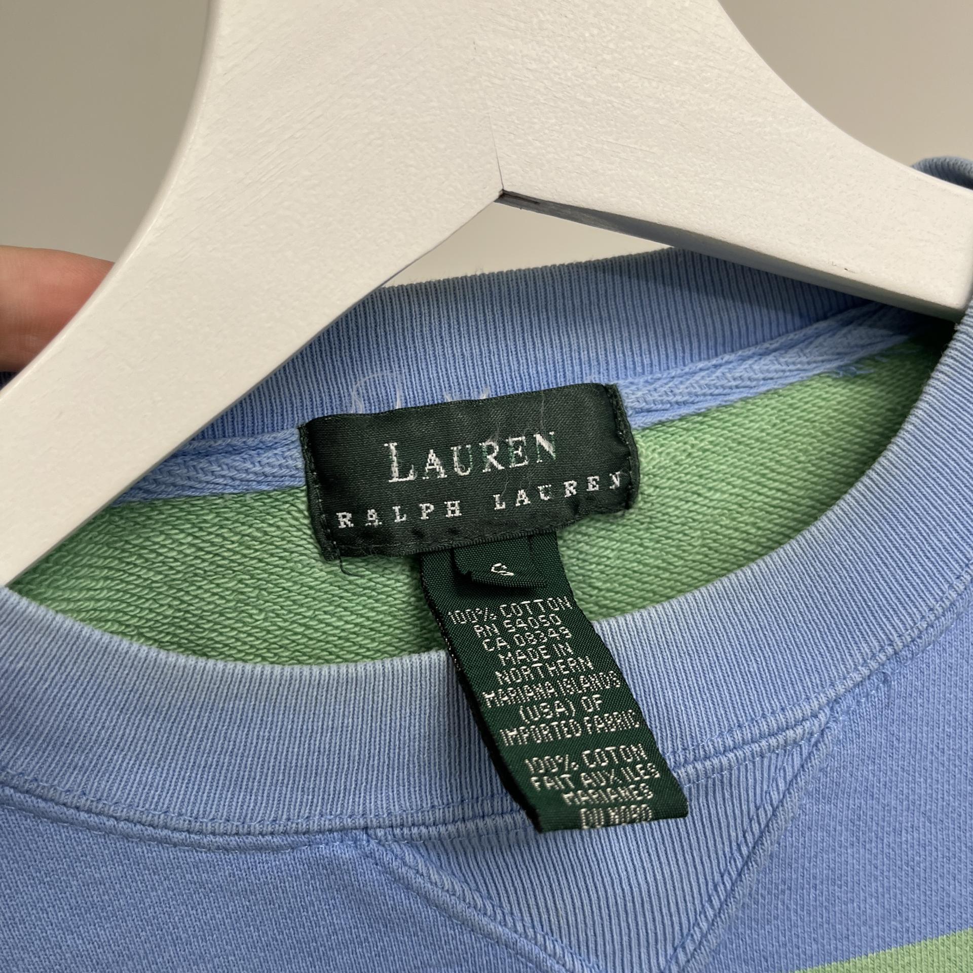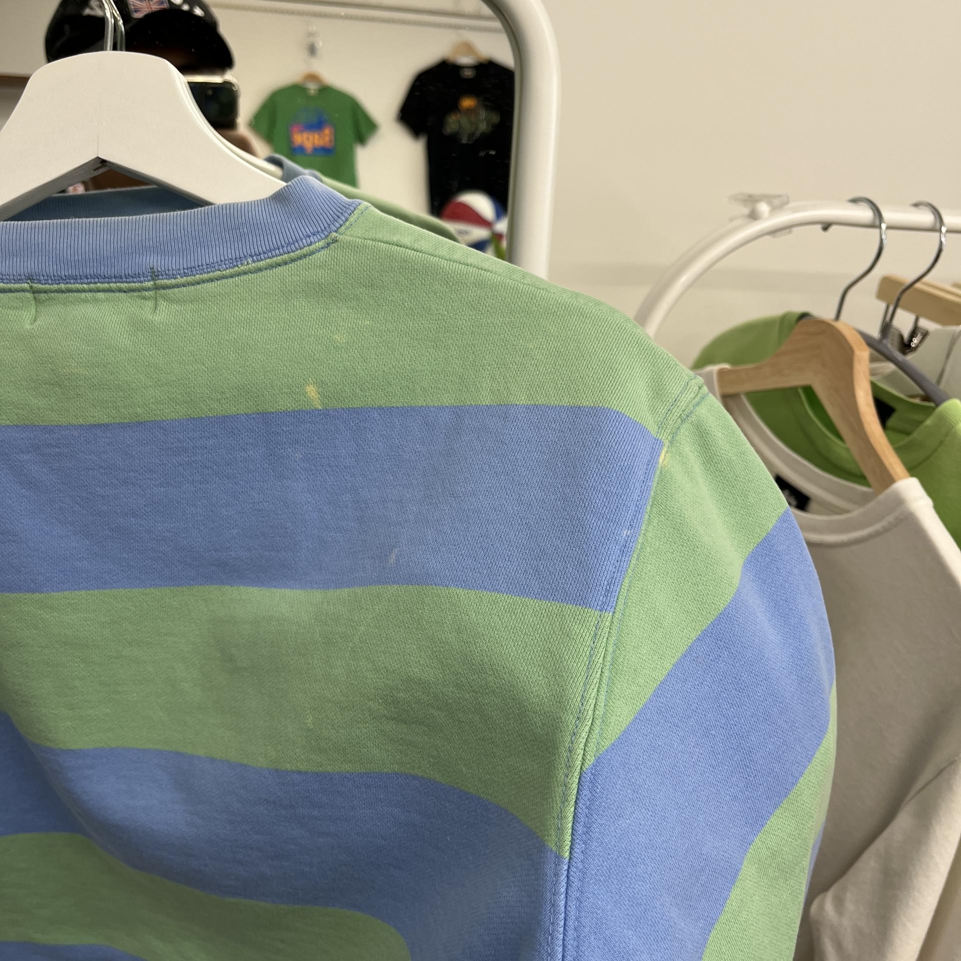 러프한 컨디션 속 귀여운 바디 컬러와 스트라이프 패턴을 갖춘 폴로 랄프로렌의 스웨트셔츠 제품입니다.