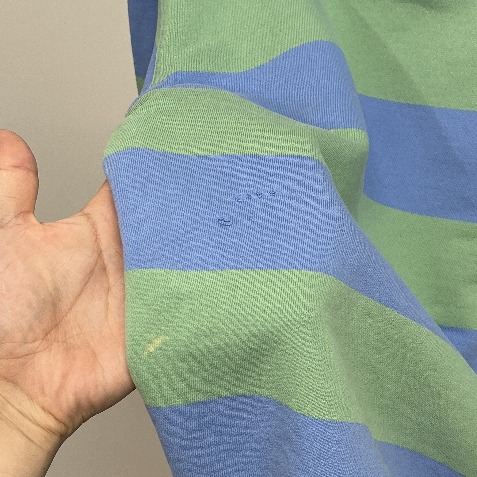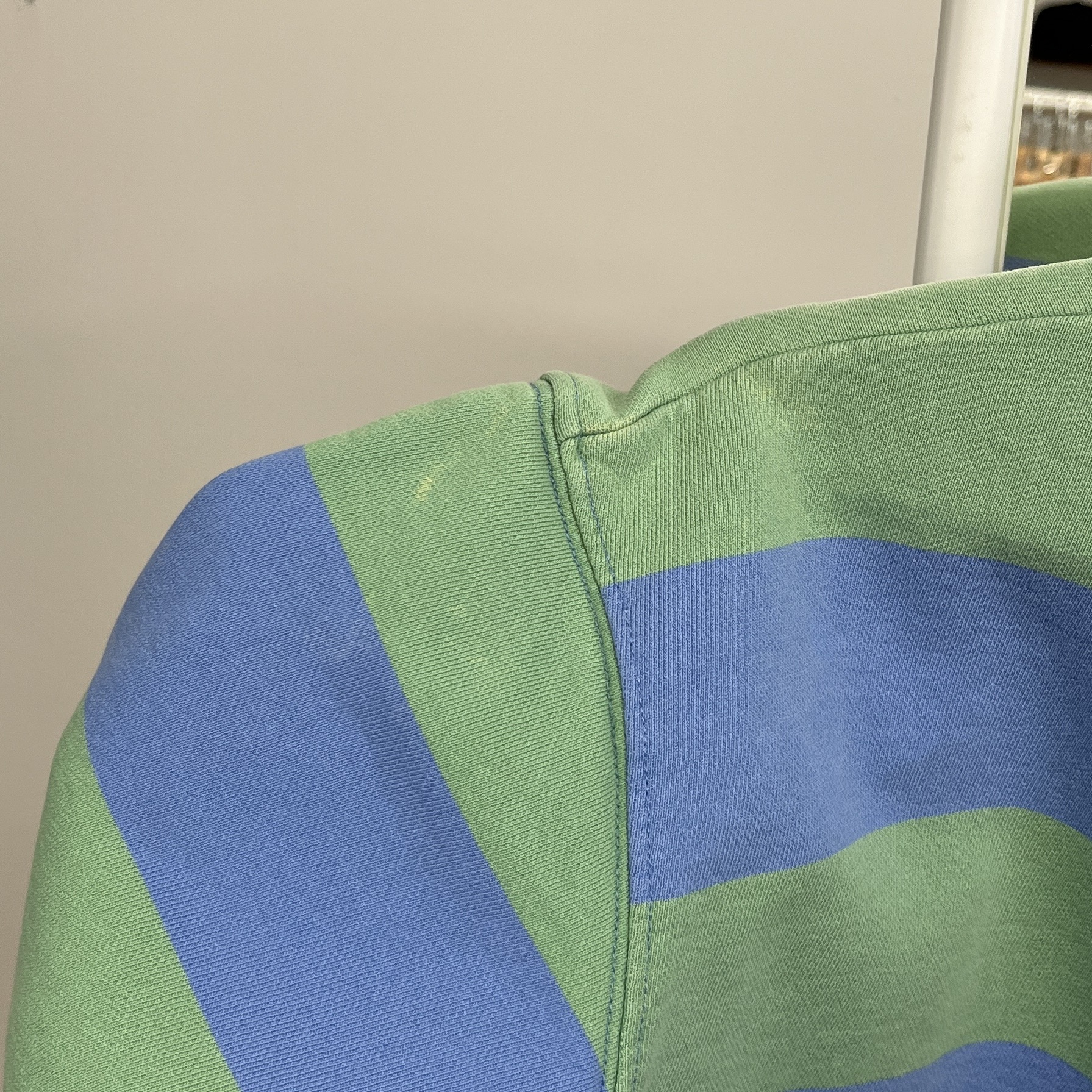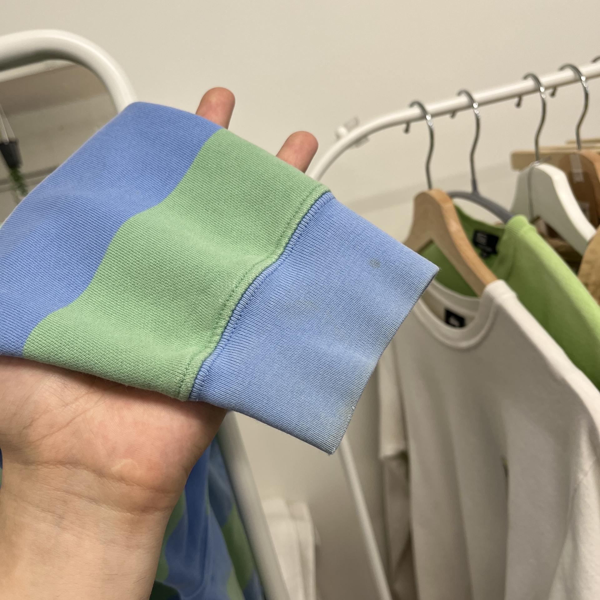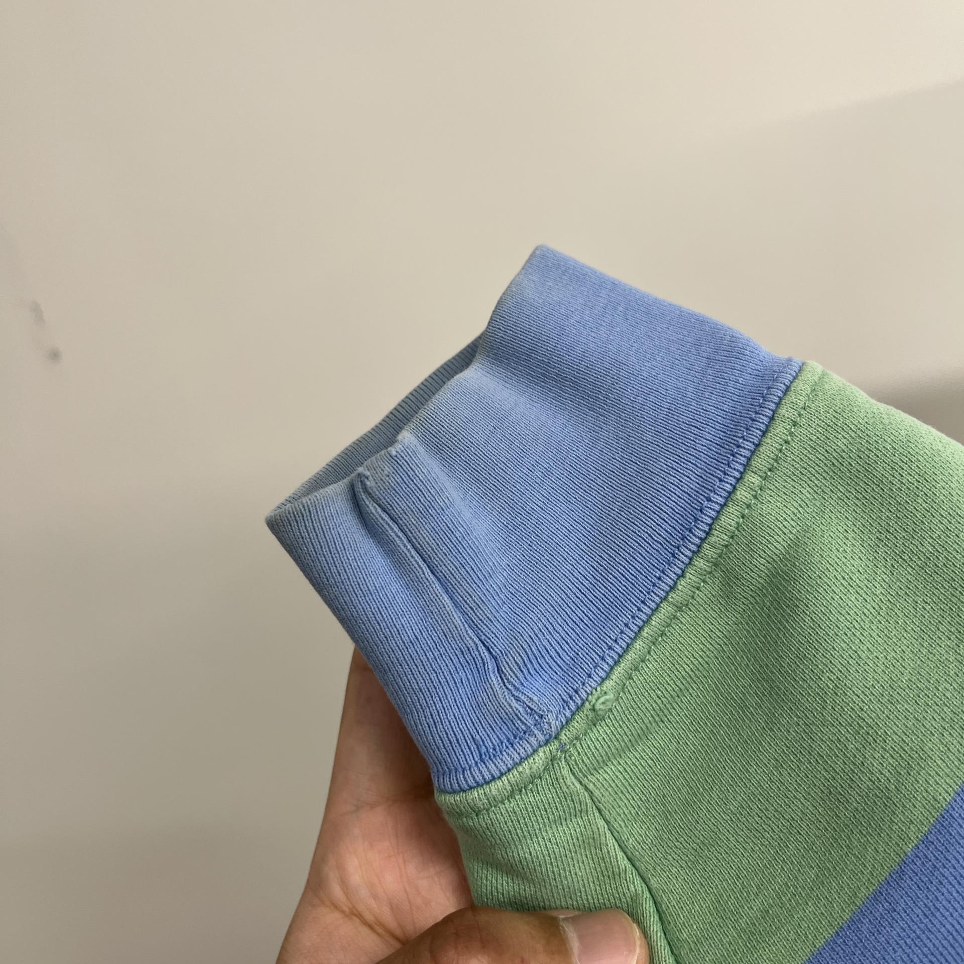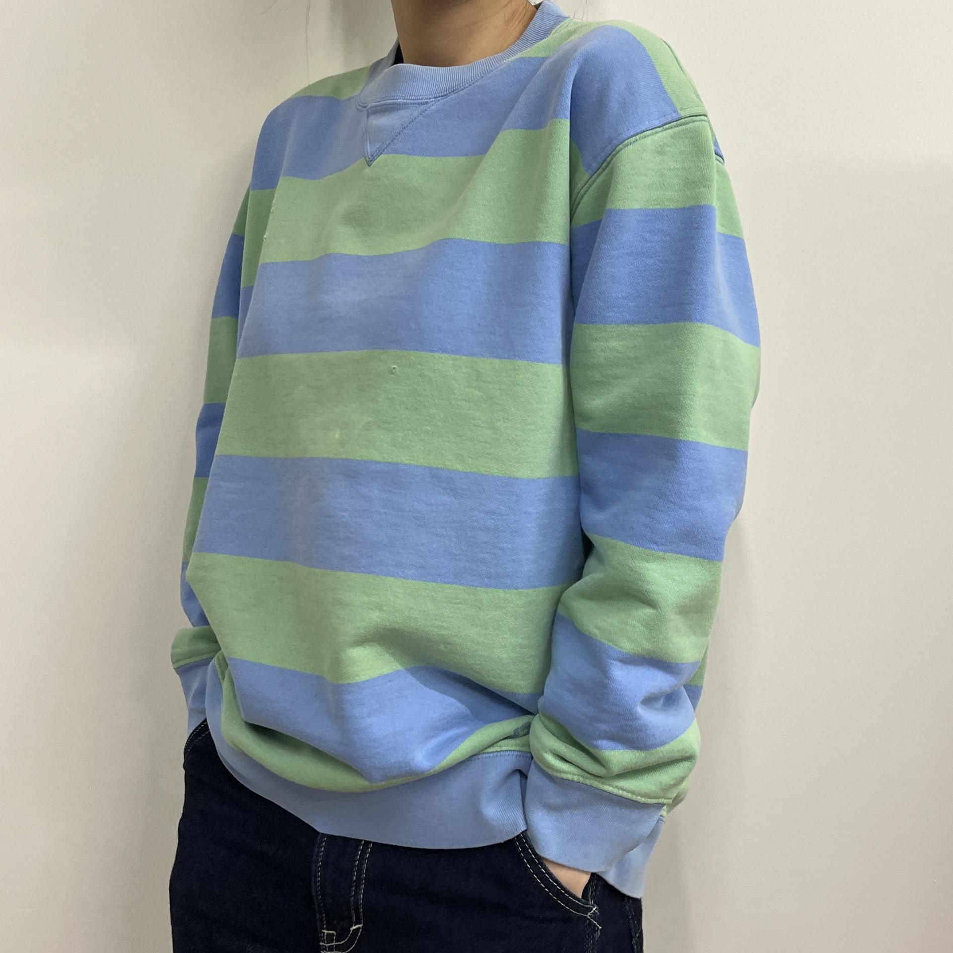 러프한 컨디션 속 귀여운 바디 컬러와 스트라이프 패턴을 갖춘 폴로 랄프로렌의 스웨트셔츠 제품입니다.