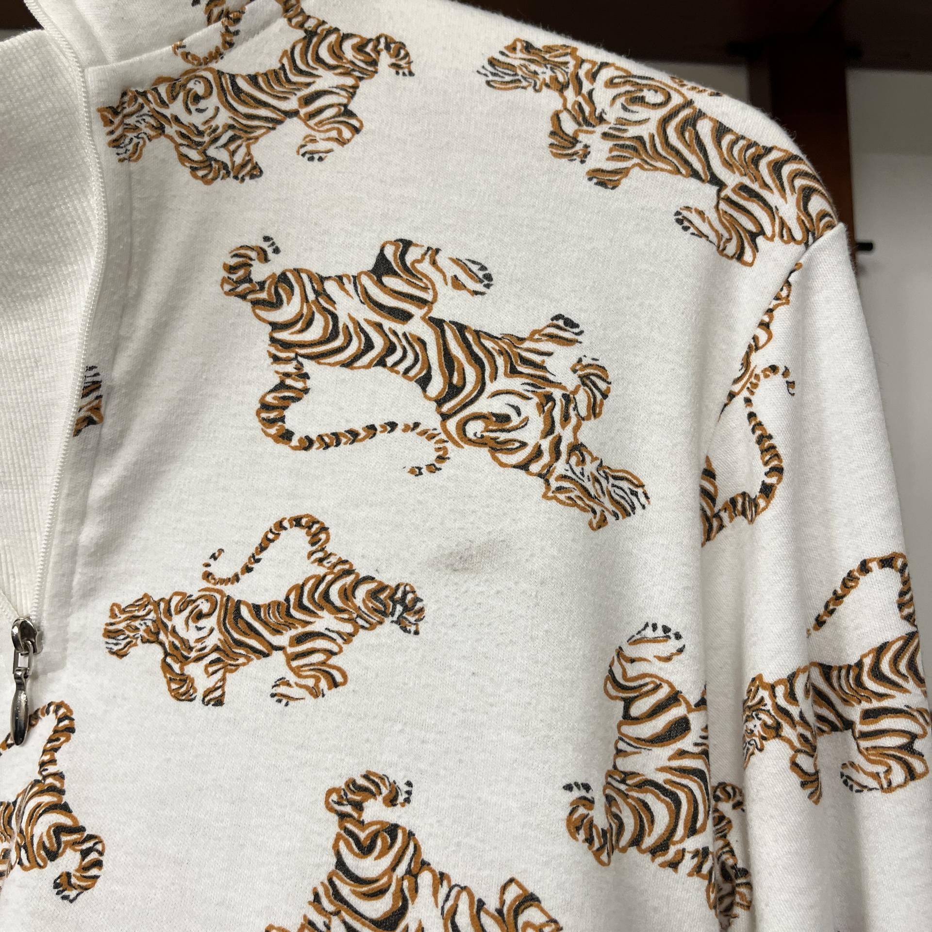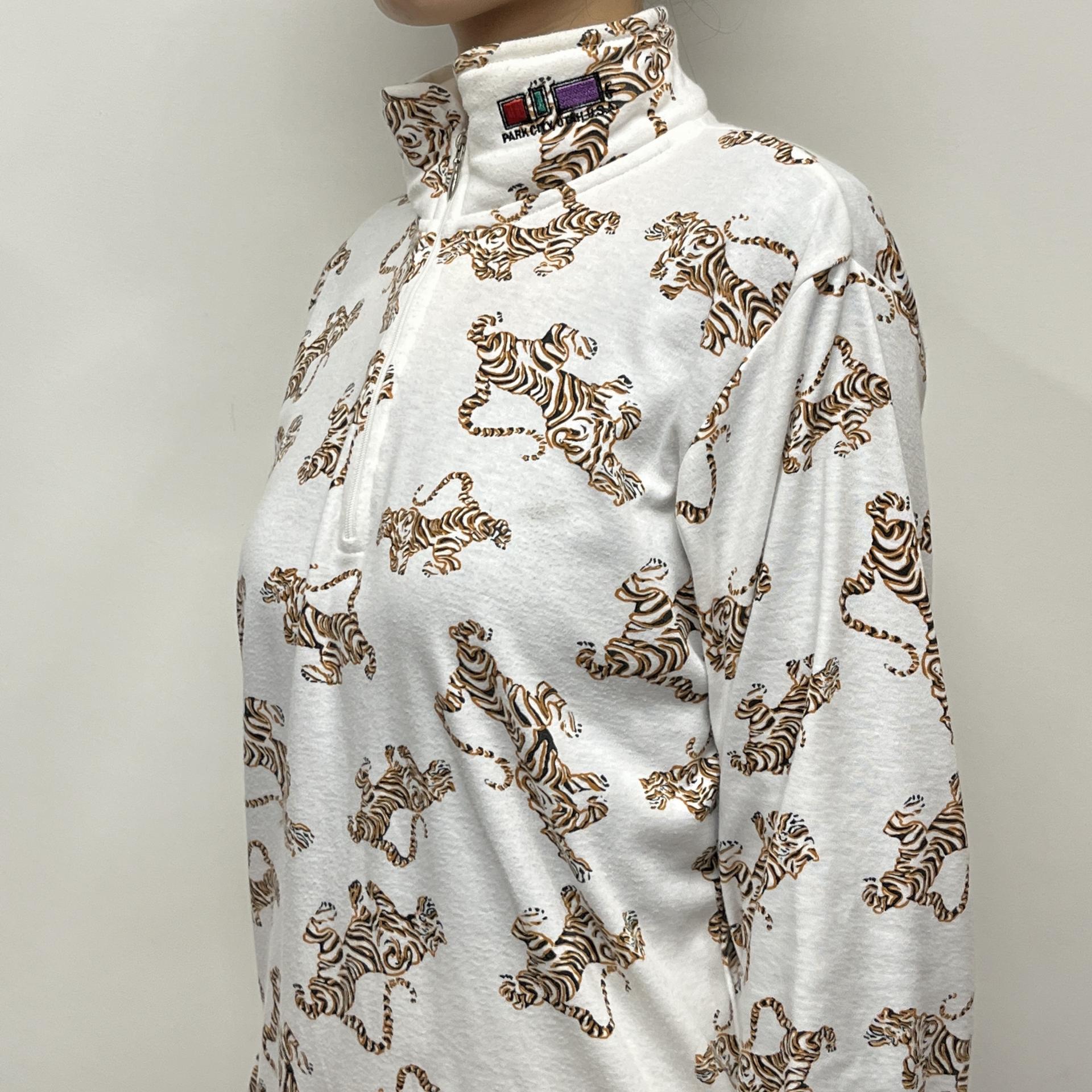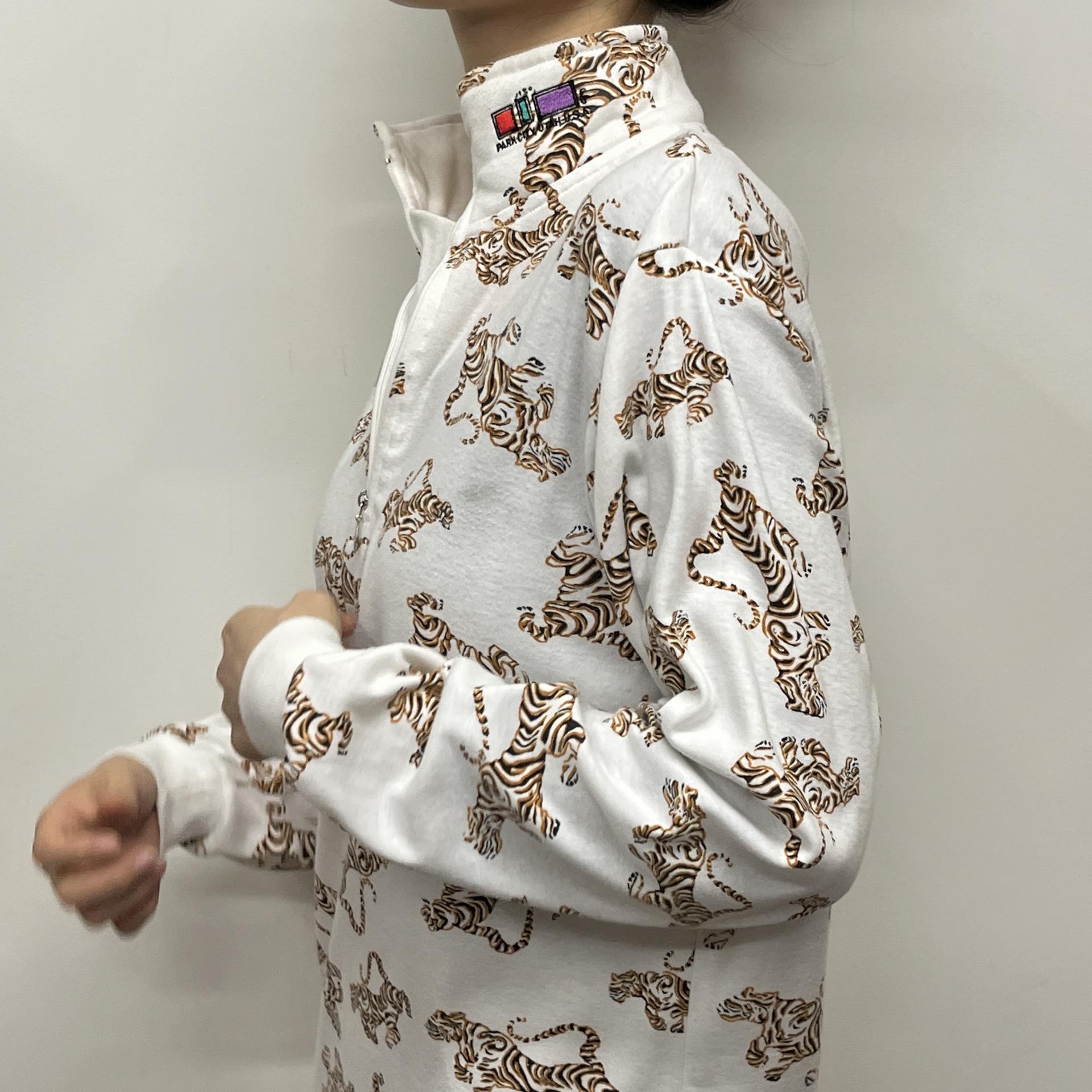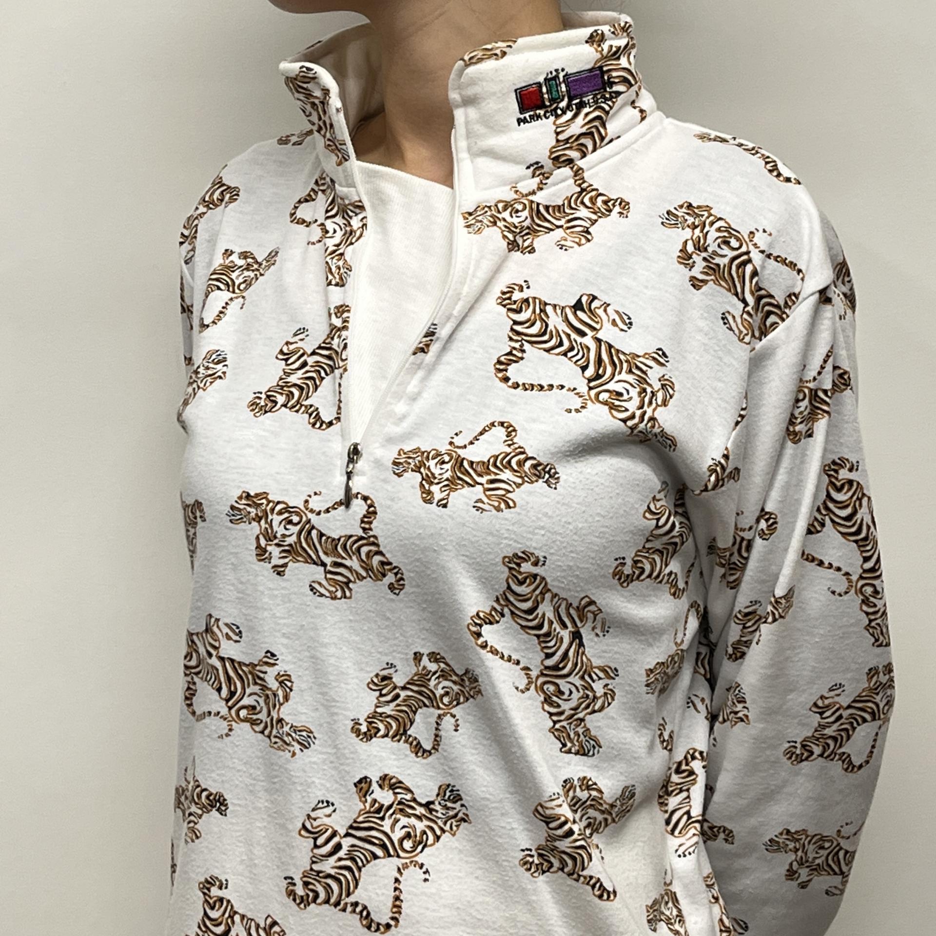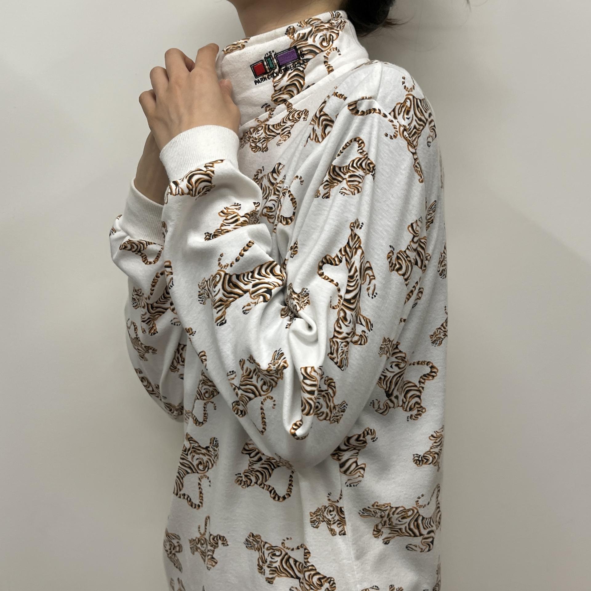 화이트 바디 위 타이거 패턴이 돋보이는 탑 아이템입니다.