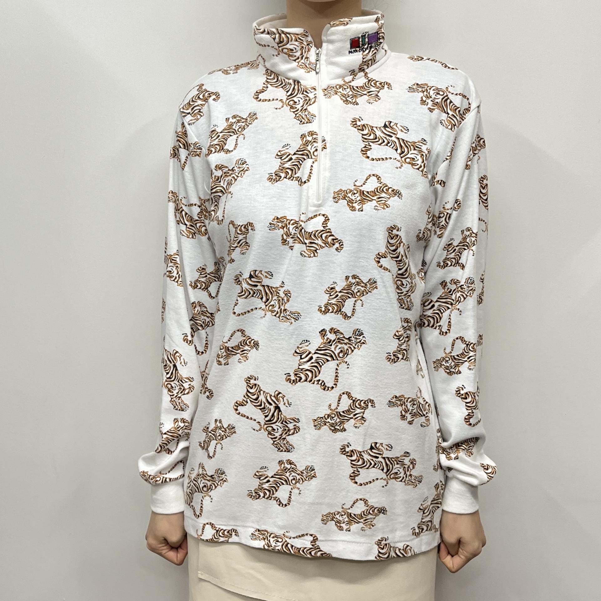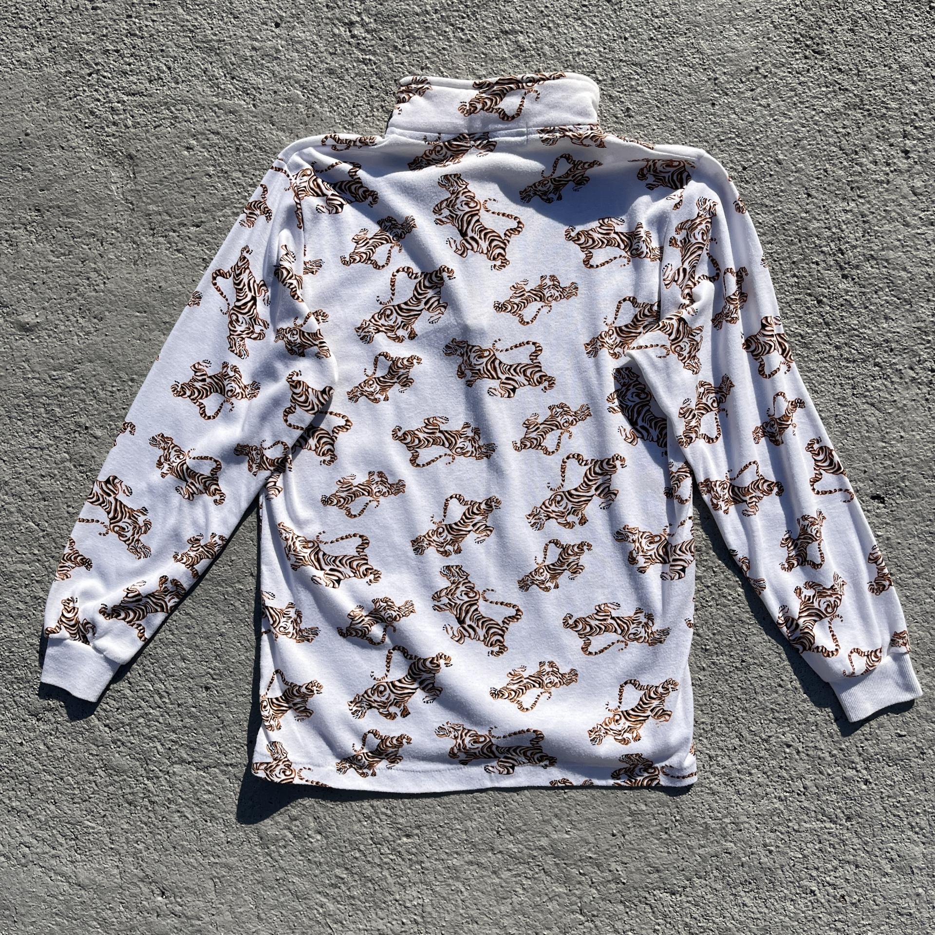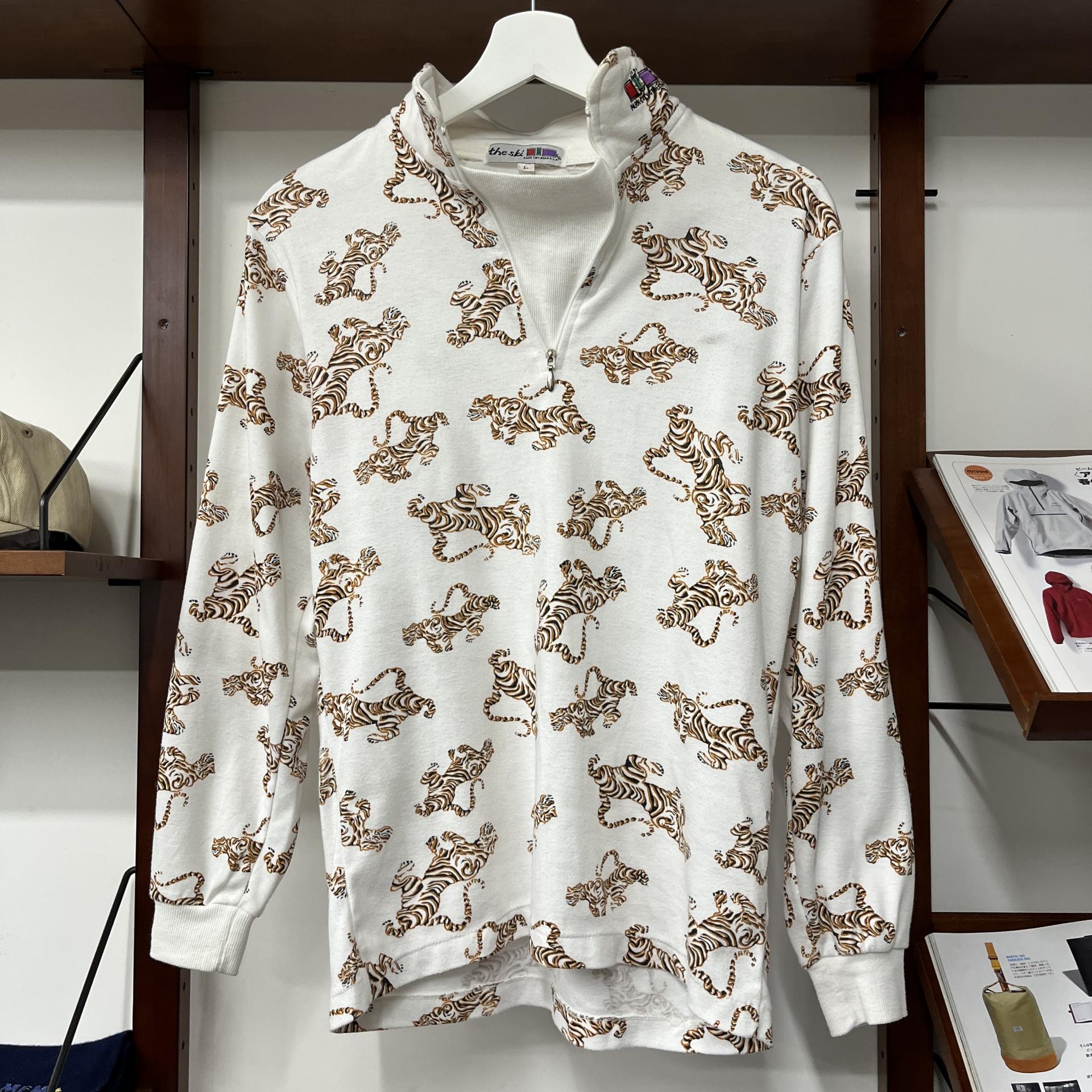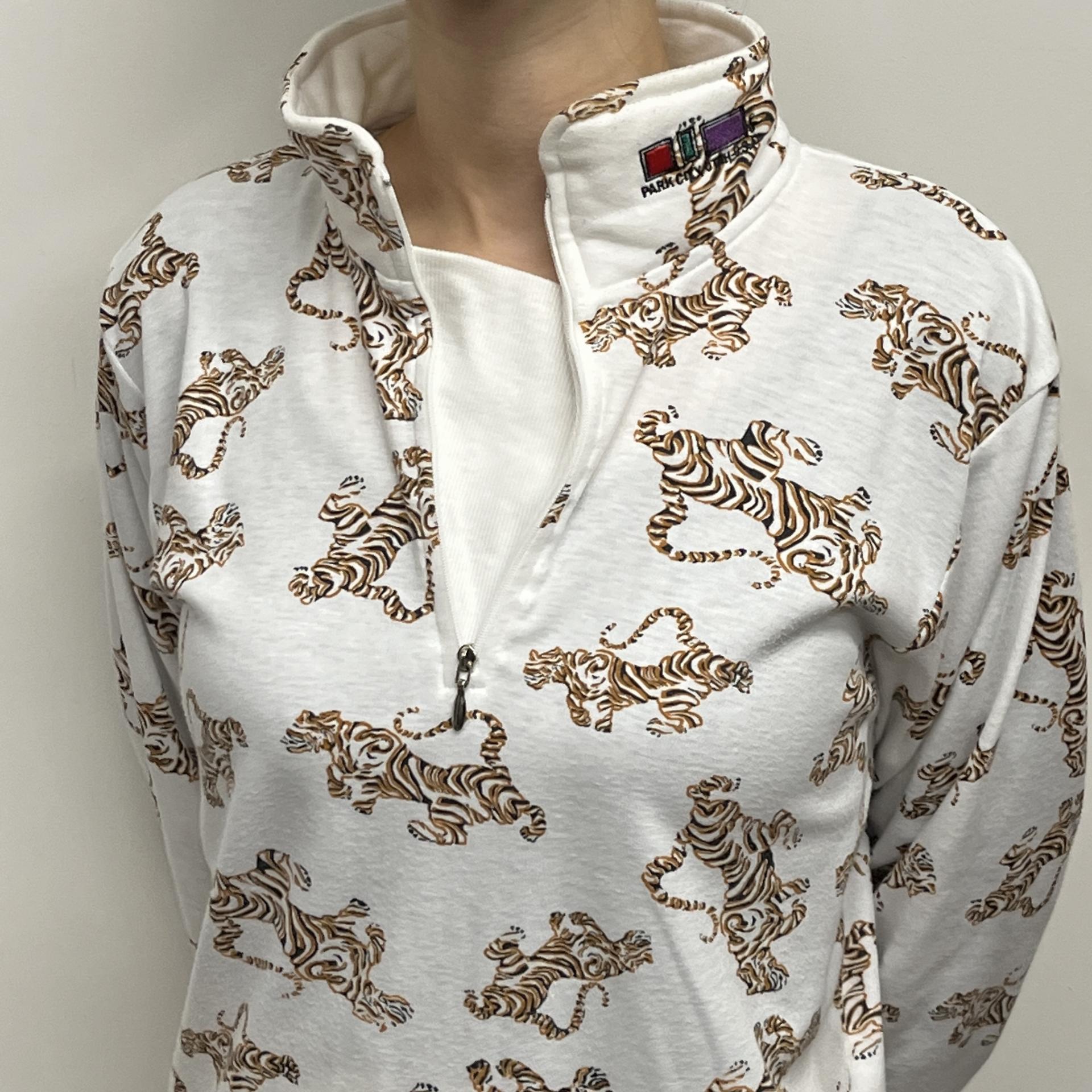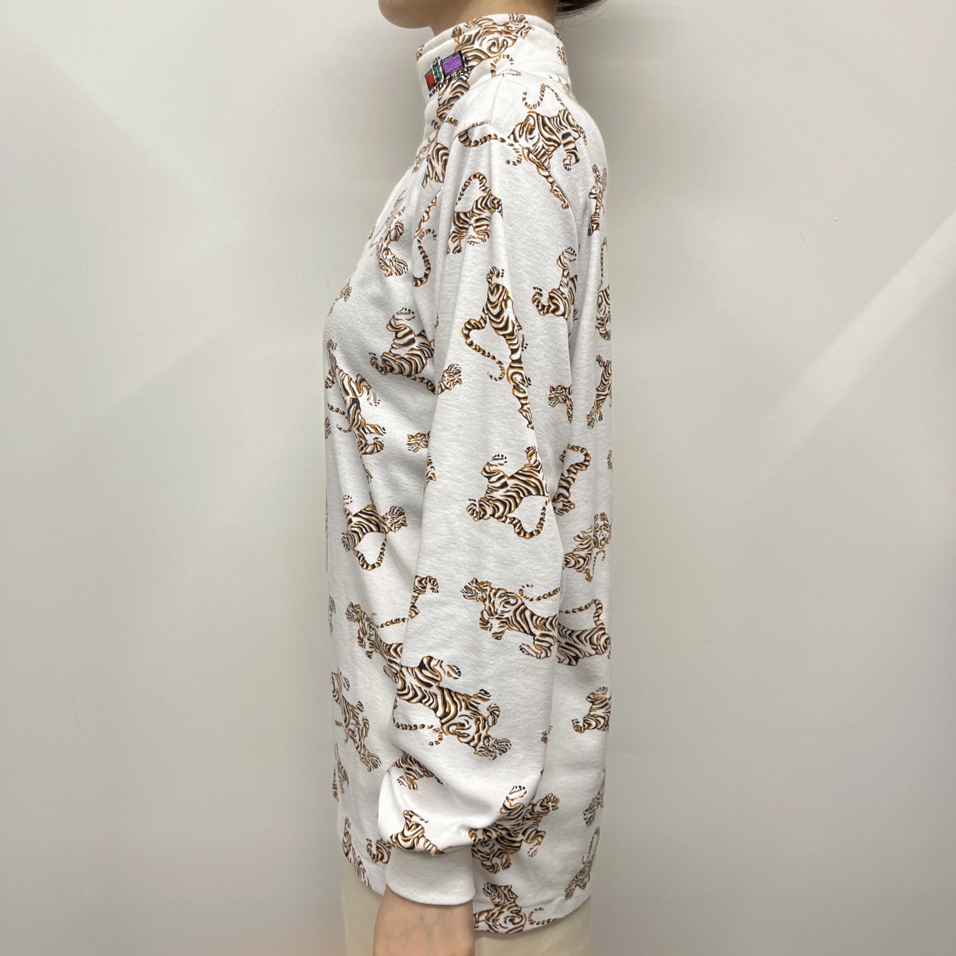 화이트 바디 위 타이거 패턴이 돋보이는 탑 아이템입니다.