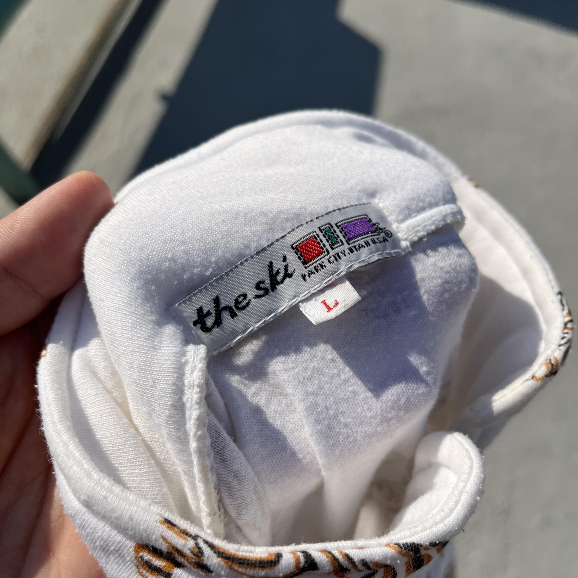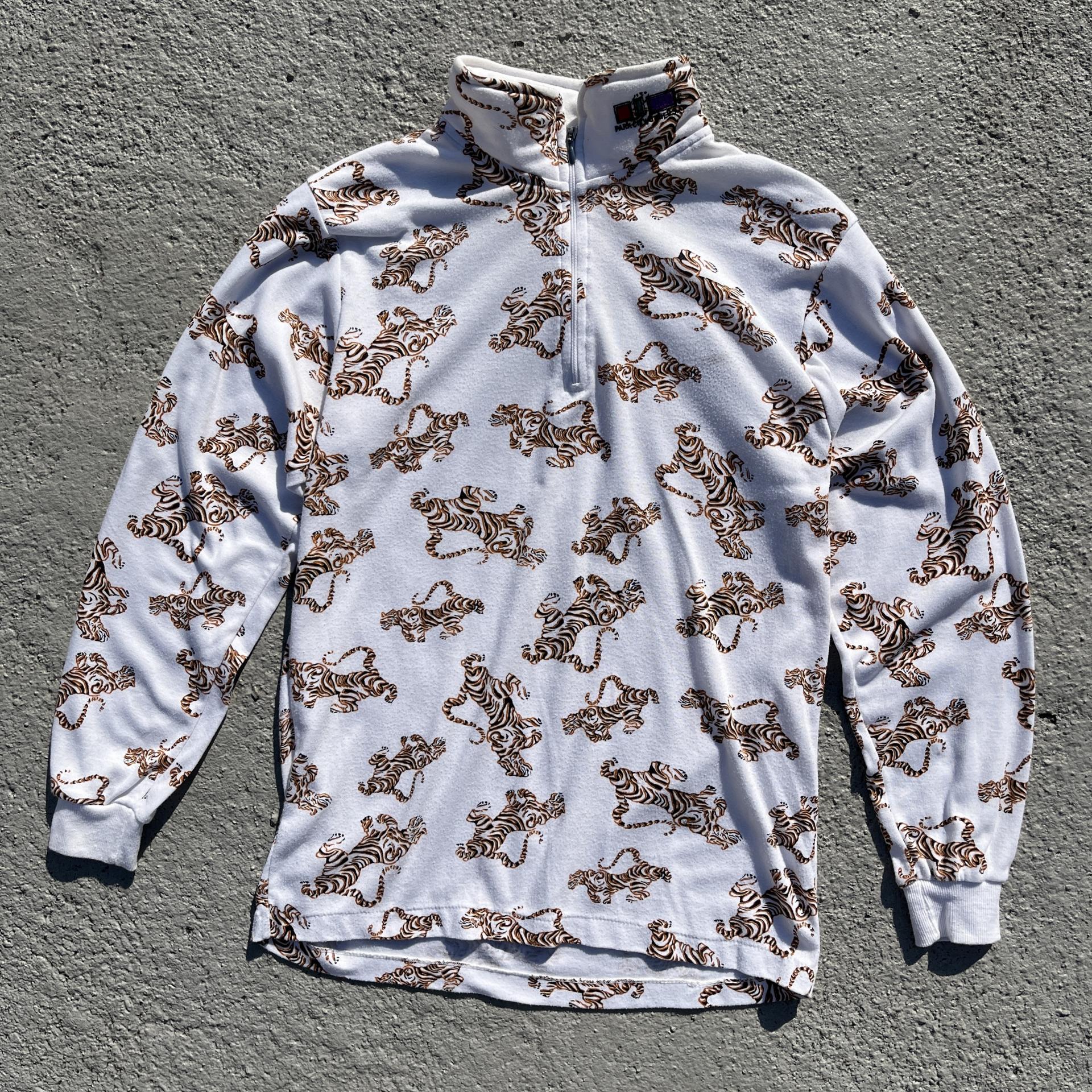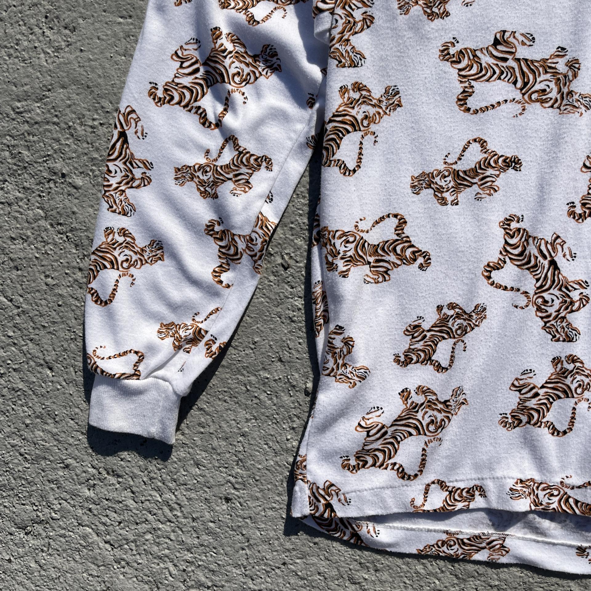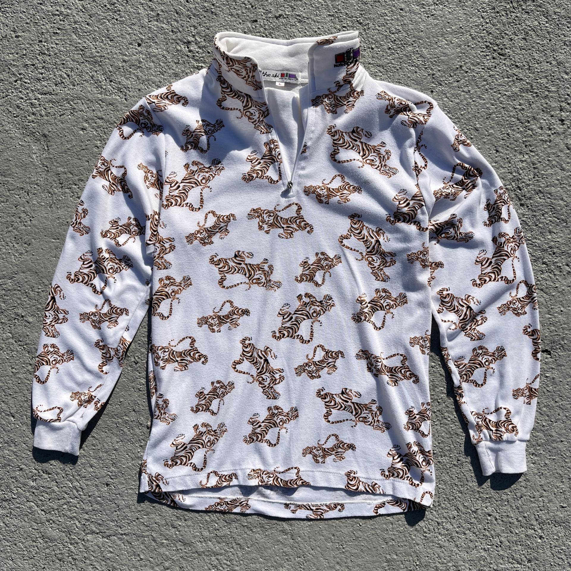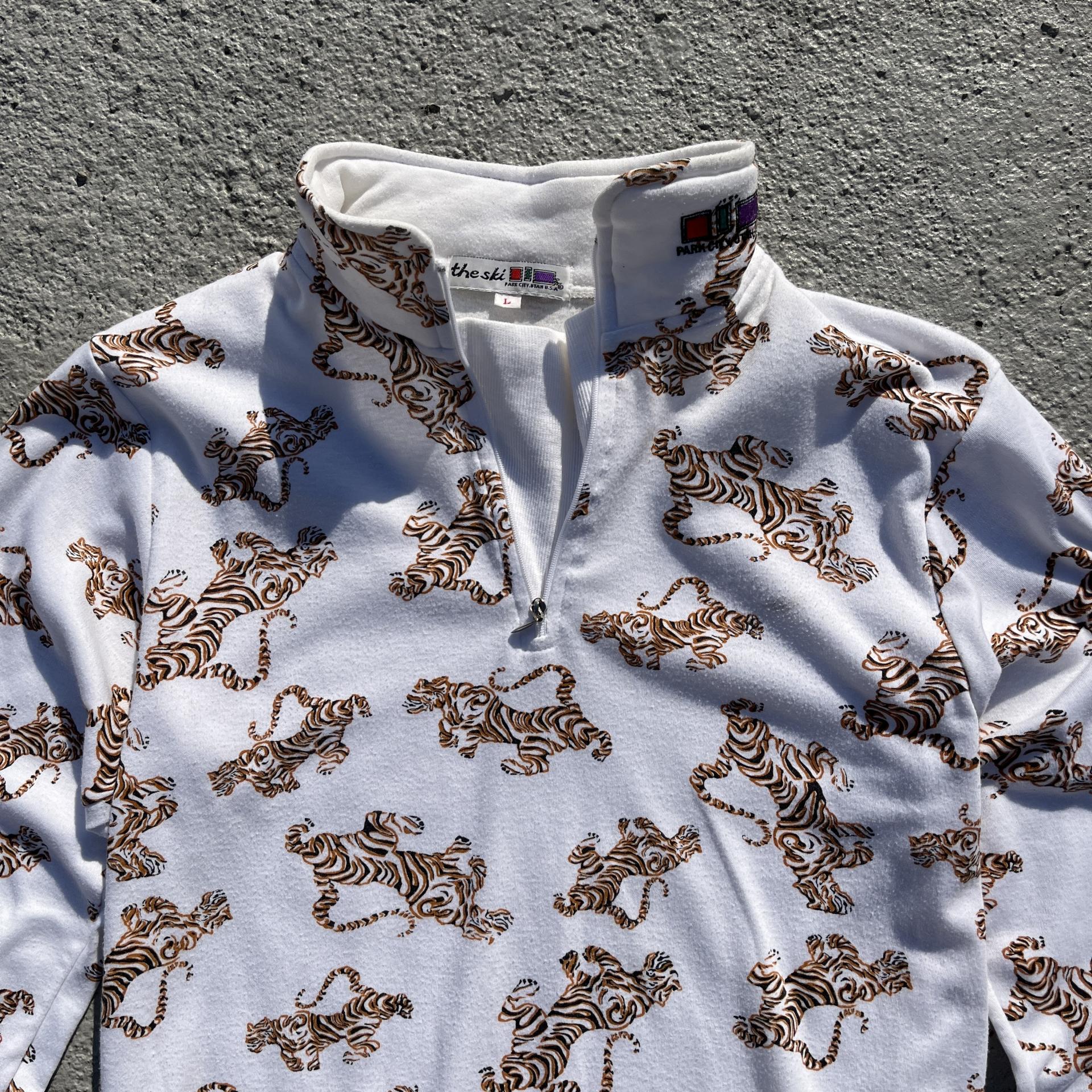 화이트 바디 위 타이거 패턴이 돋보이는 탑 아이템입니다.