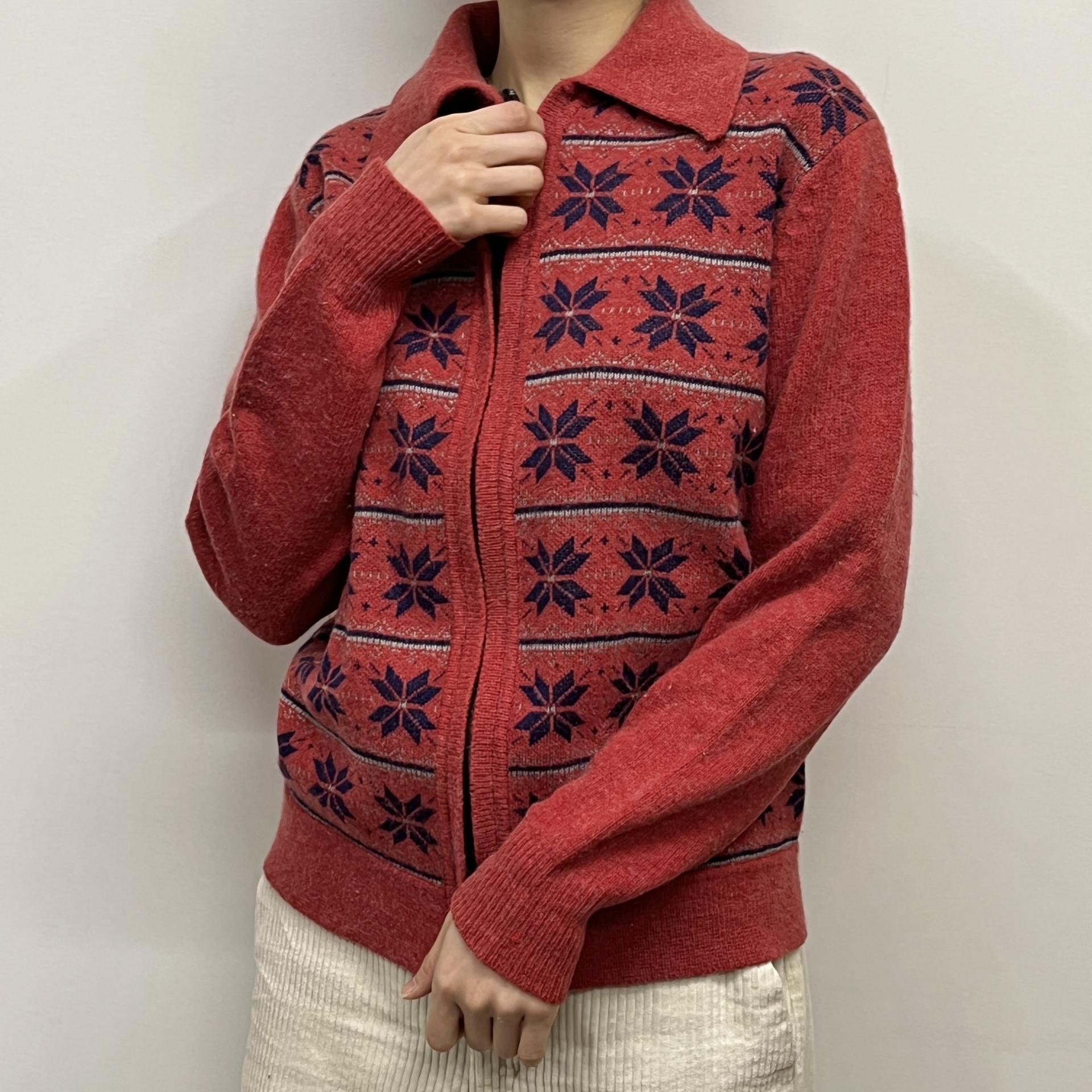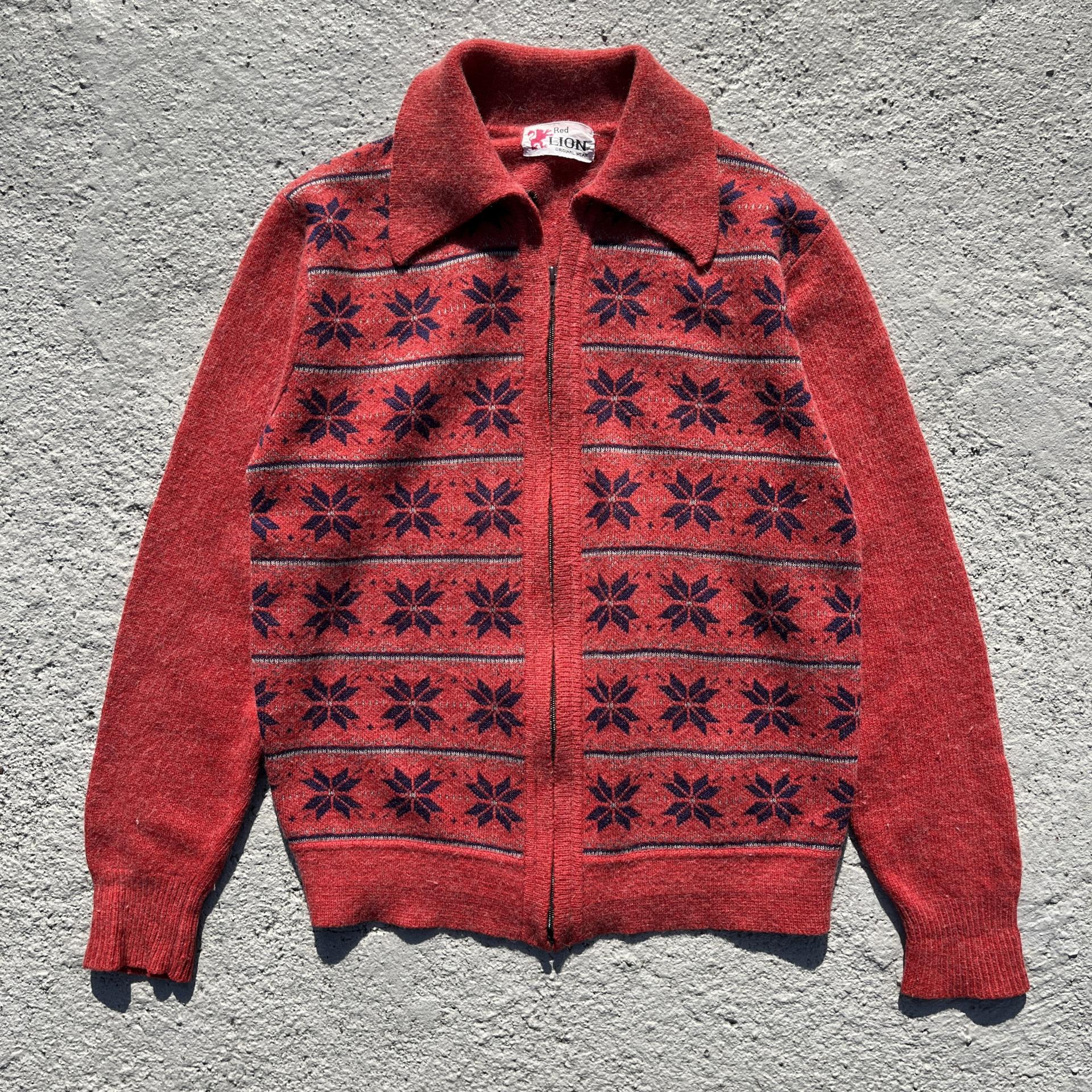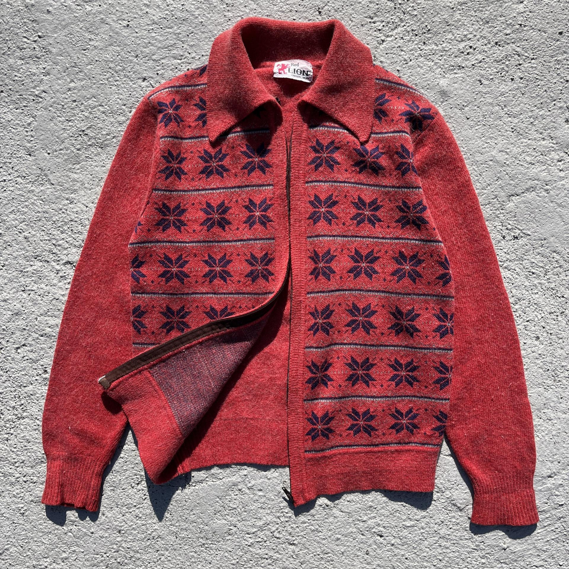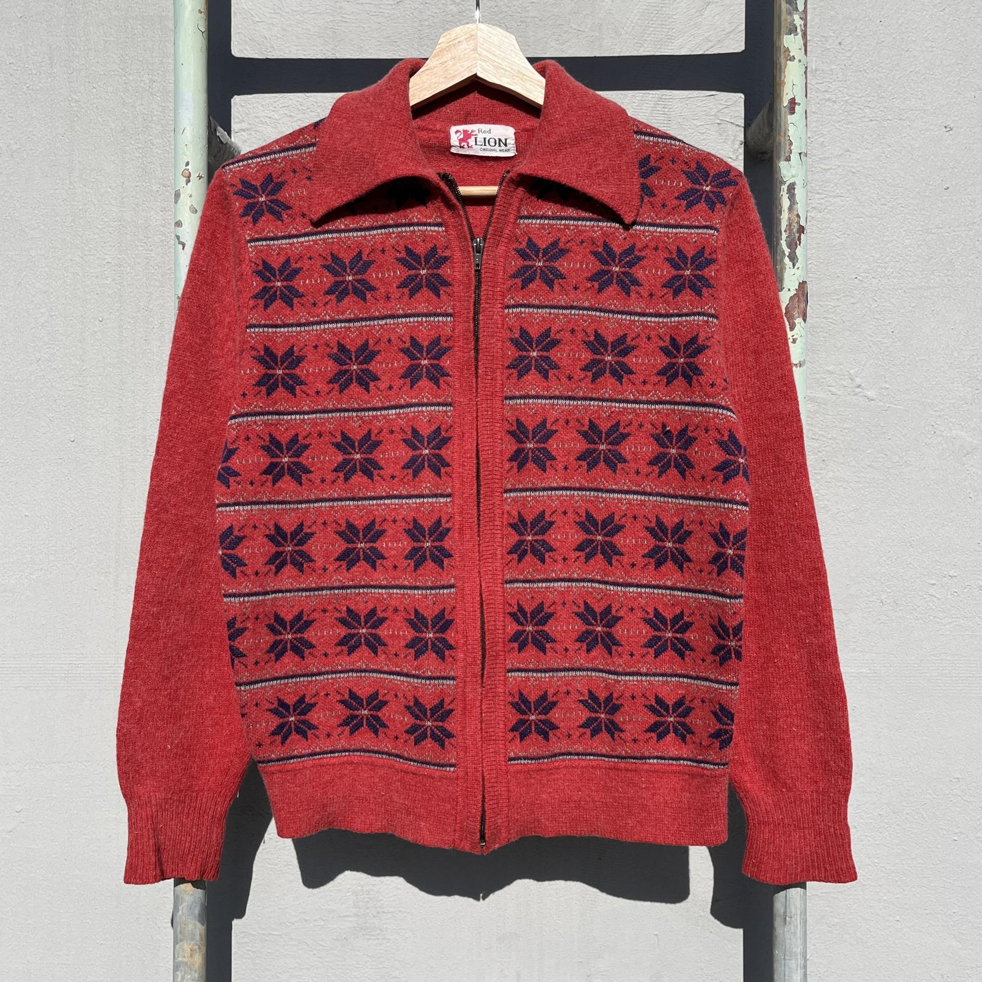 매력적인 다홍 바디 컬러와 노르딕 패턴이 돋보이는 레드 라이온사의 가디건 집업 제품입니다.