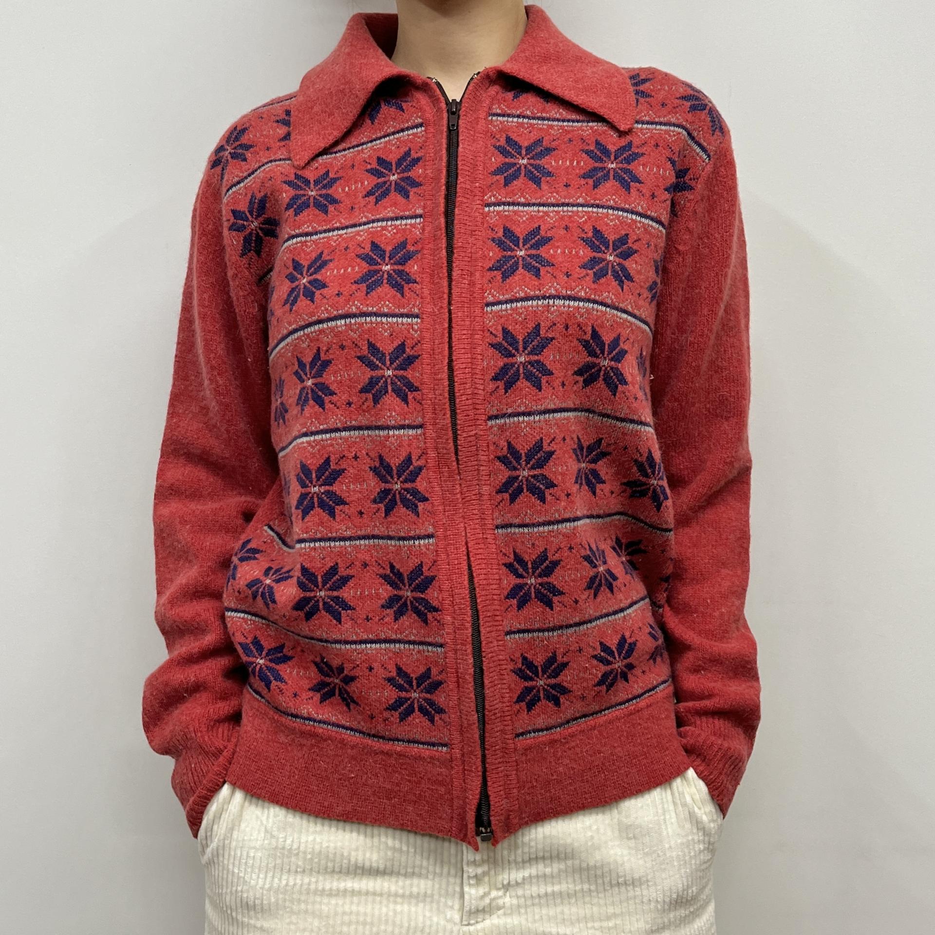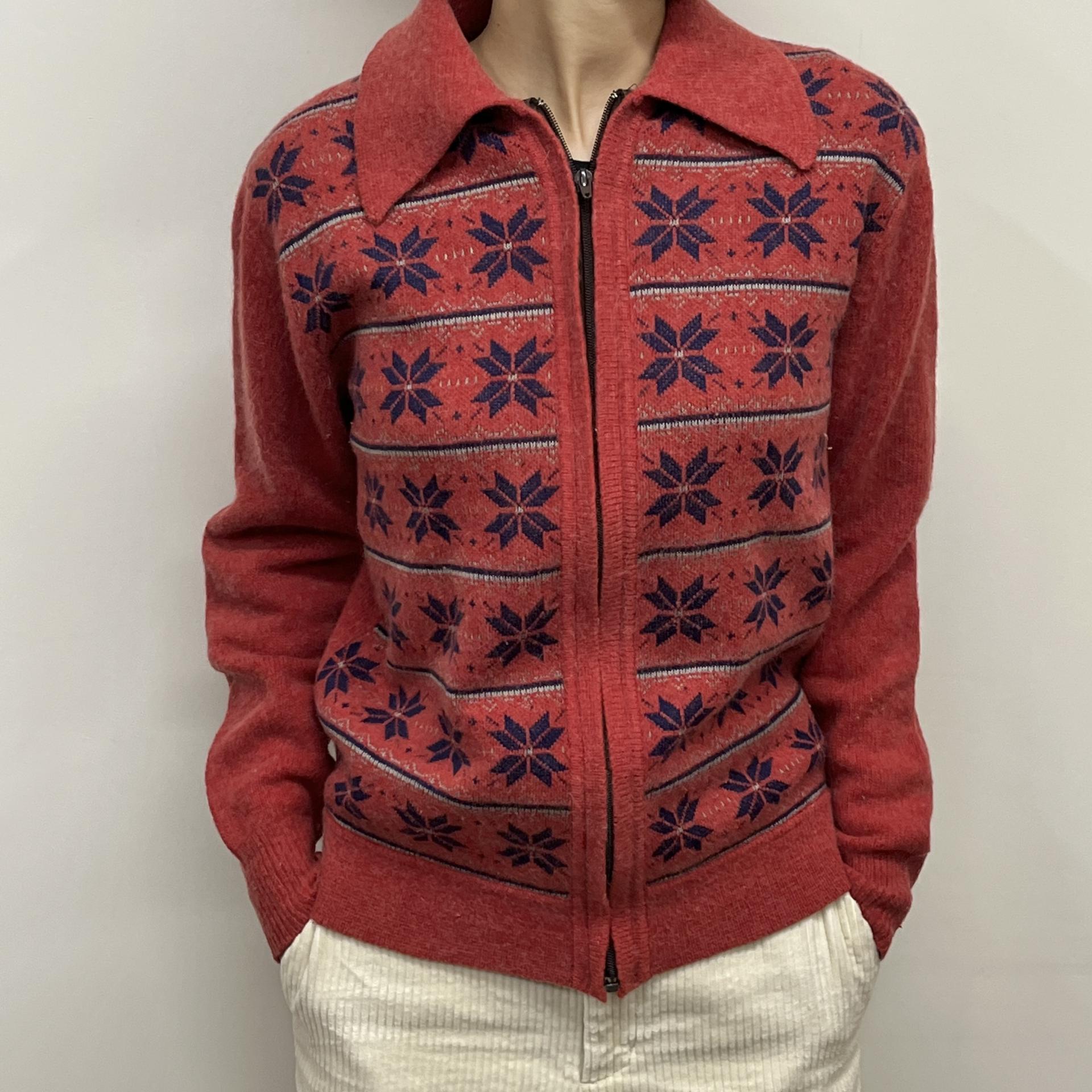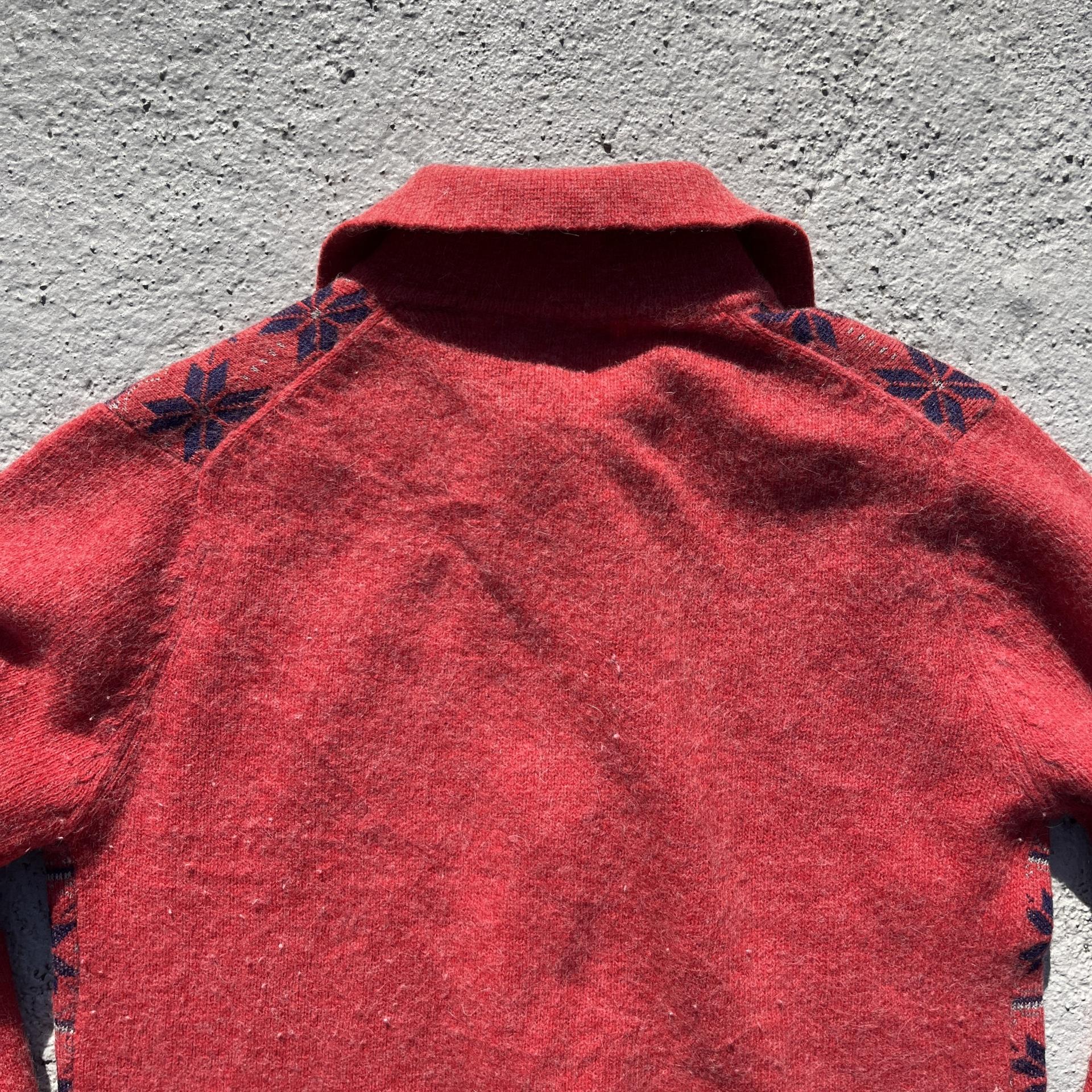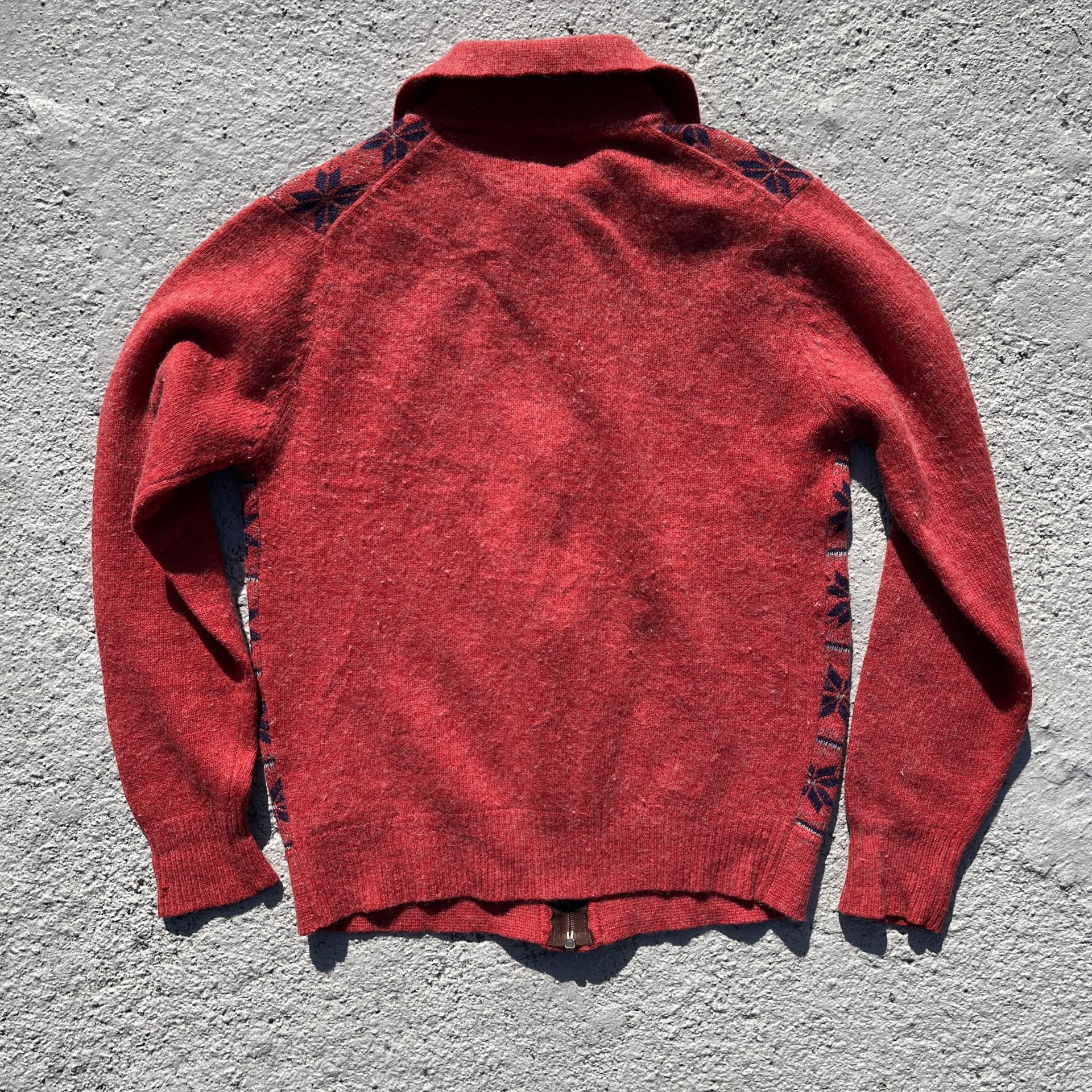 매력적인 다홍 바디 컬러와 노르딕 패턴이 돋보이는 레드 라이온사의 가디건 집업 제품입니다.
