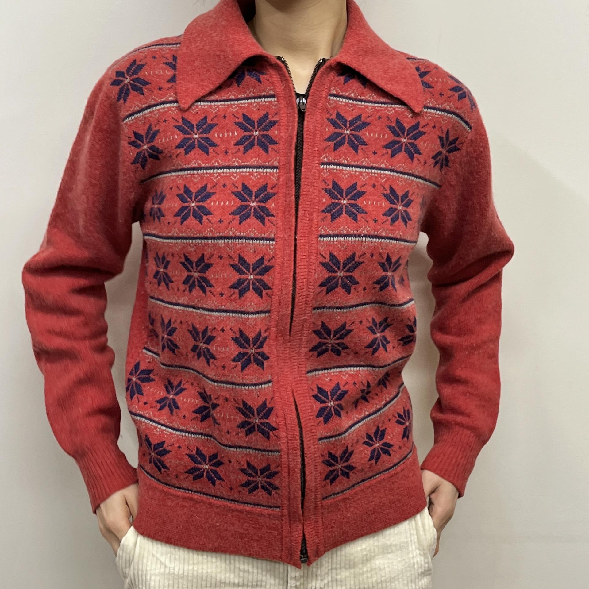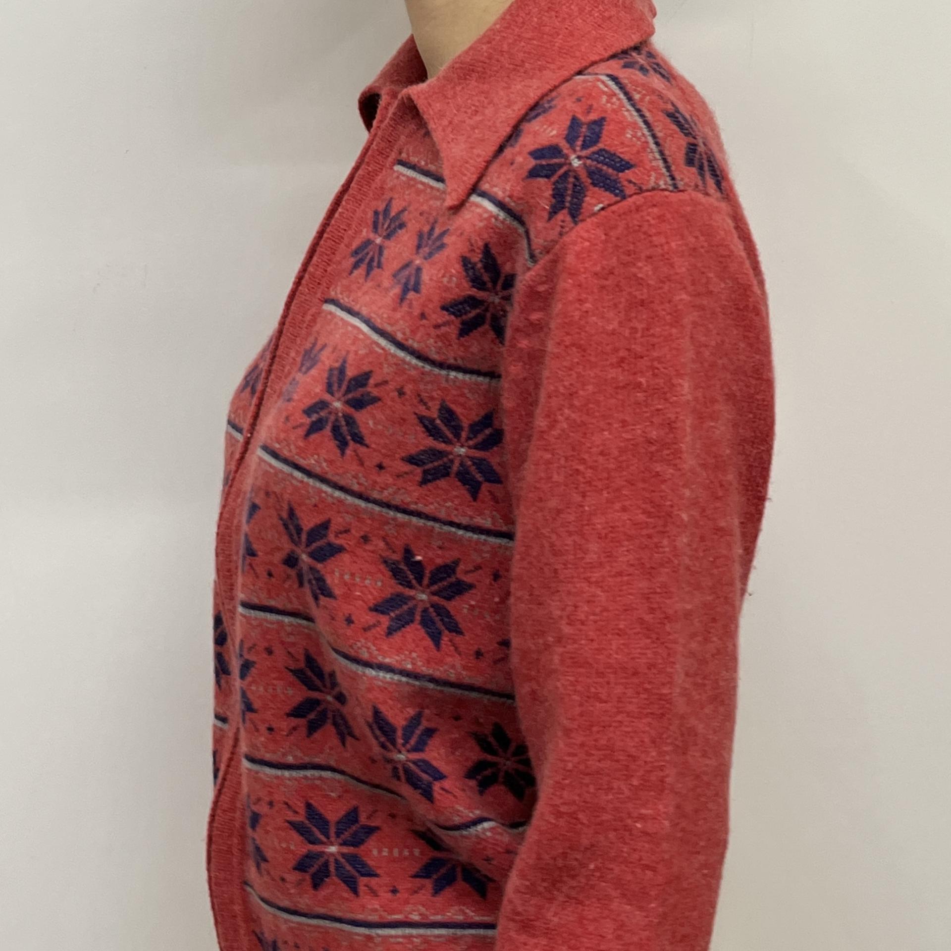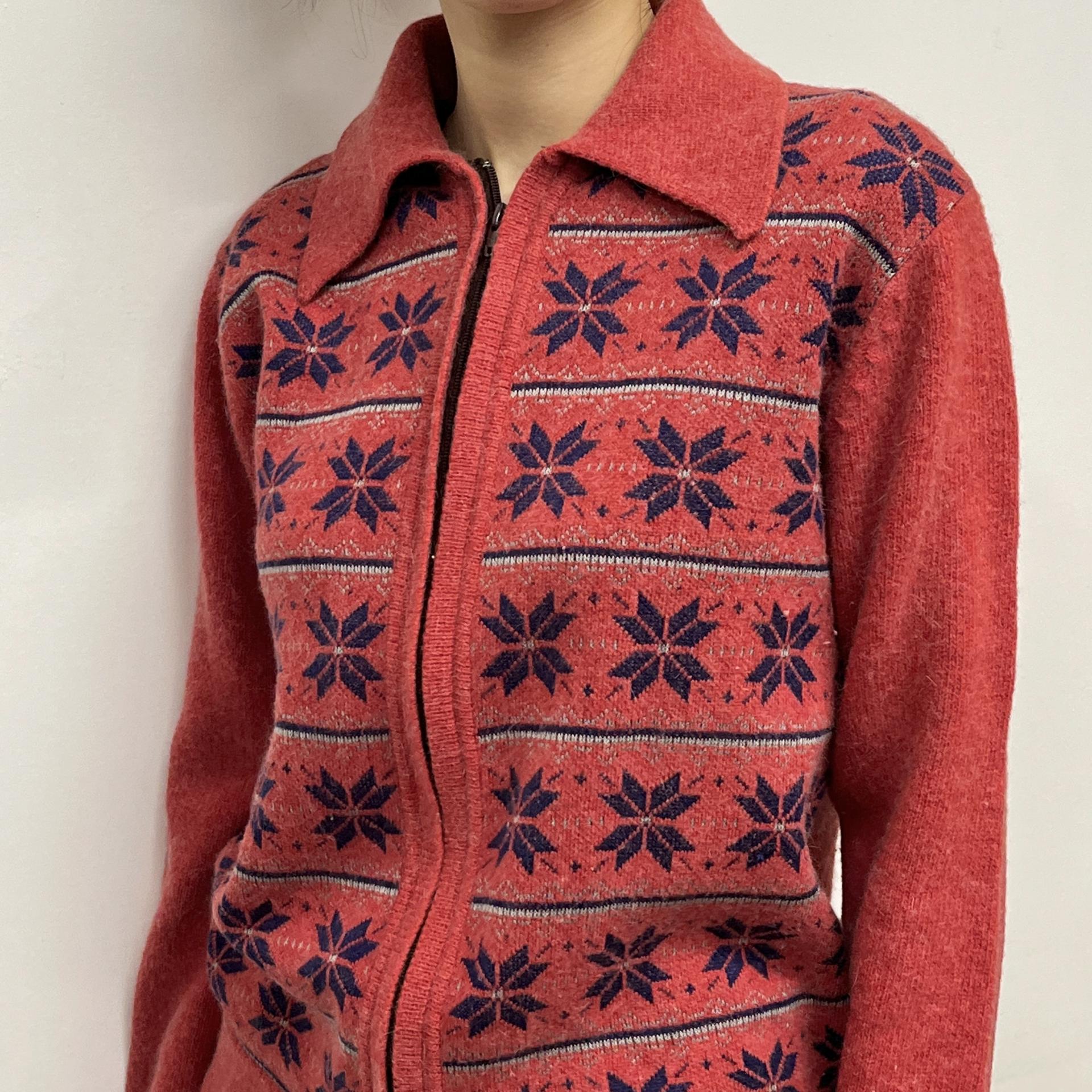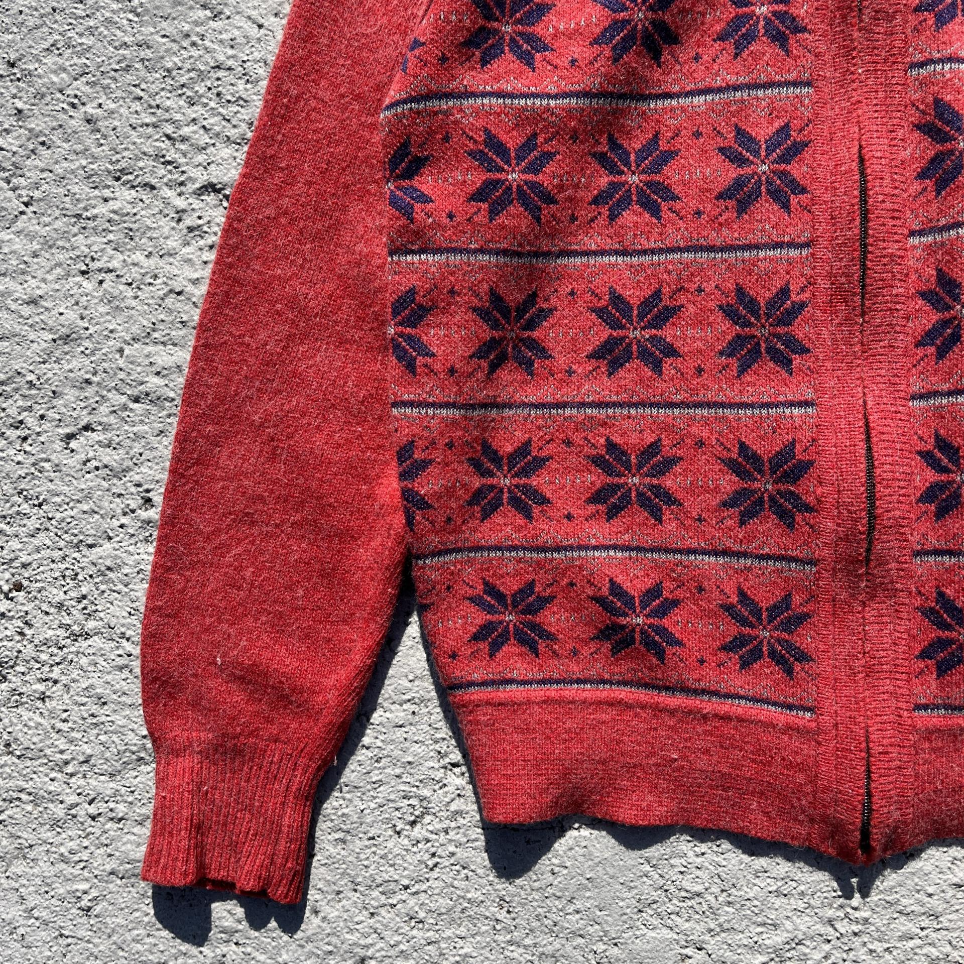 매력적인 다홍 바디 컬러와 노르딕 패턴이 돋보이는 레드 라이온사의 가디건 집업 제품입니다.
