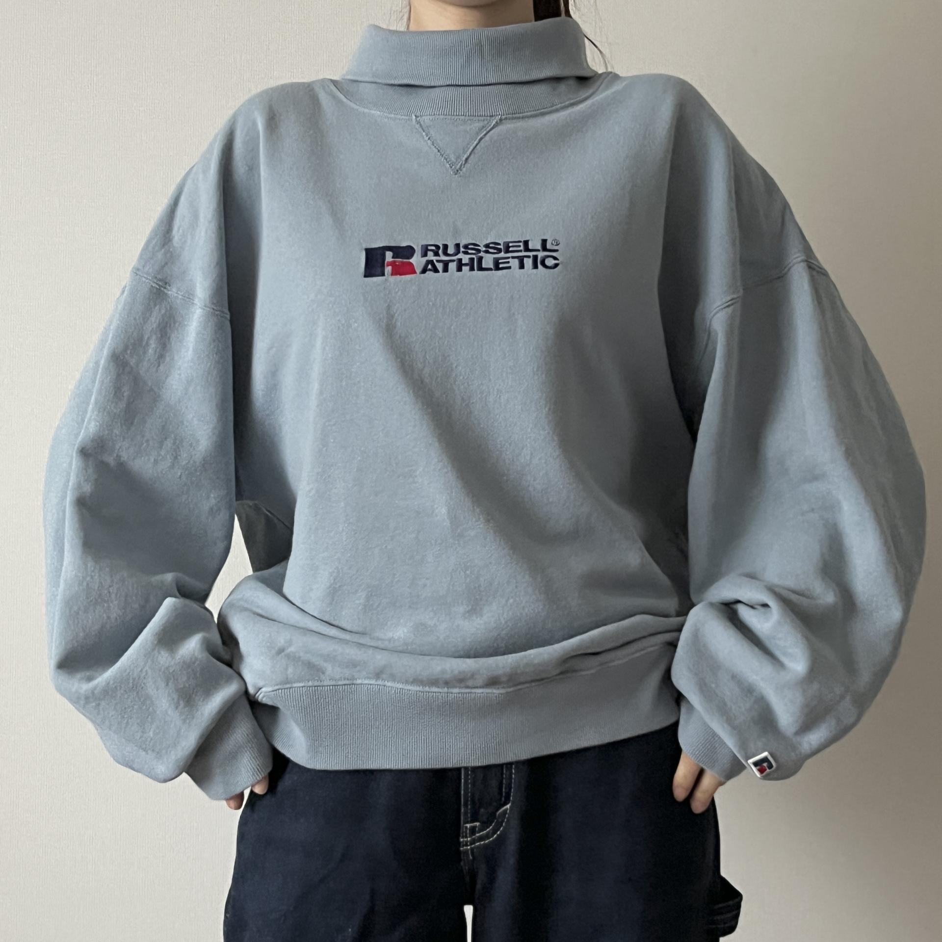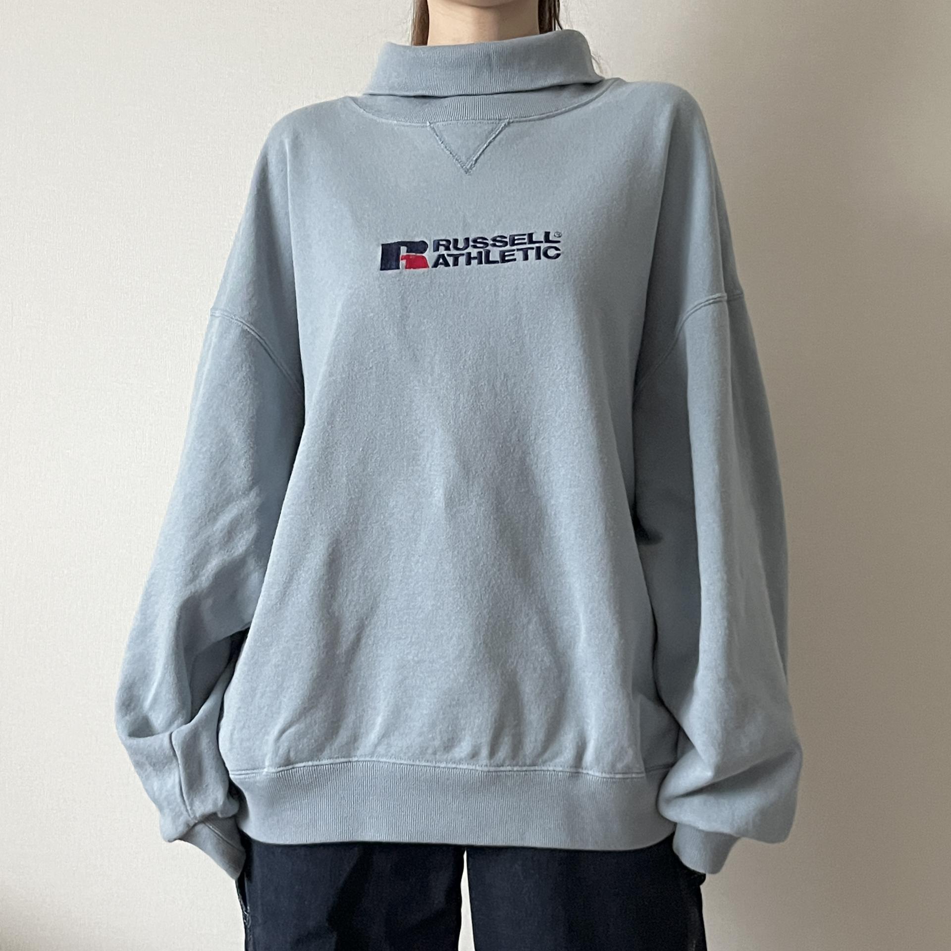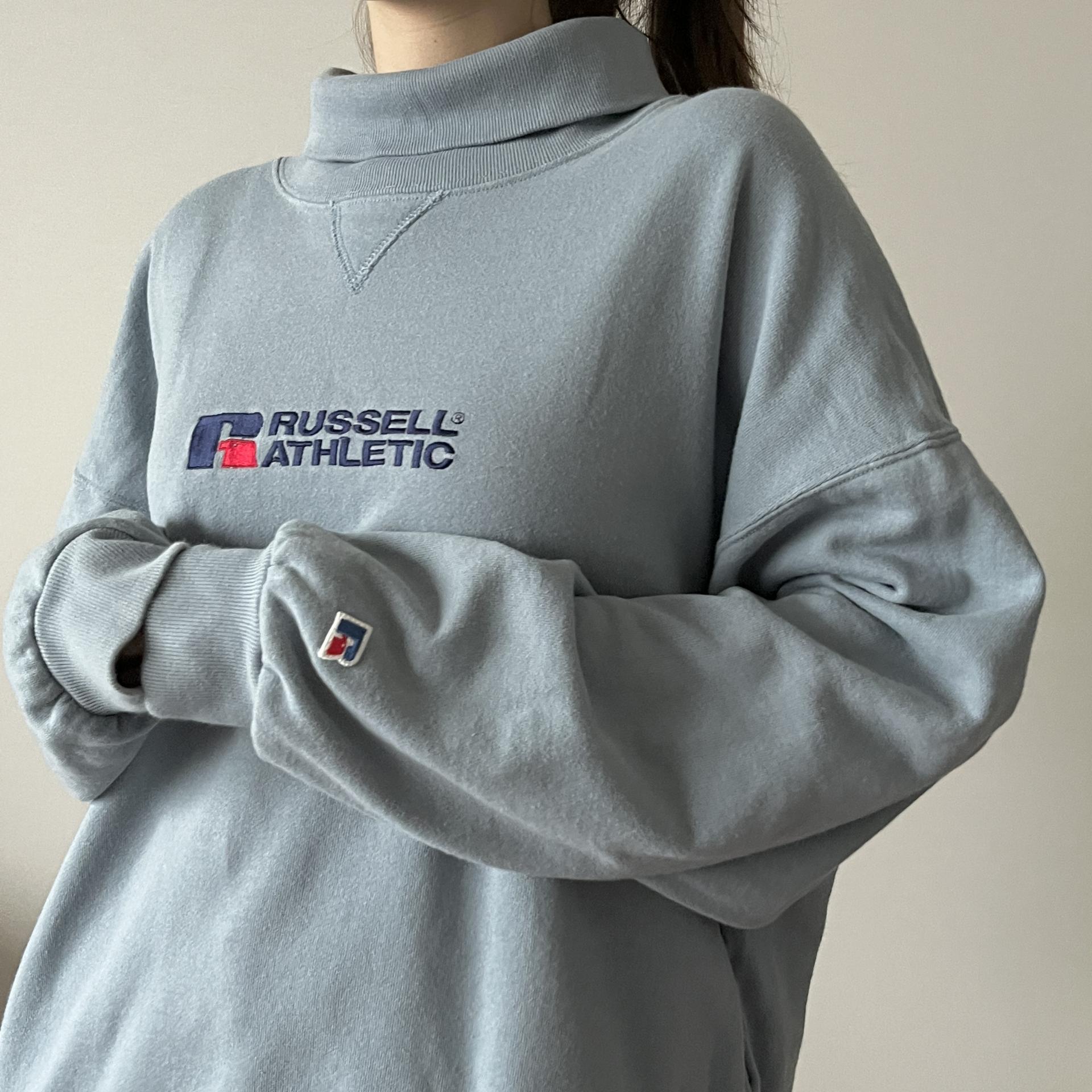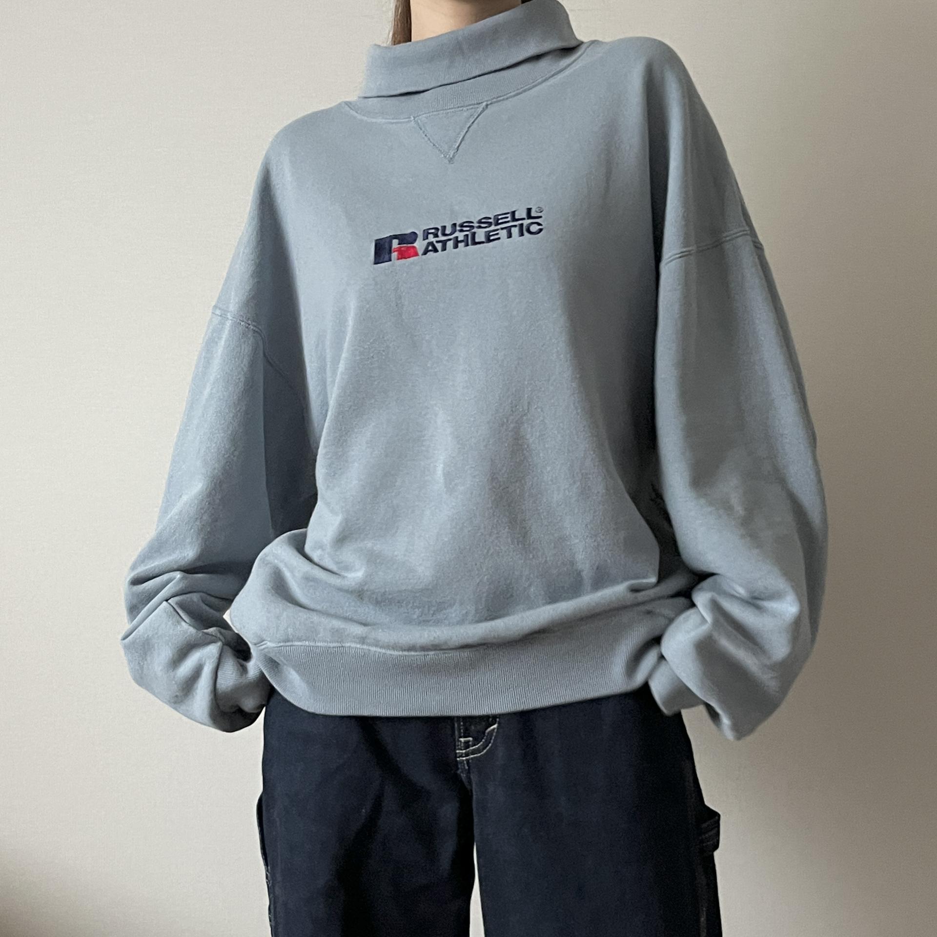 경쾌한 블루 바디 컬러와 박시한 핏을 갖춘 러셀의 터틀넥 스웨트셔츠 제품입니다.