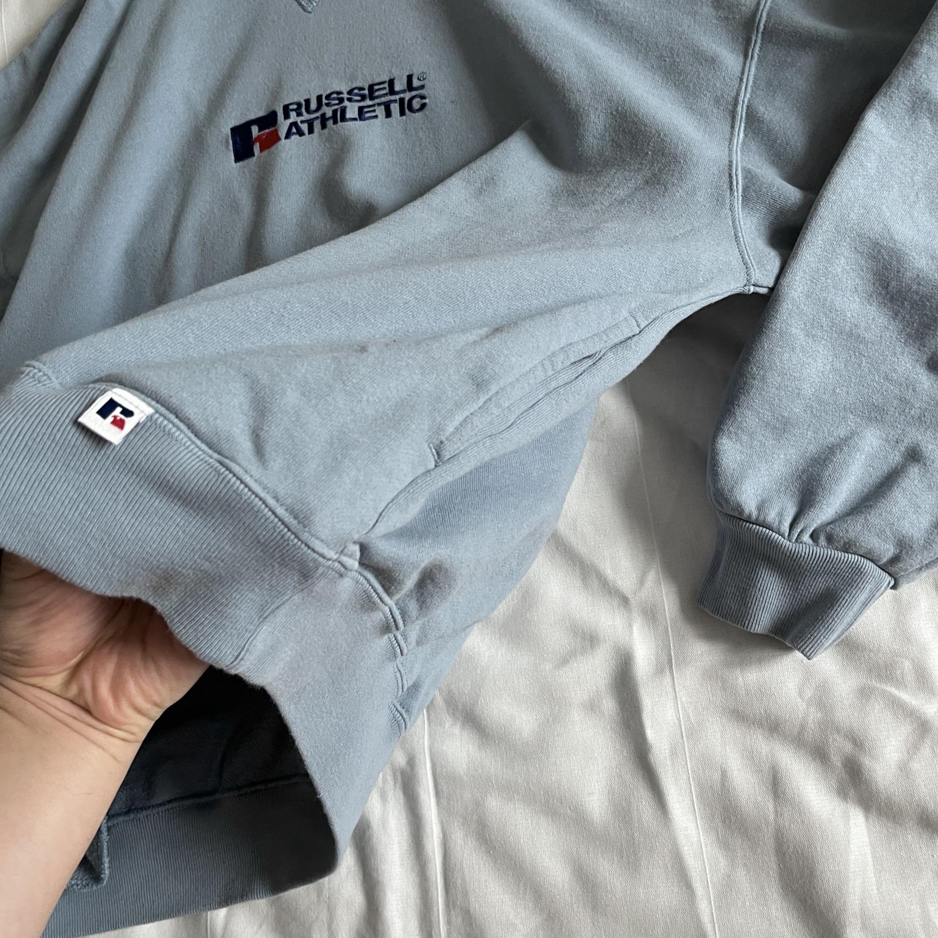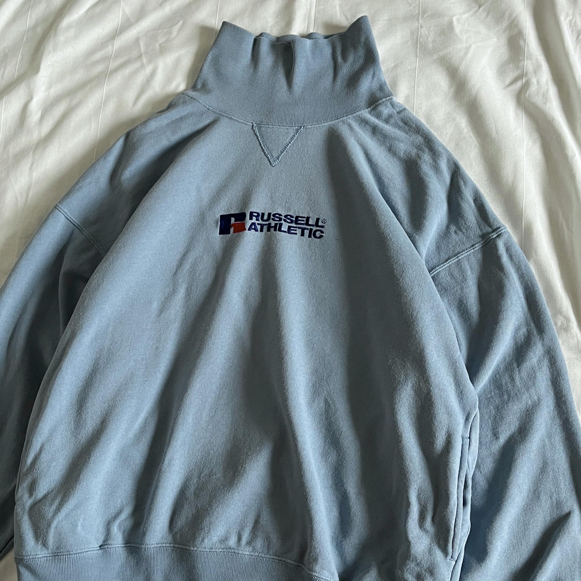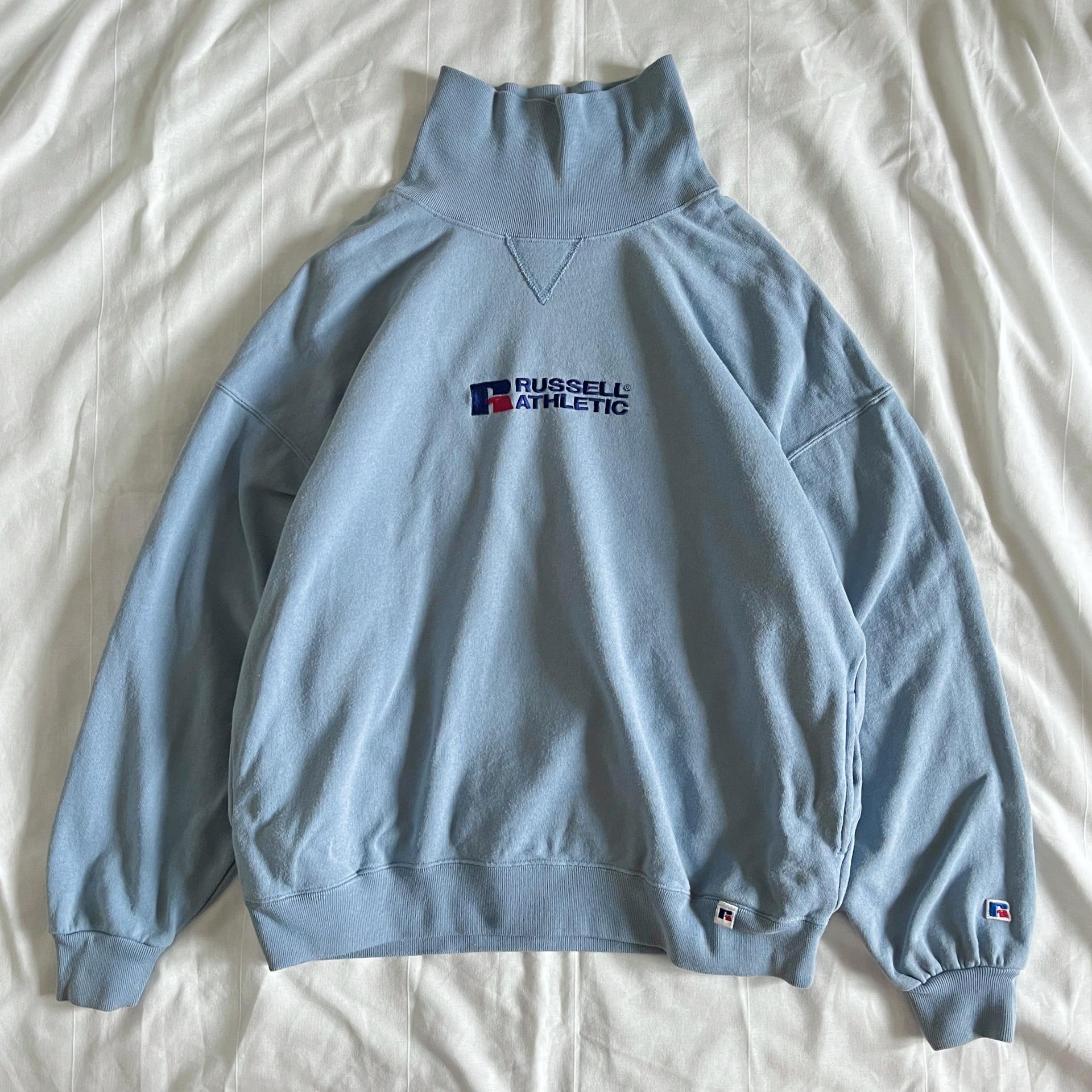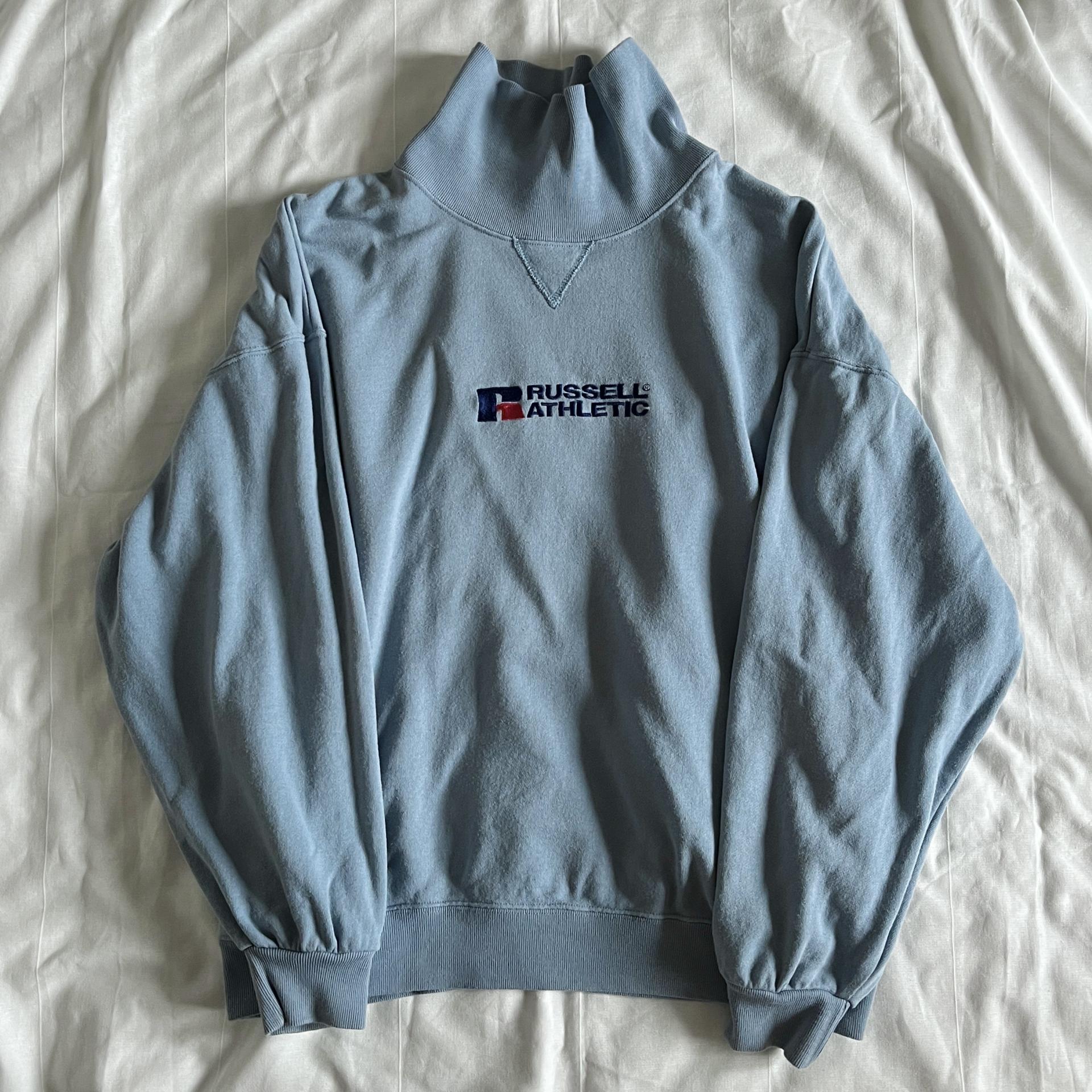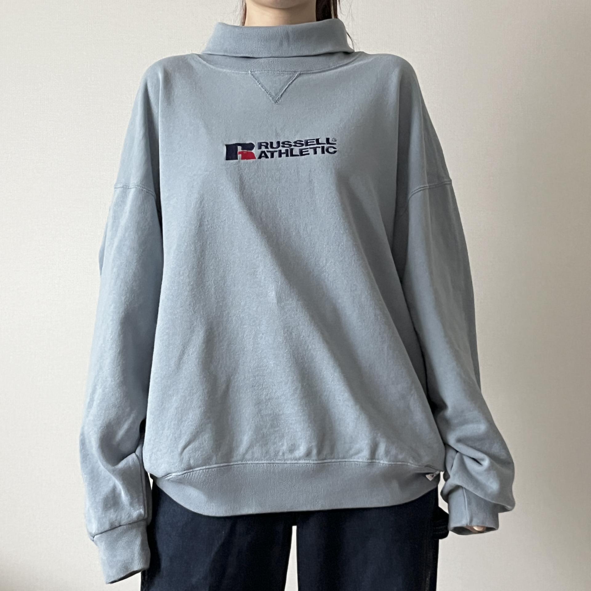 경쾌한 블루 바디 컬러와 박시한 핏을 갖춘 러셀의 터틀넥 스웨트셔츠 제품입니다.