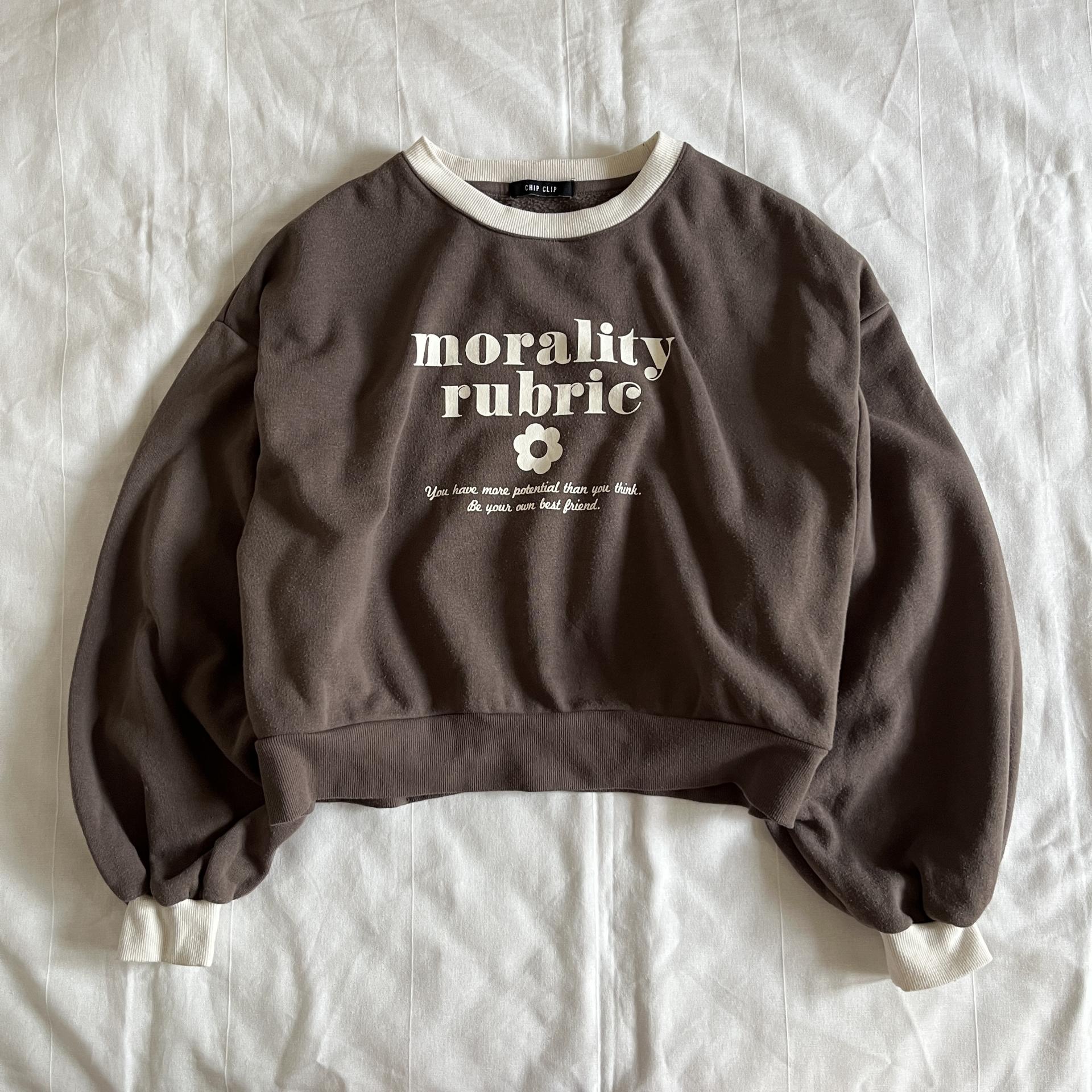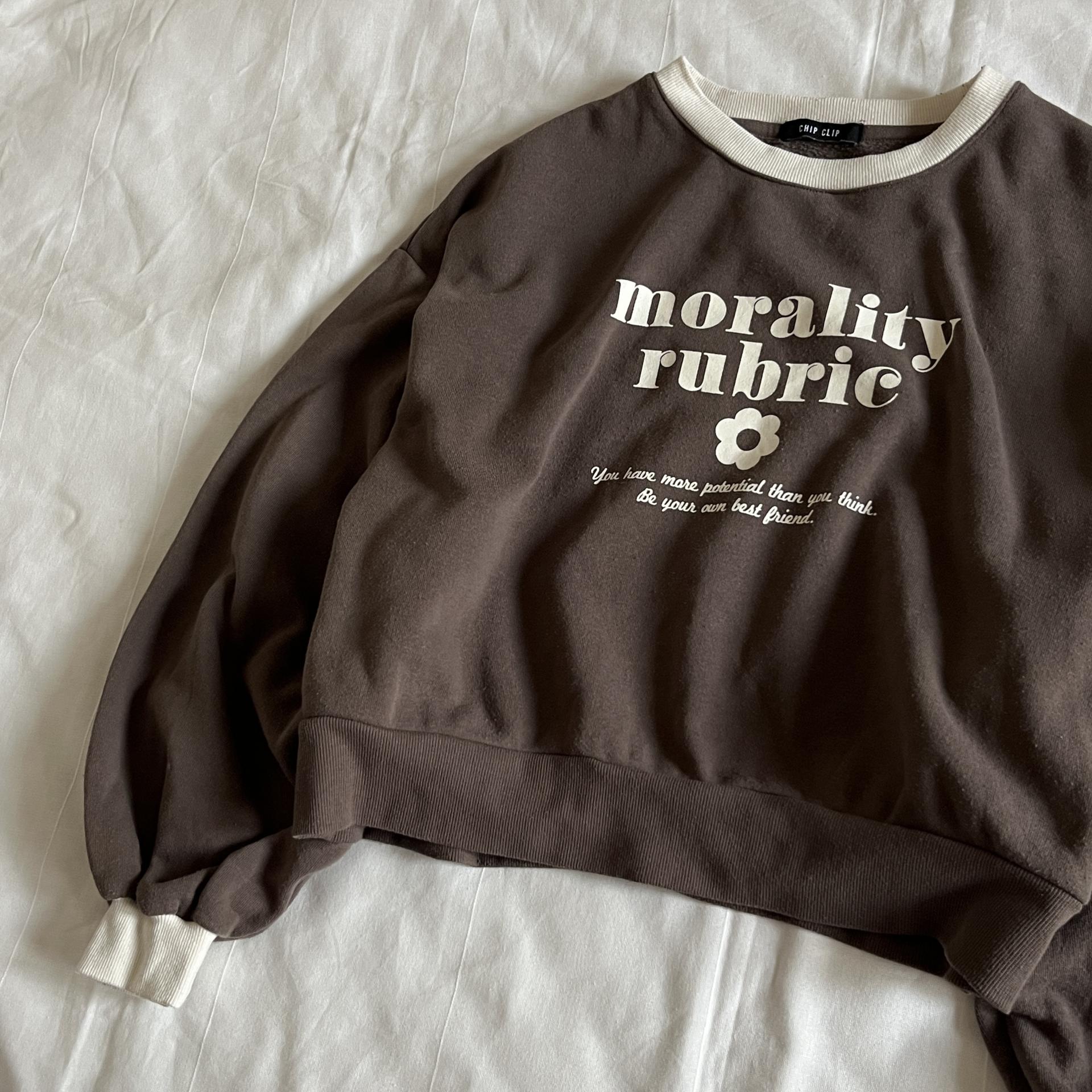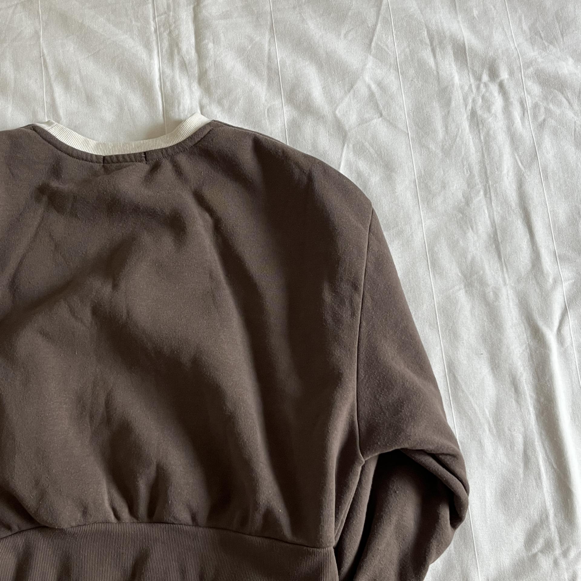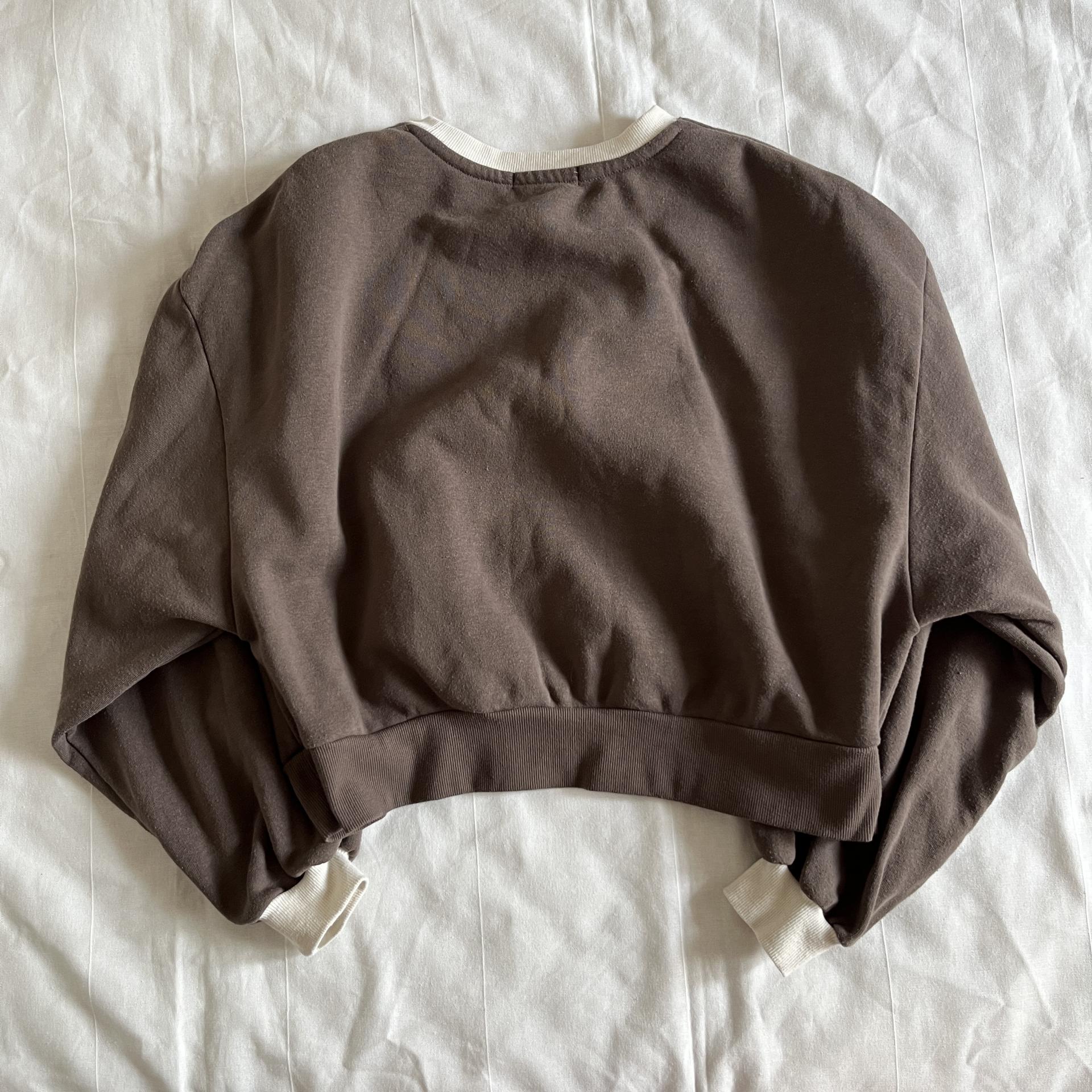 귀여운 가오리 핏 실루엣과 브라운 바디 컬러가 돋보이는 스웨트셔츠 제품입니다.
