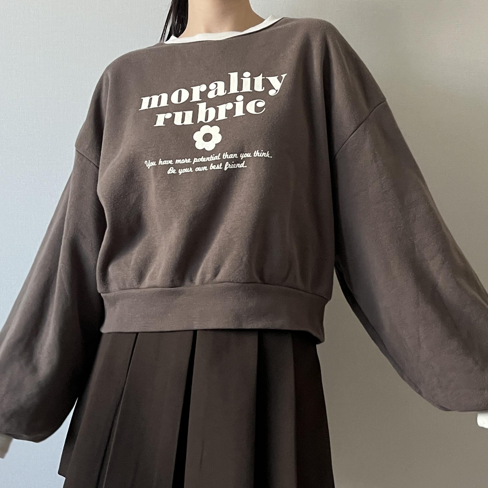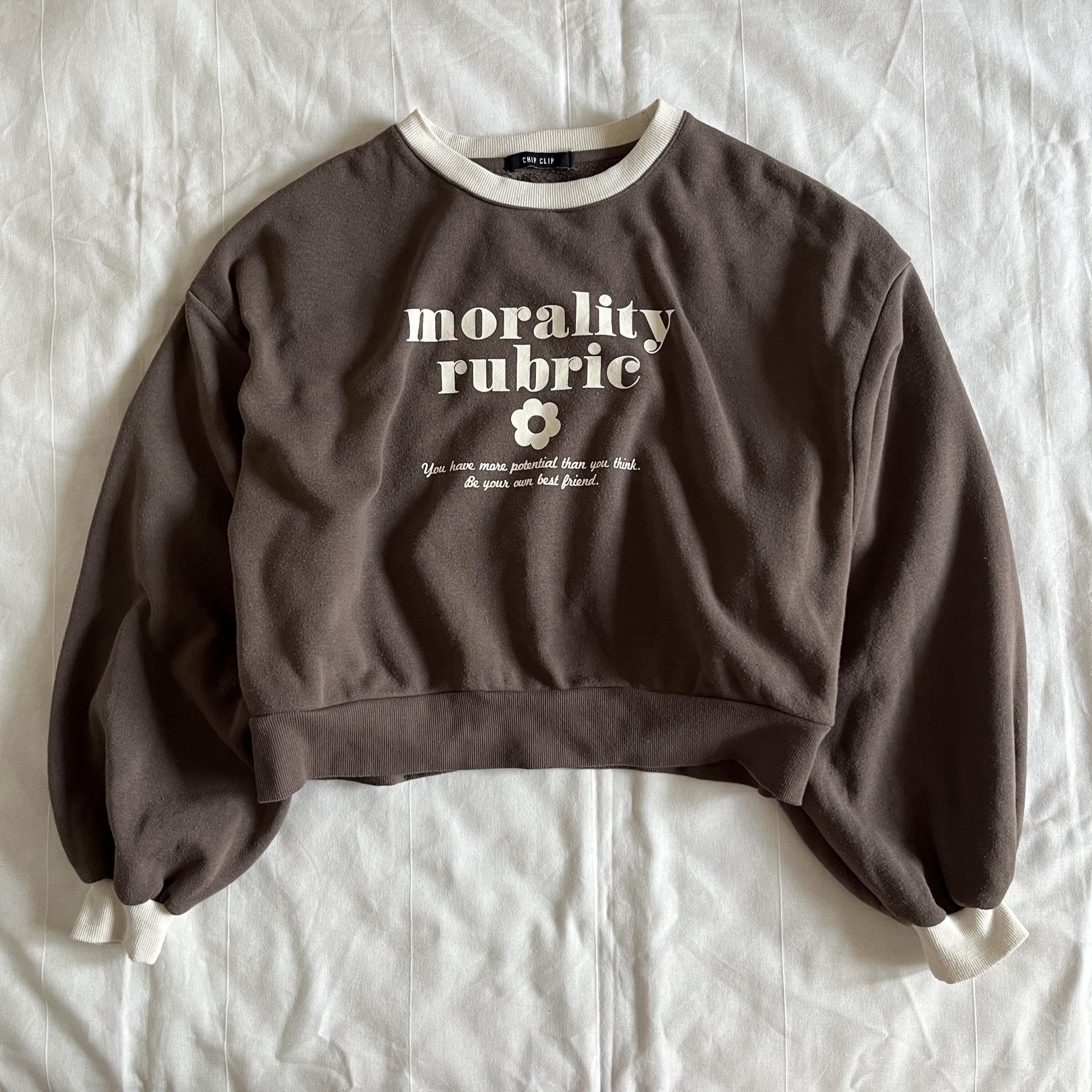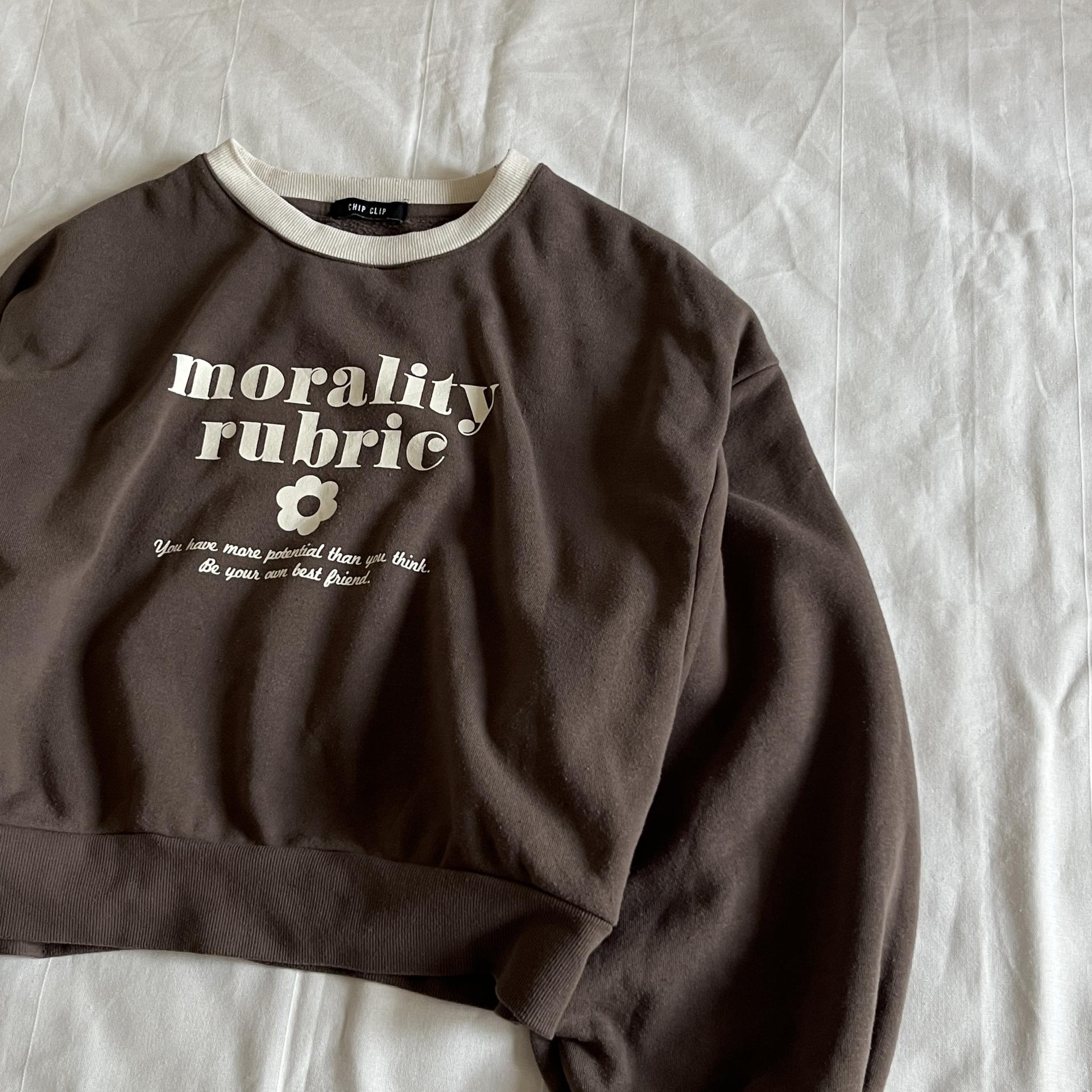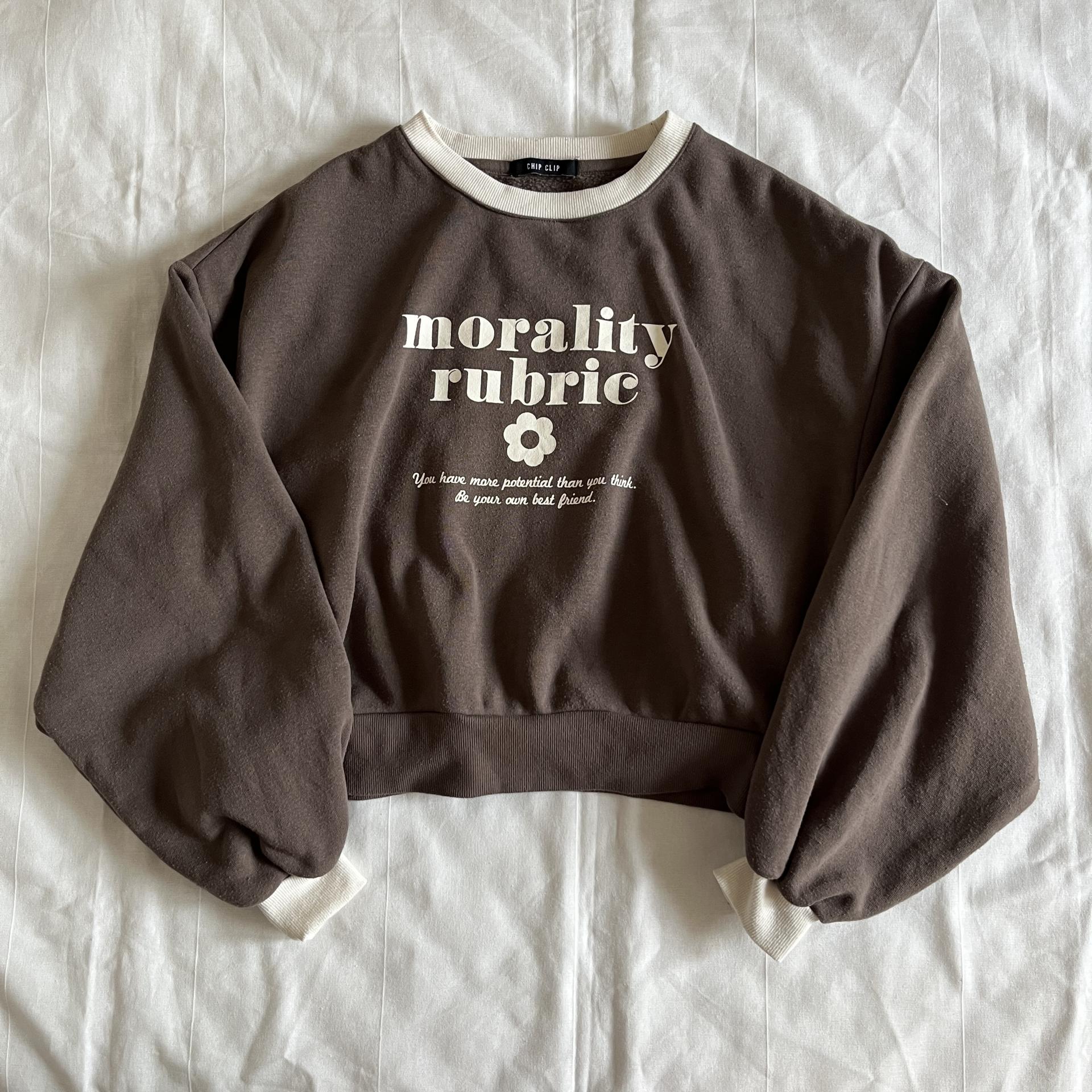 귀여운 가오리 핏 실루엣과 브라운 바디 컬러가 돋보이는 스웨트셔츠 제품입니다.