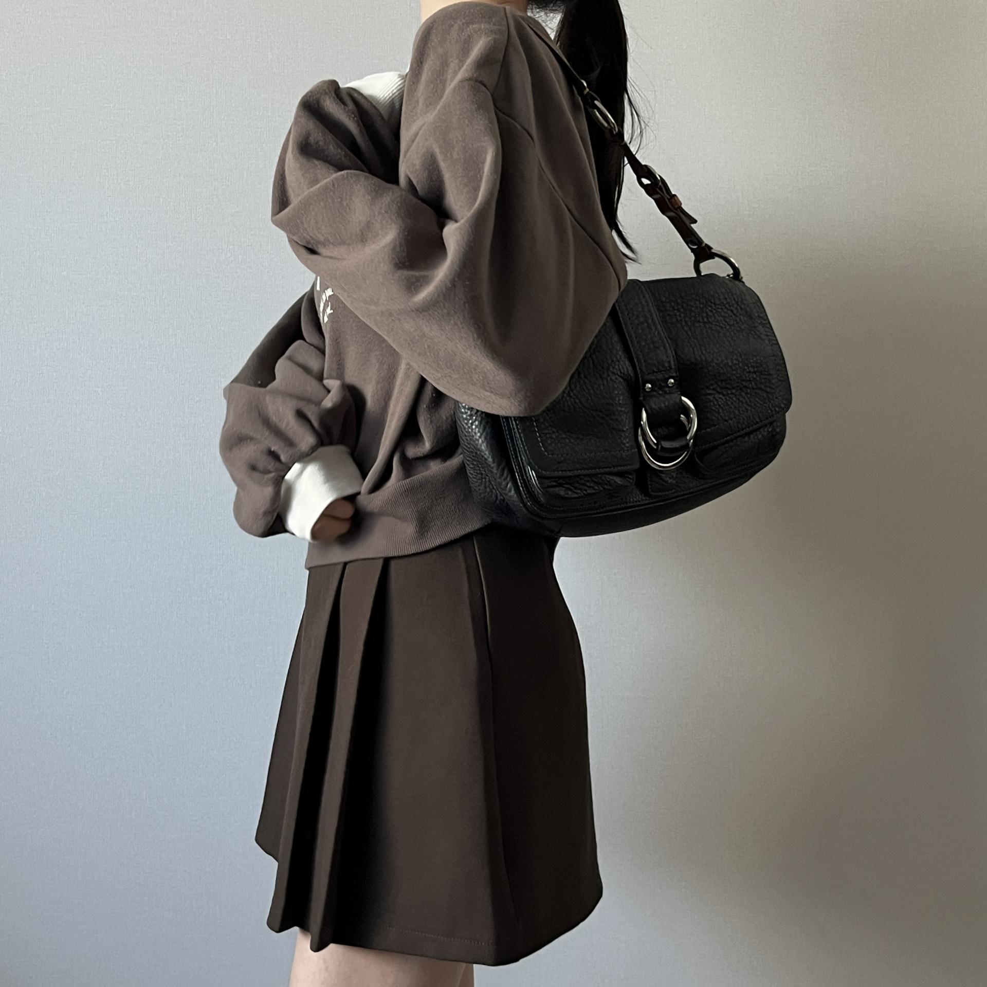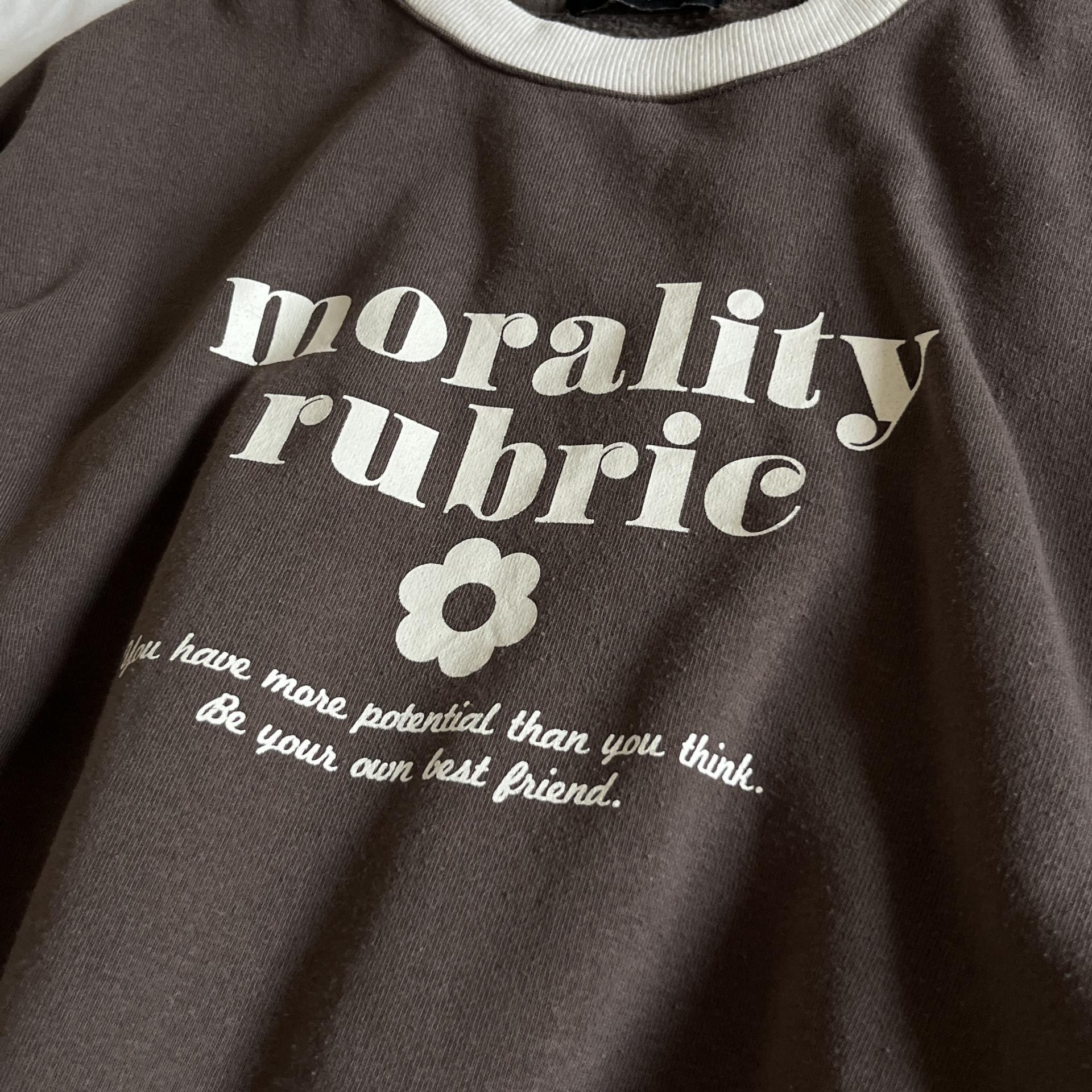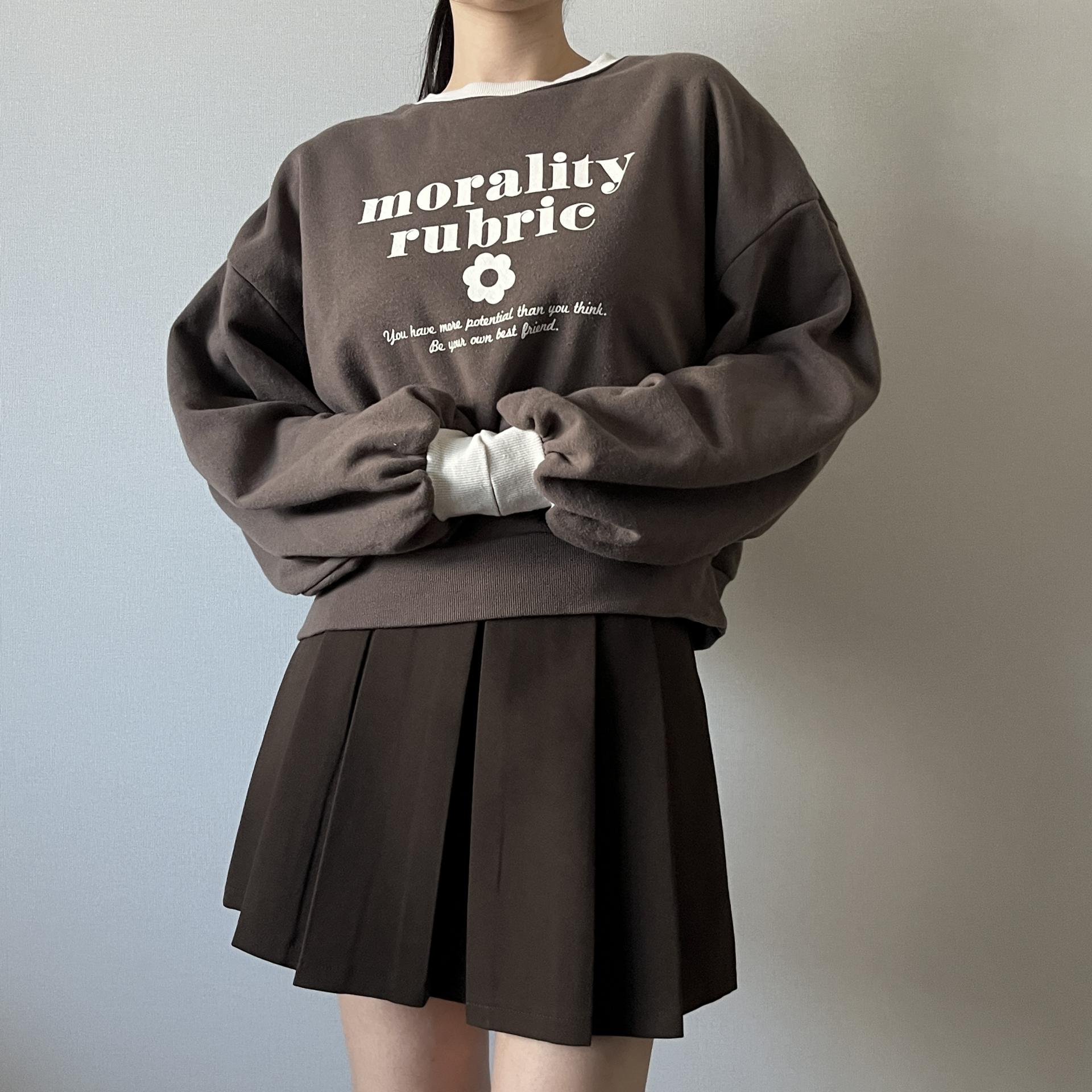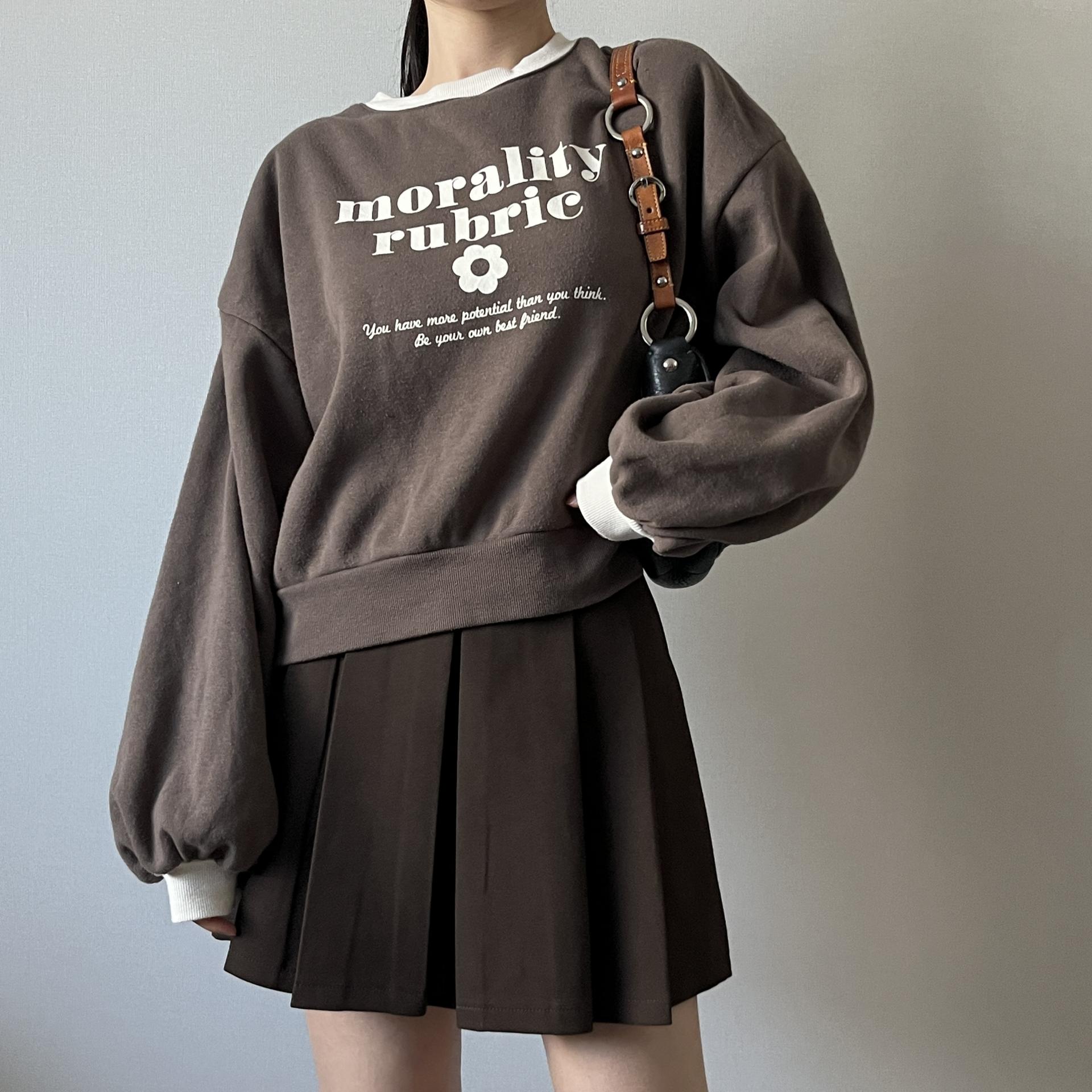 귀여운 가오리 핏 실루엣과 브라운 바디 컬러가 돋보이는 스웨트셔츠 제품입니다.